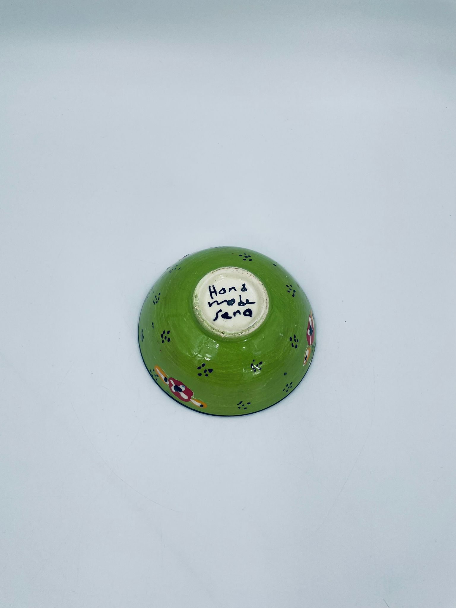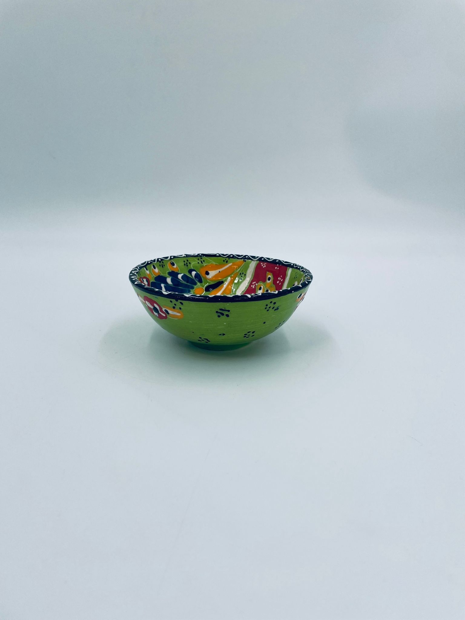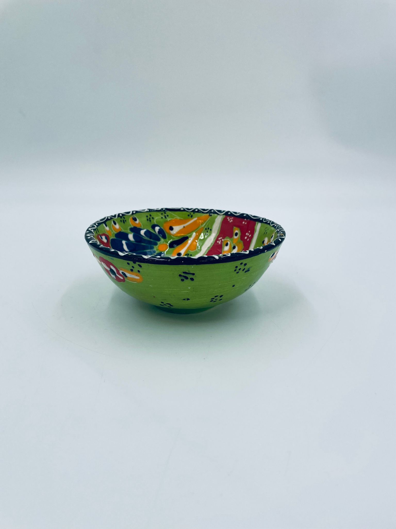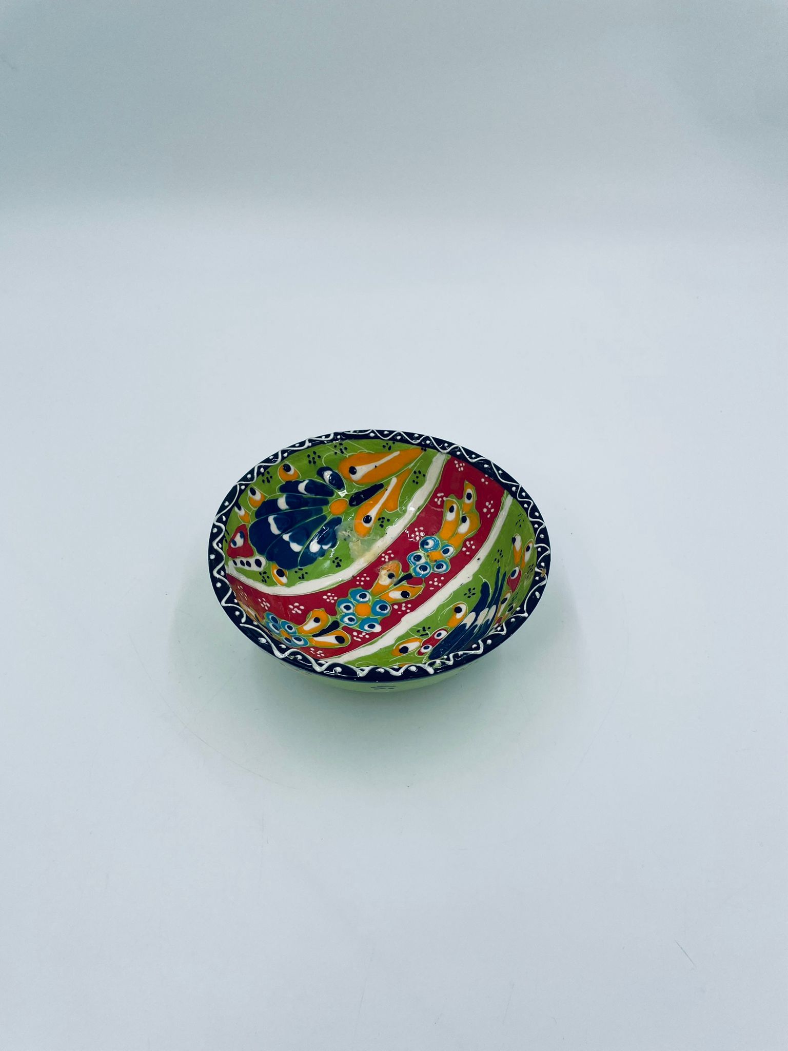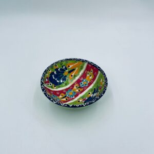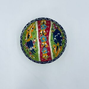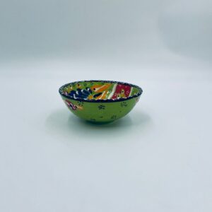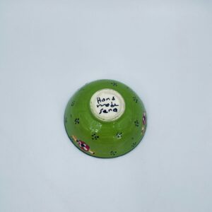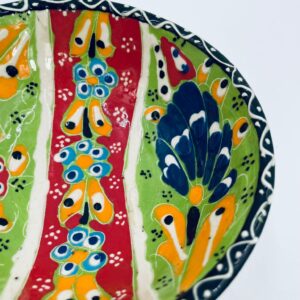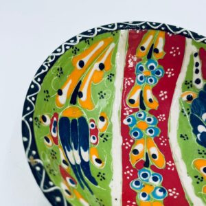 Miseczka, salaterka dekoracyjna w stylu Vintage, wykonana z wysokiej jakości tureckiej ceramiki. Miseczka w zielonym kolorze, ręcznie robiona, ręcznie malowana w orientalne, kolorowe wzory. Posiada pęknięcie szkliwa.