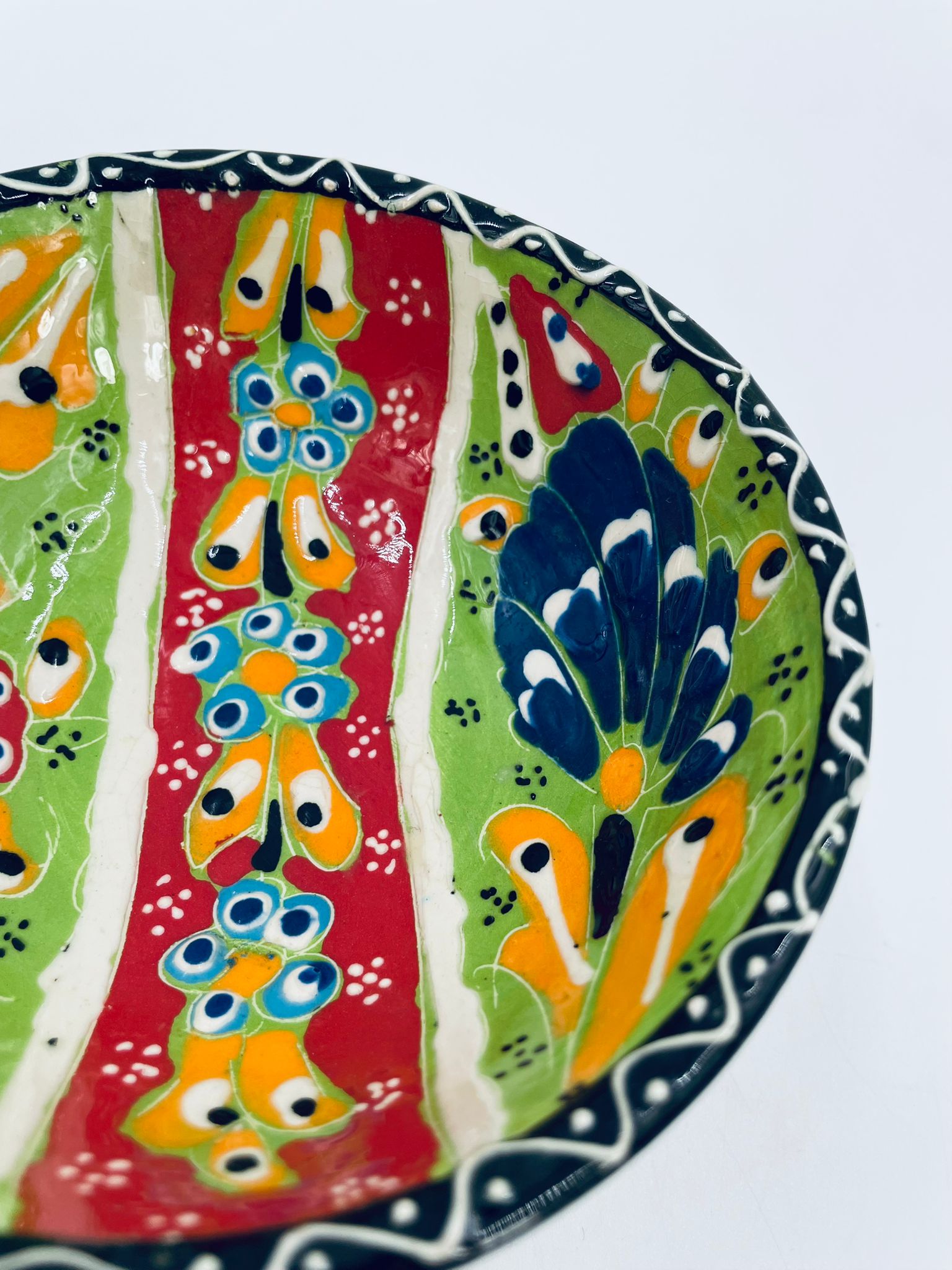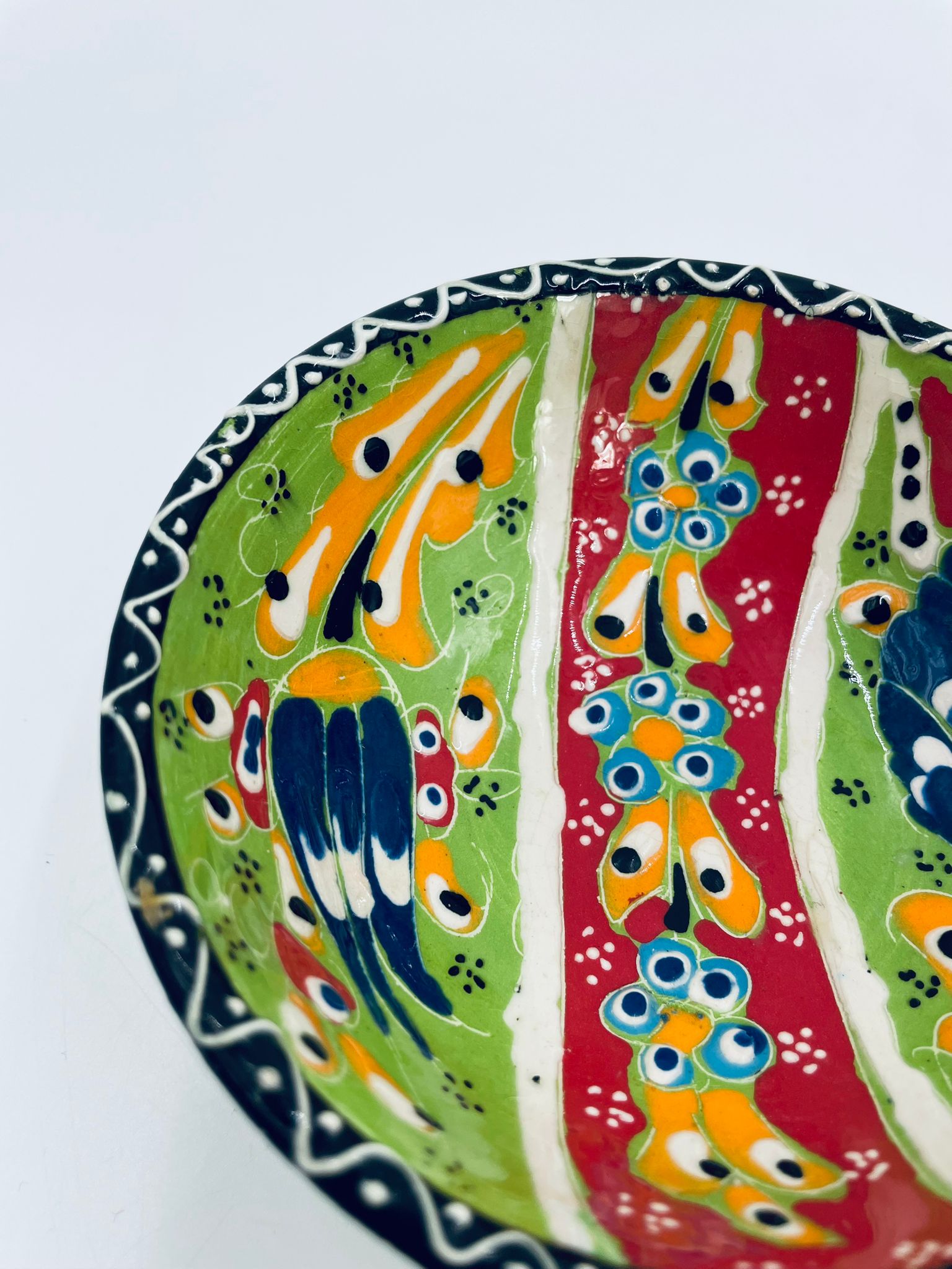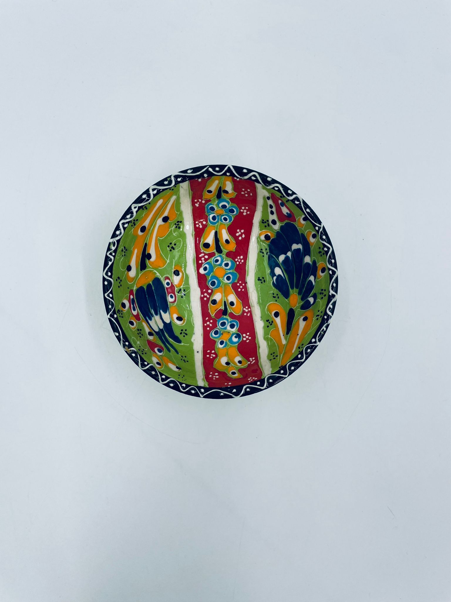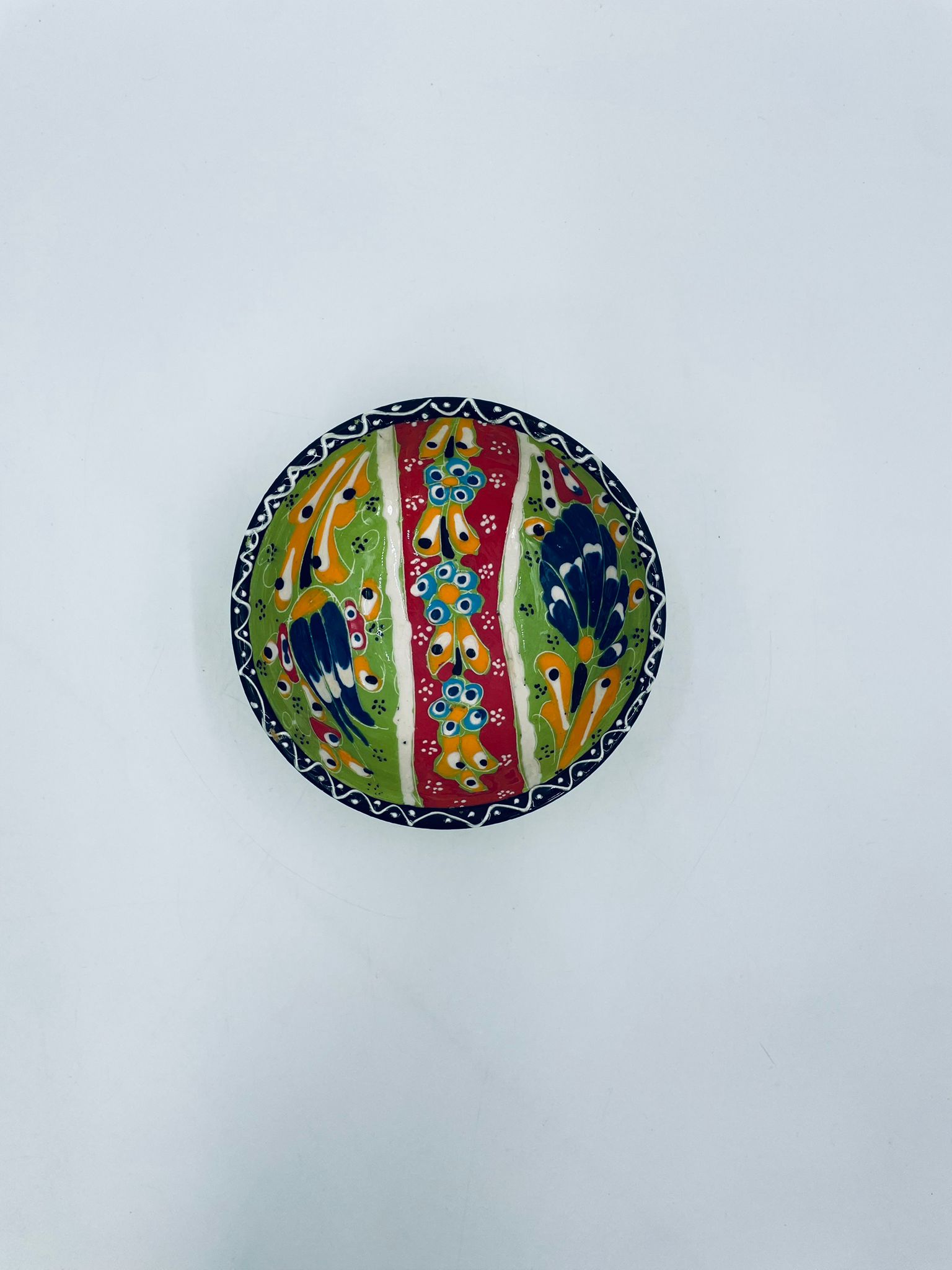 Miseczka, salaterka dekoracyjna w stylu Vintage, wykonana z wysokiej jakości tureckiej ceramiki. Miseczka w zielonym kolorze, ręcznie robiona, ręcznie malowana w orientalne, kolorowe wzory. Posiada pęknięcie szkliwa.