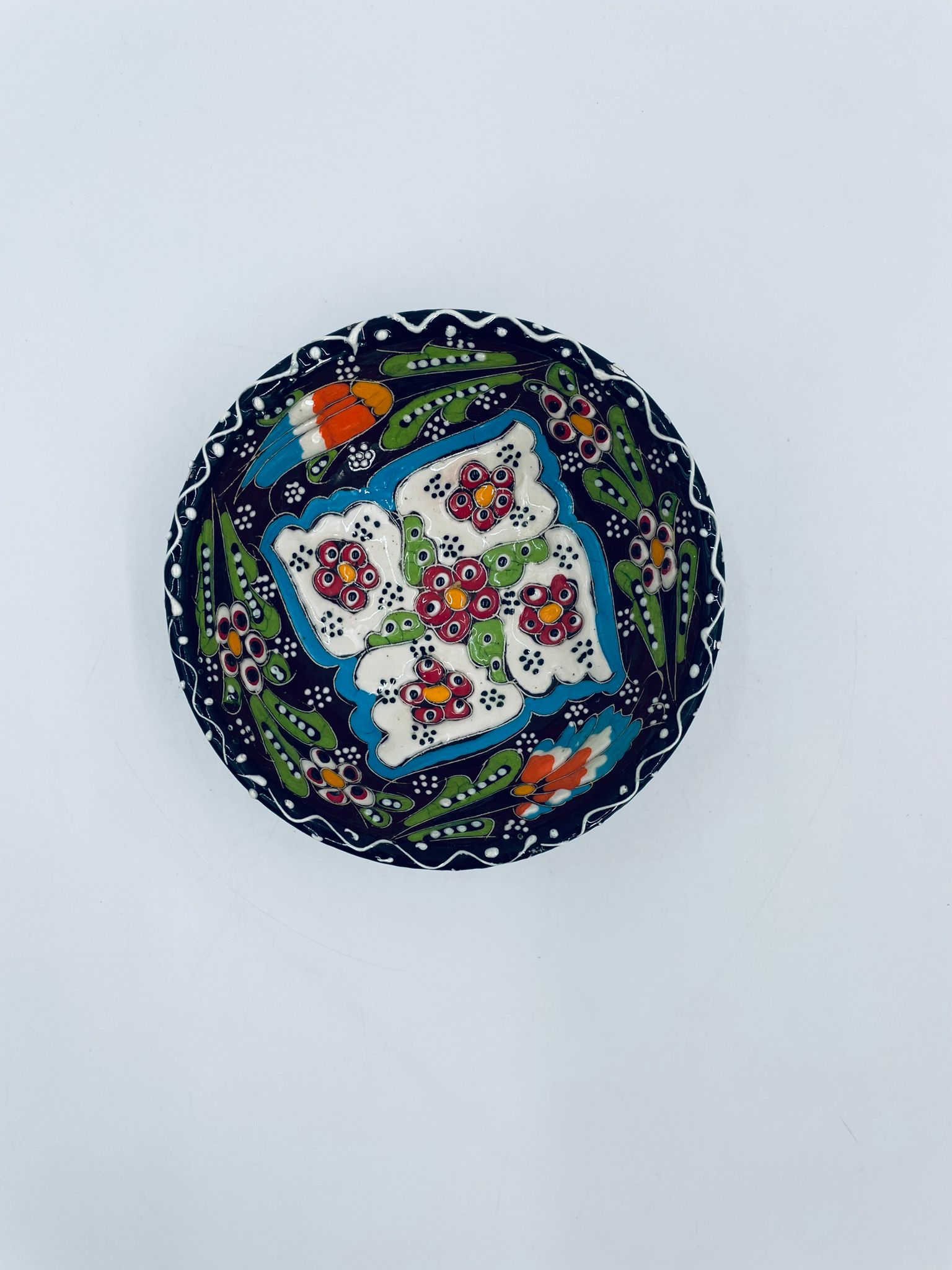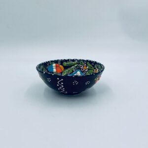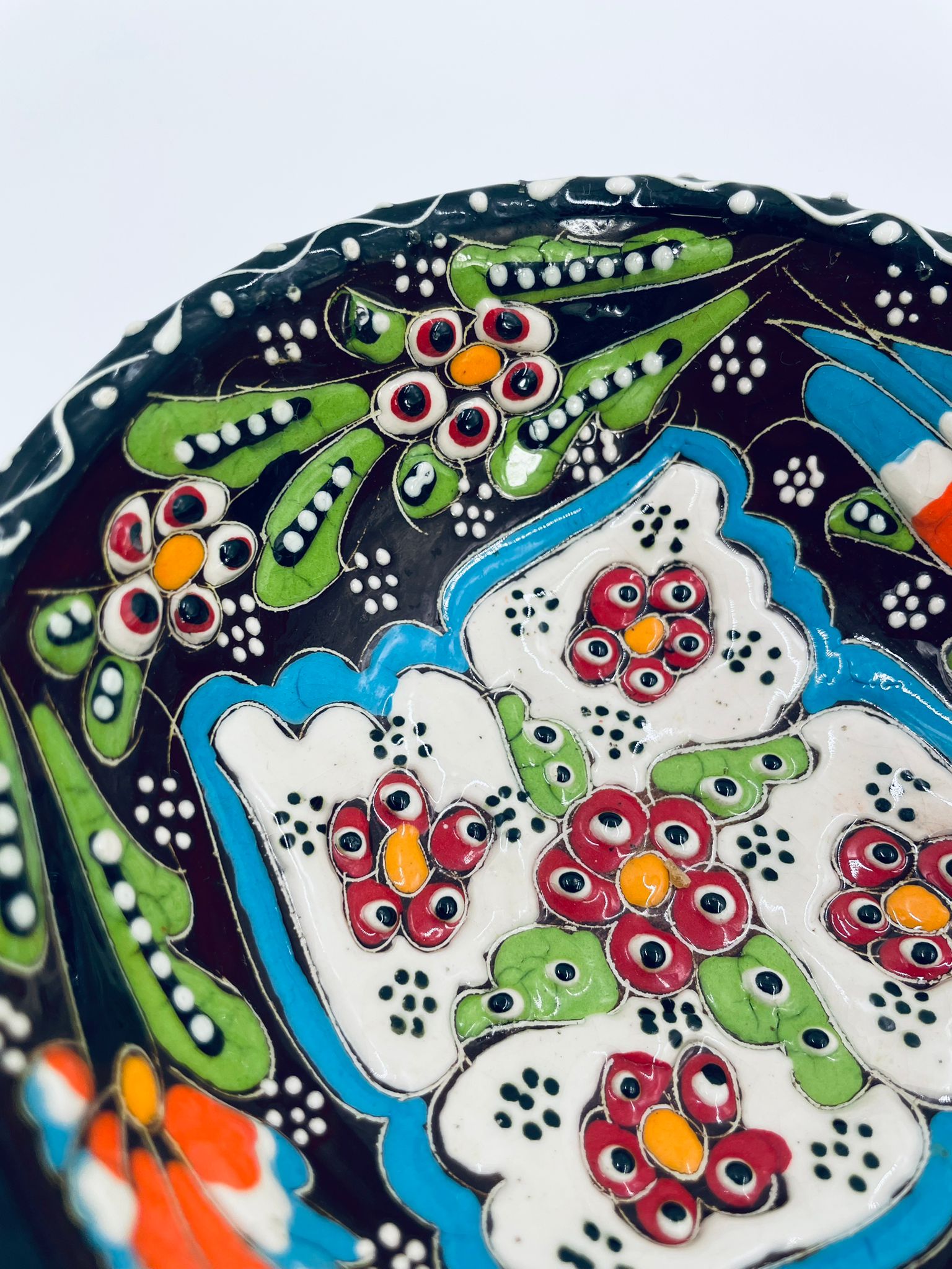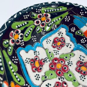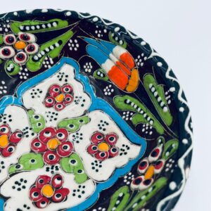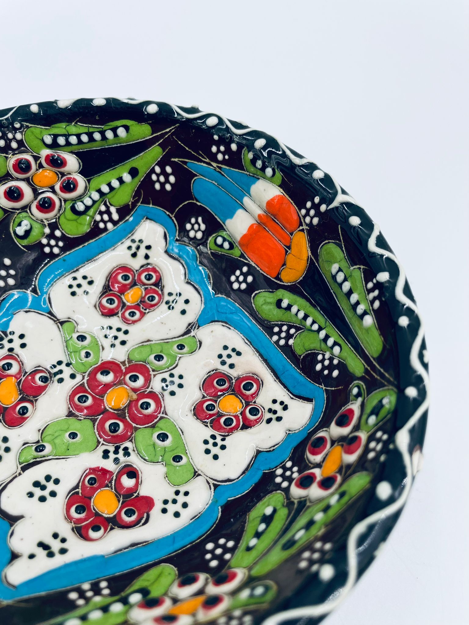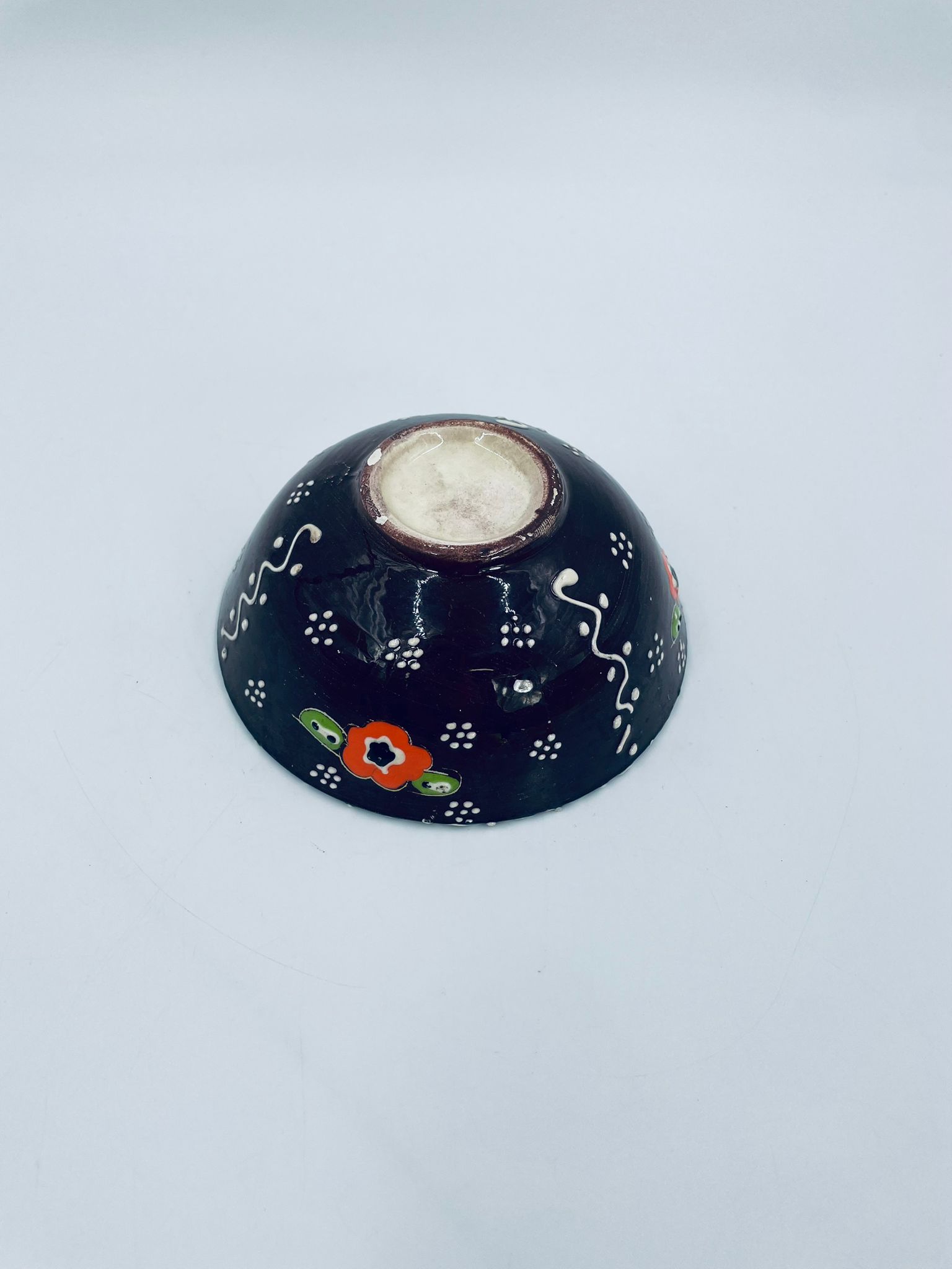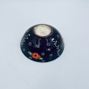 Miseczka, salaterka dekoracyjna w stylu Vintage, wykonana z wysokiej jakości tureckiej ceramiki. Miseczka w brązowym kolorze, ręcznie robiona, ręcznie malowana w orientalne, kolorowe wzory. Posiada pęknięcie szkliwa.