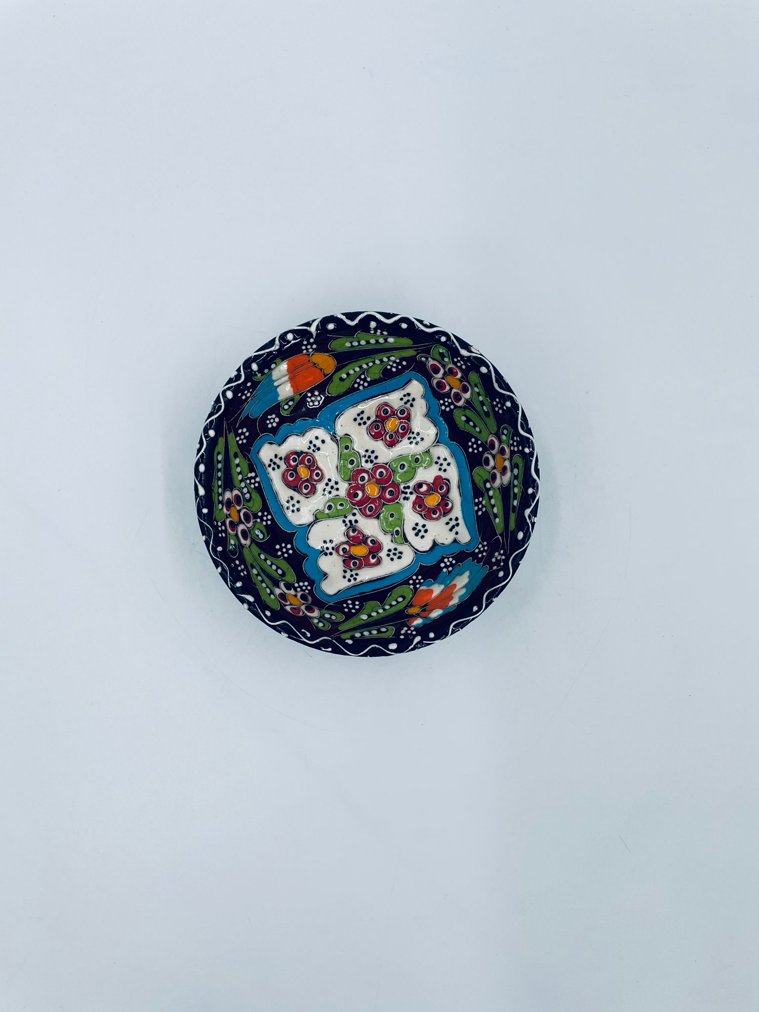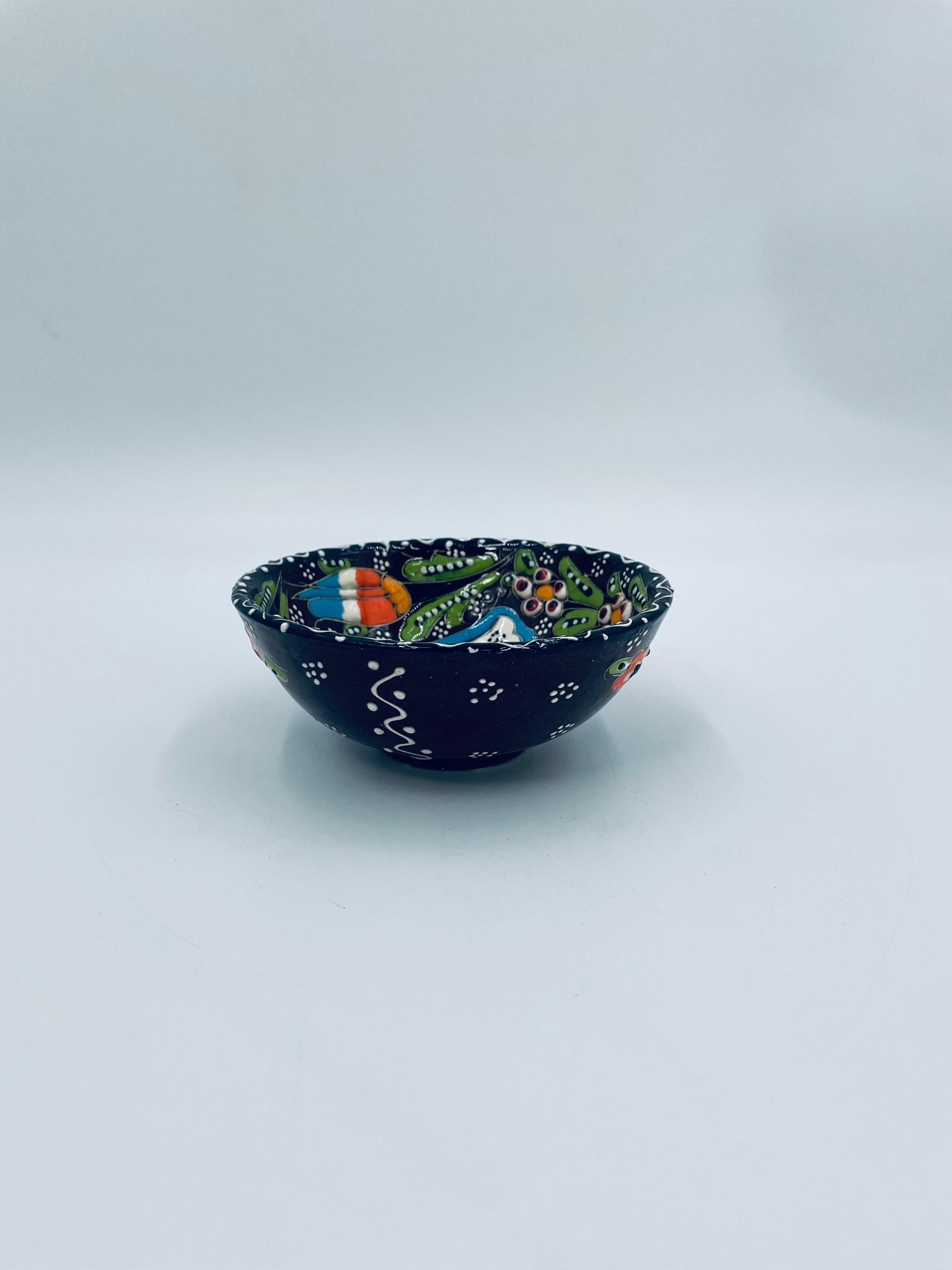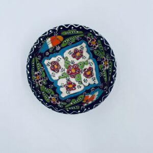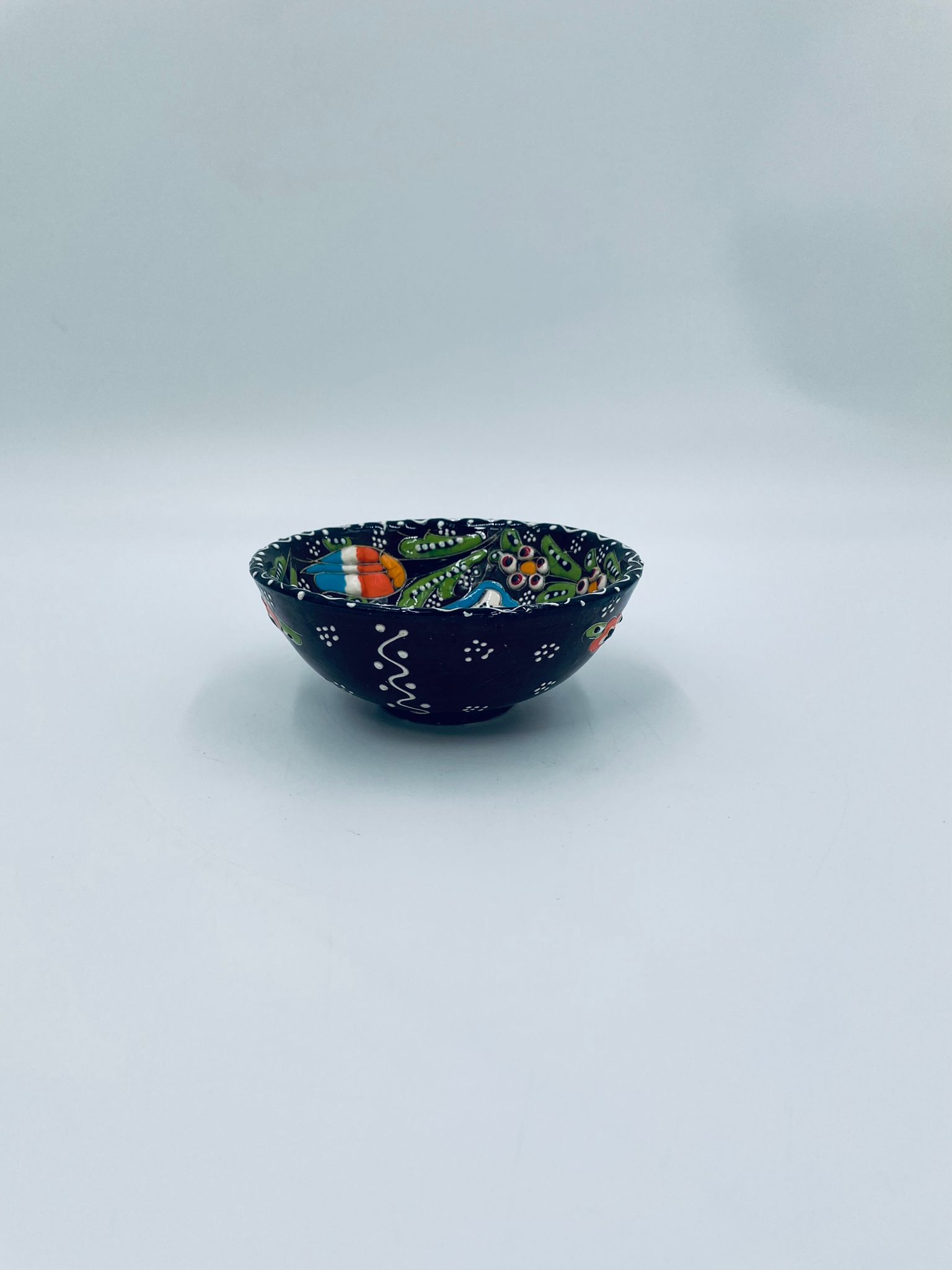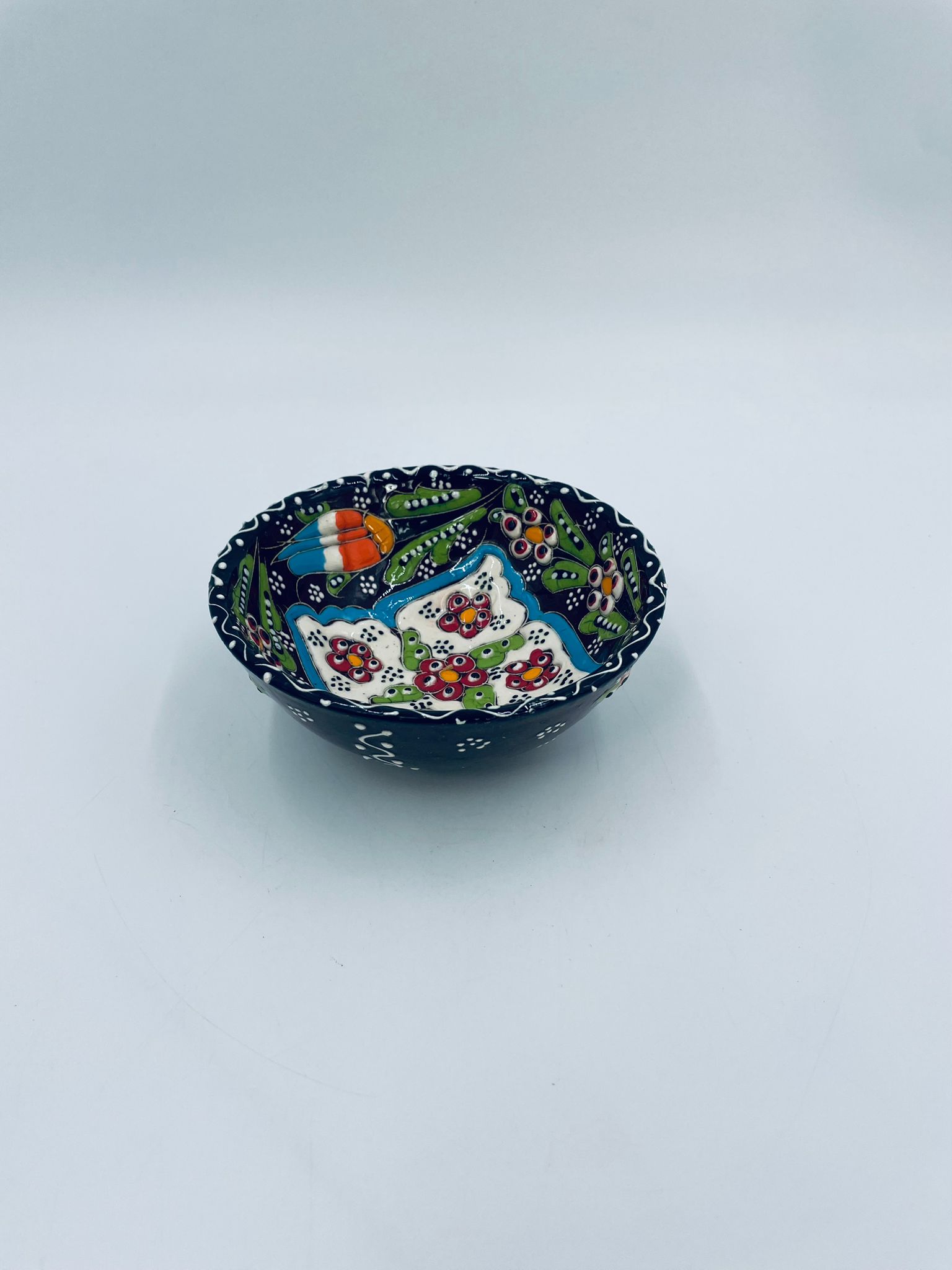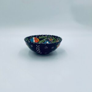 Miseczka, salaterka dekoracyjna w stylu Vintage, wykonana z wysokiej jakości tureckiej ceramiki. Miseczka w brązowym kolorze, ręcznie robiona, ręcznie malowana w orientalne, kolorowe wzory. Posiada pęknięcie szkliwa.