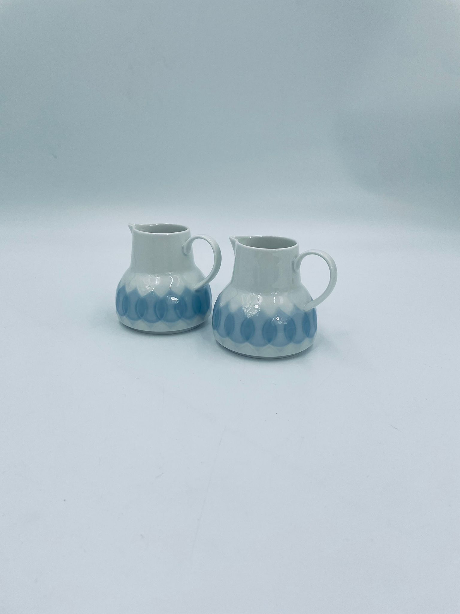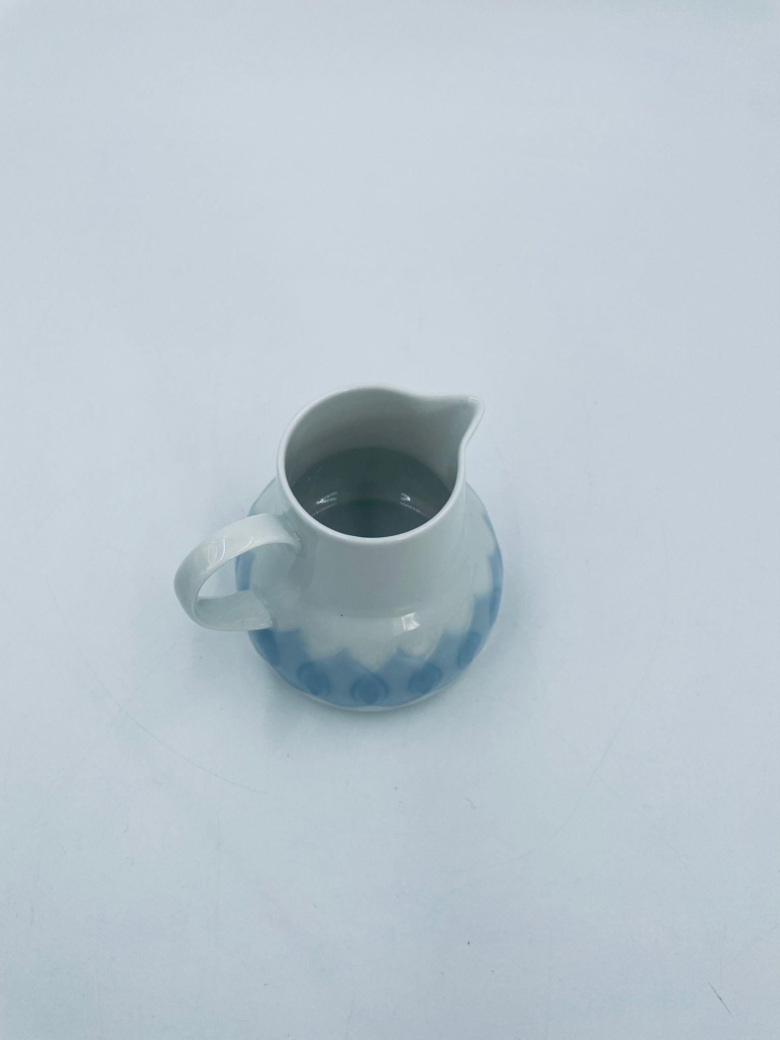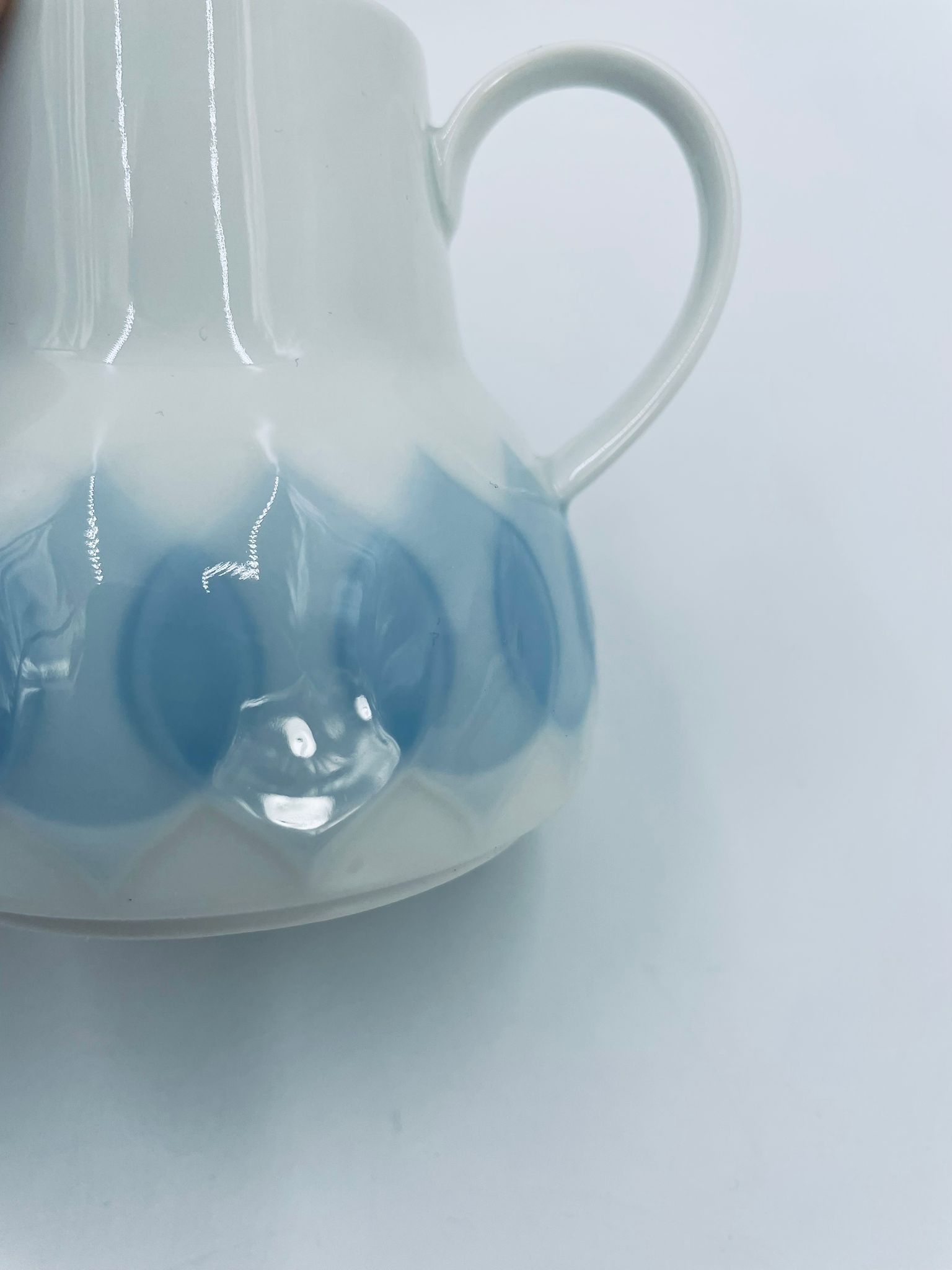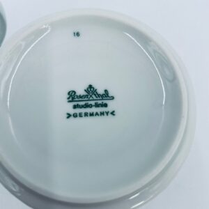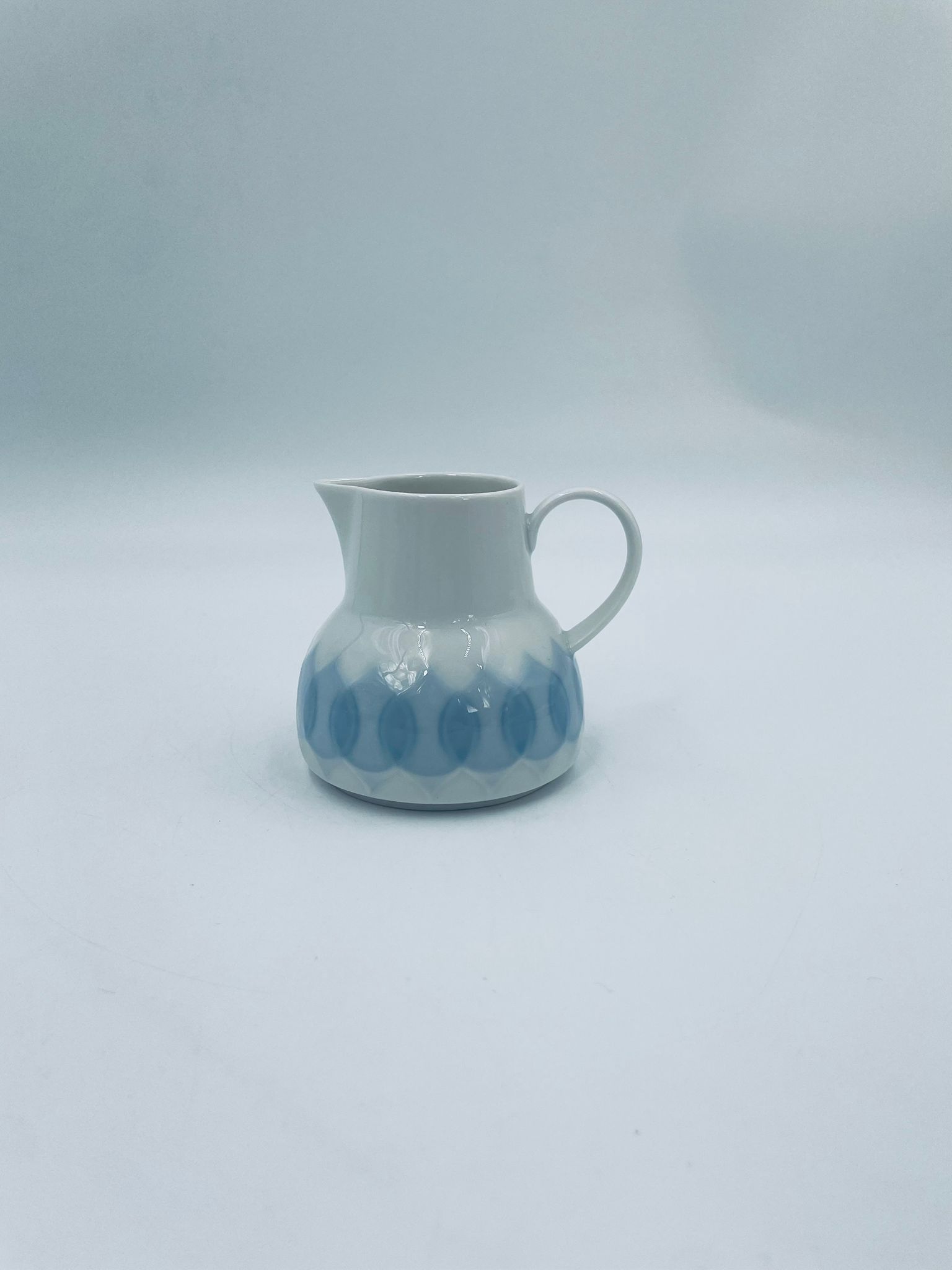 Dzbanuszek na mleko renomowanej wytwórni Rosenthal Studio Line z serii Lotus Blau , zaprojektowany przez duńskiego artystę Bjorna Wiinblada w 1964r, wykonany z najwyższej jakości białej porcelany. Dzbanuszek z uchwytem, ozdobiony wzorem „Blau” z delikatnym, geometrycznym motywem przypominający liście lotosu w niebieskim odcieniu.