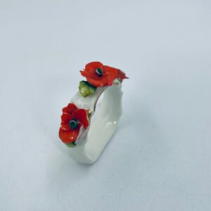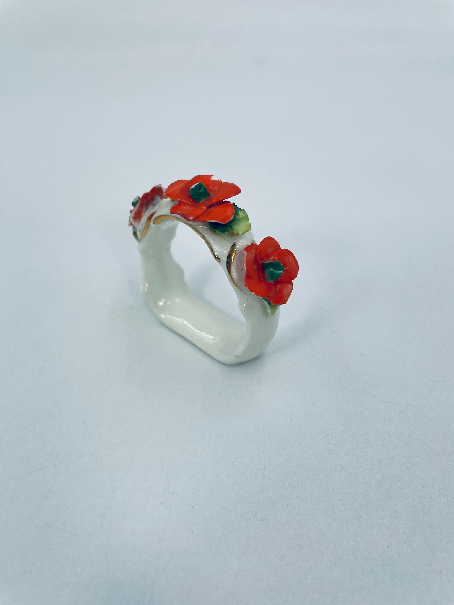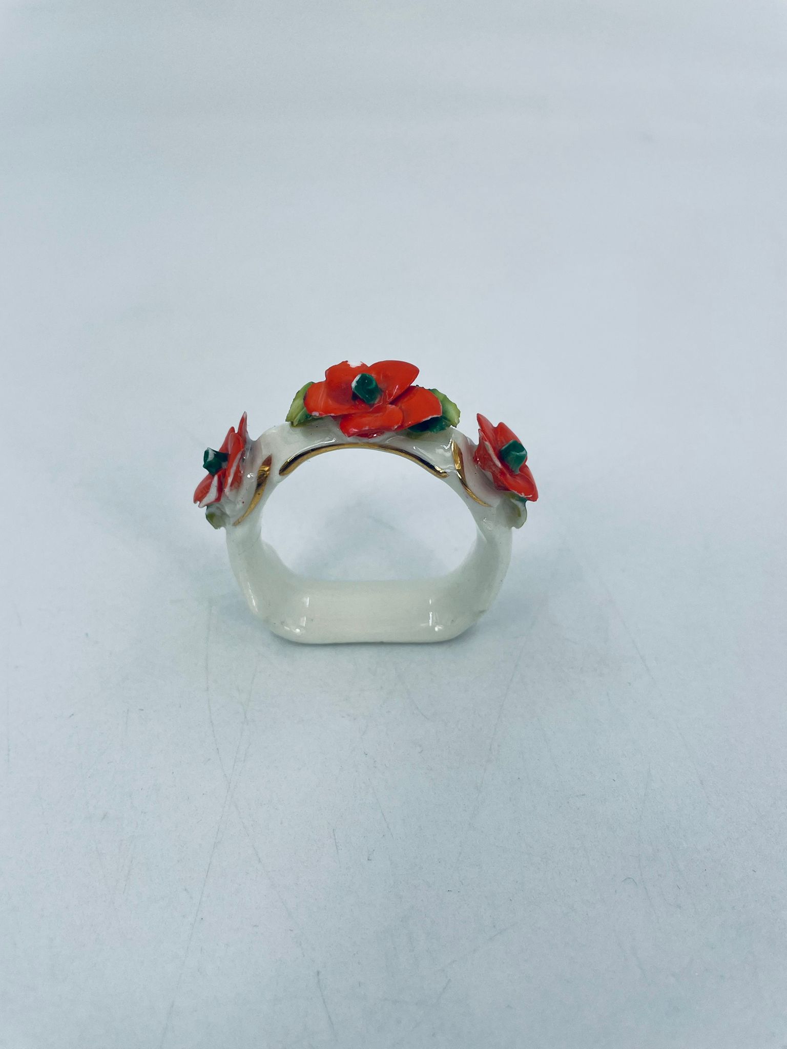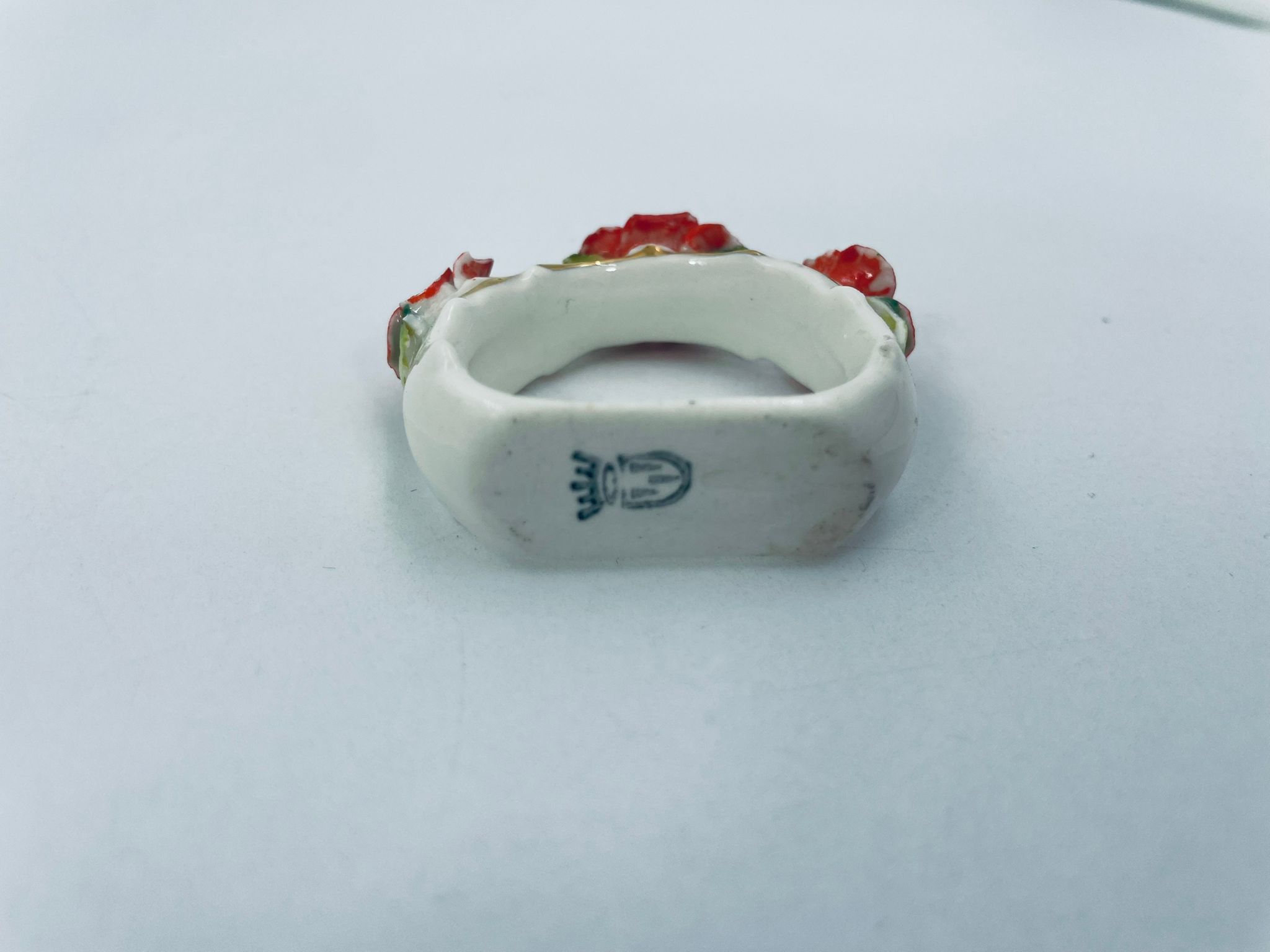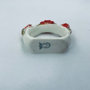 Obrączka na serwetkę, wykonana z wysokiej jakości porcelany w kolorze ecru, z odlewanymi różami w kolorze czerwieni, z zielonymi liśćmi, wykończona złotymi zdobieniami. Na różach sa uszczerbki oraz pęknięcie.