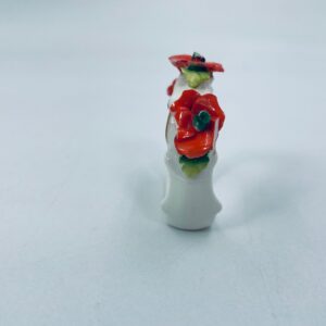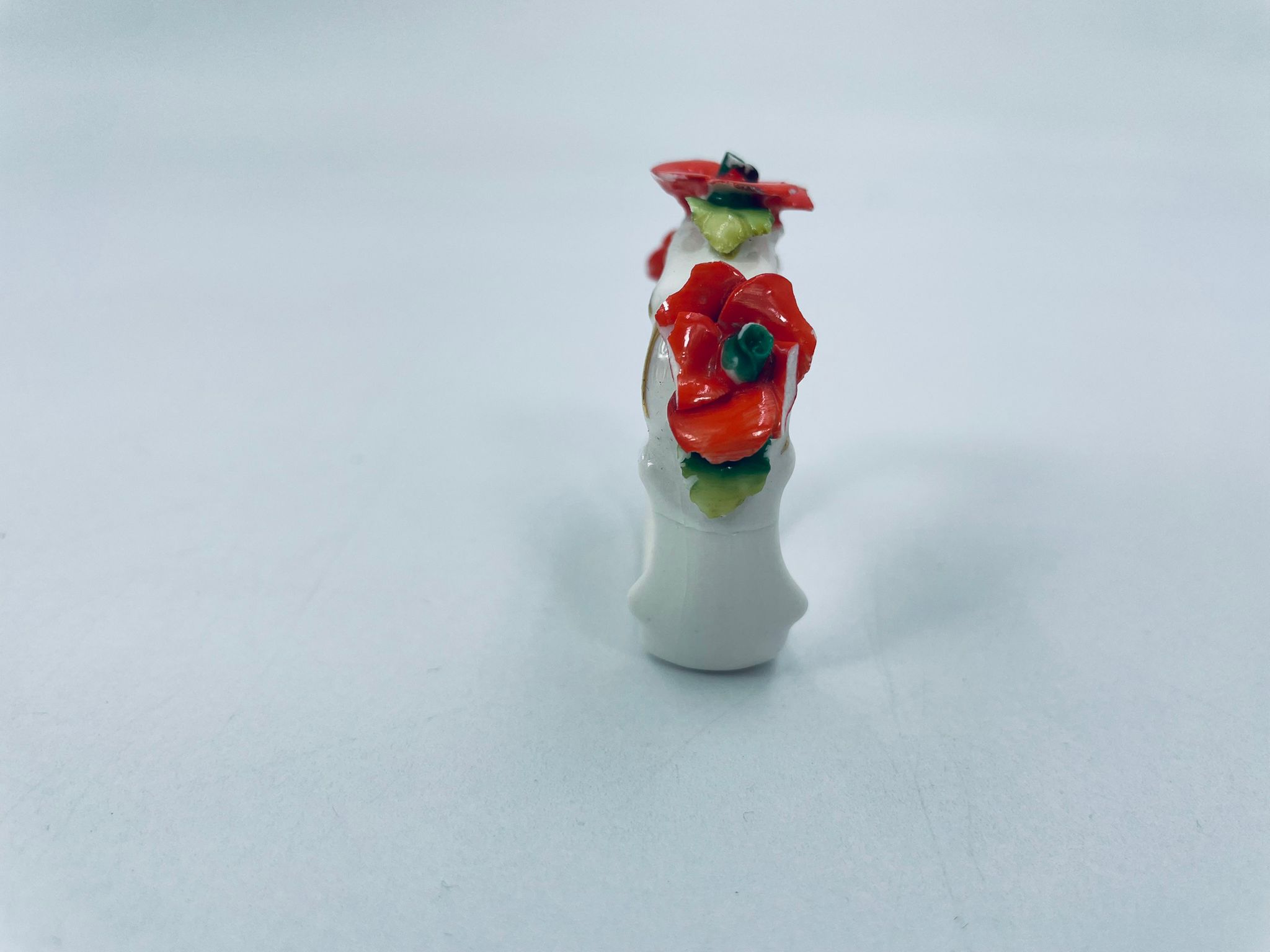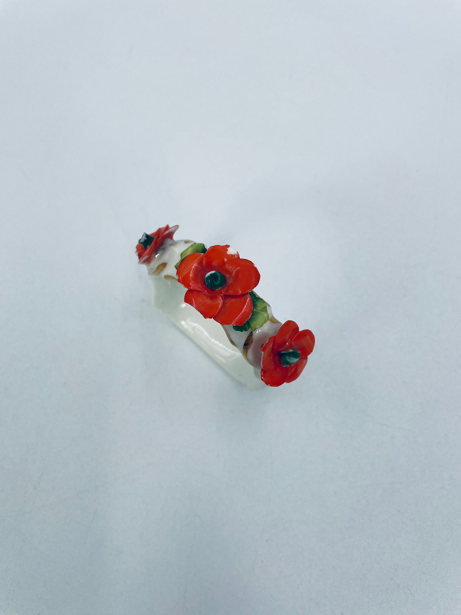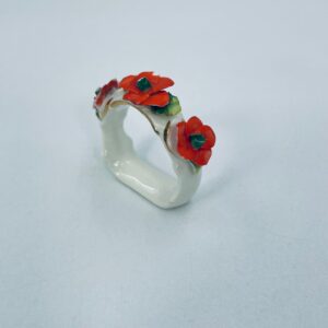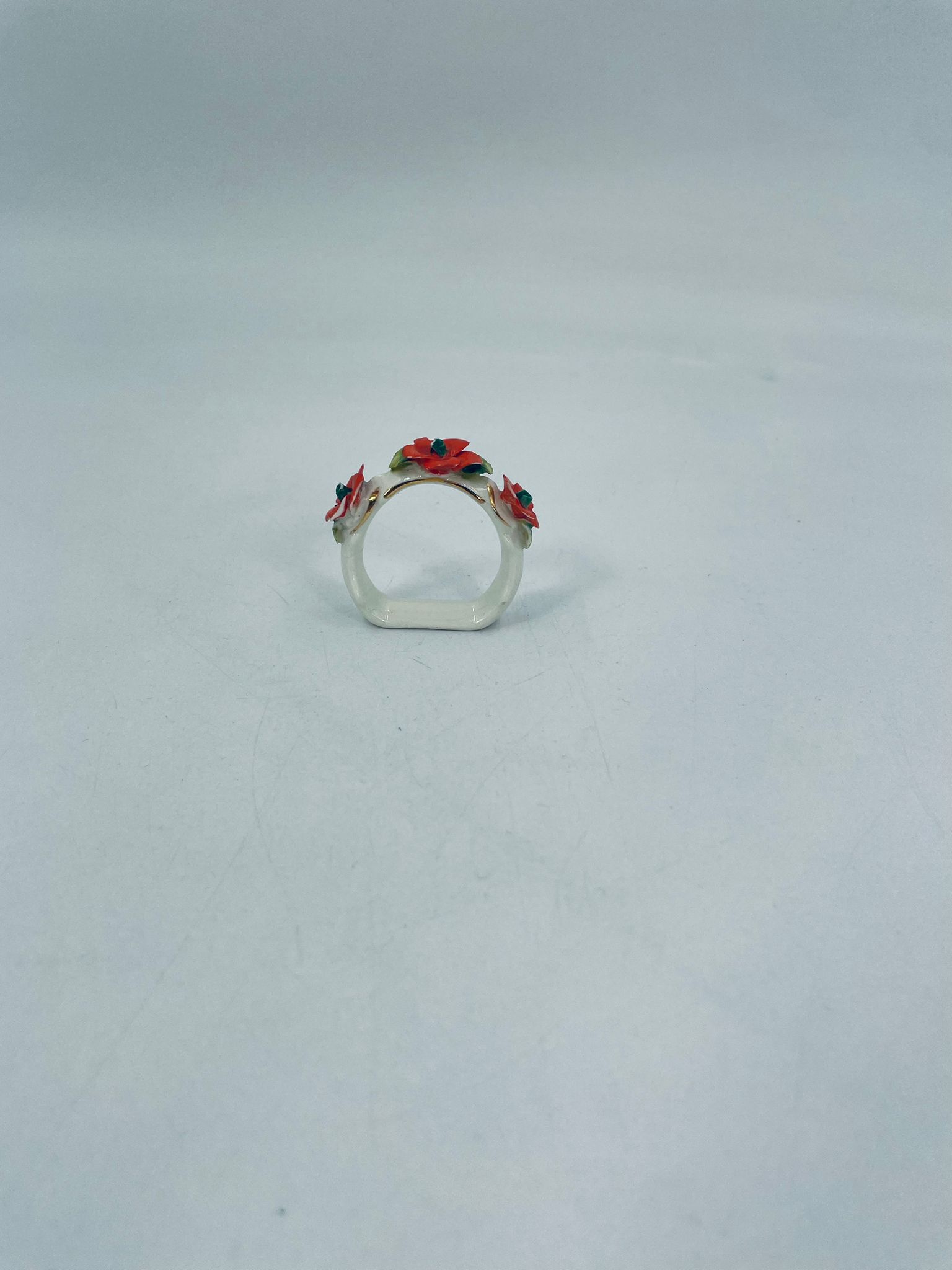 Obrączka na serwetkę, wykonana z wysokiej jakości porcelany w kolorze ecru, z odlewanymi różami w kolorze czerwieni, z zielonymi liśćmi, wykończona złotymi zdobieniami. Na różach sa uszczerbki oraz pęknięcie.