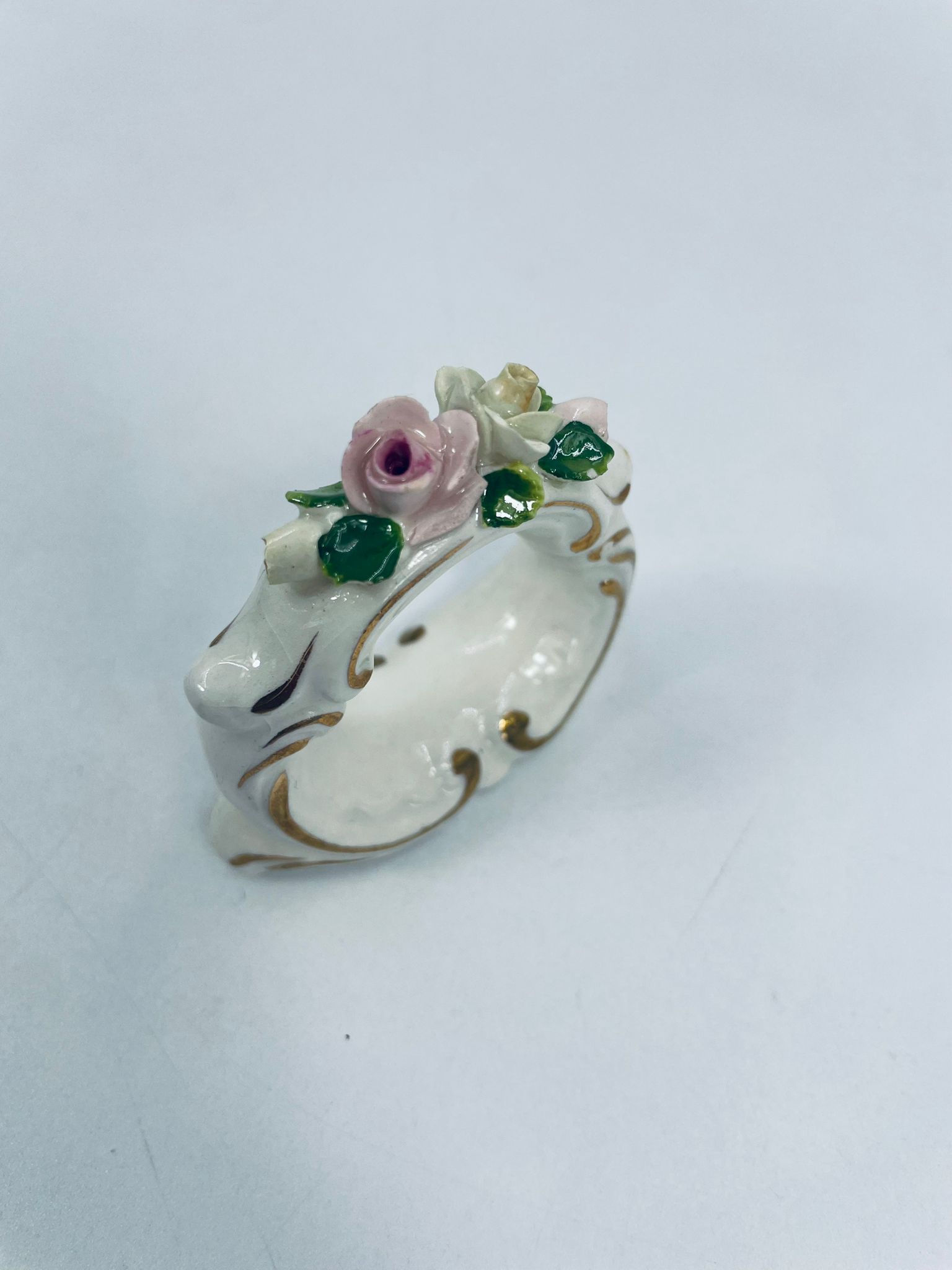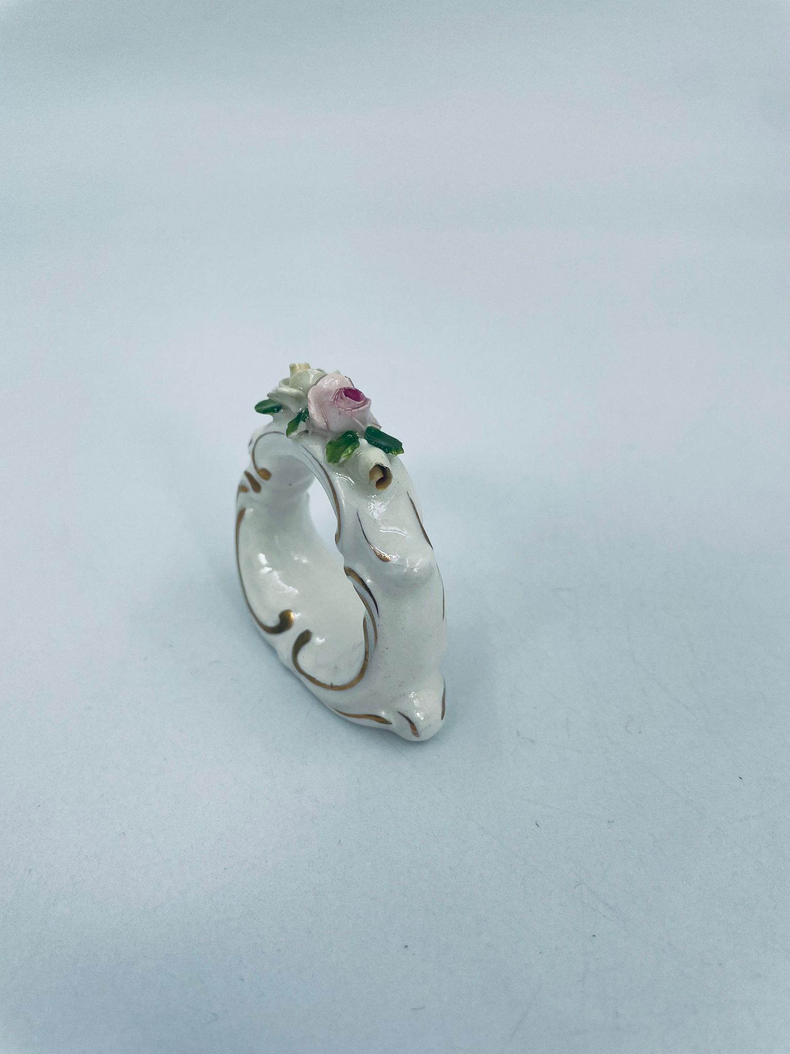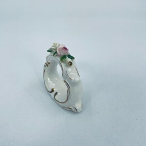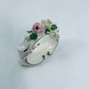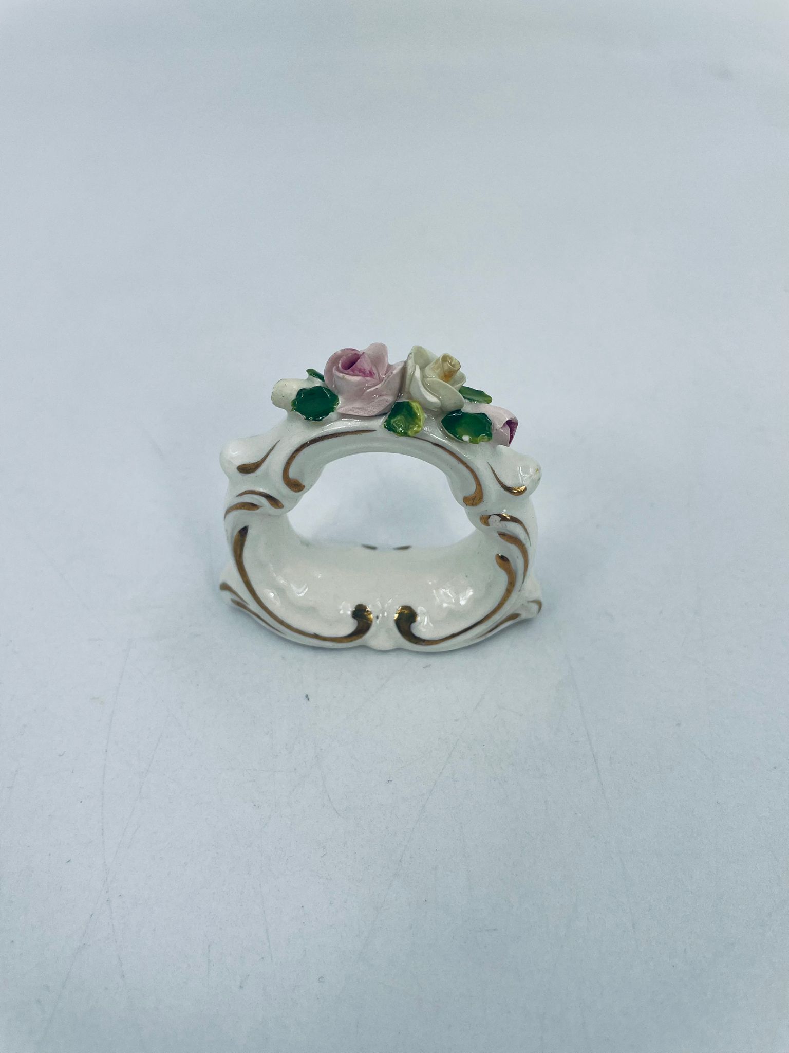 Obrączka na serwetkę, wykonana z wysokiej jakości porcelany w kolorze ecru, z odlewanymi różami w kolorze różu i żółci, z zielonymi liśćmi, wykończona złotymi zdobieniami. Na jednej róży jest uszczerbek.