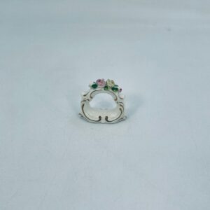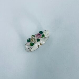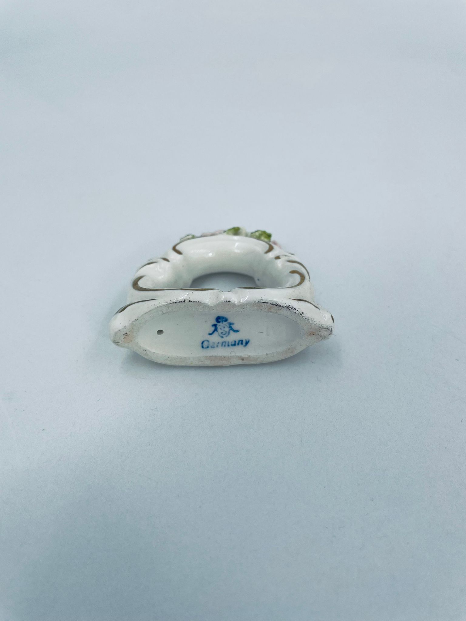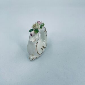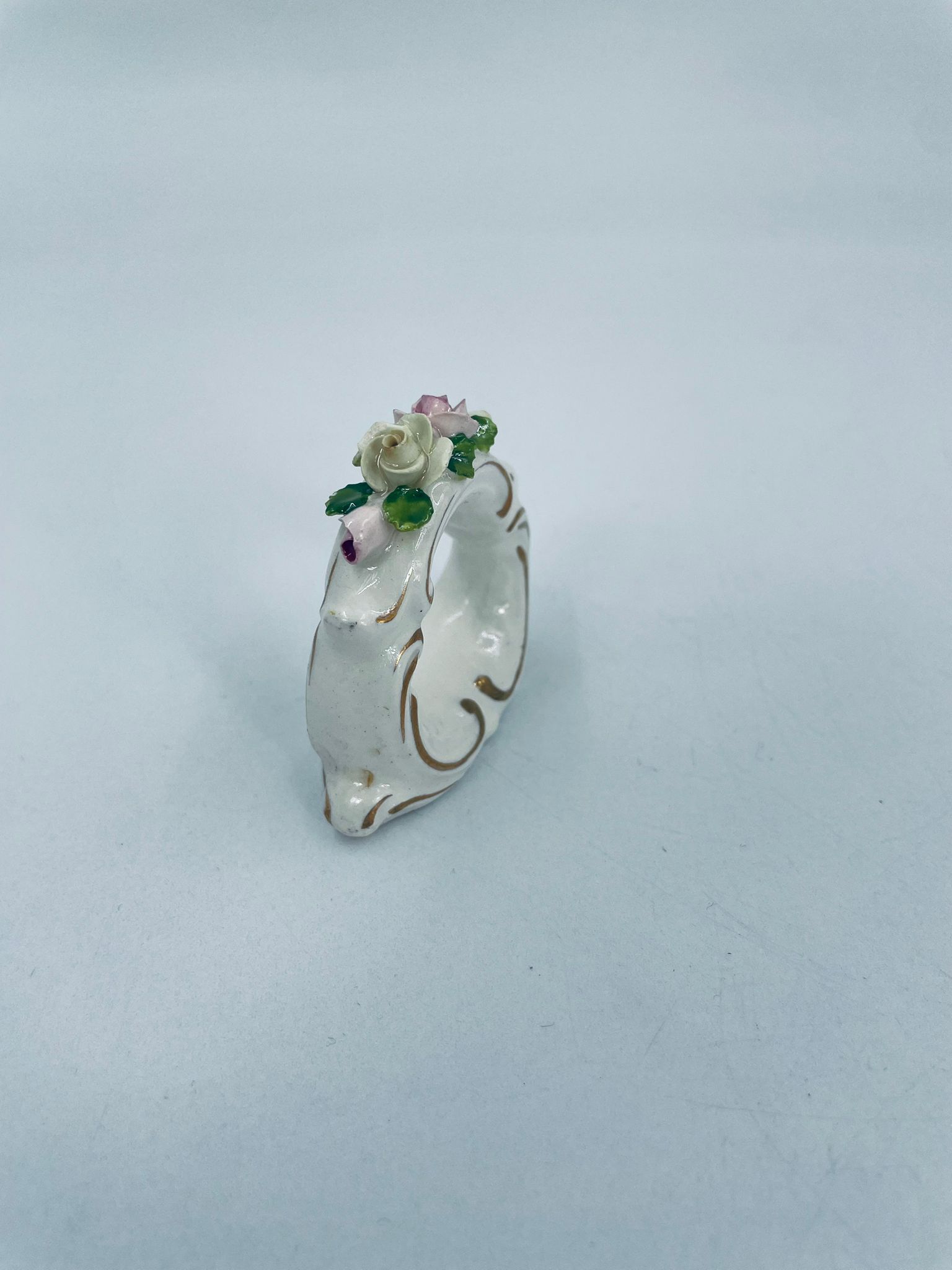 Obrączka na serwetkę, wykonana z wysokiej jakości porcelany w kolorze ecru, z odlewanymi różami w kolorze różu i żółci, z zielonymi liśćmi, wykończona złotymi zdobieniami. Na jednej róży jest uszczerbek.