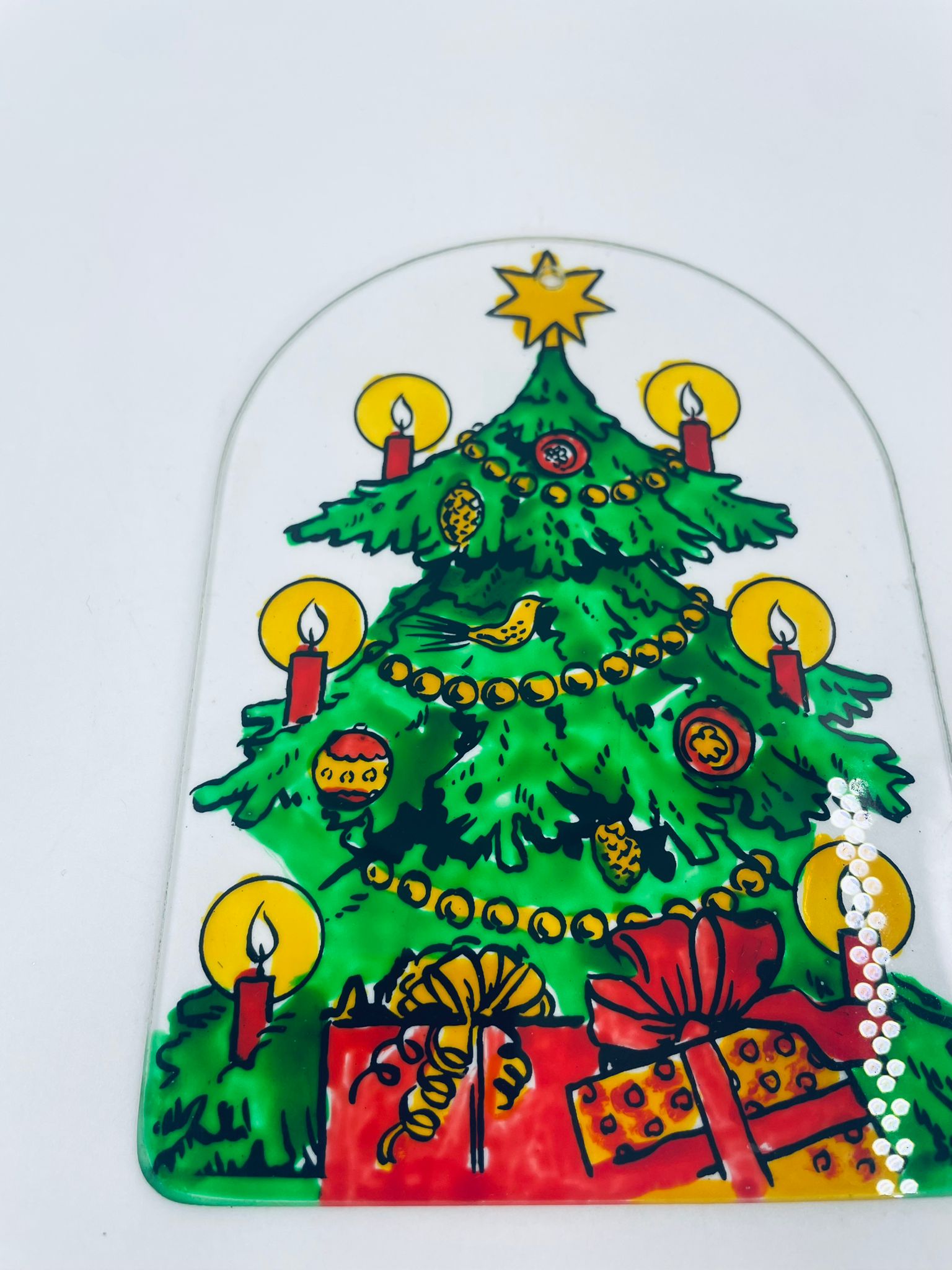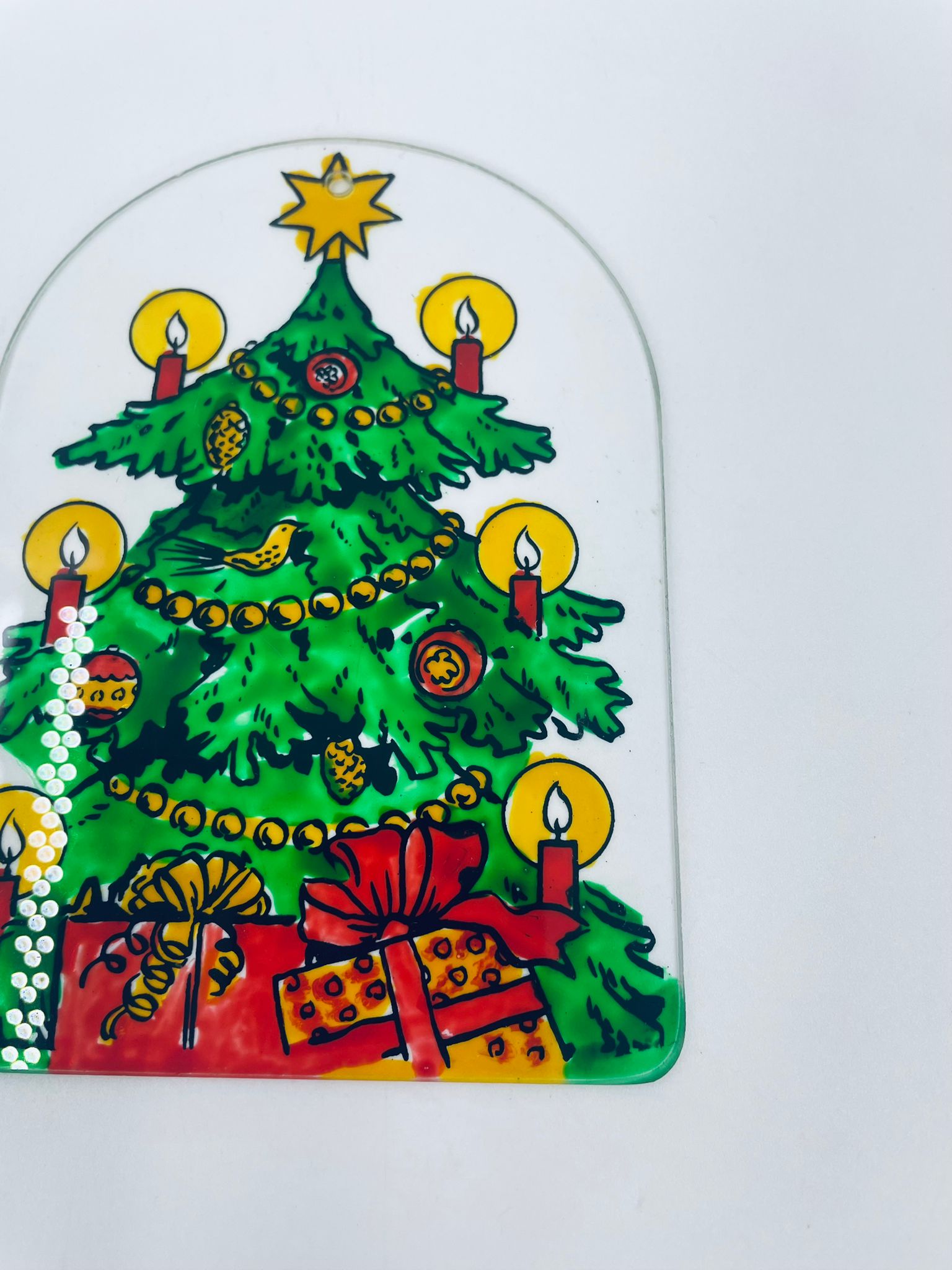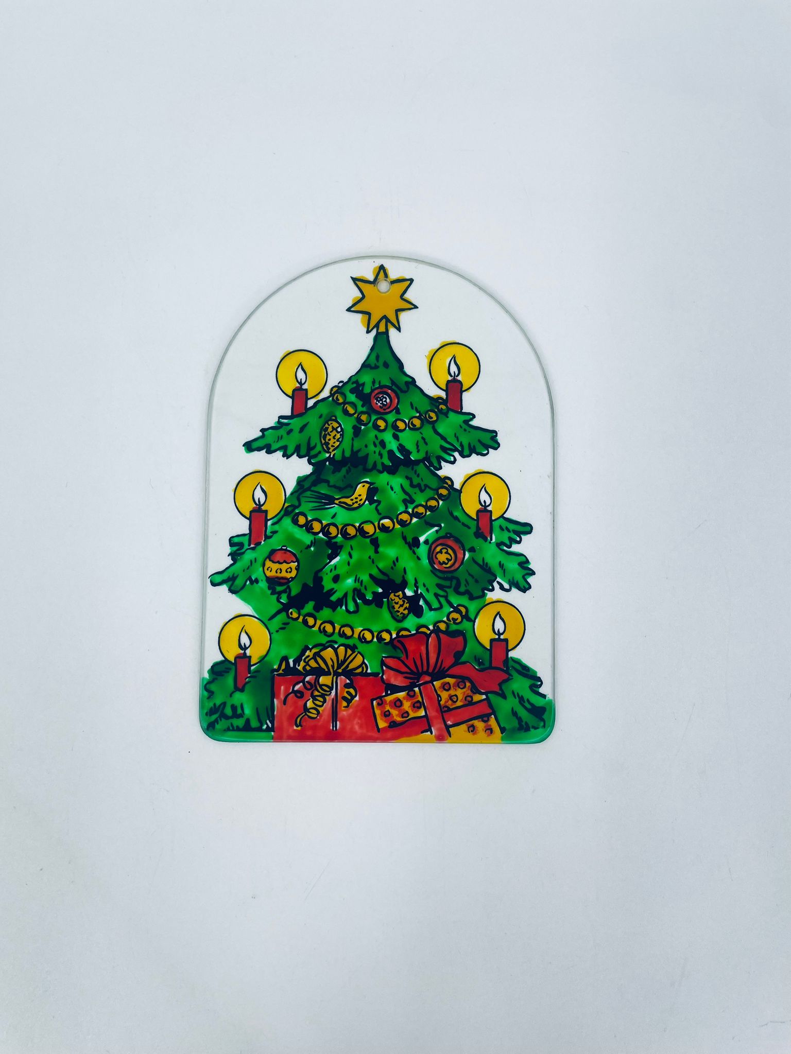 Ozdoba świąteczna witrażowa w stylu Vintage. Ozdoba ma kształt zaokrąglonego prostokąta, Centralny motyw to ilustracja choinki bożonarodzeniowej, udekorowanej w ozdobne bombki, łańcuchy i świeczki.