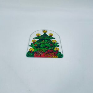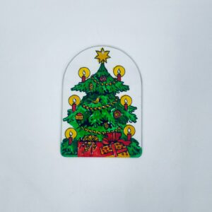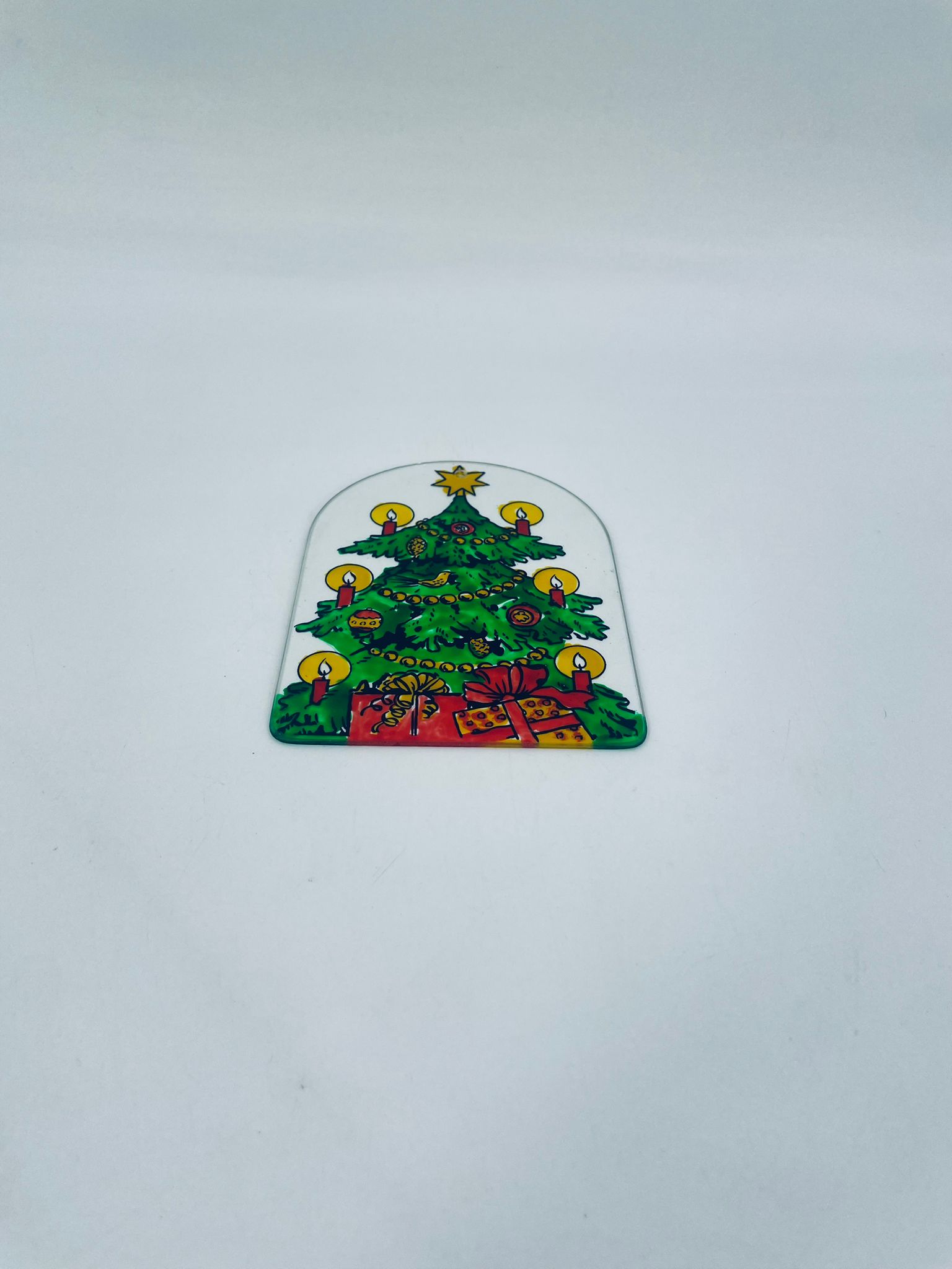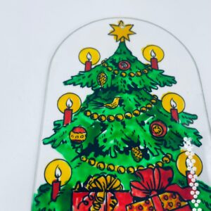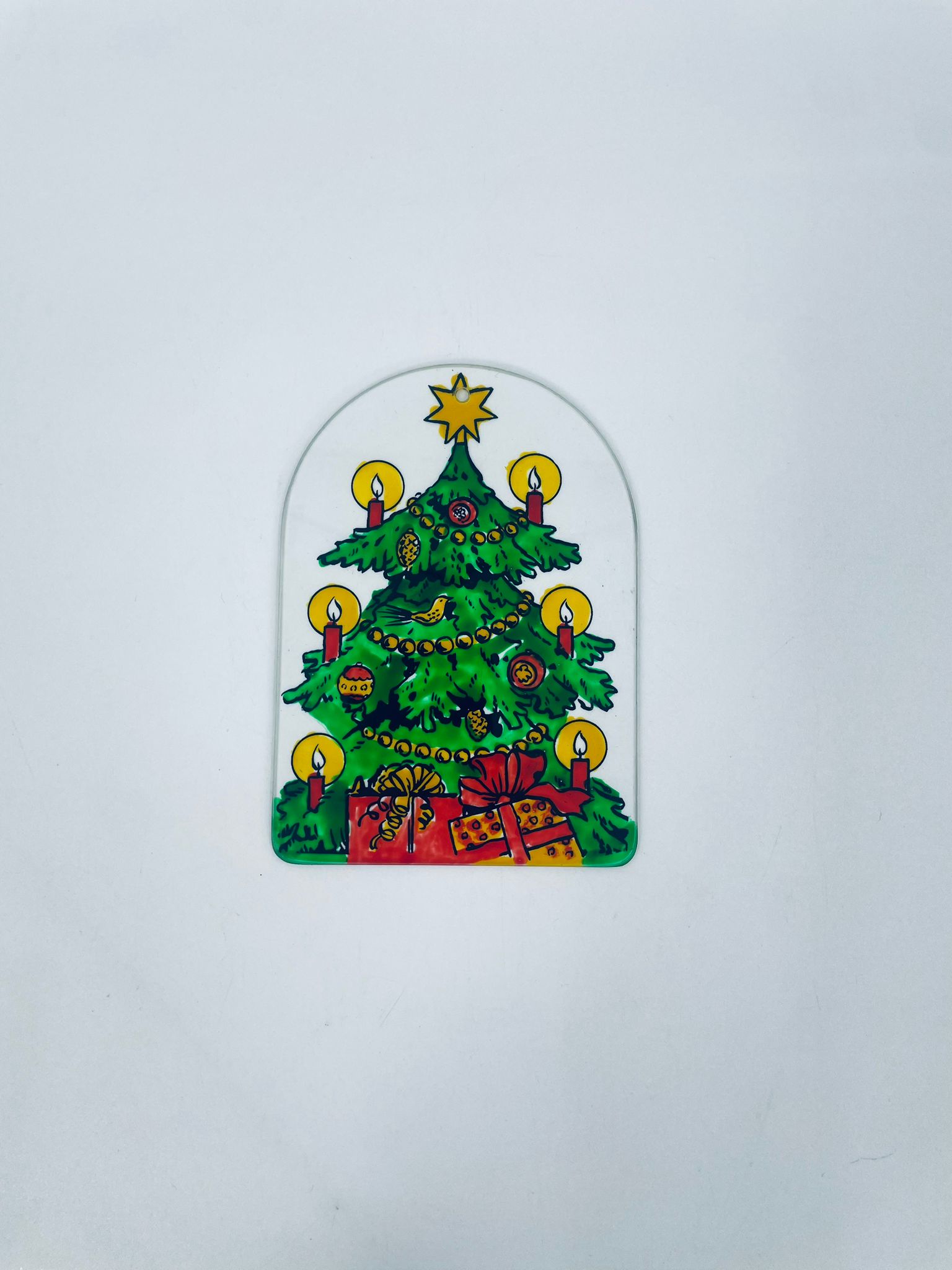 Ozdoba świąteczna witrażowa w stylu Vintage. Ozdoba ma kształt zaokrąglonego prostokąta, Centralny motyw to ilustracja choinki bożonarodzeniowej, udekorowanej w ozdobne bombki, łańcuchy i świeczki.