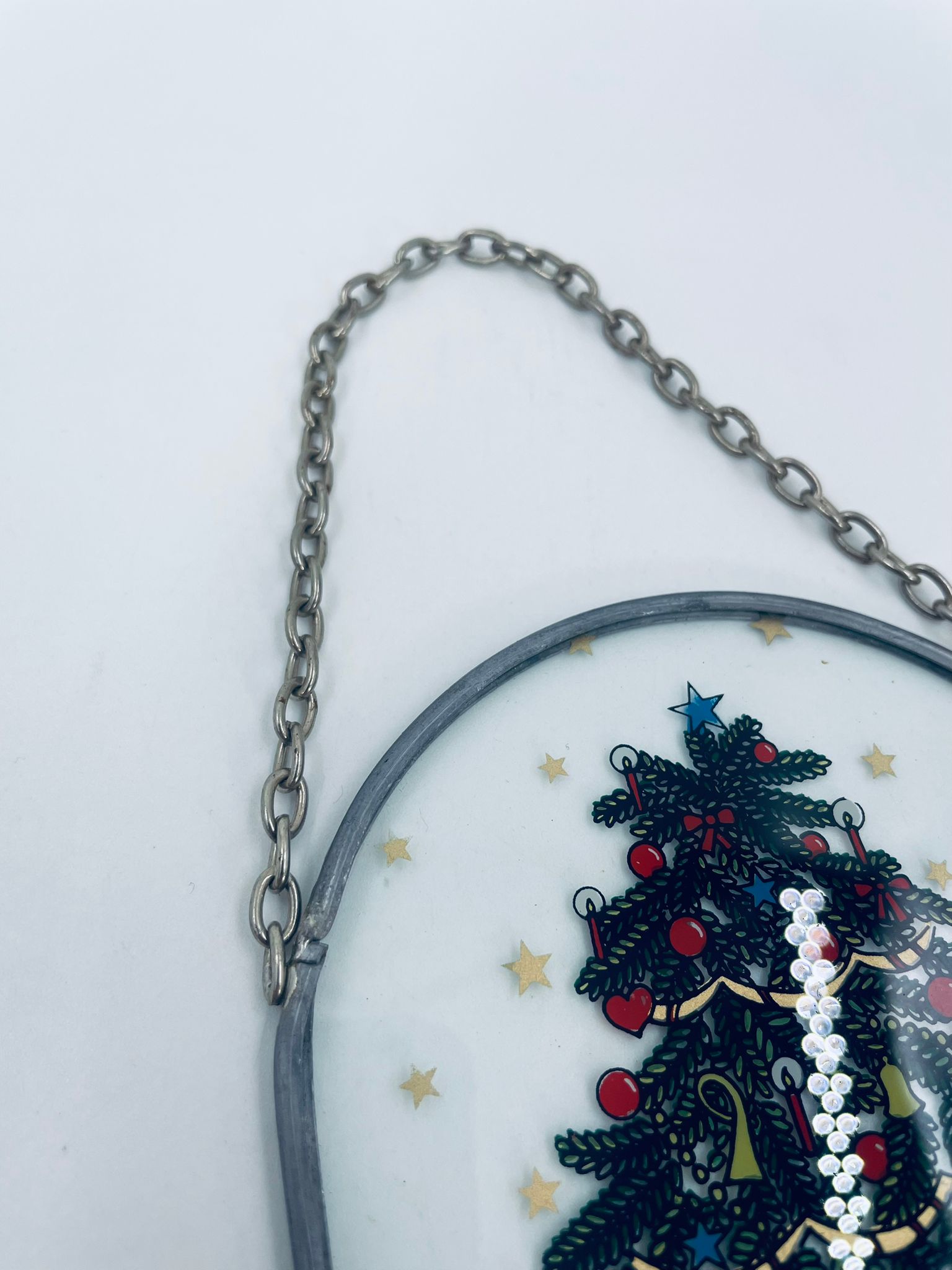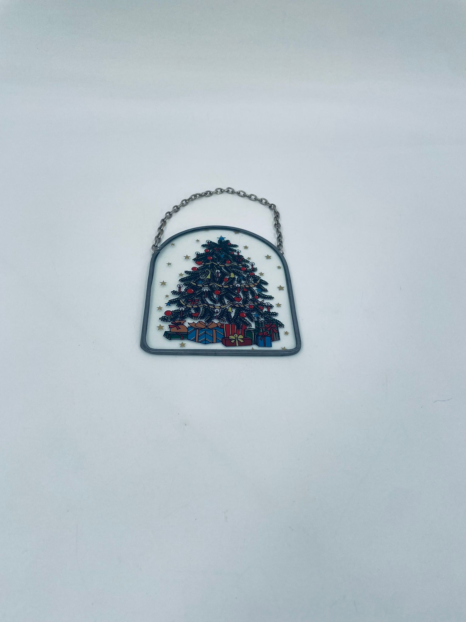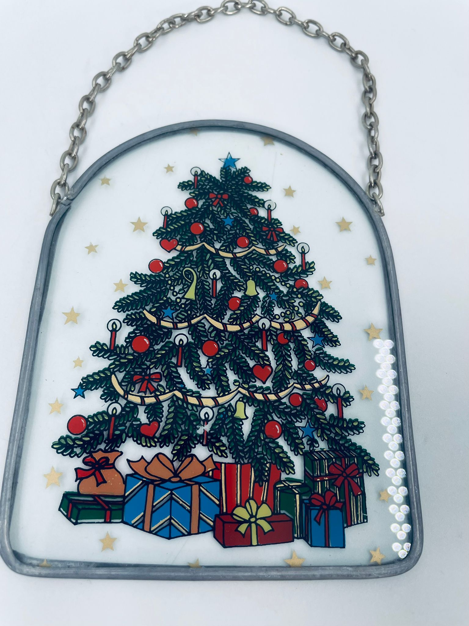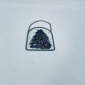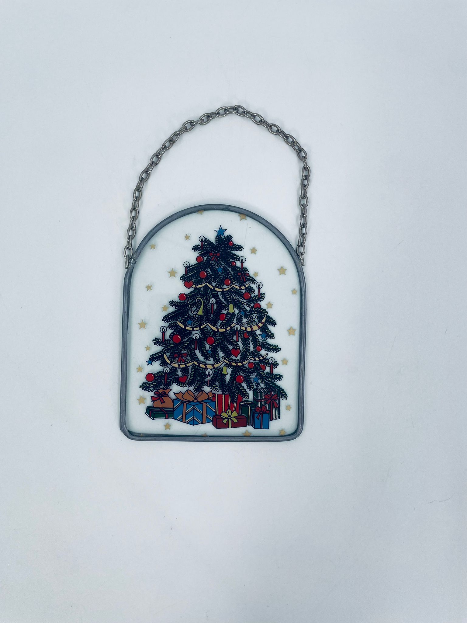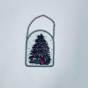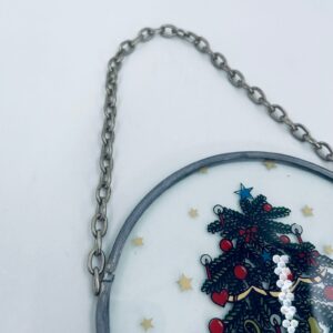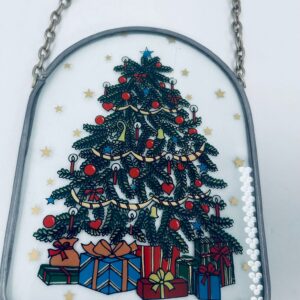 Ozdoba świąteczna witrażowa w stylu Vintage. Ozdoba ma kształt zaokrąglonego prostokąta, oprawionego w metalową ramkę z łańcuszkiem do powieszenia. Centralny motyw to ilustracja choinki bożonarodzeniowej, udekorowanej w ozdobne bombki, łańcuchy i świeczki.