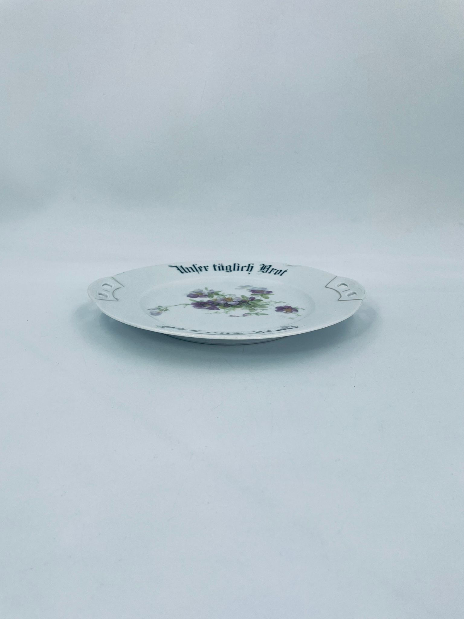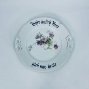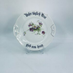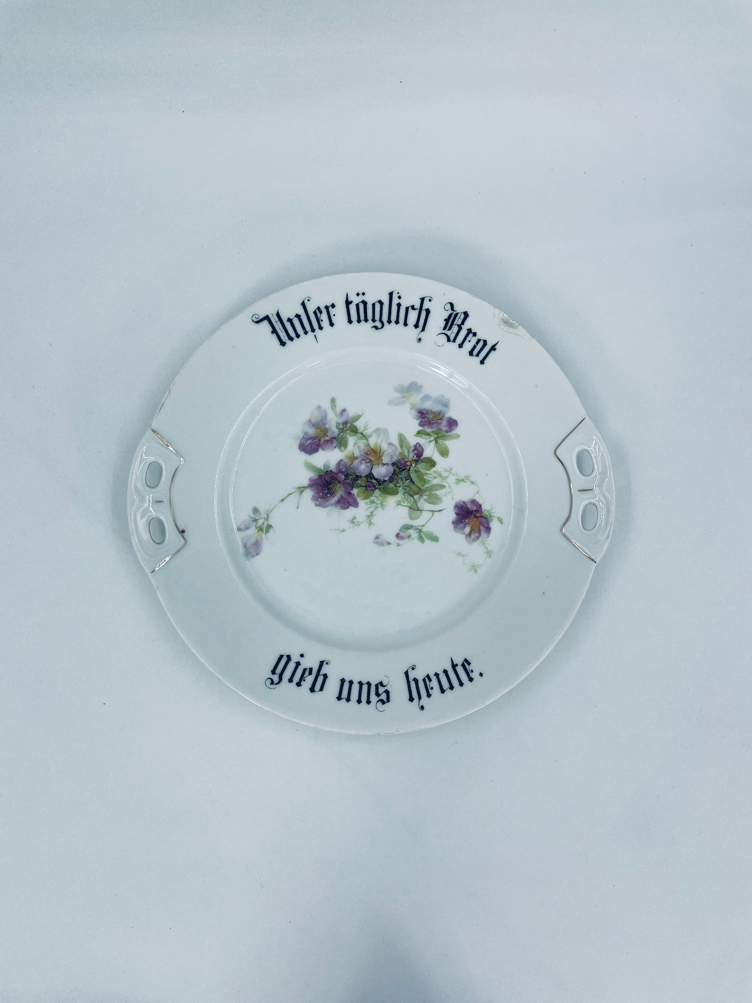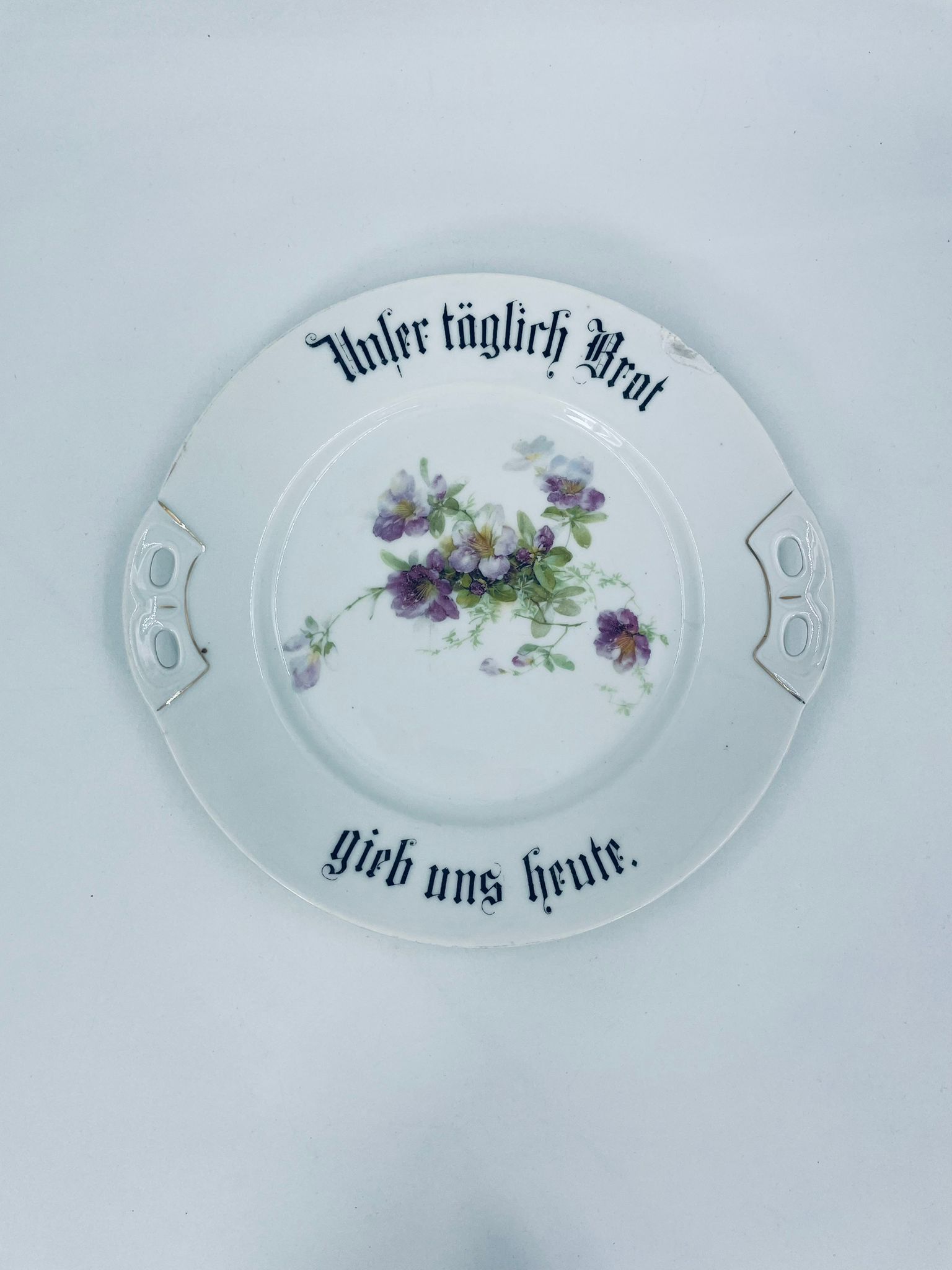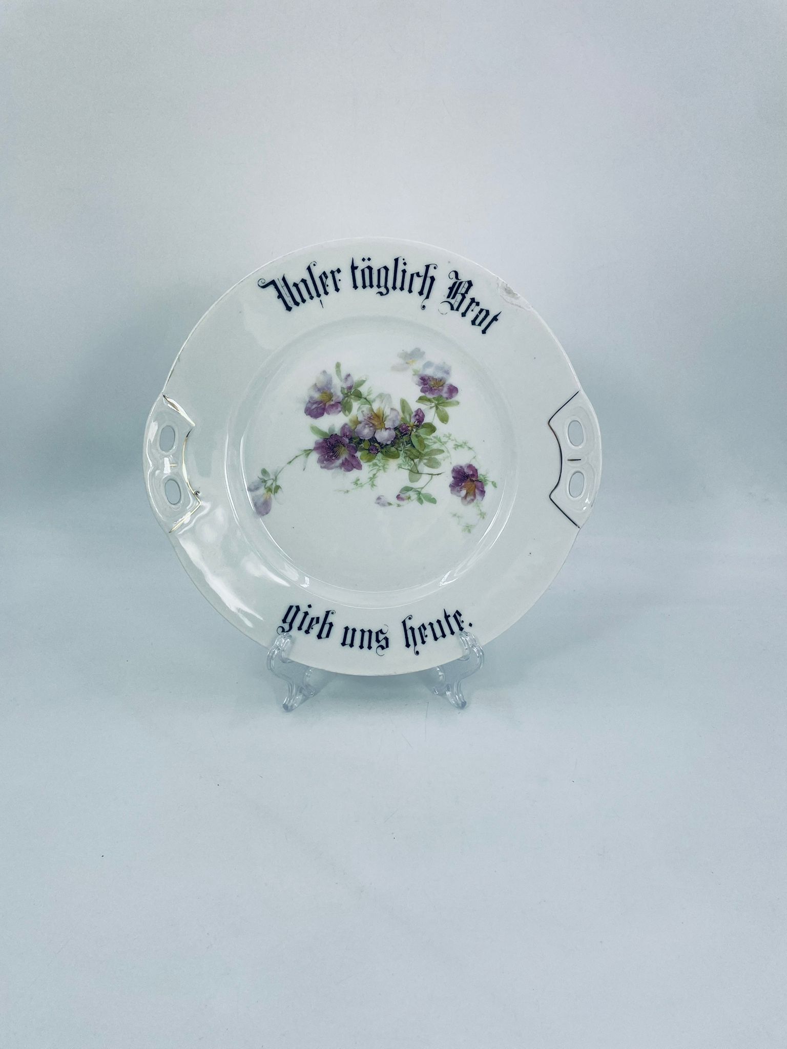 Antyczna patera dekoracyjna w stylu Vintage, wykonana z wysokiej jakości białej porcelany. Patera charakteryzuje się dwoma ozdobnymi uchwytami ze złotymi akcentami oraz wzorem bykietu delikatnych kwiatów w odcieniach filetu, bieli i zieleni. Na tworzy widnieje napis, który jest częścią modlitwy „Ojcze Nasz” oznaczający „Chleba Naszego powszedniego daj Nam dzisiaj” talerz posiada uszczerbek na rancie.
