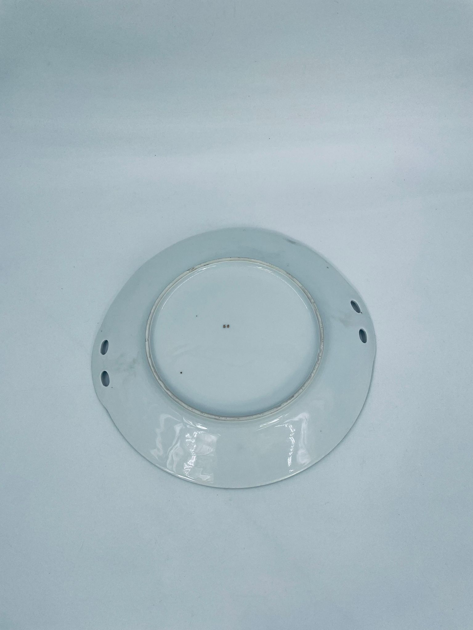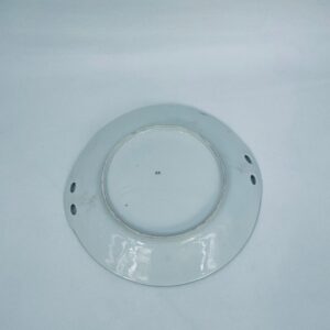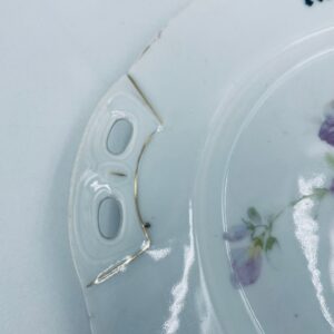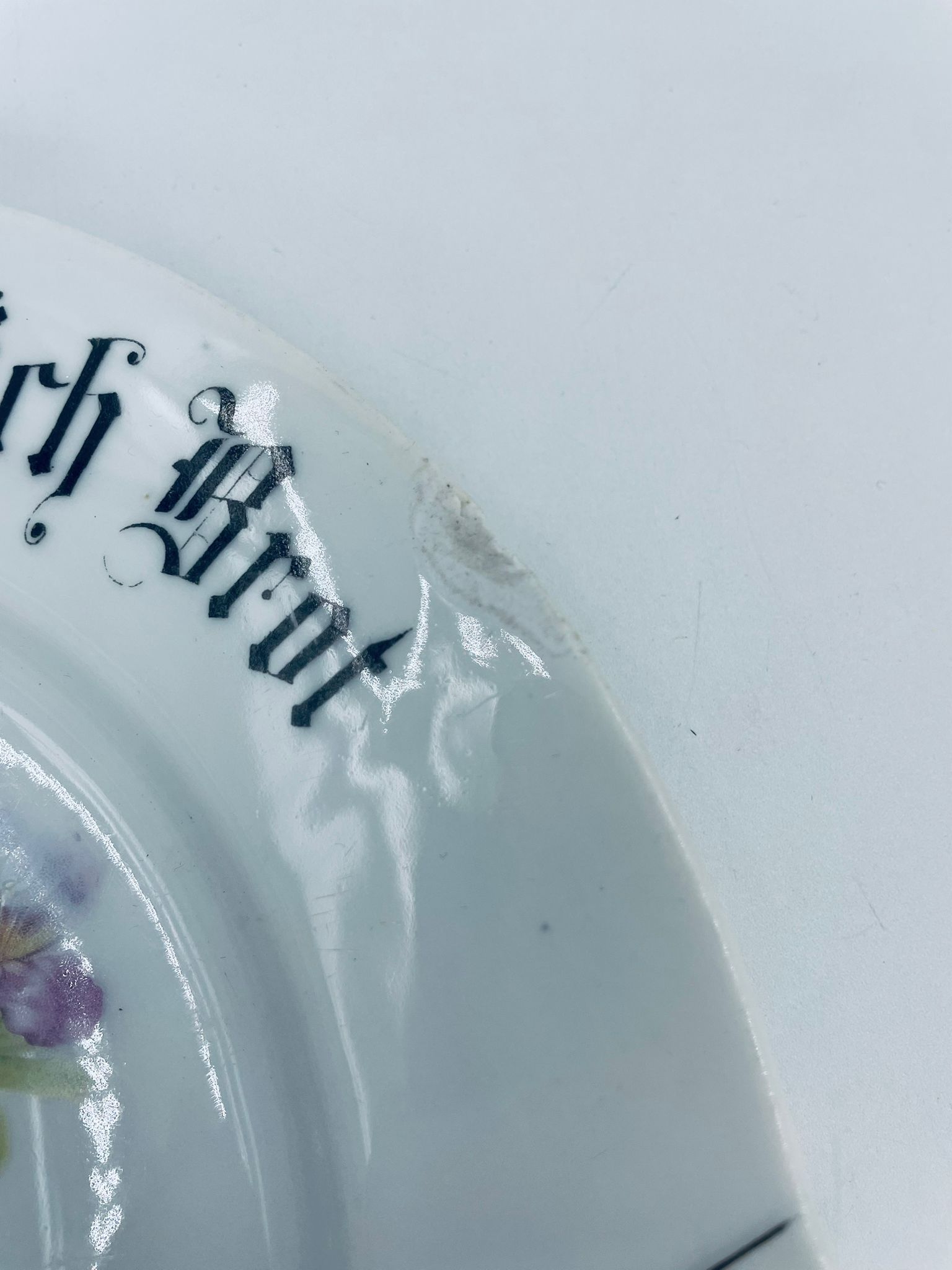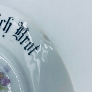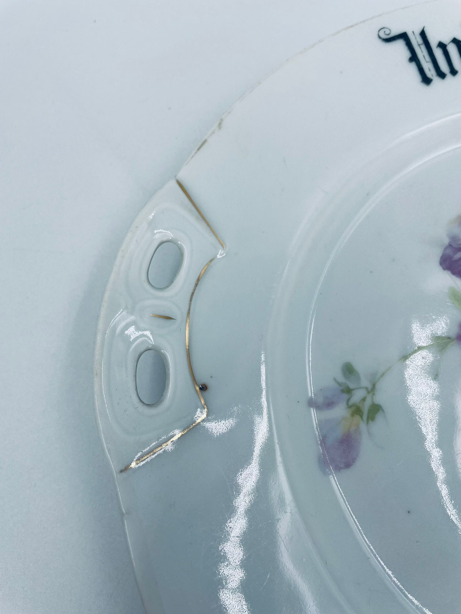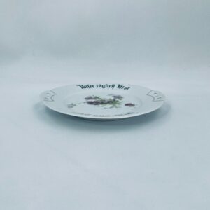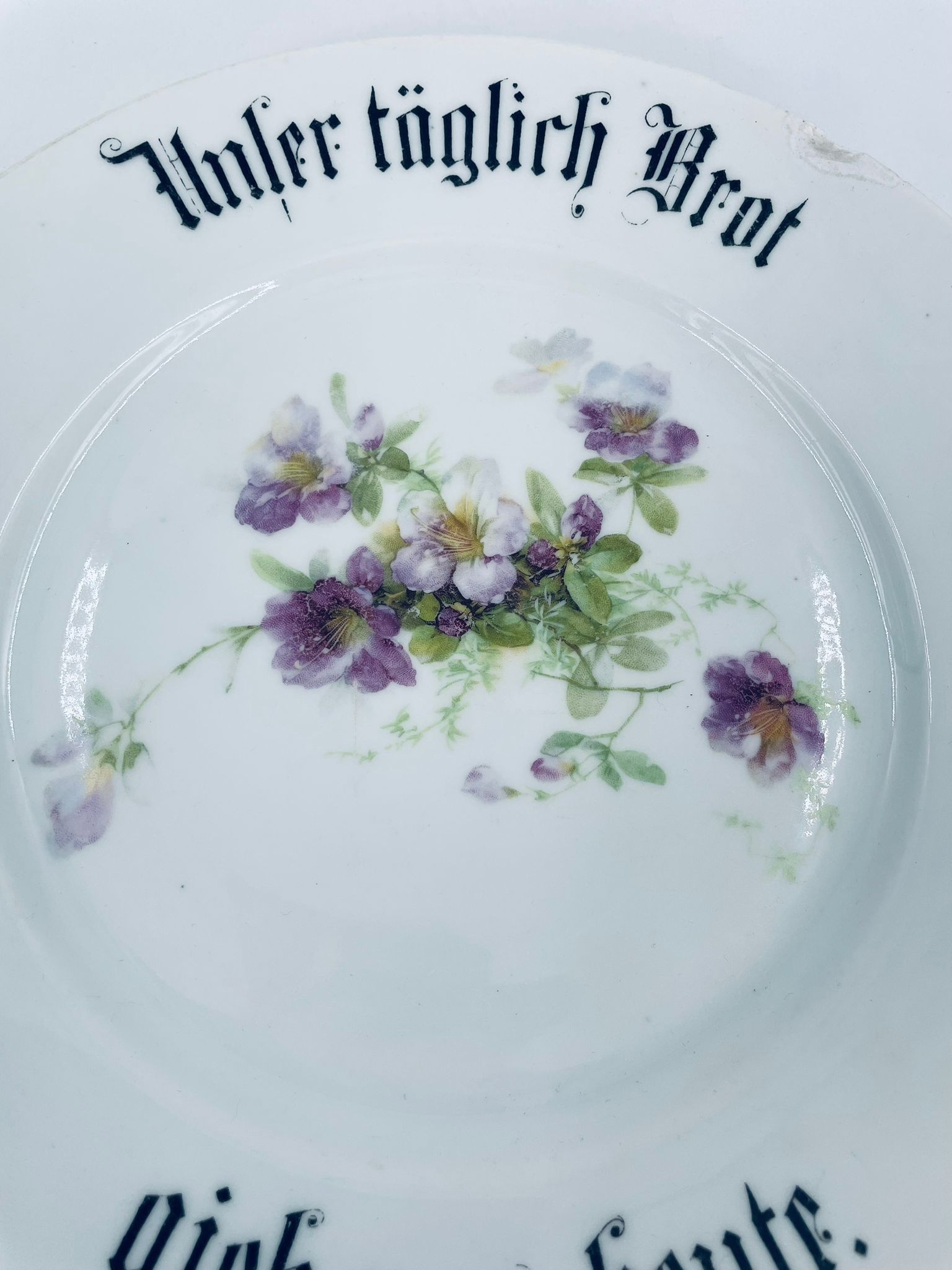 Antyczna patera dekoracyjna w stylu Vintage, wykonana z wysokiej jakości białej porcelany. Patera charakteryzuje się dwoma ozdobnymi uchwytami ze złotymi akcentami oraz wzorem bykietu delikatnych kwiatów w odcieniach filetu, bieli i zieleni. Na tworzy widnieje napis, który jest częścią modlitwy „Ojcze Nasz” oznaczający „Chleba Naszego powszedniego daj Nam dzisiaj” talerz posiada uszczerbek na rancie.