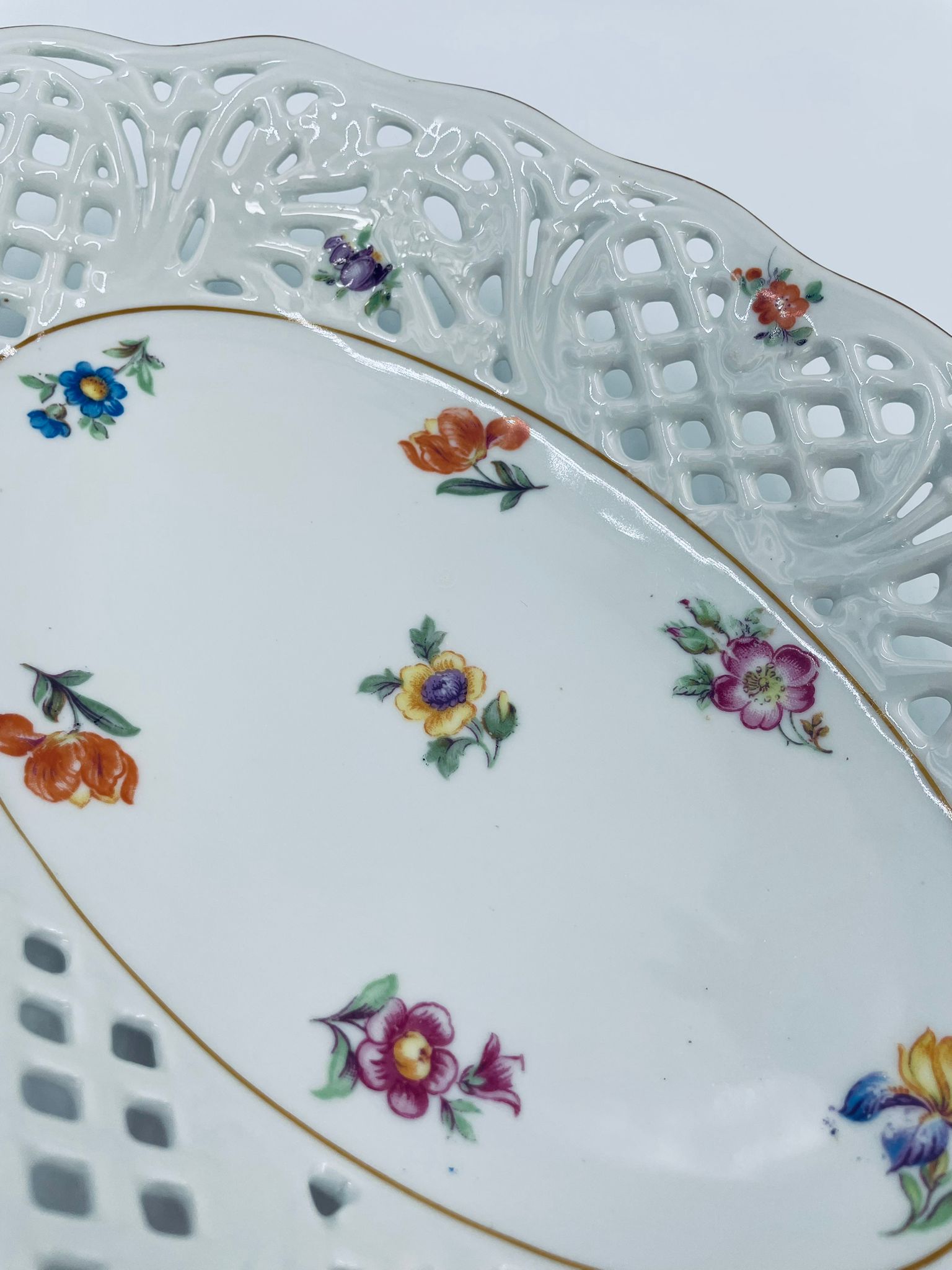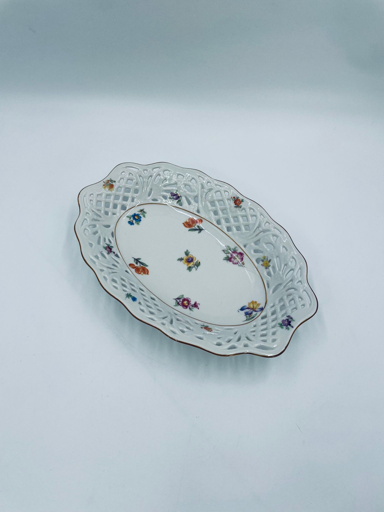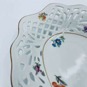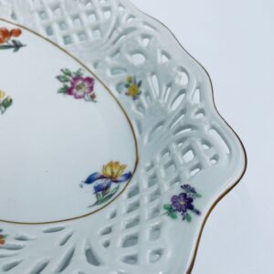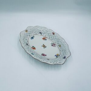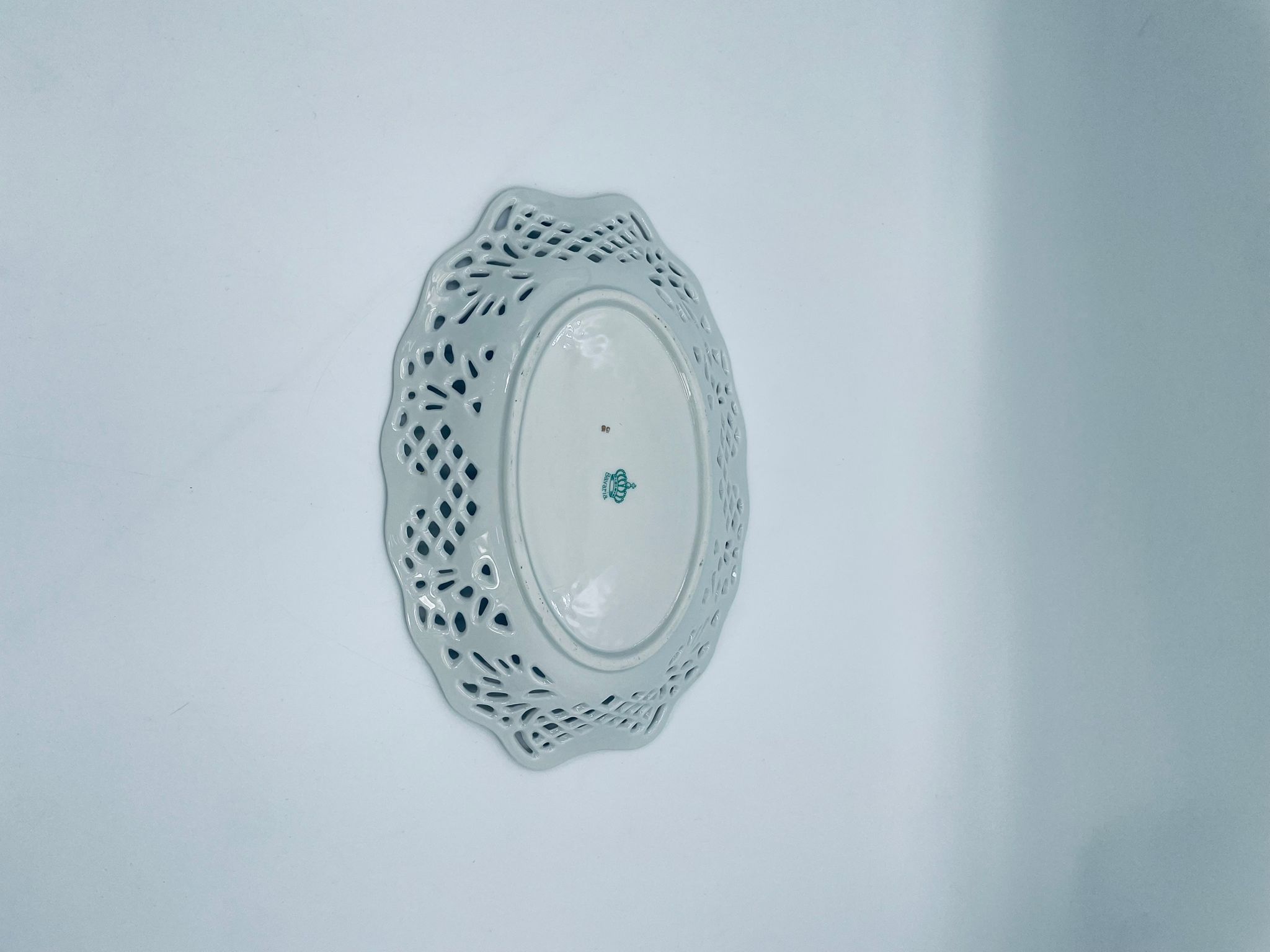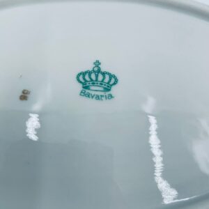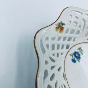 Patera dekoracyjna wytwórni Bavaria Schumann ze sygnaturą stosowana w latach 1918-1929, wykonana z wysokiej jakości białej porcelany. Patera o owalnym kształcie z falistym, brązowym rantem, ozdobiona motywem kwiatowym oraz ażurową ścianka. Posiada przetarcie na kolorze.