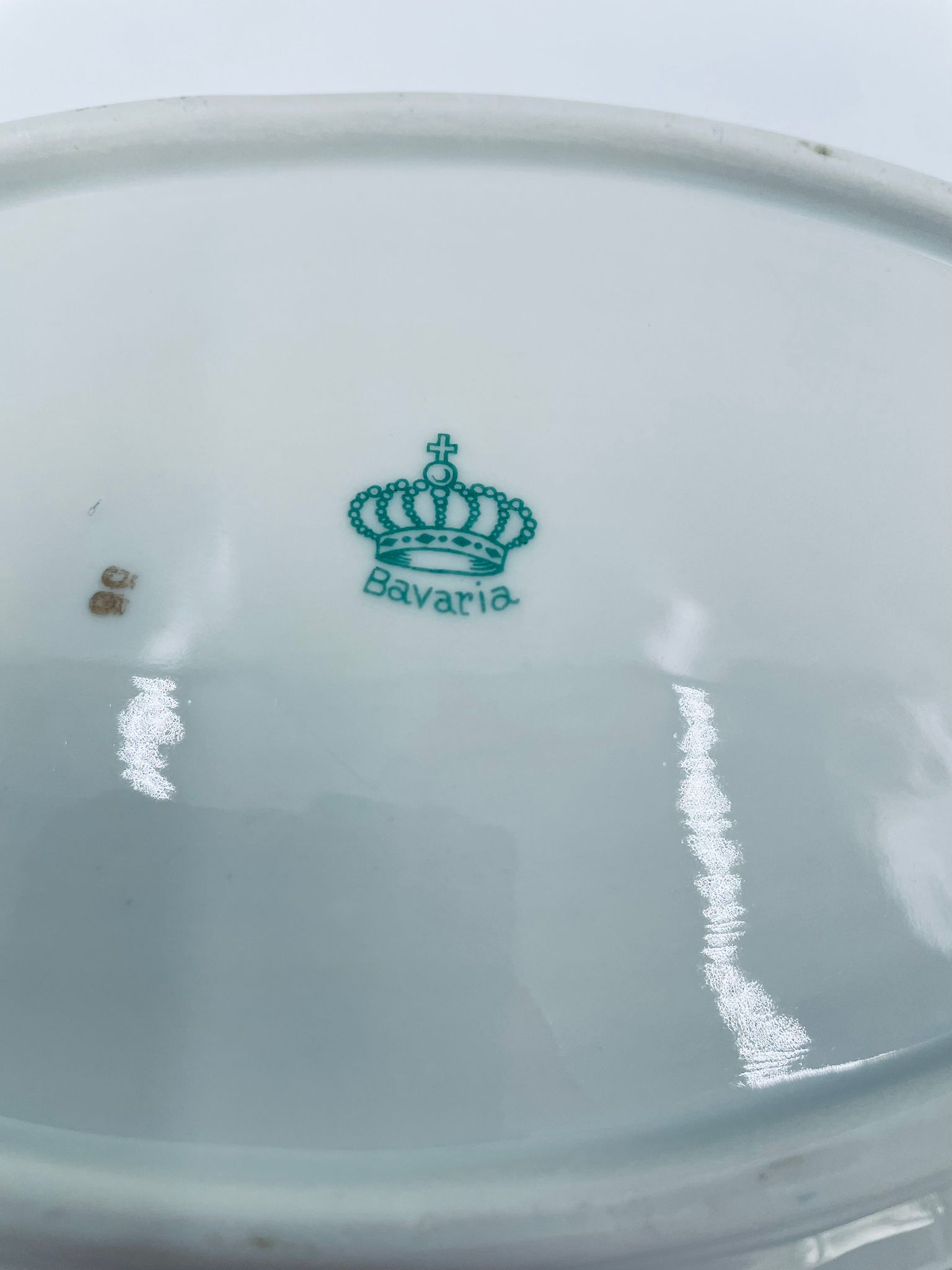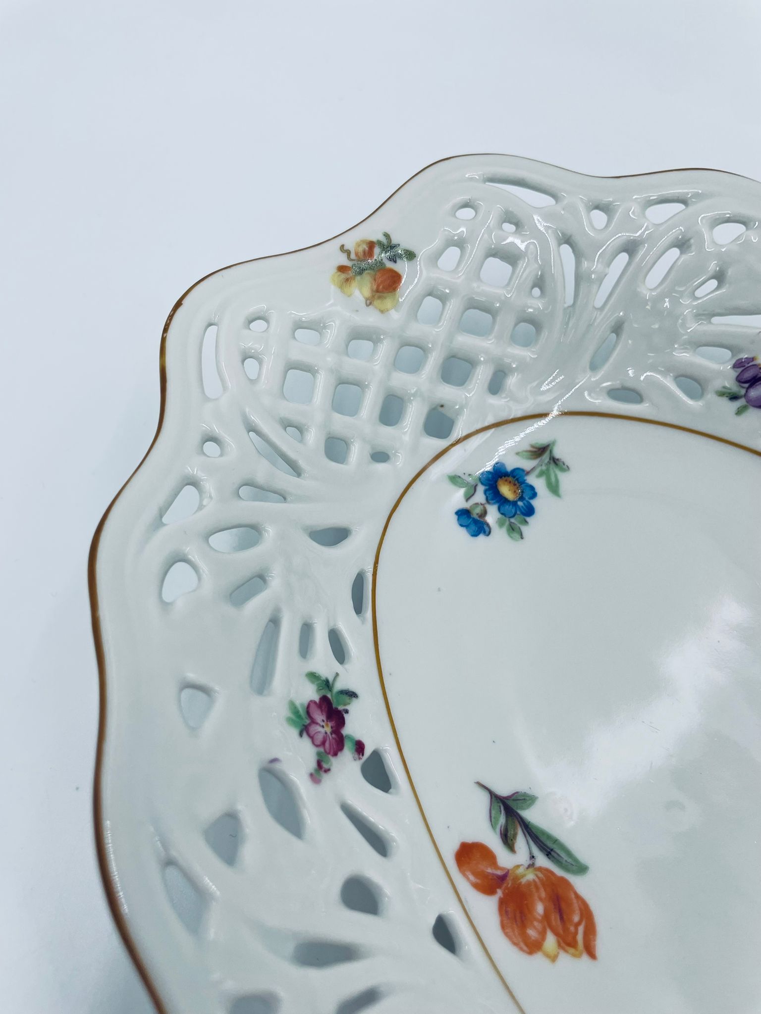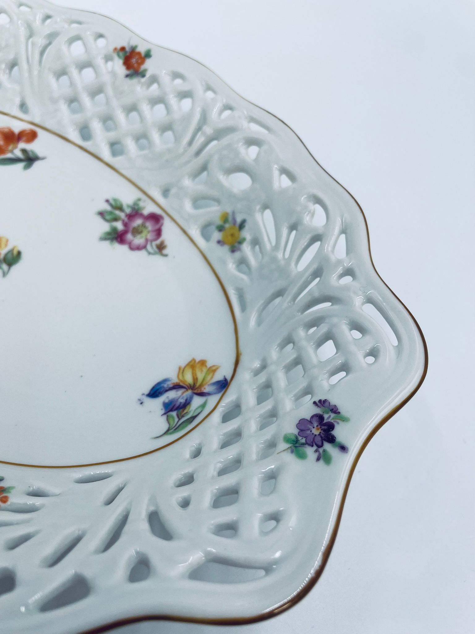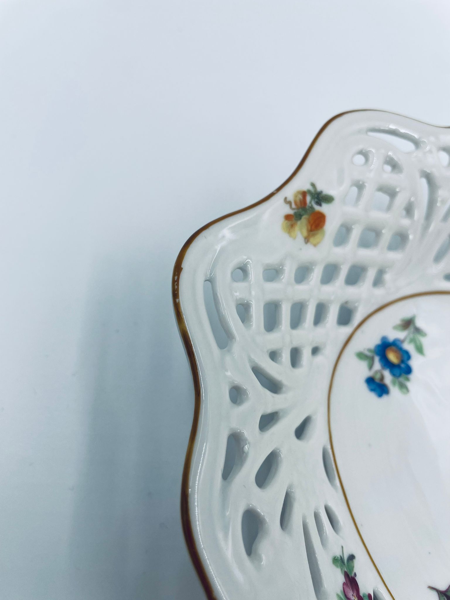 Patera dekoracyjna wytwórni Bavaria Schumann ze sygnaturą stosowana w latach 1918-1929, wykonana z wysokiej jakości białej porcelany. Patera o owalnym kształcie z falistym, brązowym rantem, ozdobiona motywem kwiatowym oraz ażurową ścianka. Posiada przetarcie na kolorze.