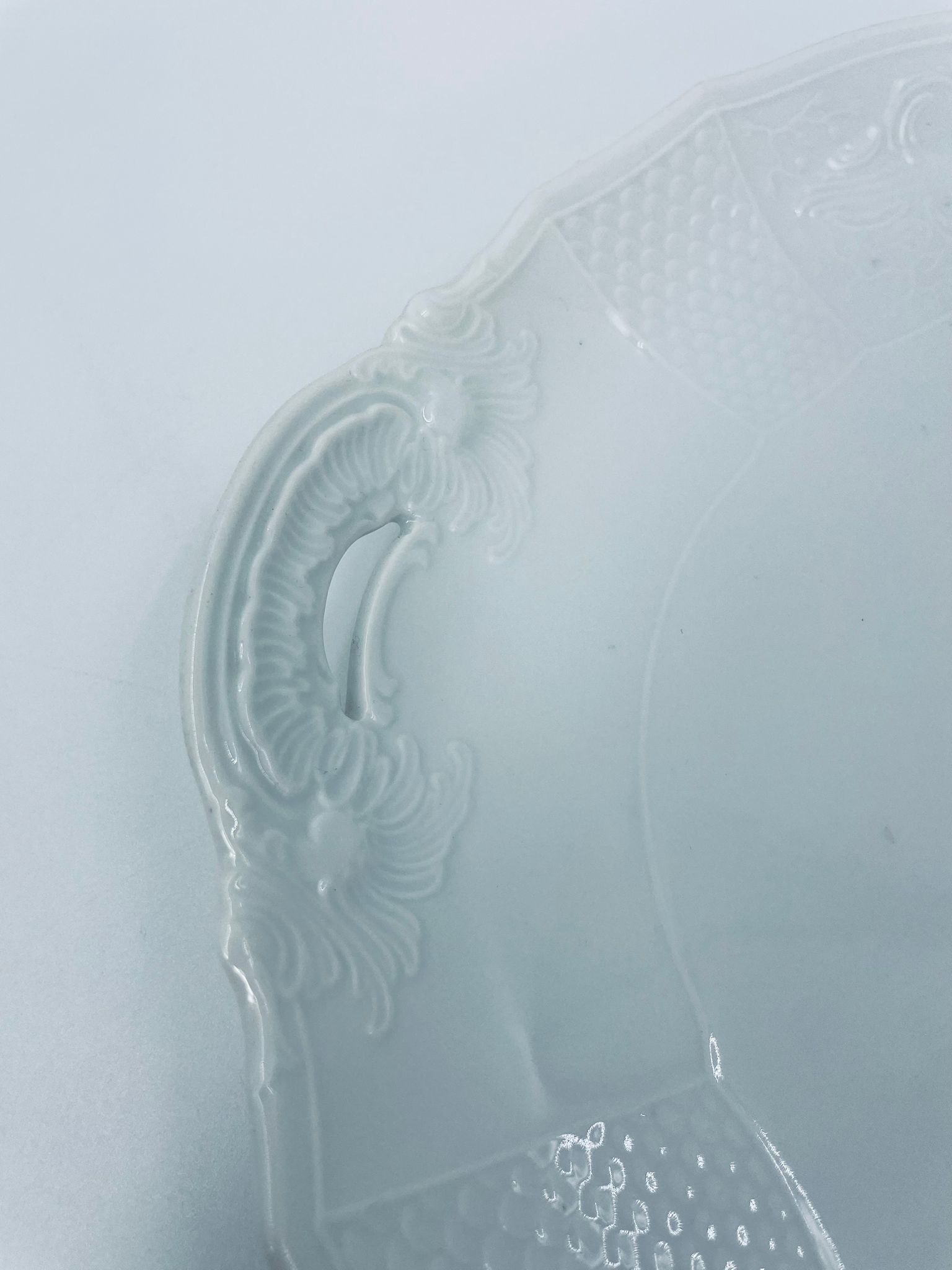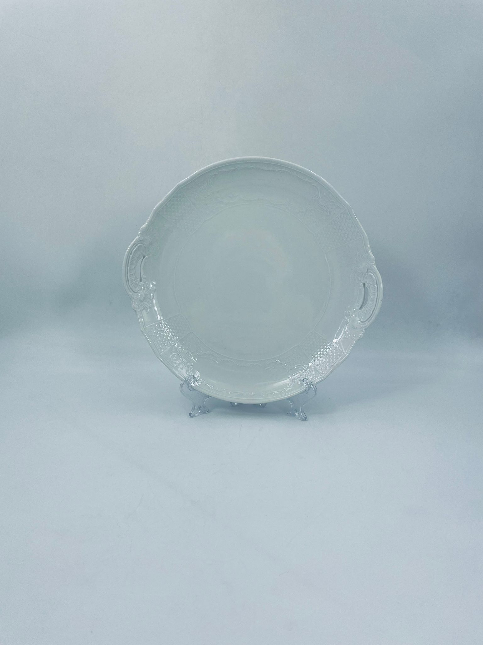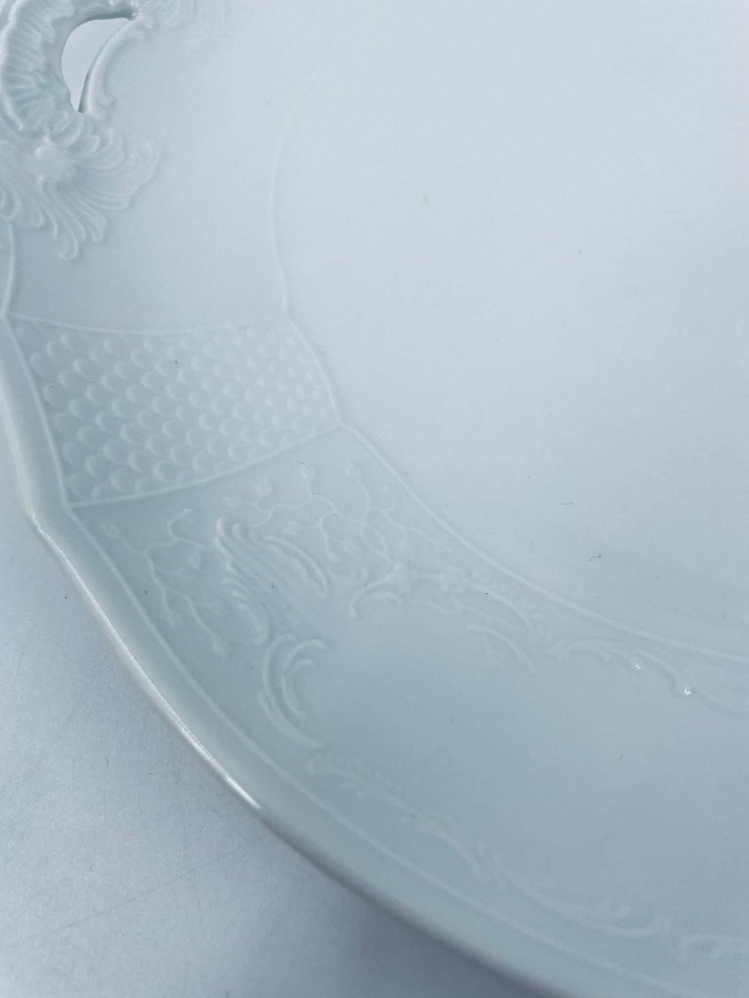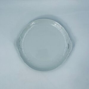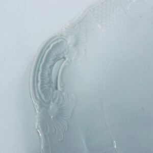 Patera dekoracyjna wytwórni Furstenberg, wykonana z wysokiej jakości białej porcelany. Patera zdobiona reliefowymi motywami oraz z artystycznie zakrzywionymi uchwytami.