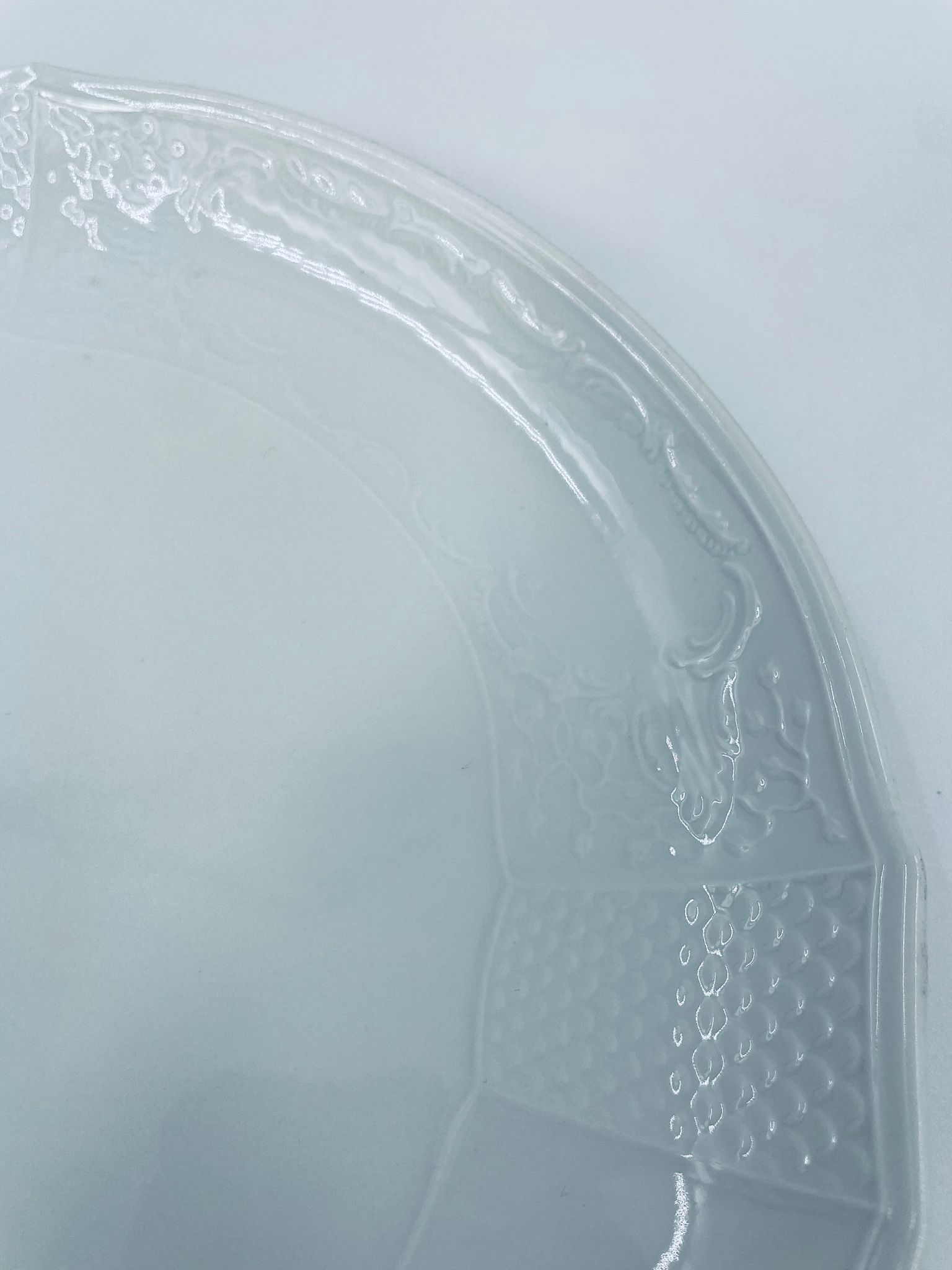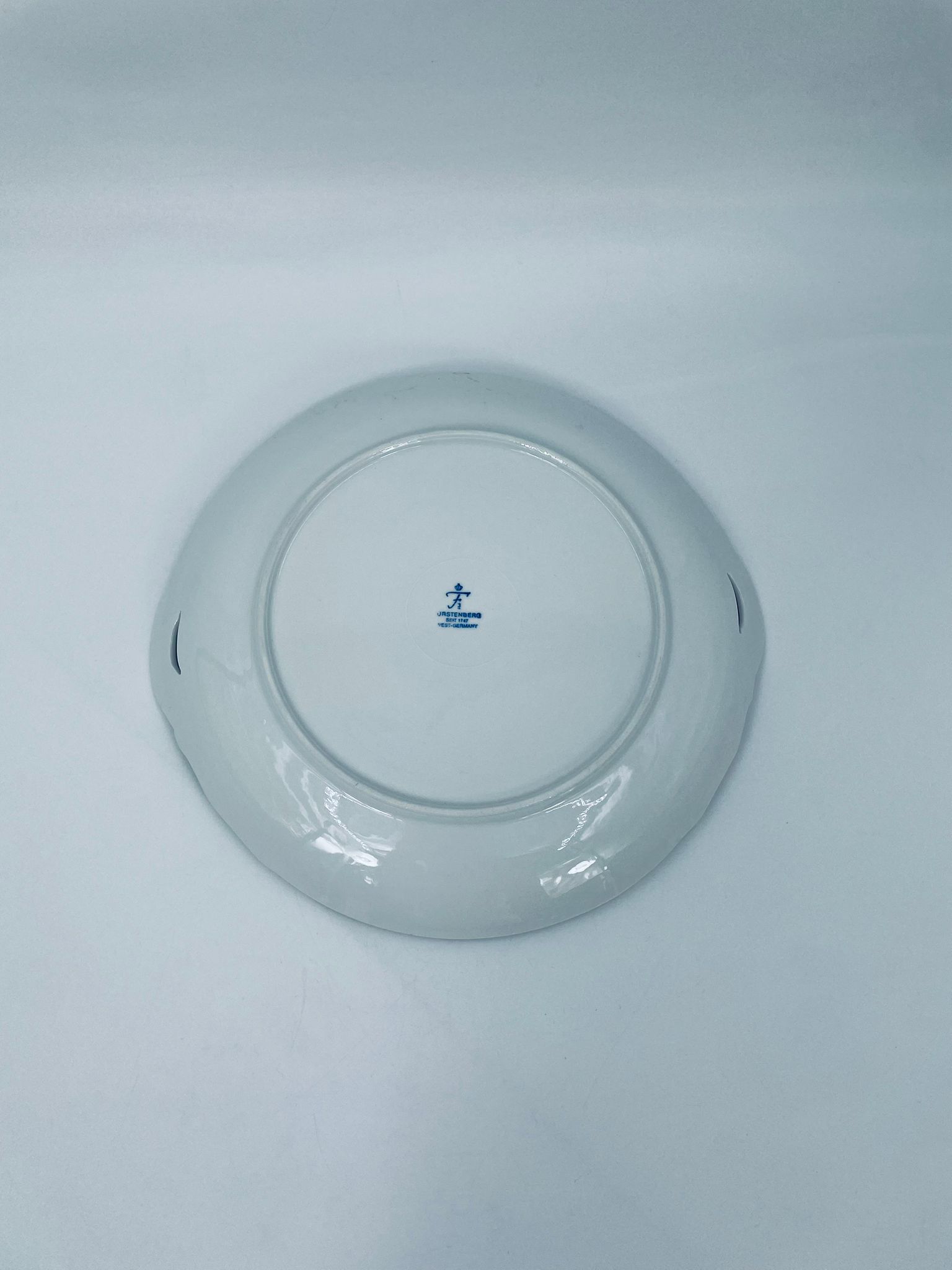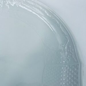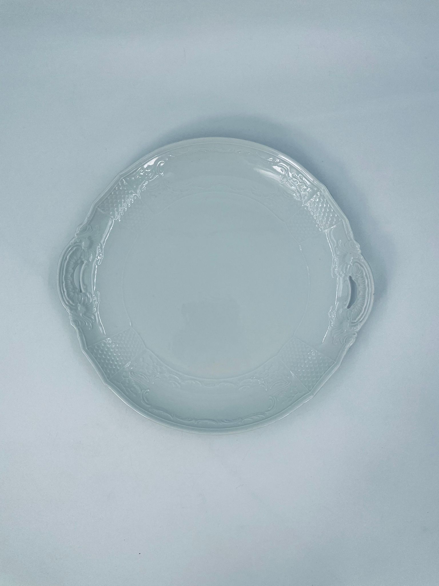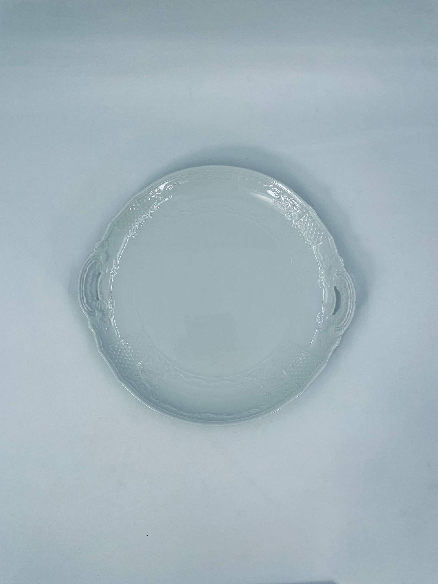 Patera dekoracyjna wytwórni Furstenberg, wykonana z wysokiej jakości białej porcelany. Patera zdobiona reliefowymi motywami oraz z artystycznie zakrzywionymi uchwytami.