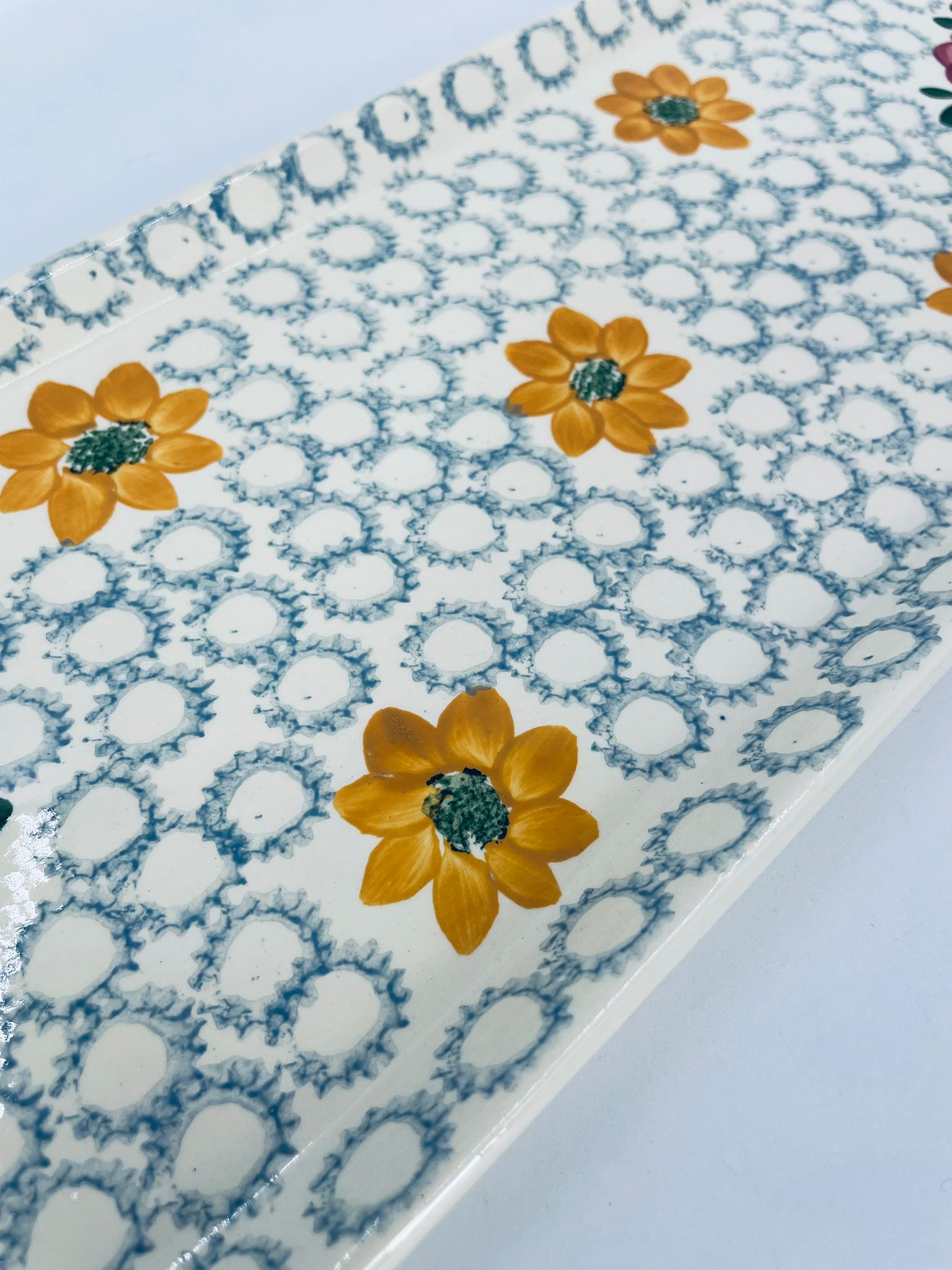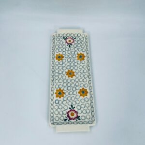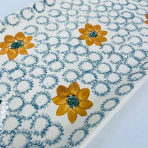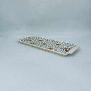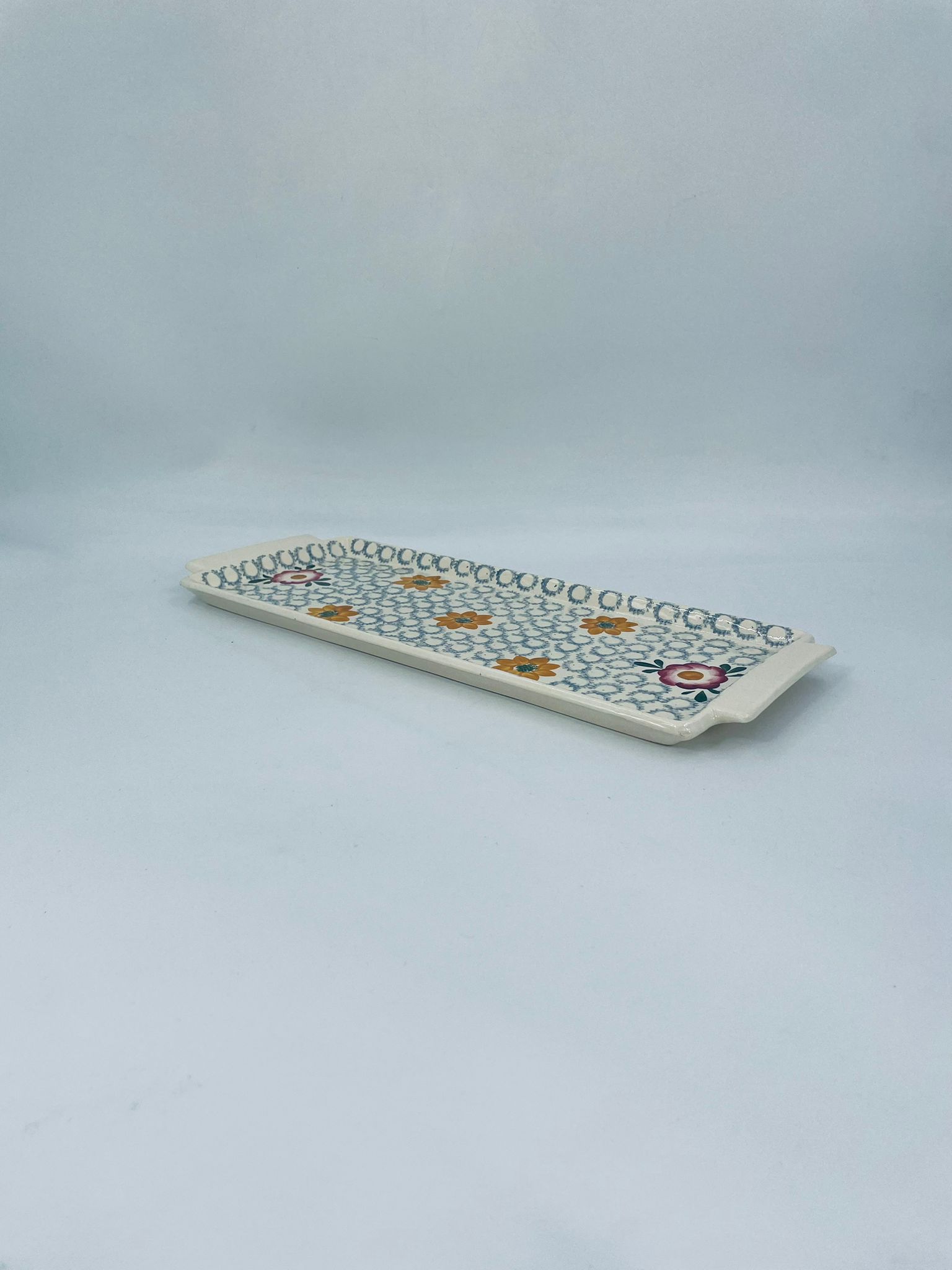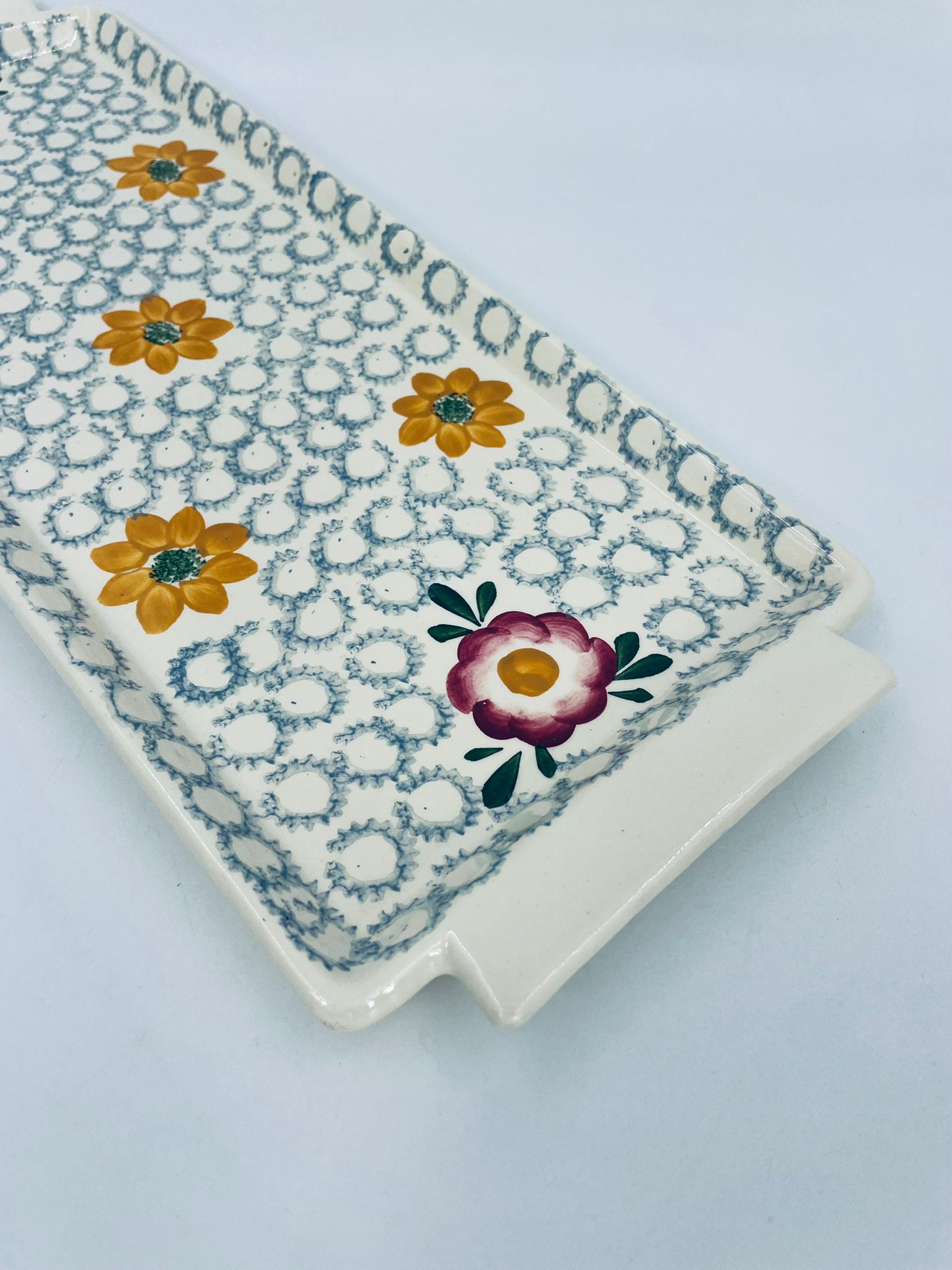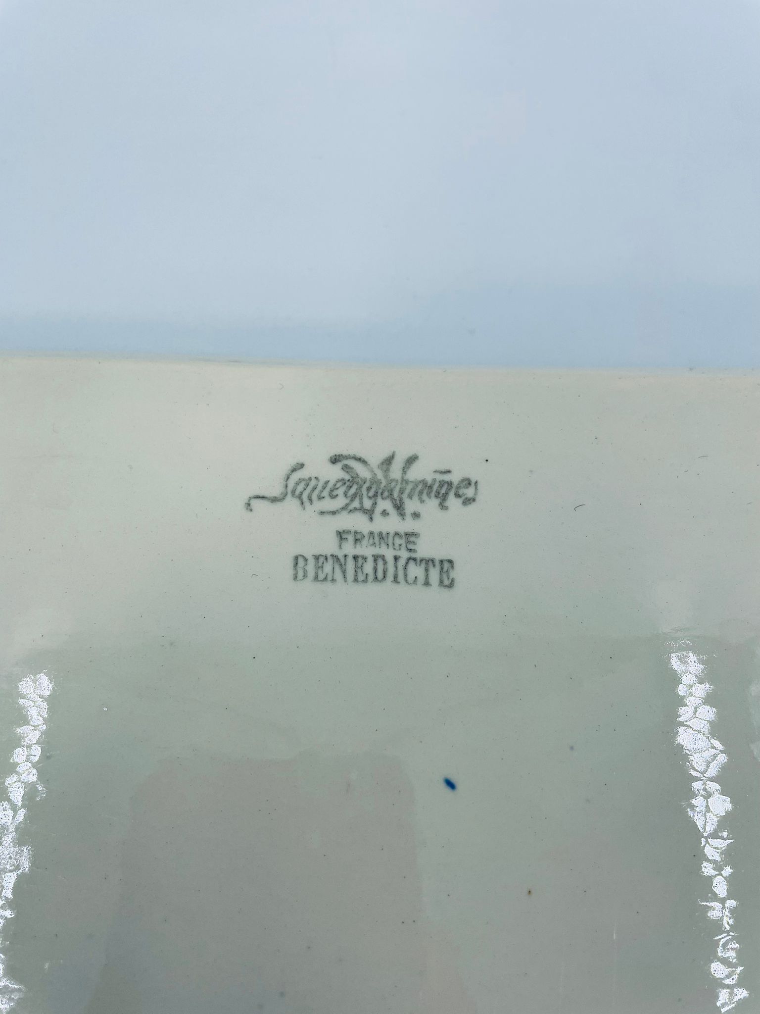 Patera z uchwytami francuskiej wytwórni Sarreguemines, wykonana z Majoliki w kolorze ecru. Patera o podłużnym kształcie, charakteryzuje się ręcznie malowanym wzorem kwiatów i niebieskich kółek.