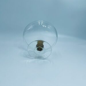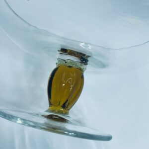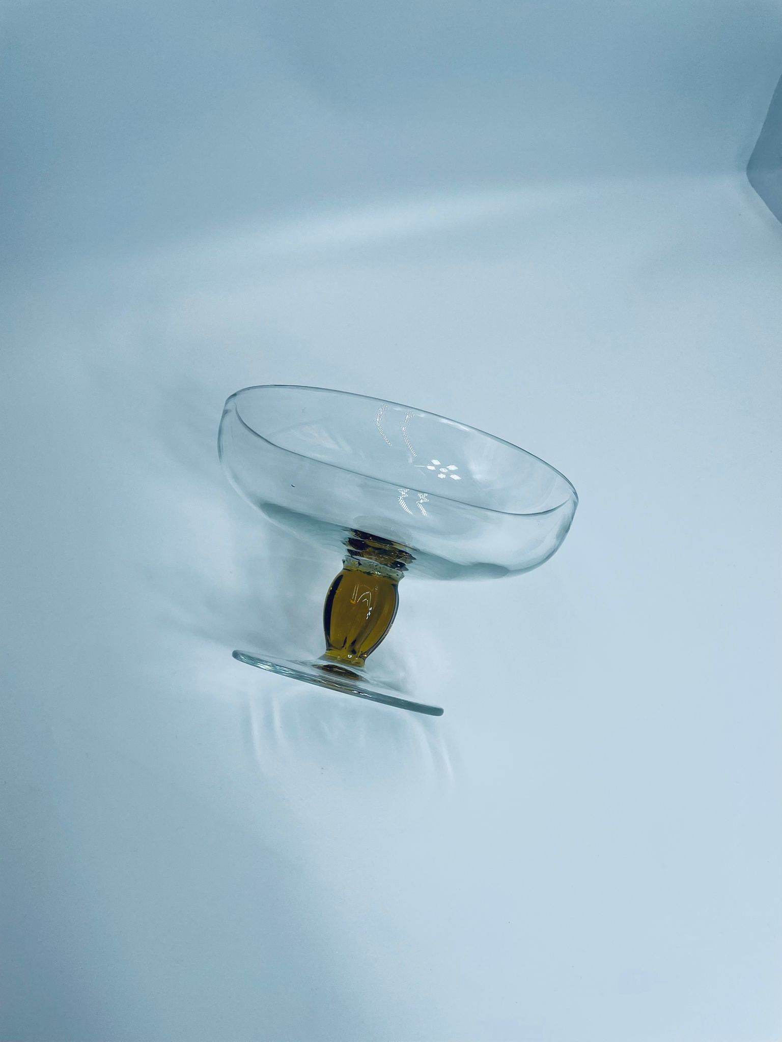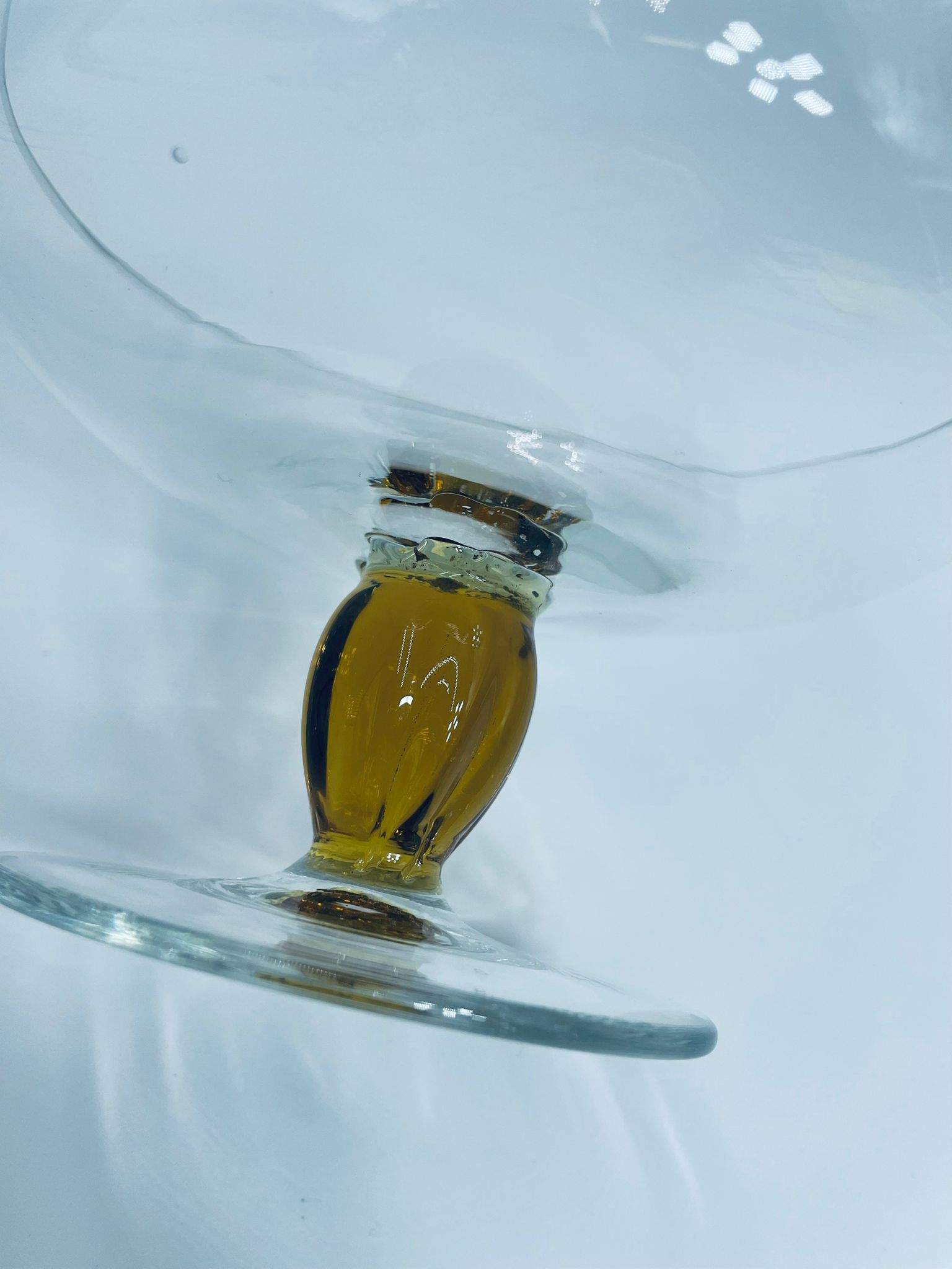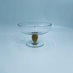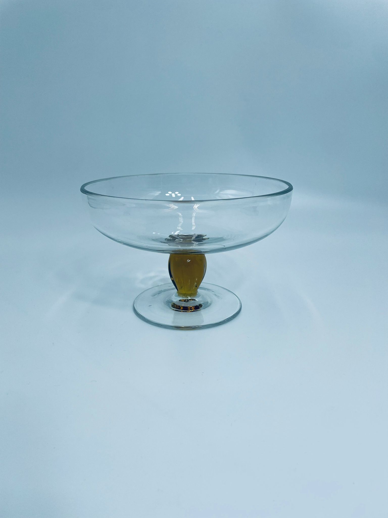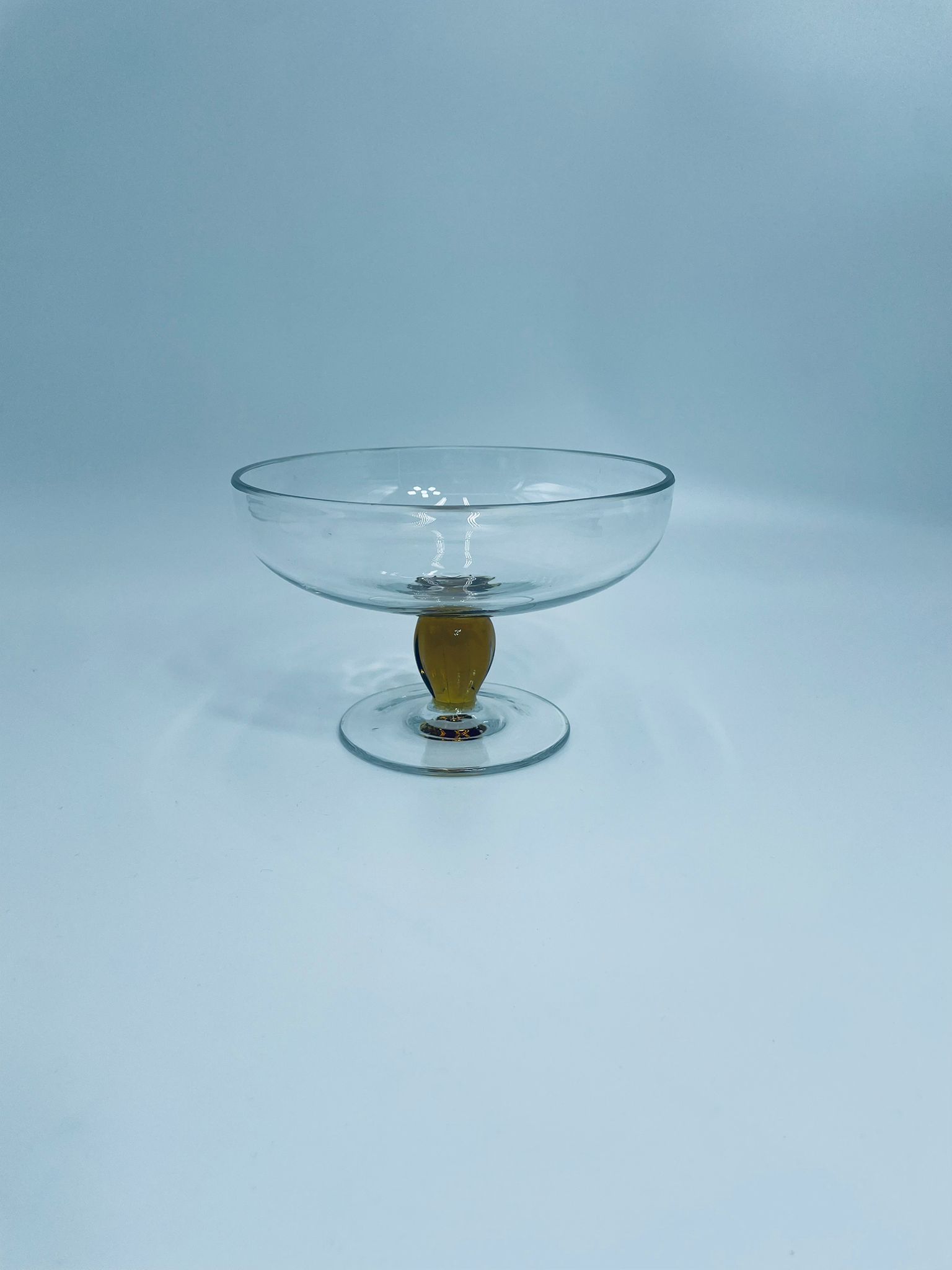 Patera na nóżce w stylu Vintage, wykonana z wysokiej jakości szkła kryształowego. Patera charakteryzuje się przezroczystą, szeroką czaszą i bursztynową nóżką na stabilnej podstawie.