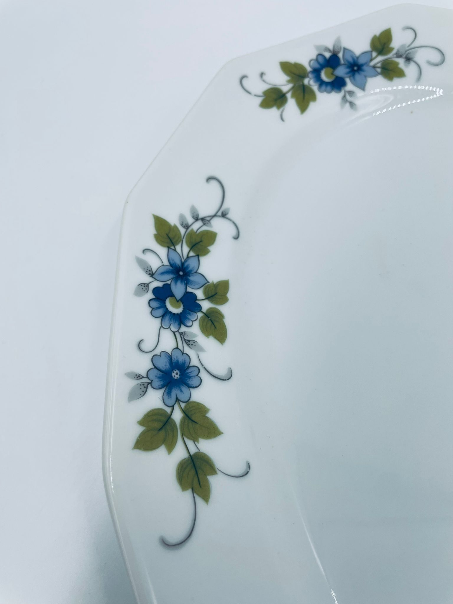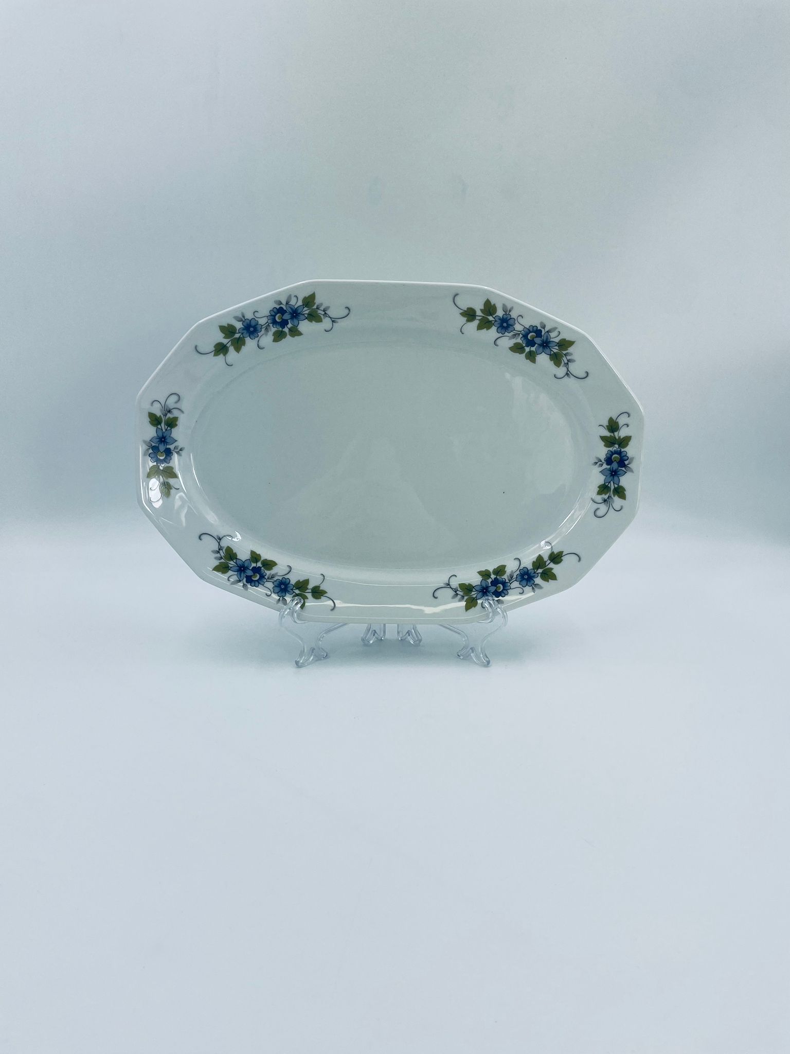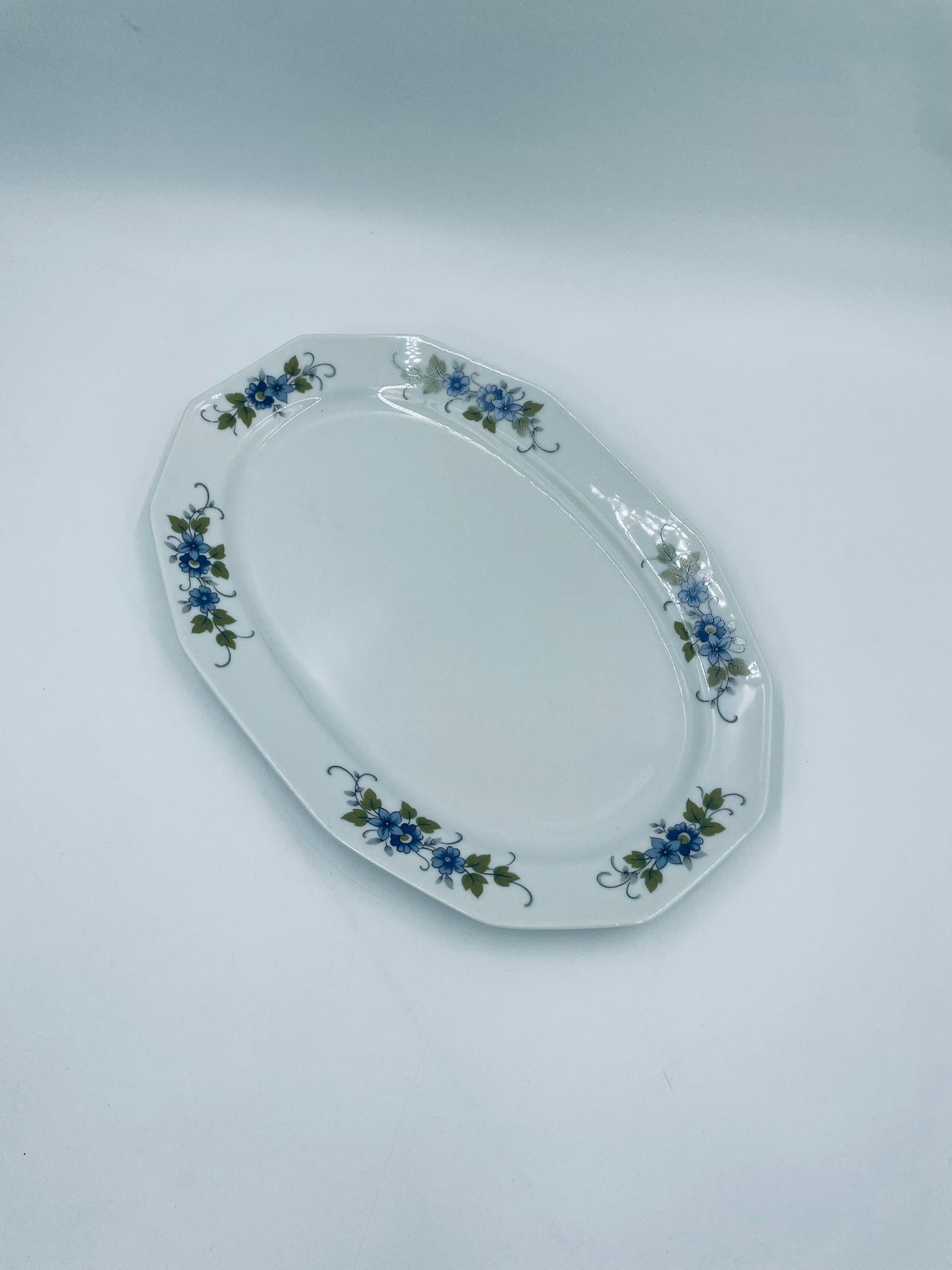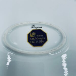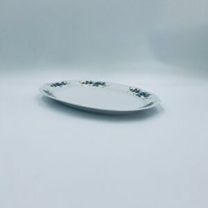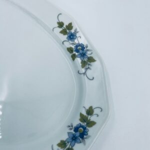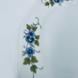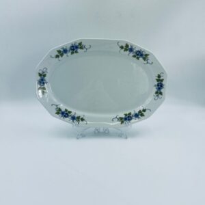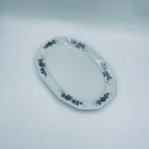 Patera, półmisek wytwórni Regina NB z lini „Form und design exclusiv”, wykonana z najwyższej jakości białej porcelany. Patera z wielokątną formą, charakteryzuje się pięknym, delikatnym wzorem niebieskich kwiatuszków z zielono-szarymi listkami.