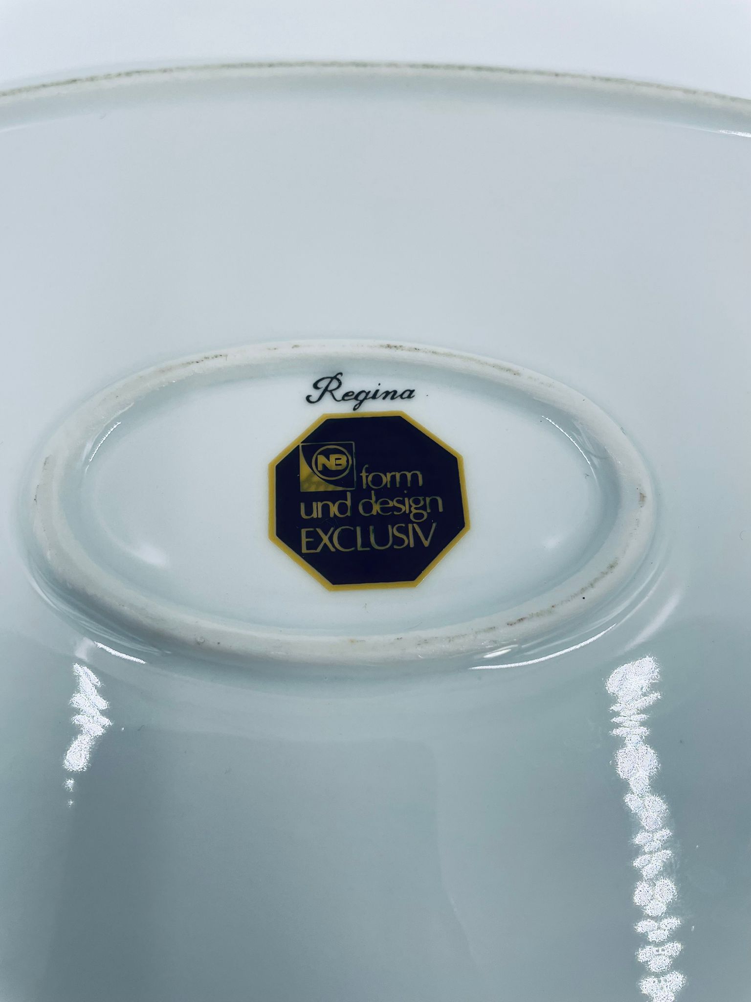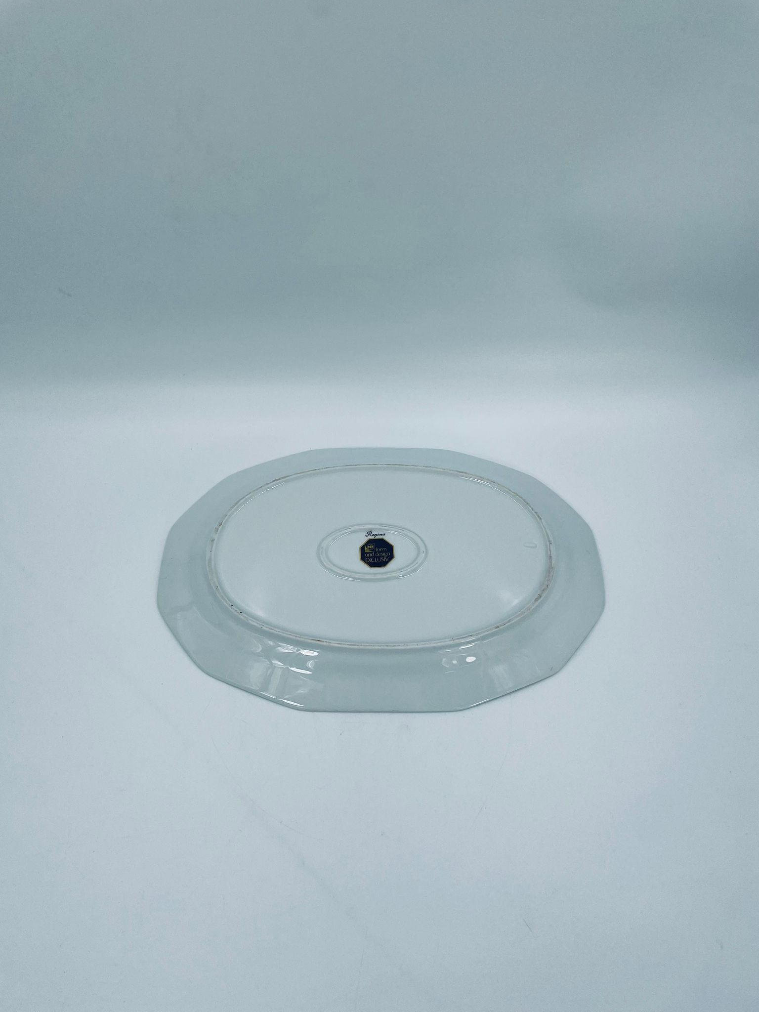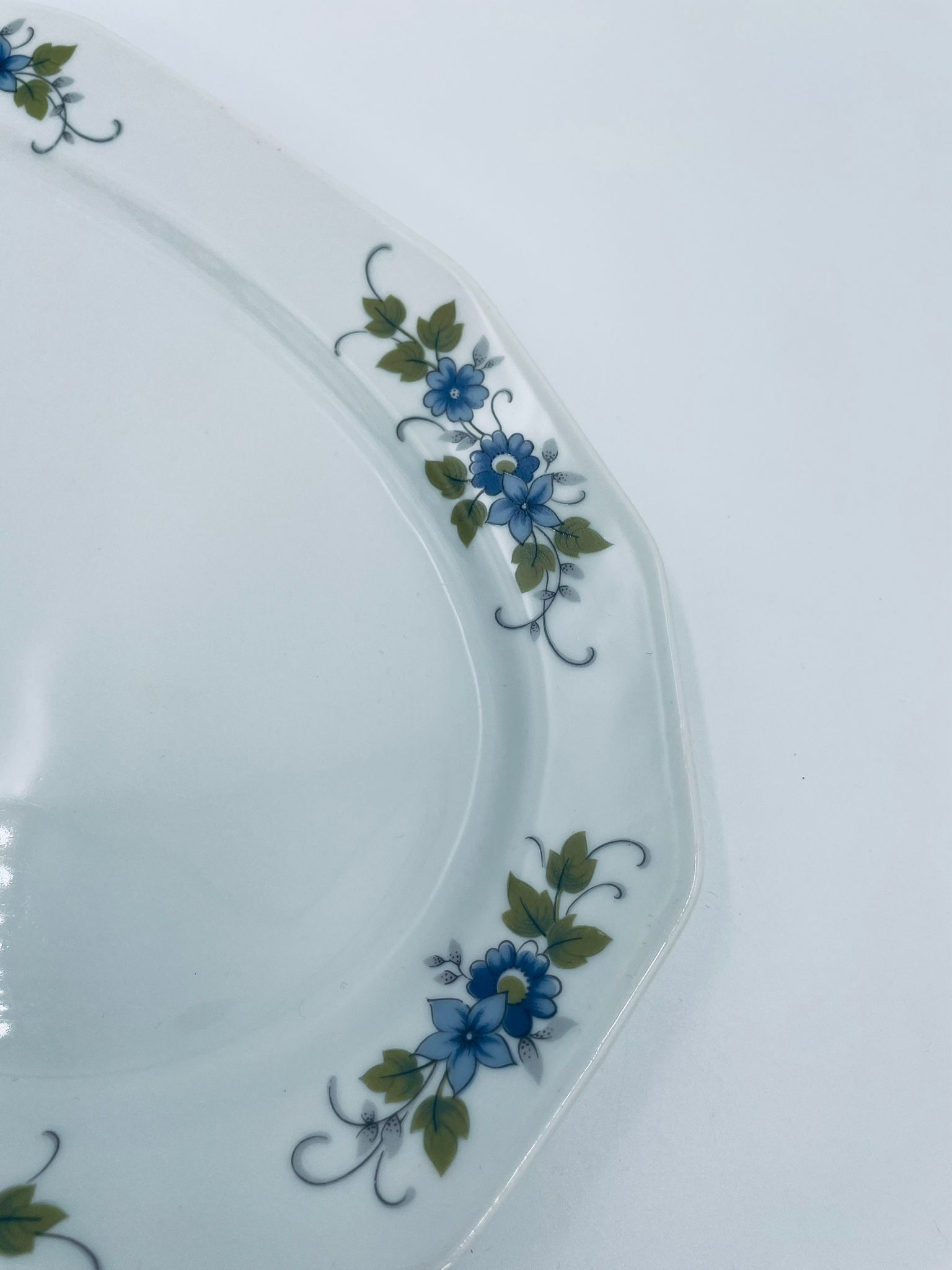 Patera, półmisek wytwórni Regina NB z lini „Form und design exclusiv”, wykonana z najwyższej jakości białej porcelany. Patera z wielokątną formą, charakteryzuje się pięknym, delikatnym wzorem niebieskich kwiatuszków z zielono-szarymi listkami.