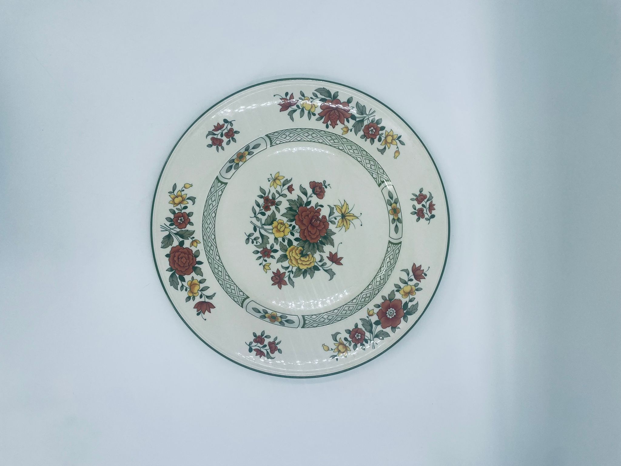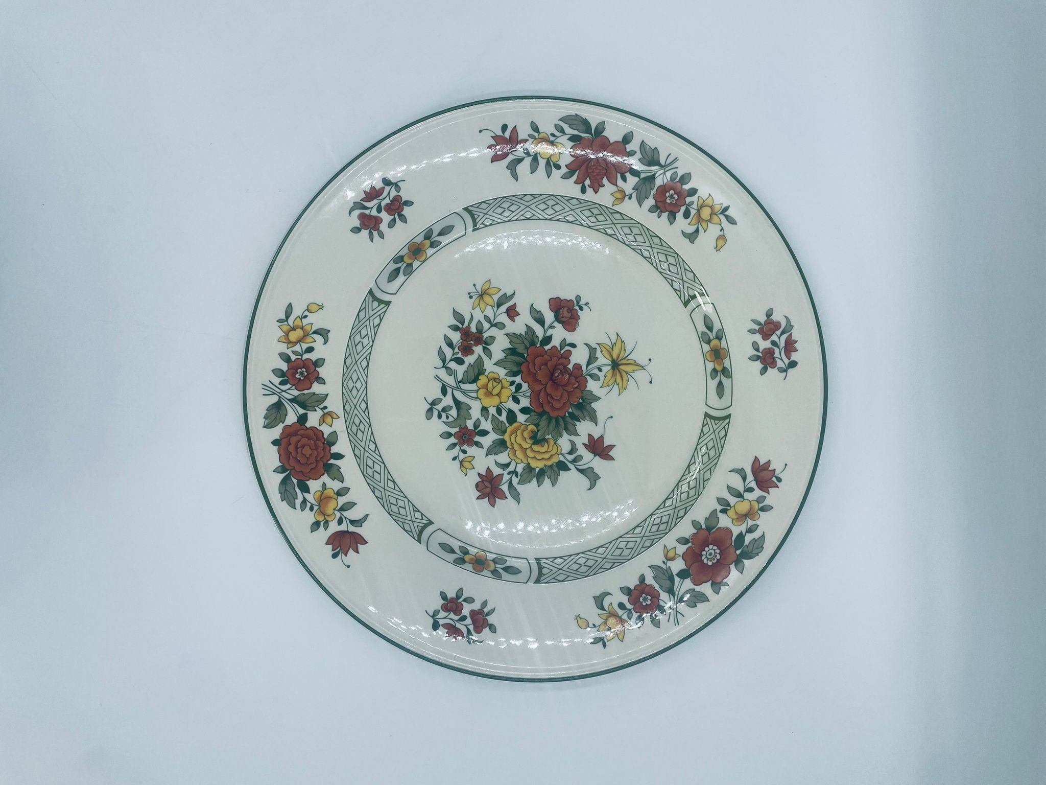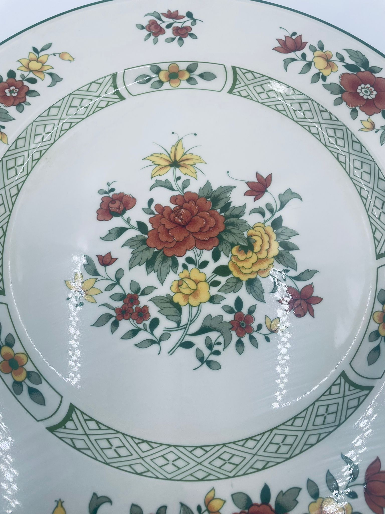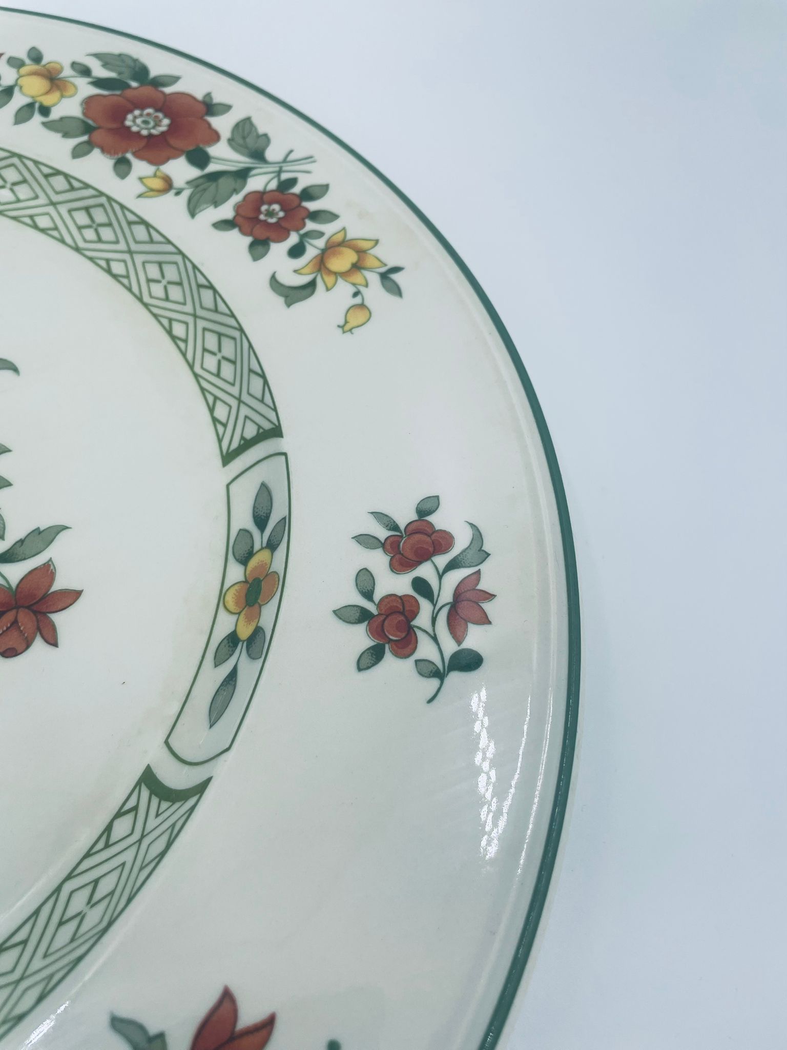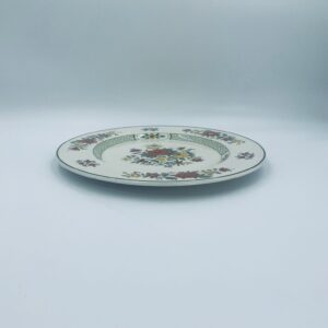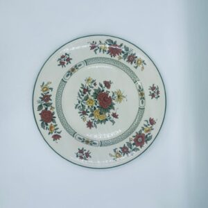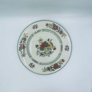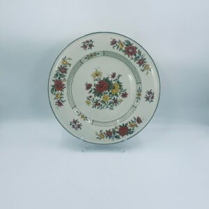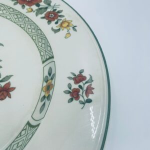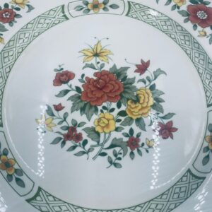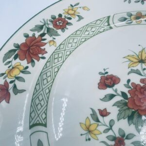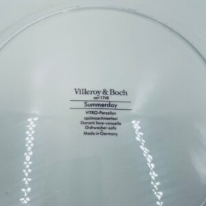 Duży talerz, patera renomowanej wytwórni Villeroy&Boch z kolekcji Summerday produkowanej od 1748r, wykonana z wysokiej jakości porcelany. Talerz charakteryzuje się kwiatowym motywem w odcieniach czerwieni i żółci oraz zielonym wzorem geometrycznym, wykończony zieloną obwódką dookoła rantu.