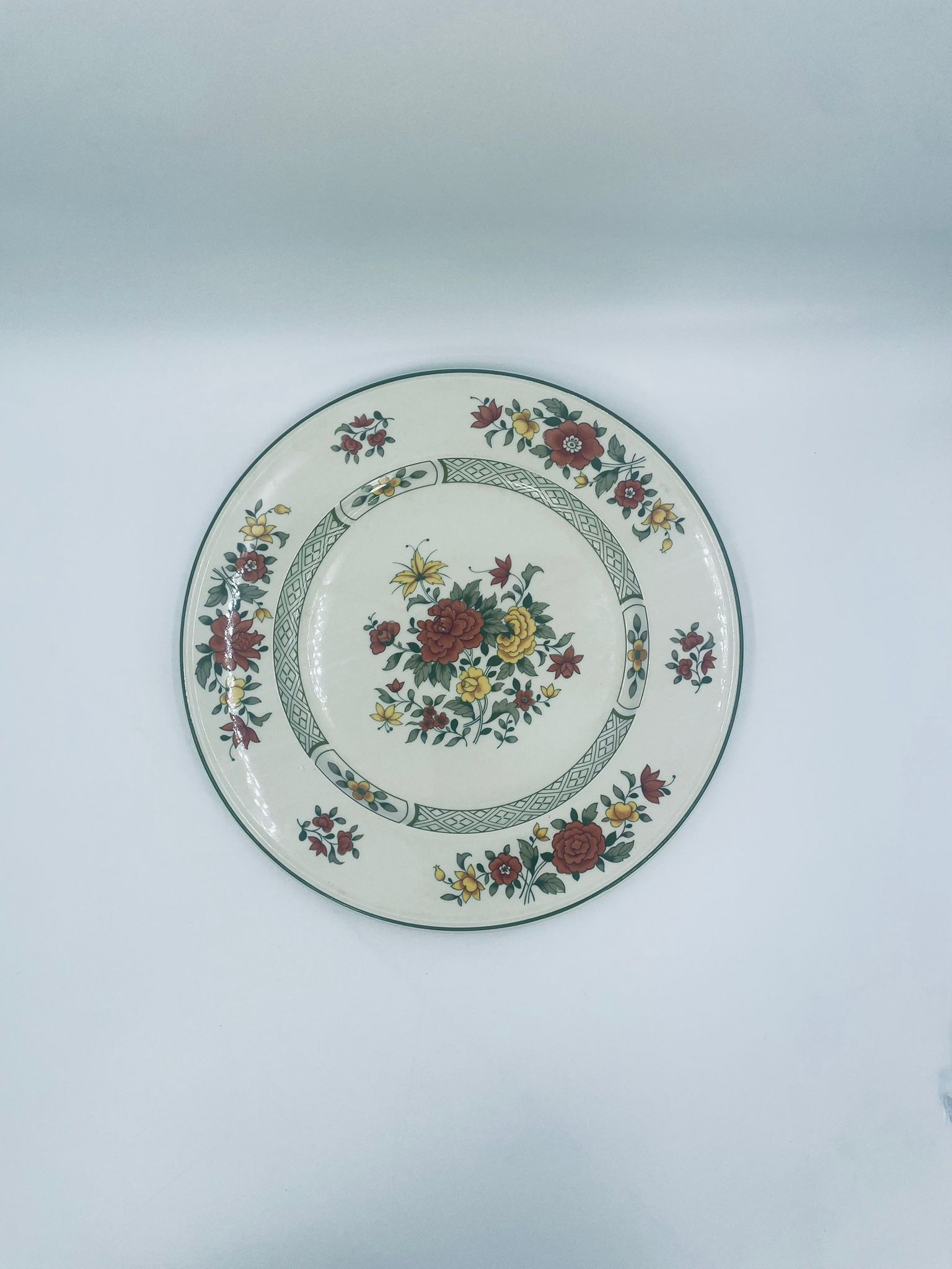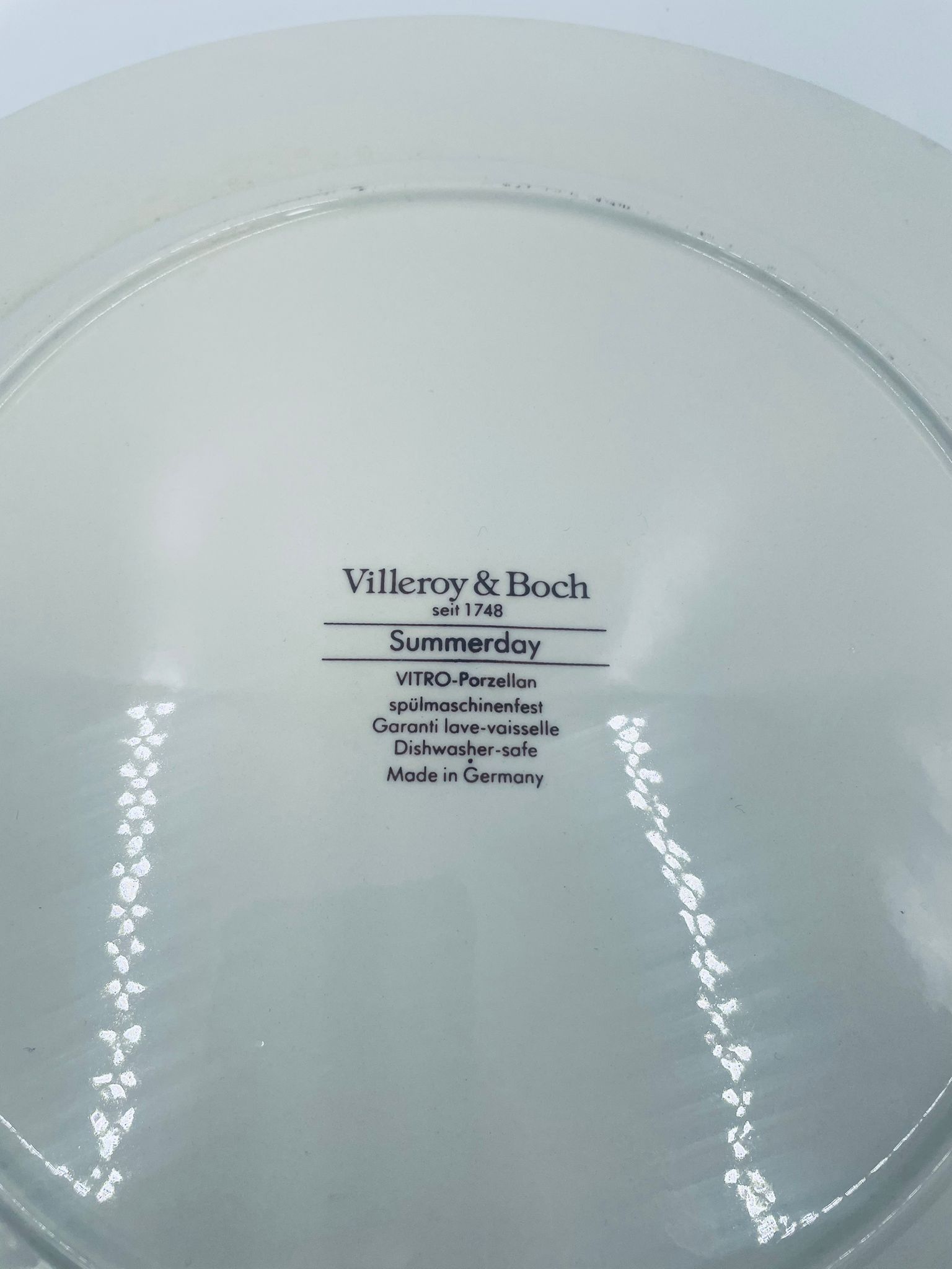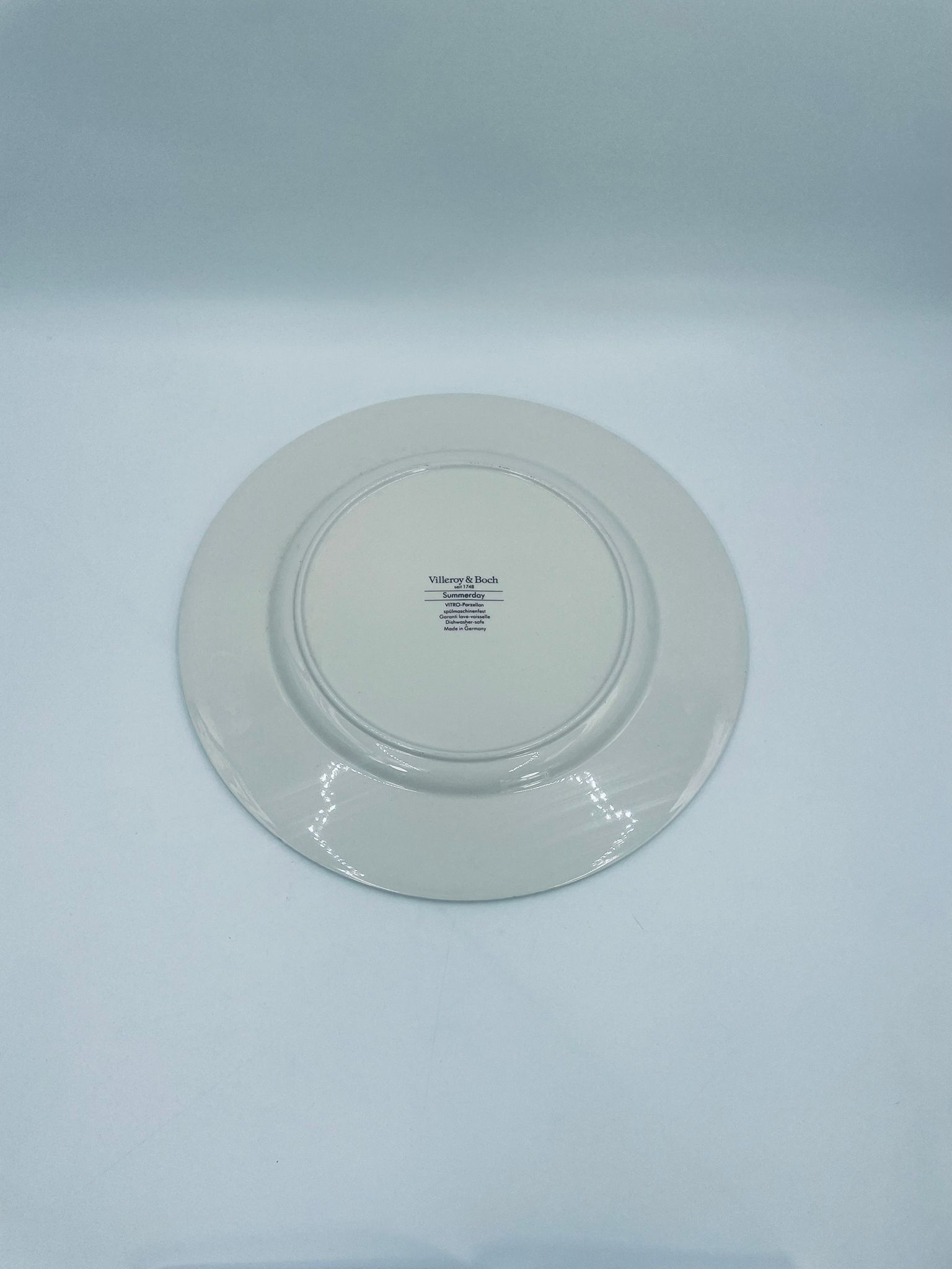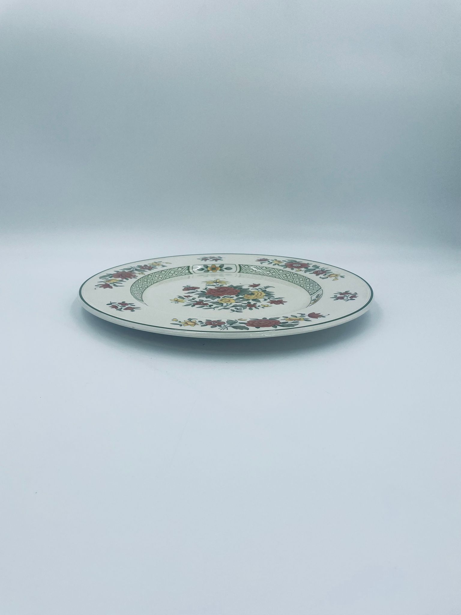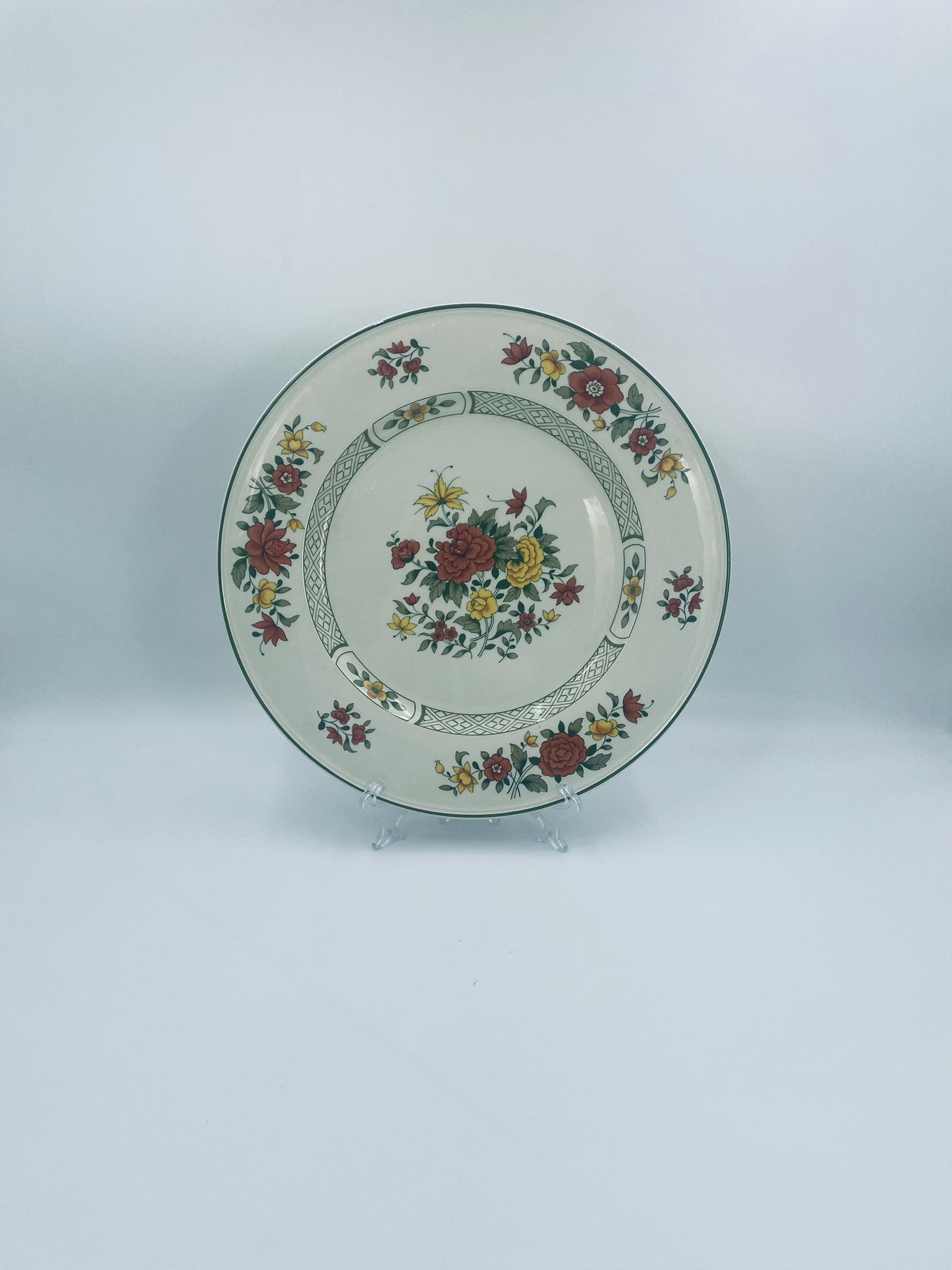 Duży talerz, patera renomowanej wytwórni Villeroy&Boch z kolekcji Summerday produkowanej od 1748r, wykonana z wysokiej jakości porcelany. Talerz charakteryzuje się kwiatowym motywem w odcieniach czerwieni i żółci oraz zielonym wzorem geometrycznym, wykończony zieloną obwódką dookoła rantu.