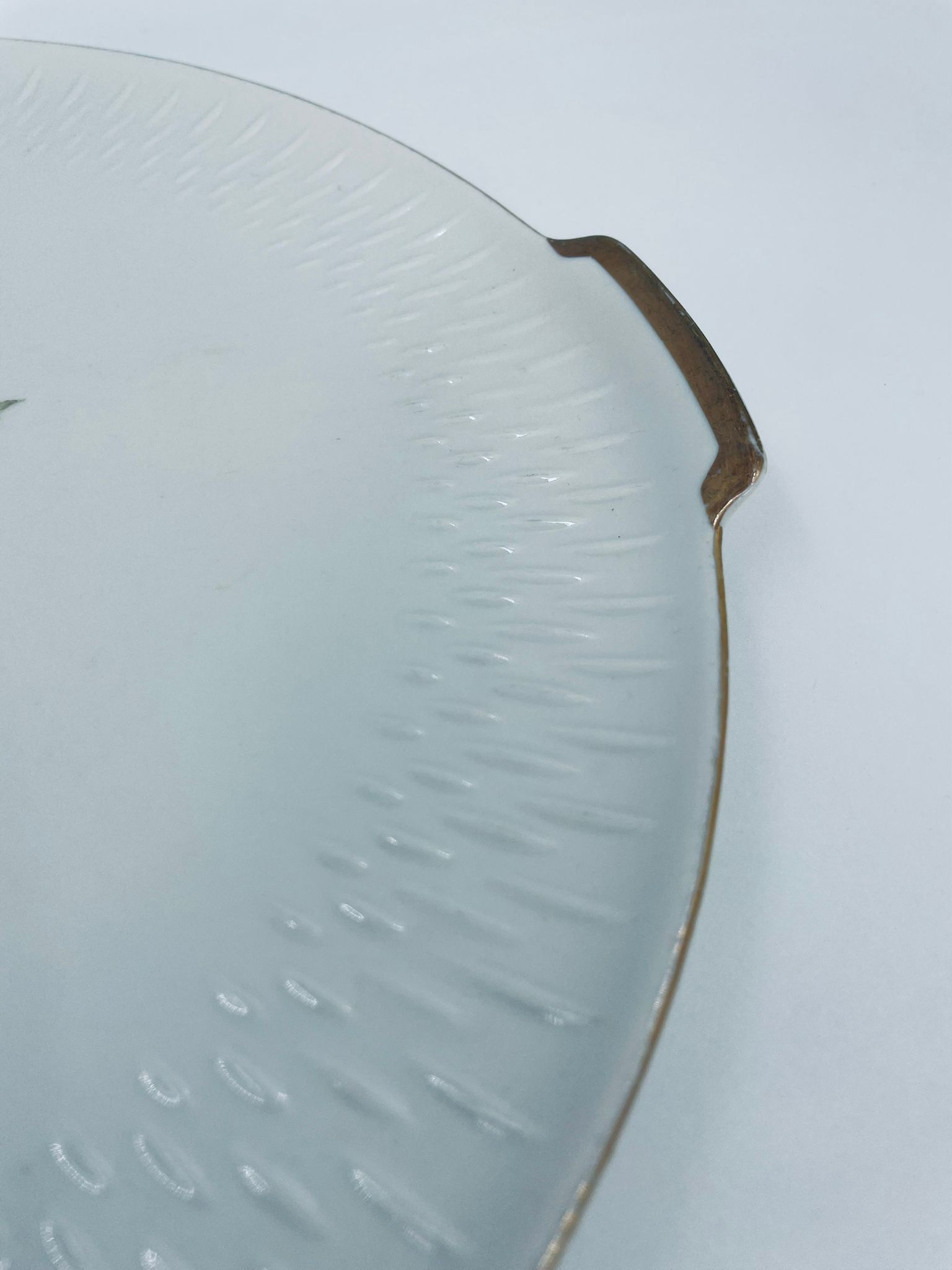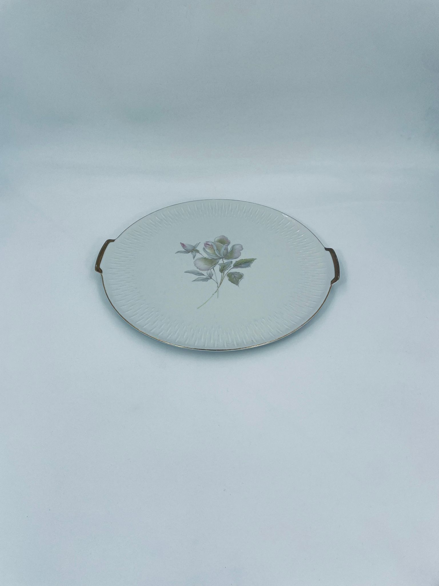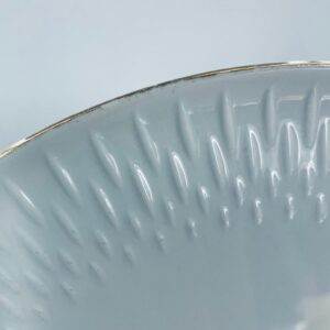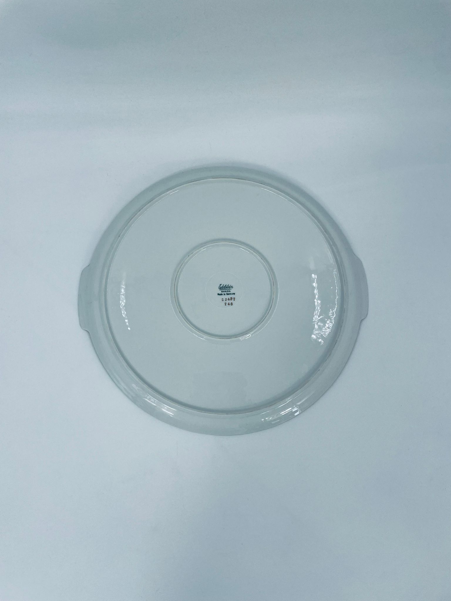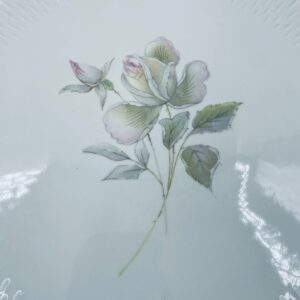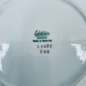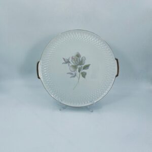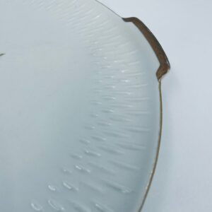 Patera wytwórni Edelstein Bavaria wykonana z wysokiej jakości białej porcelany. Patera ozdobiona jest motywem kwiatowym, posiada fakturowany wzór wokół talerza przy krawędzi, wykończona jest złoceniem na rancie oraz na uchwytach. Posiada przetarcia na złoceniu.