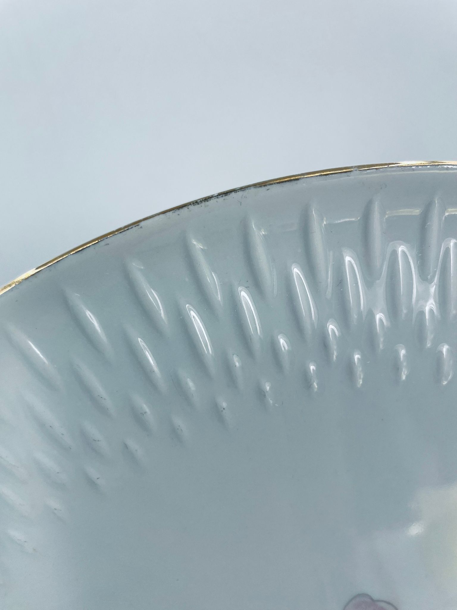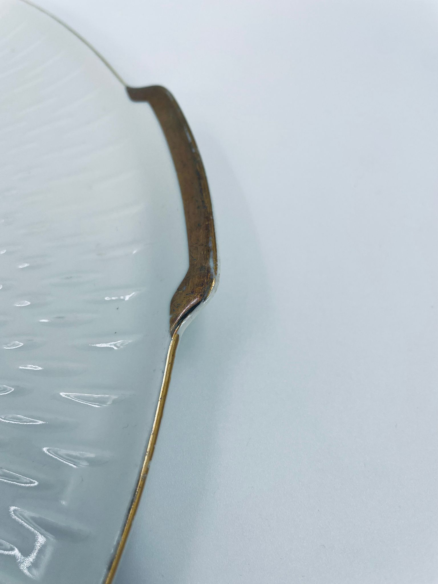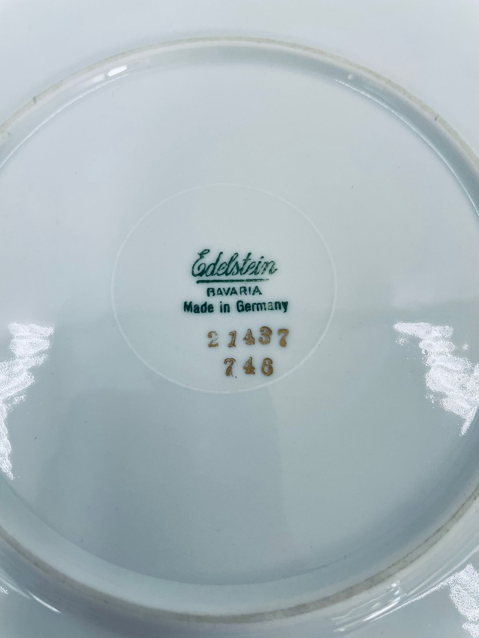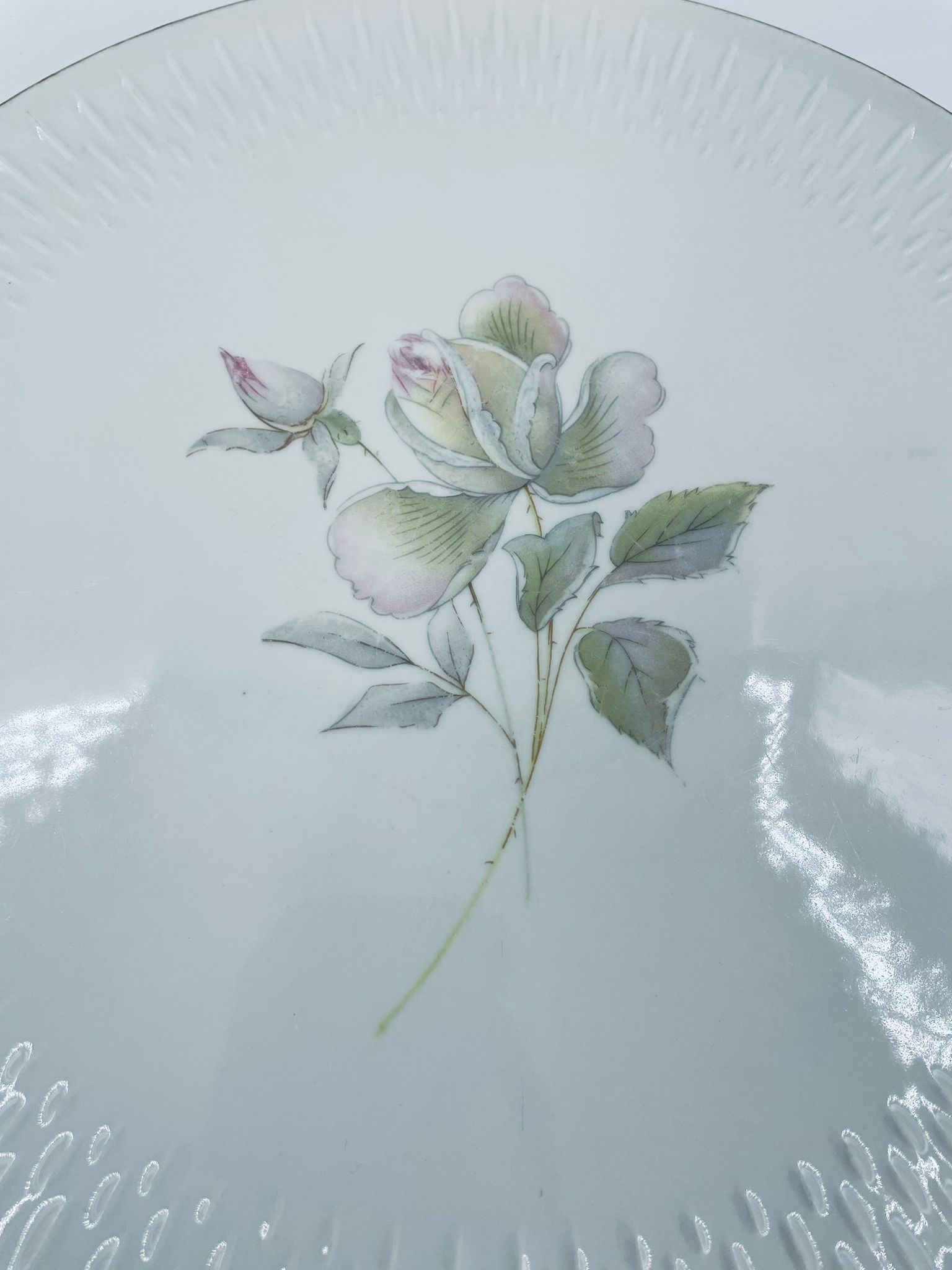 Patera wytwórni Edelstein Bavaria wykonana z wysokiej jakości białej porcelany. Patera ozdobiona jest motywem kwiatowym, posiada fakturowany wzór wokół talerza przy krawędzi, wykończona jest złoceniem na rancie oraz na uchwytach. Posiada przetarcia na złoceniu.