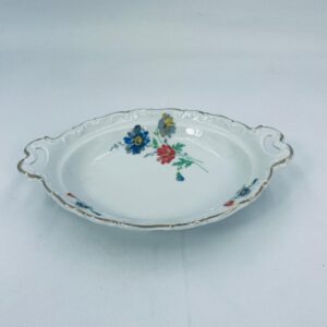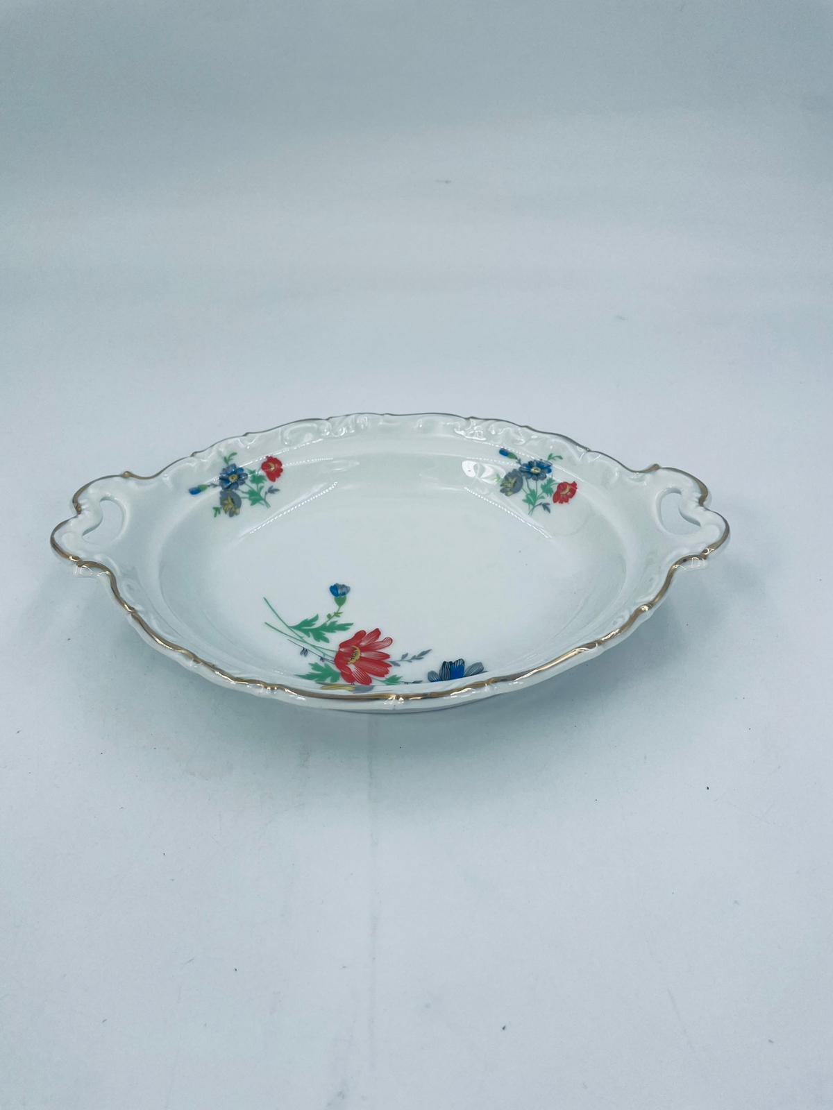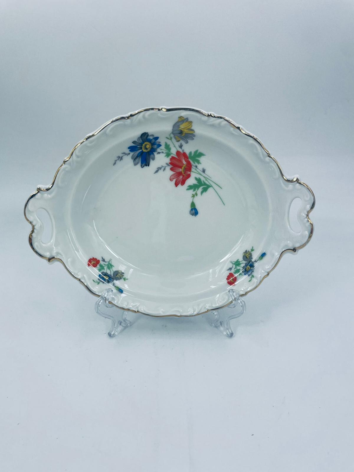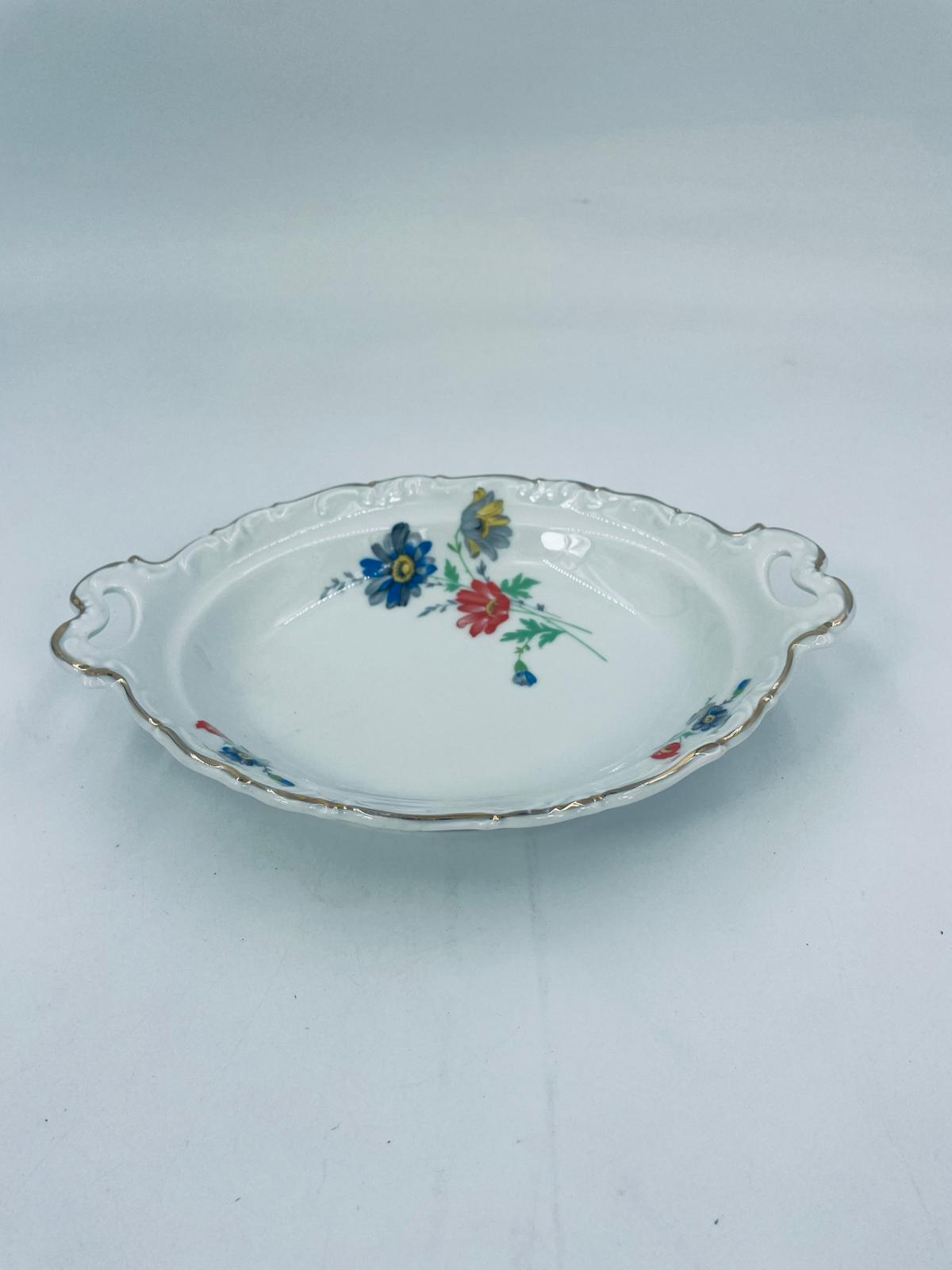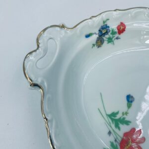 Patera Hertel Jacob Rehau Bavaria wykonana z białej porcelany z motywem pięknych kolorowych kwiatów, wykończona złoceniami na rantach. Przedmiot kolekcjonerski z lat 30tych.