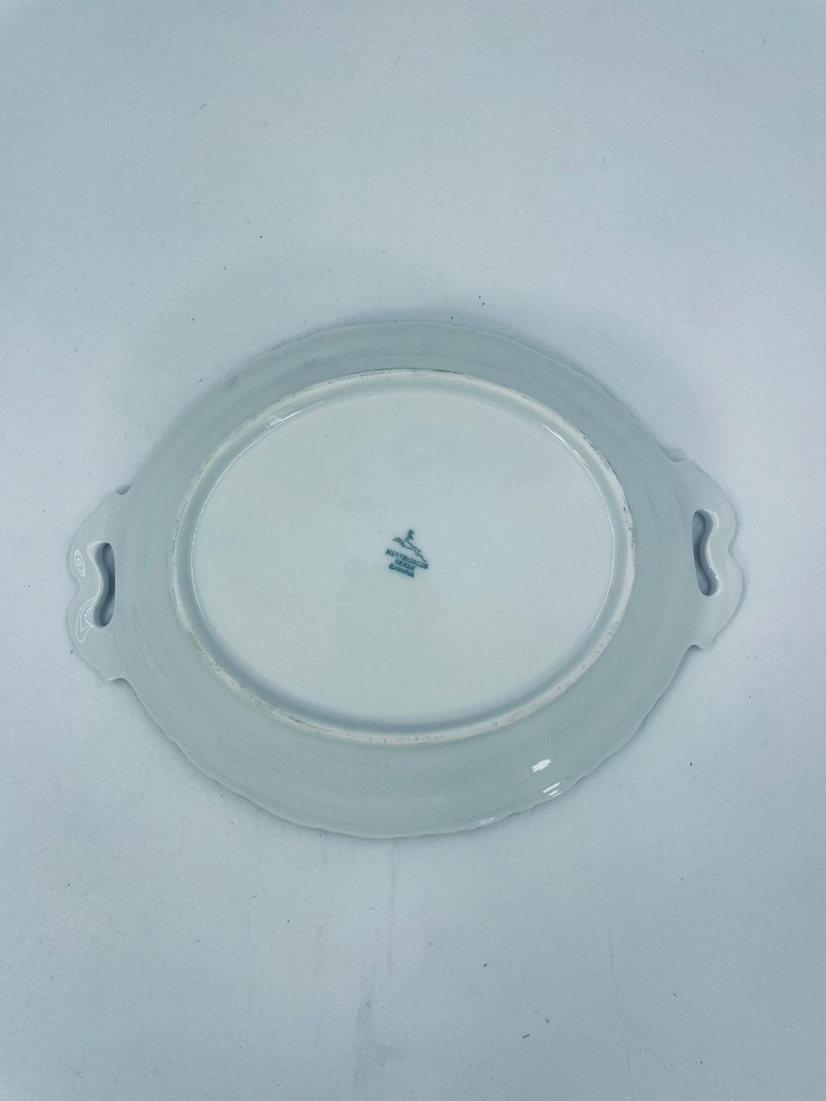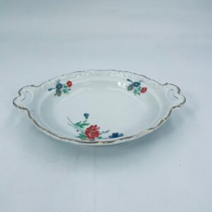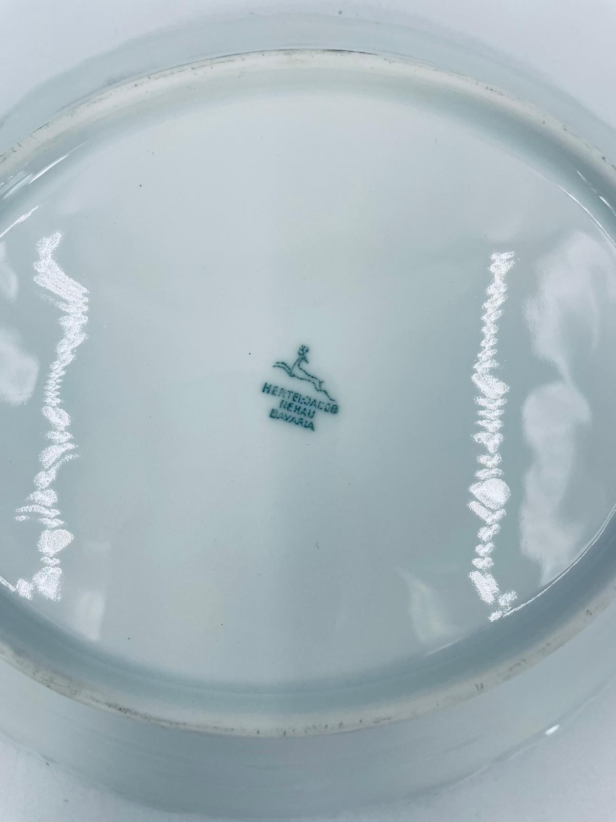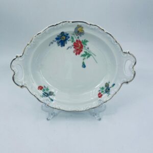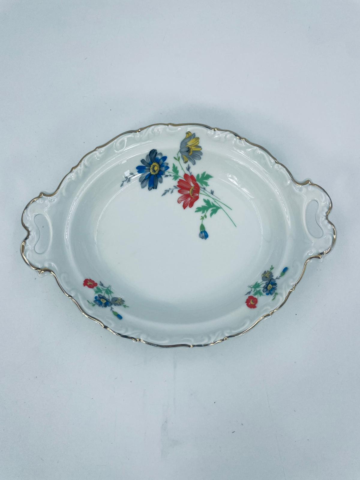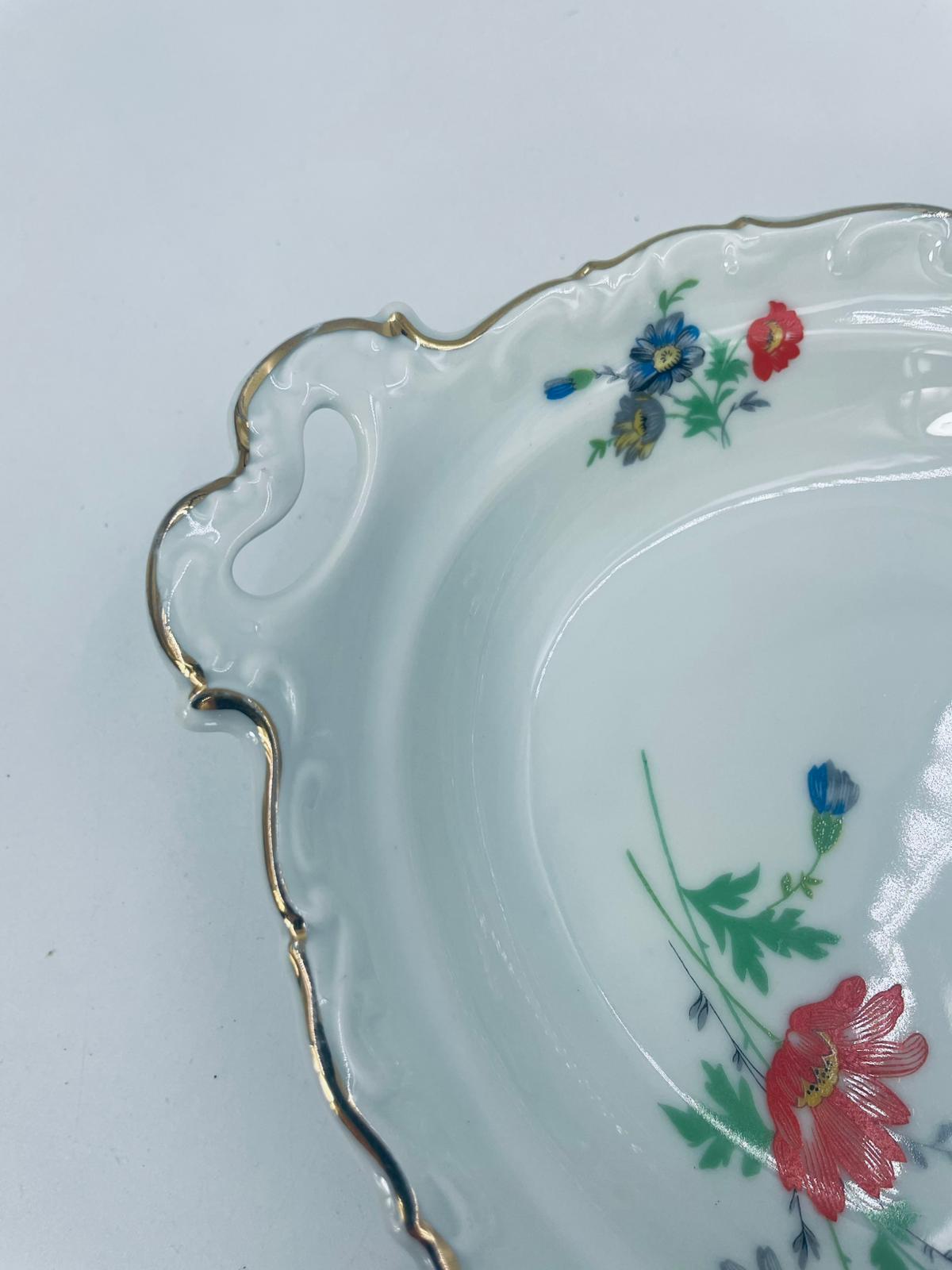 Patera Hertel Jacob Rehau Bavaria wykonana z białej porcelany z motywem pięknych kolorowych kwiatów, wykończona złoceniami na rantach. Przedmiot kolekcjonerski z lat 30tych.
