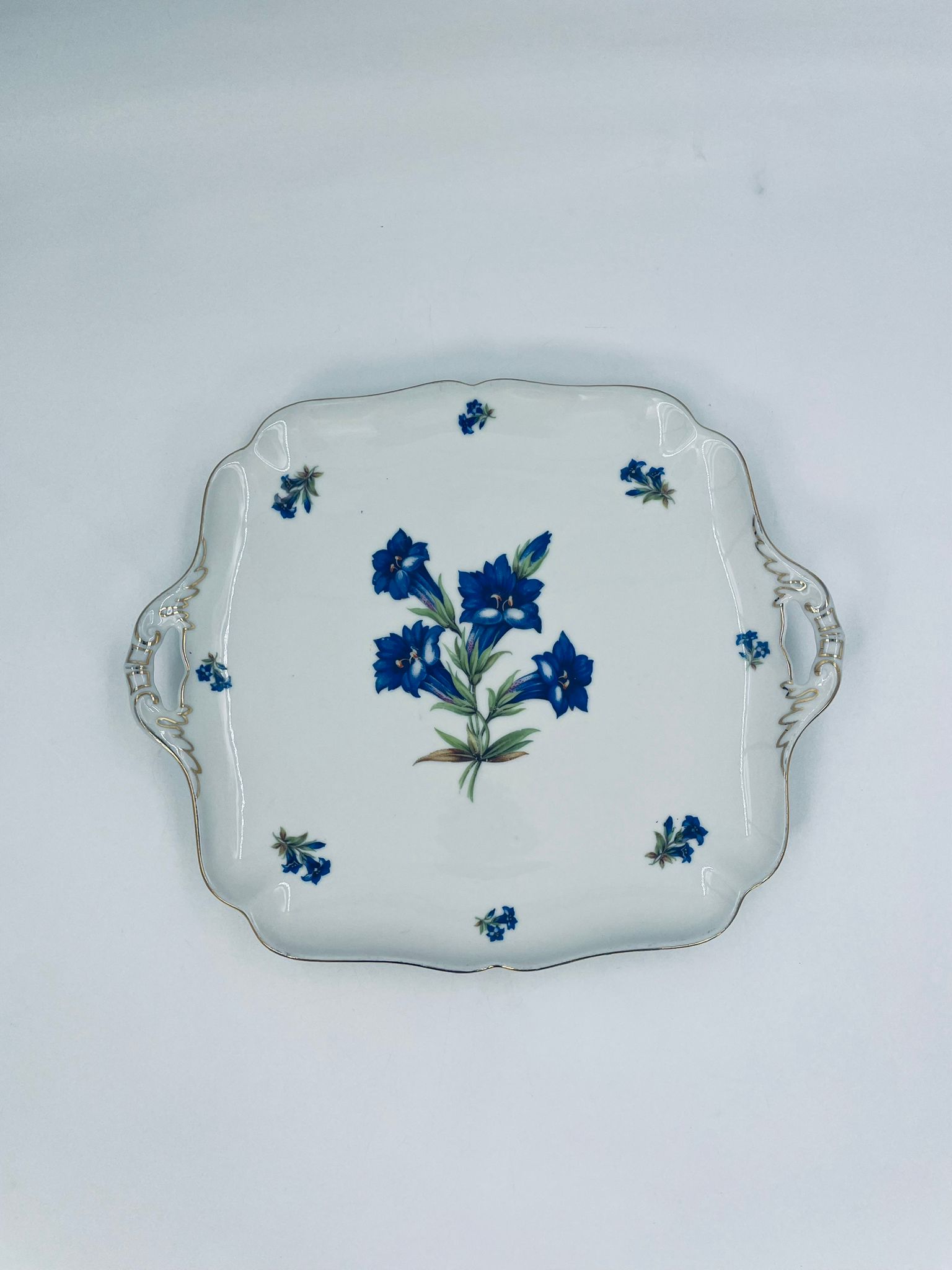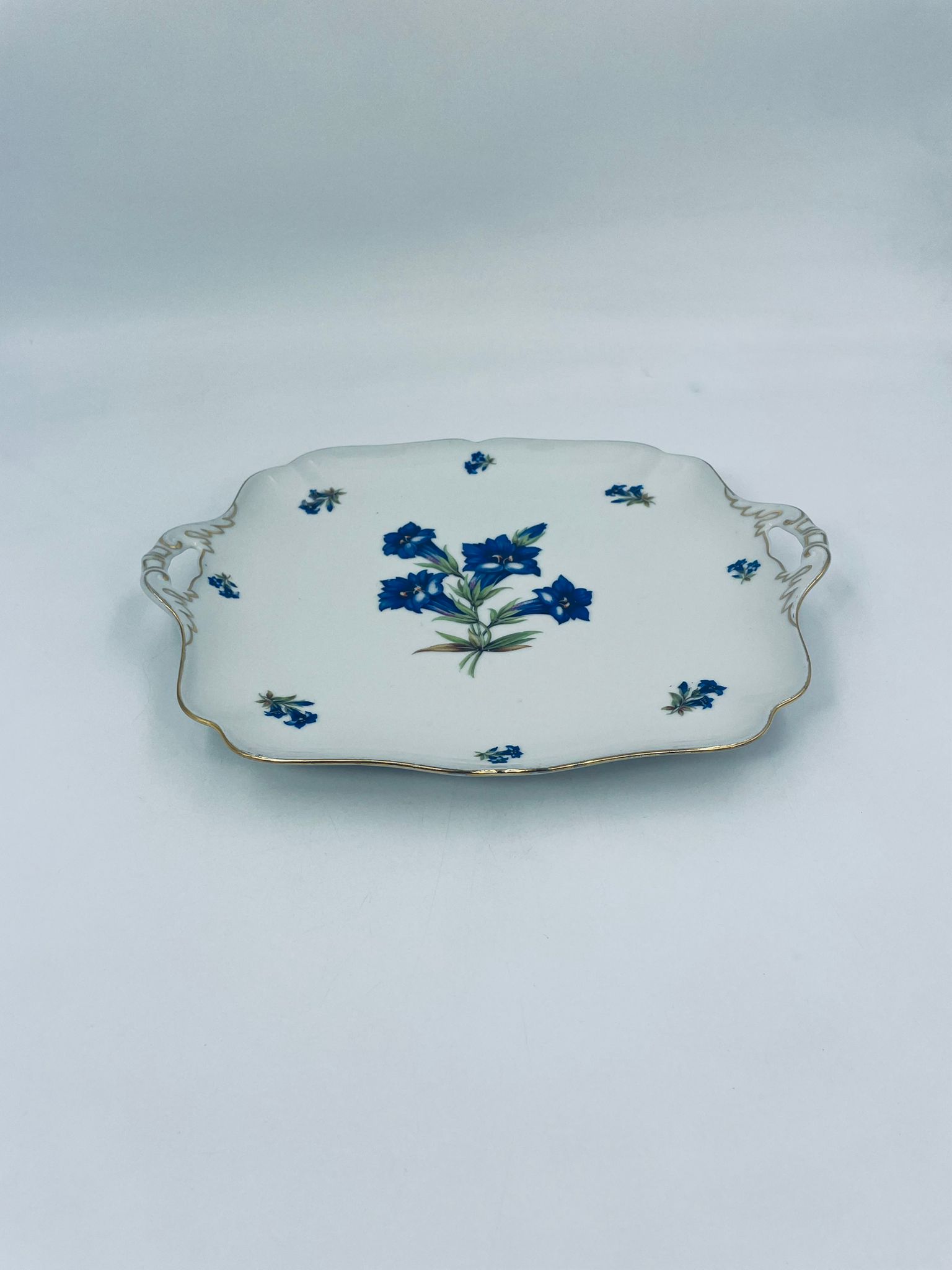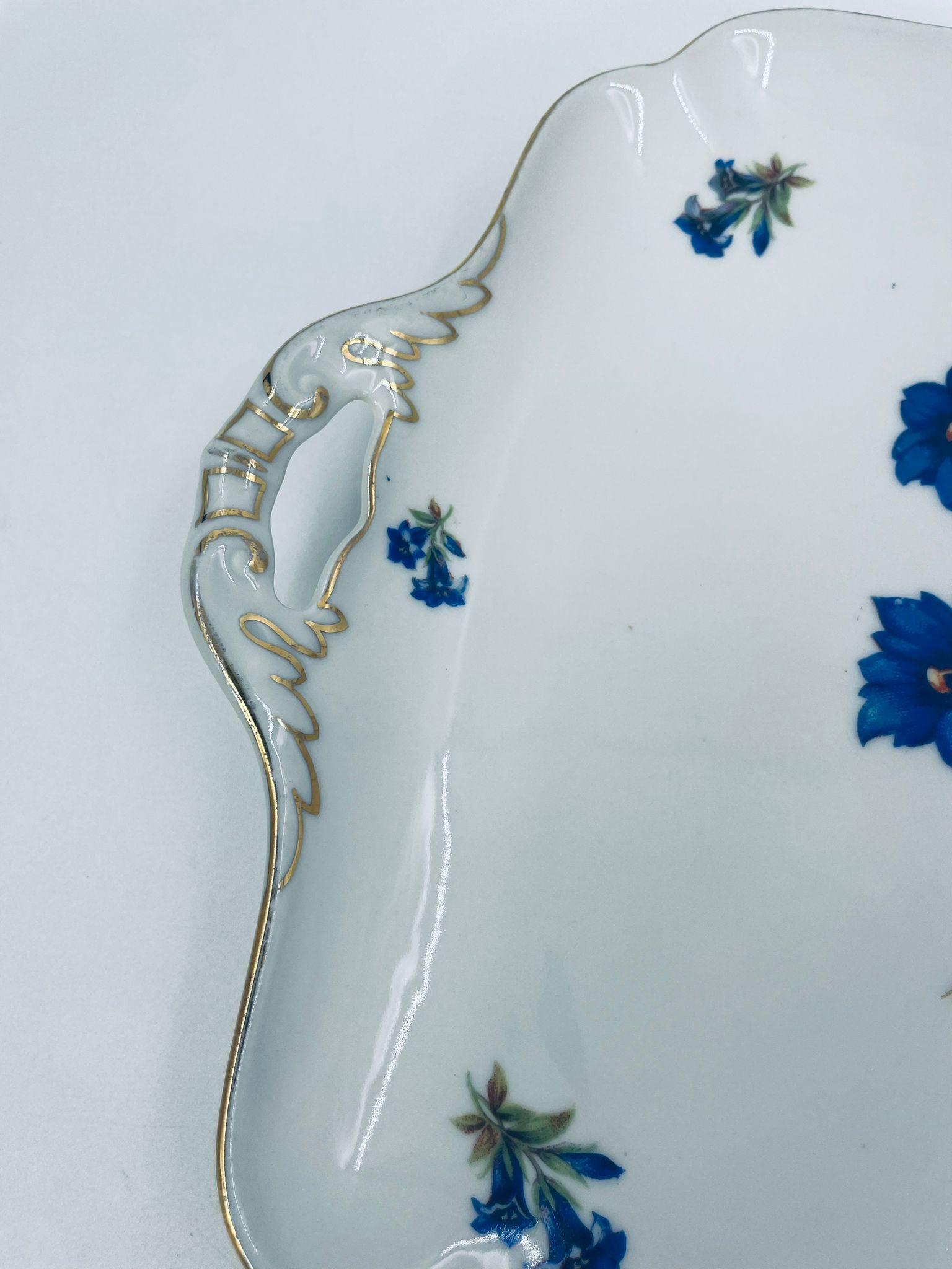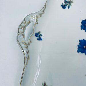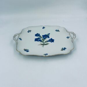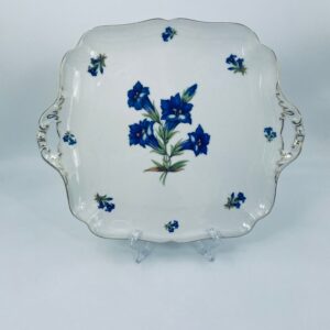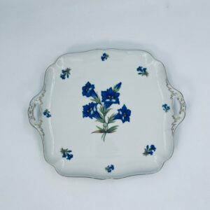 Patera znanej wytwórni Hutschenreuther Hohenberg, wykonana z wysokiej jakości białej porcelany z ręcznie malowanym wzorem niebieskich kwiatów. Uchwyty jak i rant talerza wykończony złoceniami.