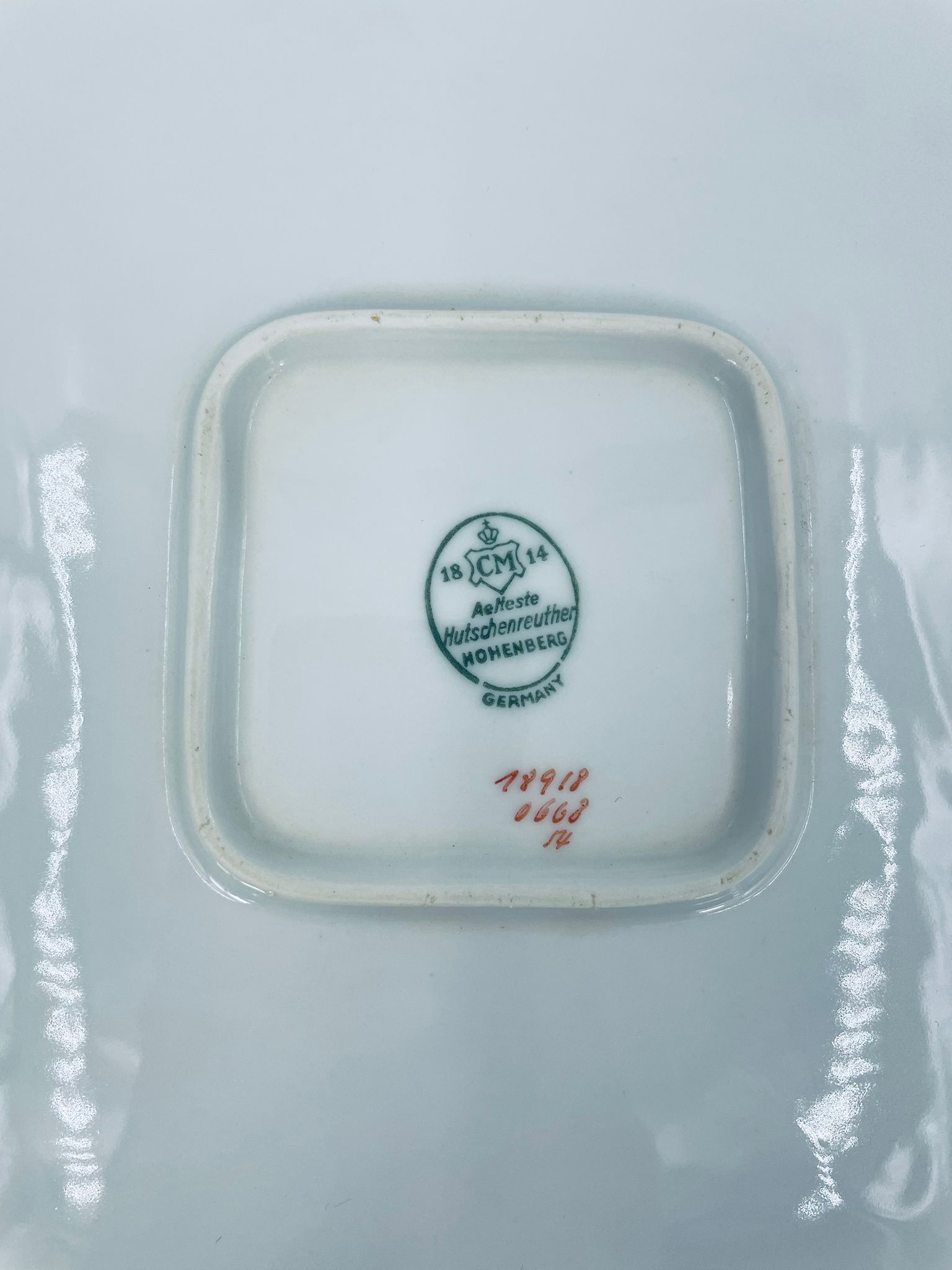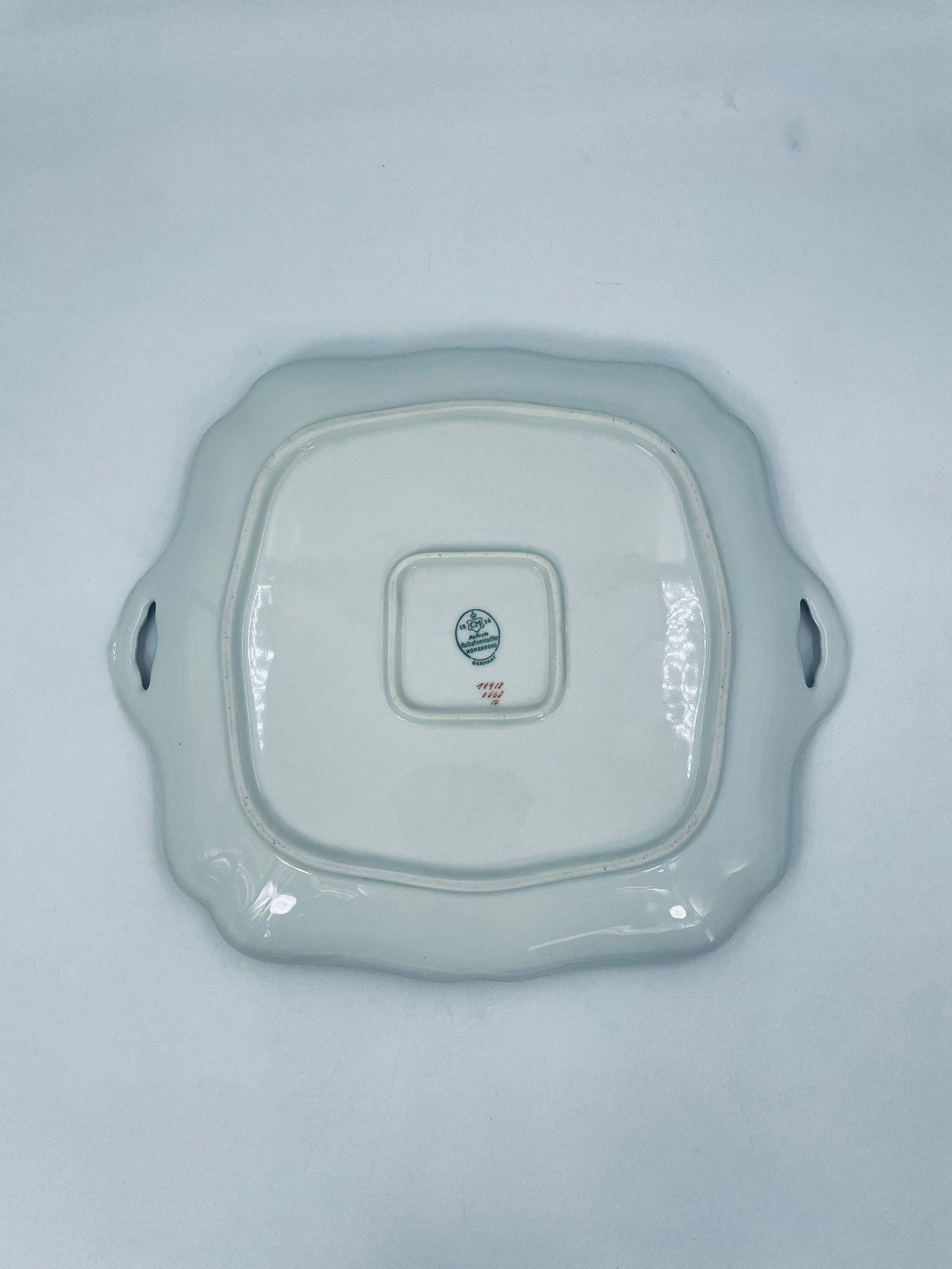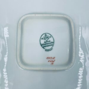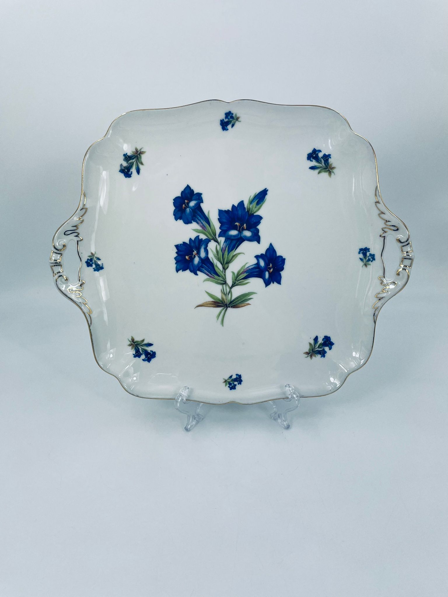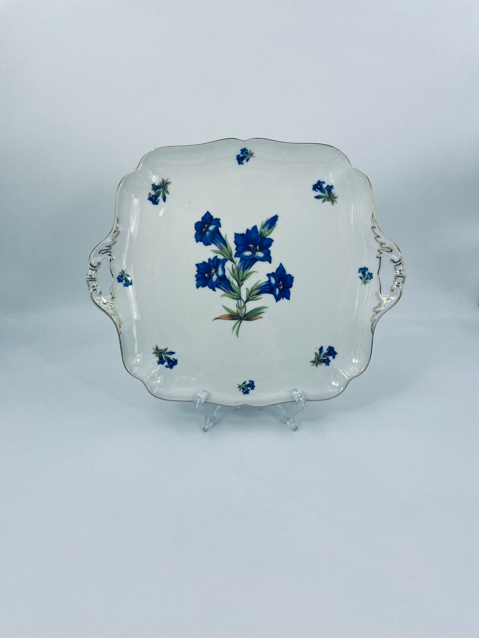 Patera znanej wytwórni Hutschenreuther Hohenberg, wykonana z wysokiej jakości białej porcelany z ręcznie malowanym wzorem niebieskich kwiatów. Uchwyty jak i rant talerza wykończony złoceniami.