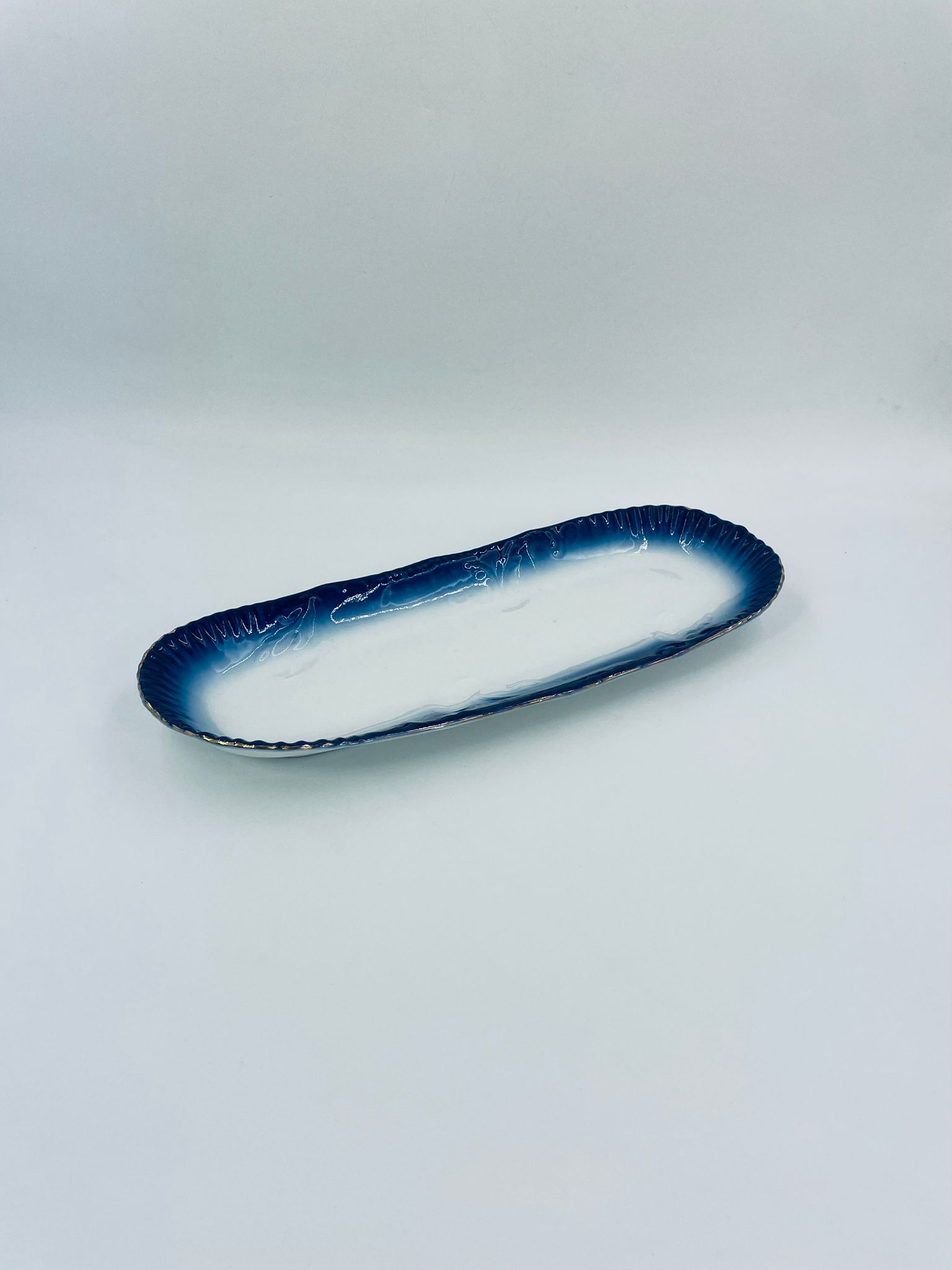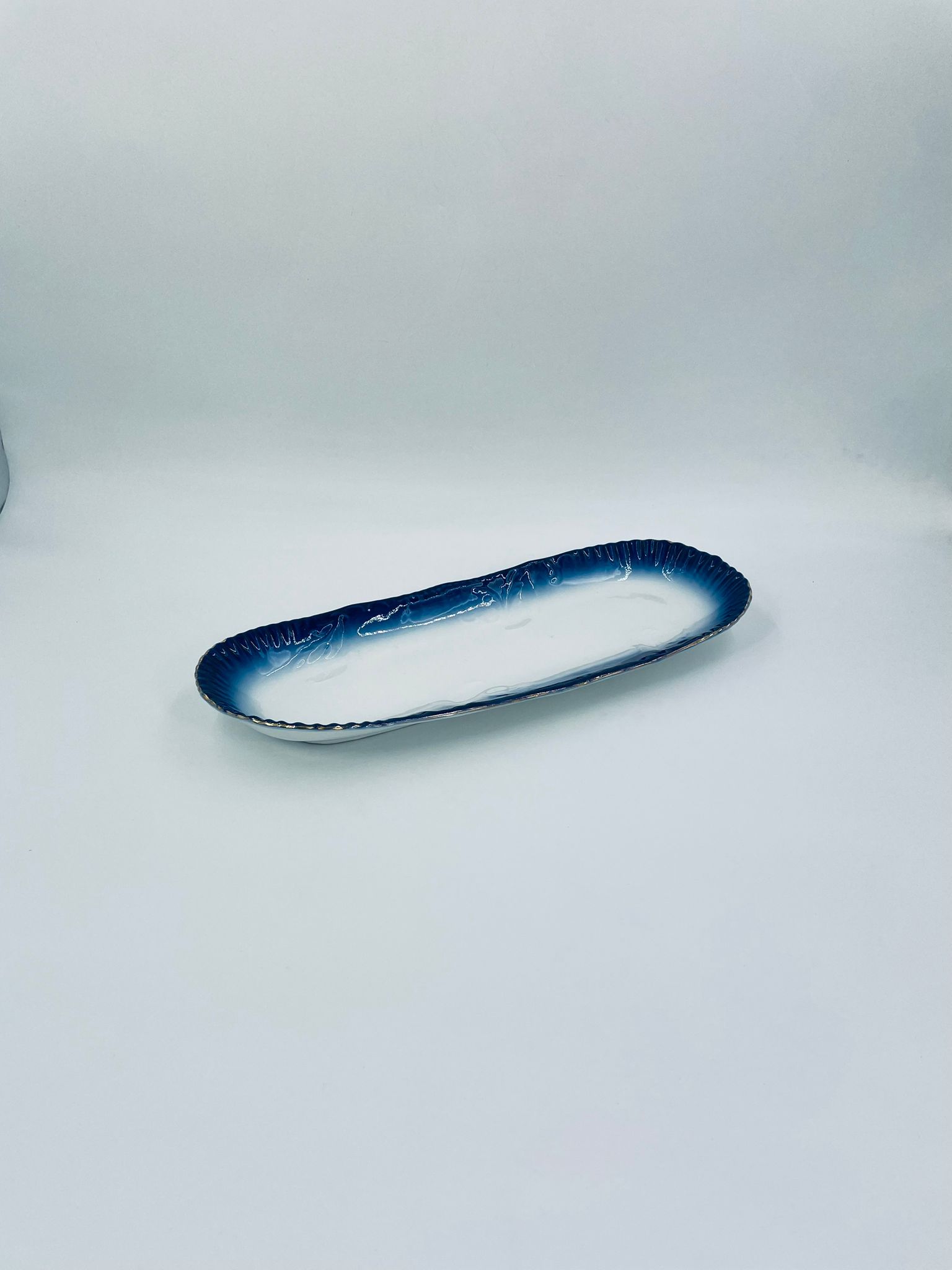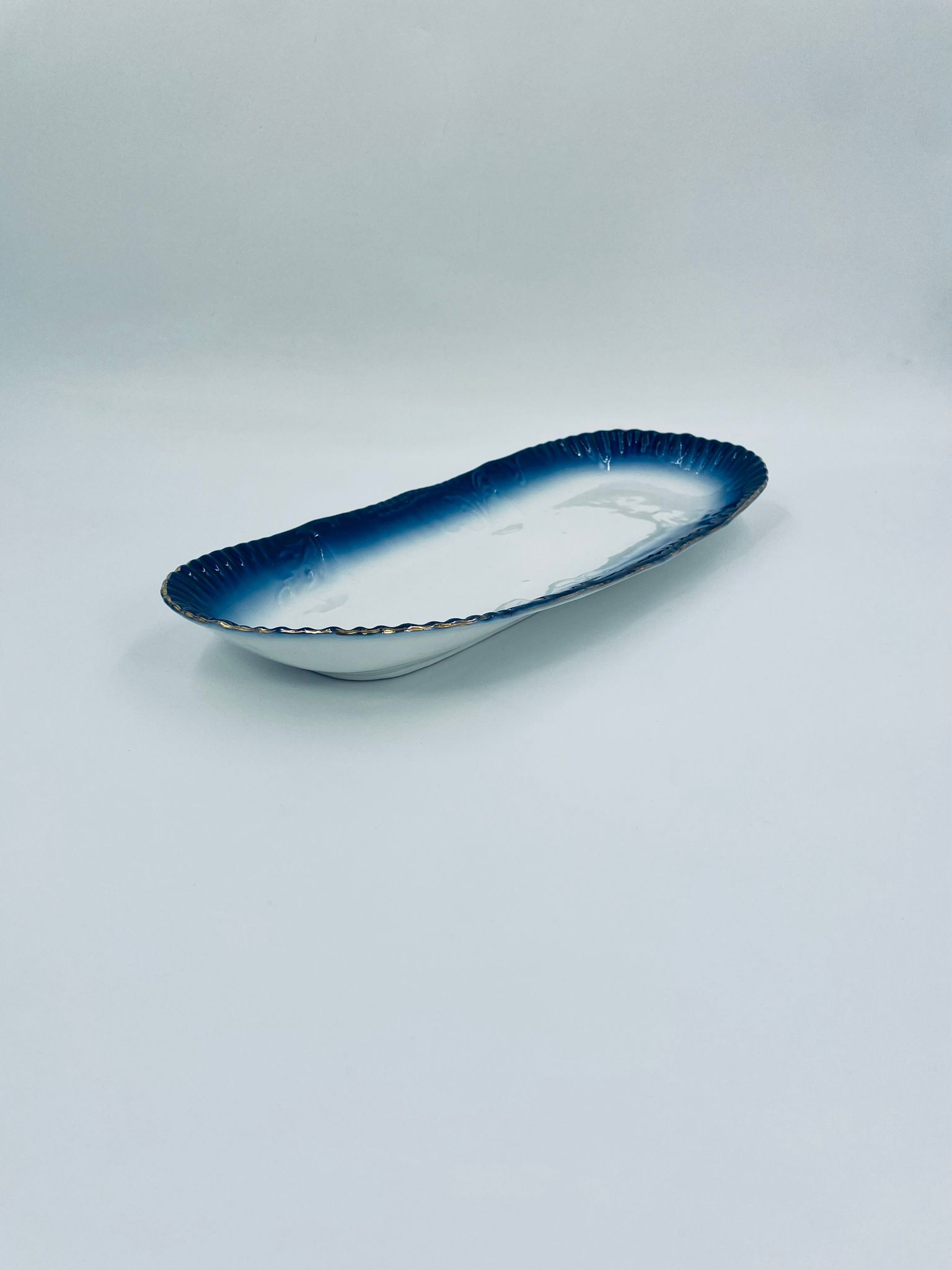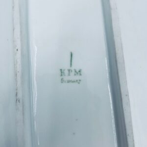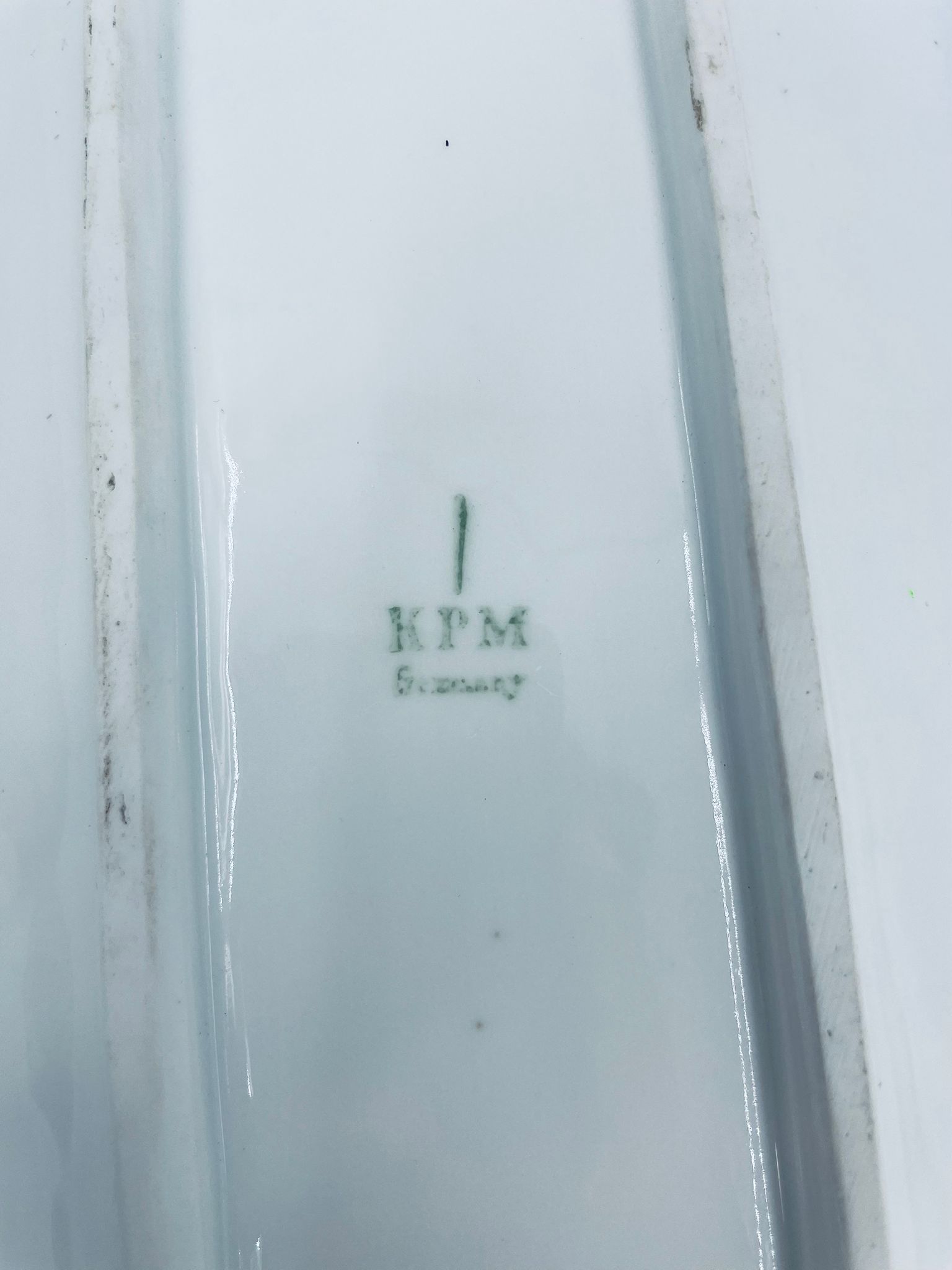 Patera wytwórni KPM Germany, wykonana z wysokiej jakości porcelany. Patera o podłużnym kształcie z zaokrąglonymi rogami. Charakteryzuje się nieskazitelnie białym korpusem porcelanowym, uzupełnionym bogatym kobaltowo-niebieskim pasem i misternymi, ozdobnymi detalami, wykończona złoceniem na rancie. Posiada delikatne przetarcia na złoceniu.