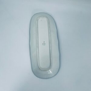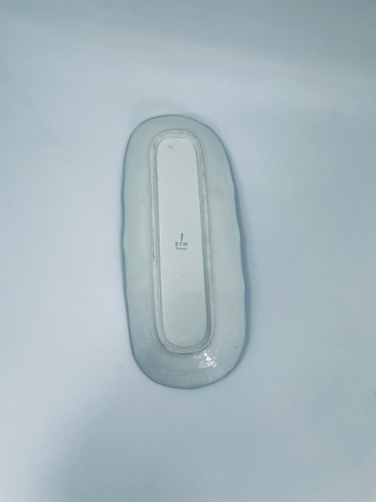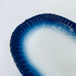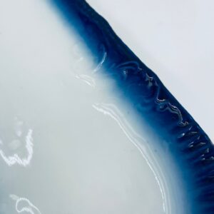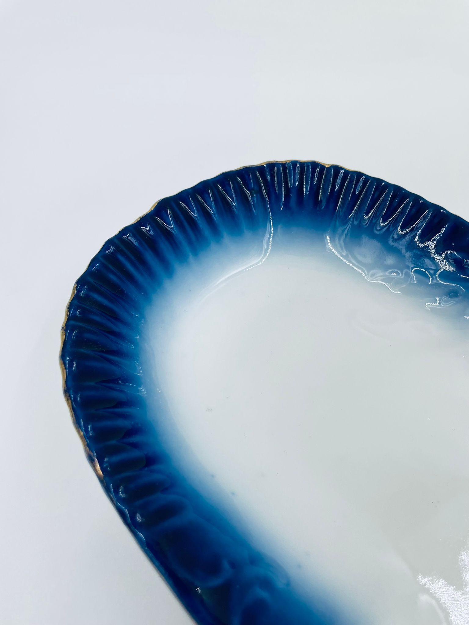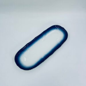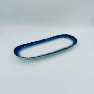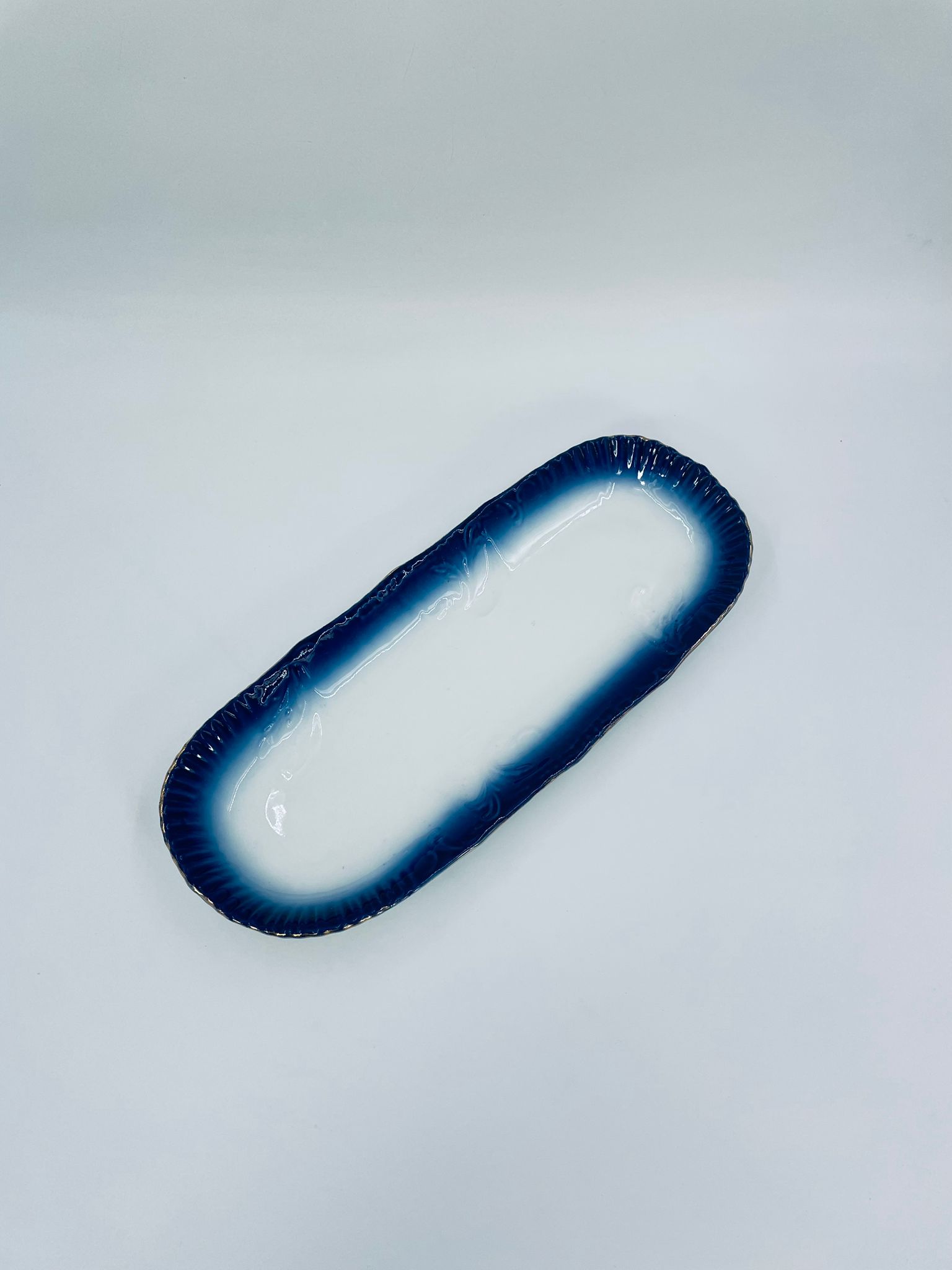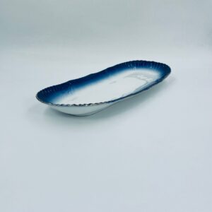 Patera wytwórni KPM Germany, wykonana z wysokiej jakości porcelany. Patera o podłużnym kształcie z zaokrąglonymi rogami. Charakteryzuje się nieskazitelnie białym korpusem porcelanowym, uzupełnionym bogatym kobaltowo-niebieskim pasem i misternymi, ozdobnymi detalami, wykończona złoceniem na rancie. Posiada delikatne przetarcia na złoceniu.