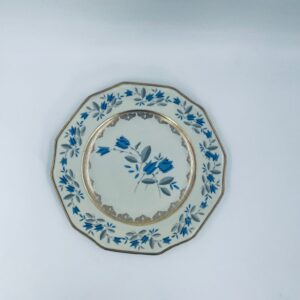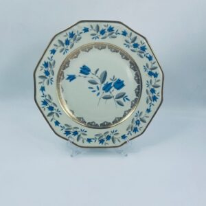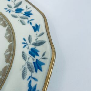 Patera dekoracyjna wytwórni Schwarzenhammer Bavaria, wykonana z wysokiej jakości porcelany w kolorze ecru. Charakteryzuje się nieregularnym kształtem w klasycznym i eleganckim stylu z motywem florystycznym w kolorze niebieskim oraz złotymi zdobieniami, wykończony złotym rantem. Posiada przetarcia na złoceniu.