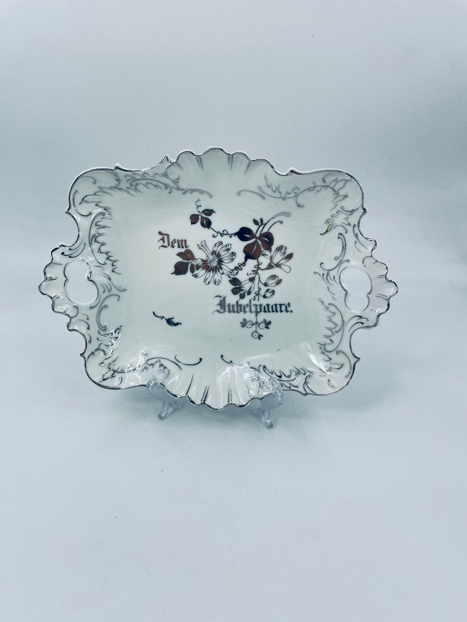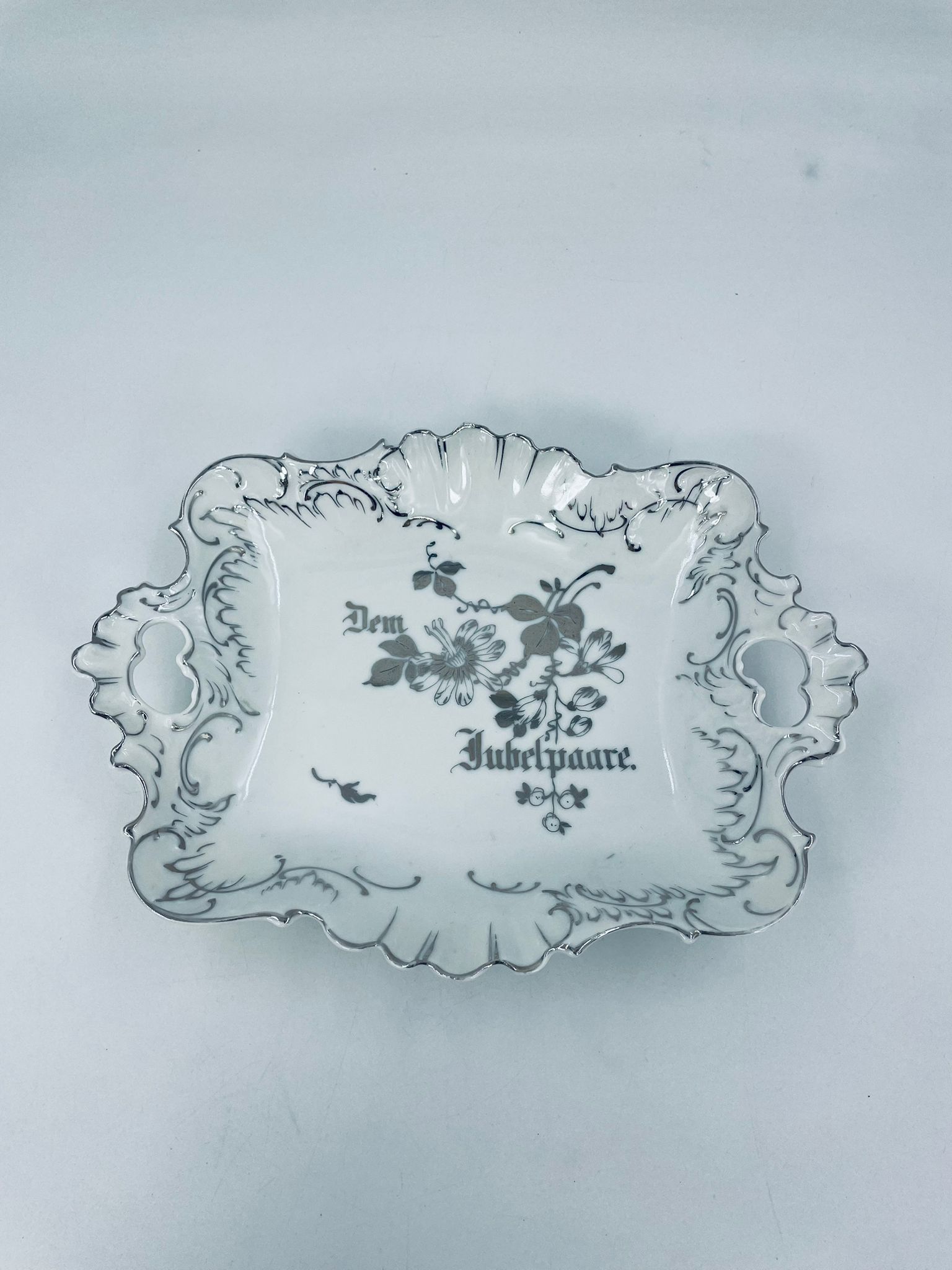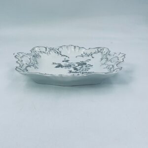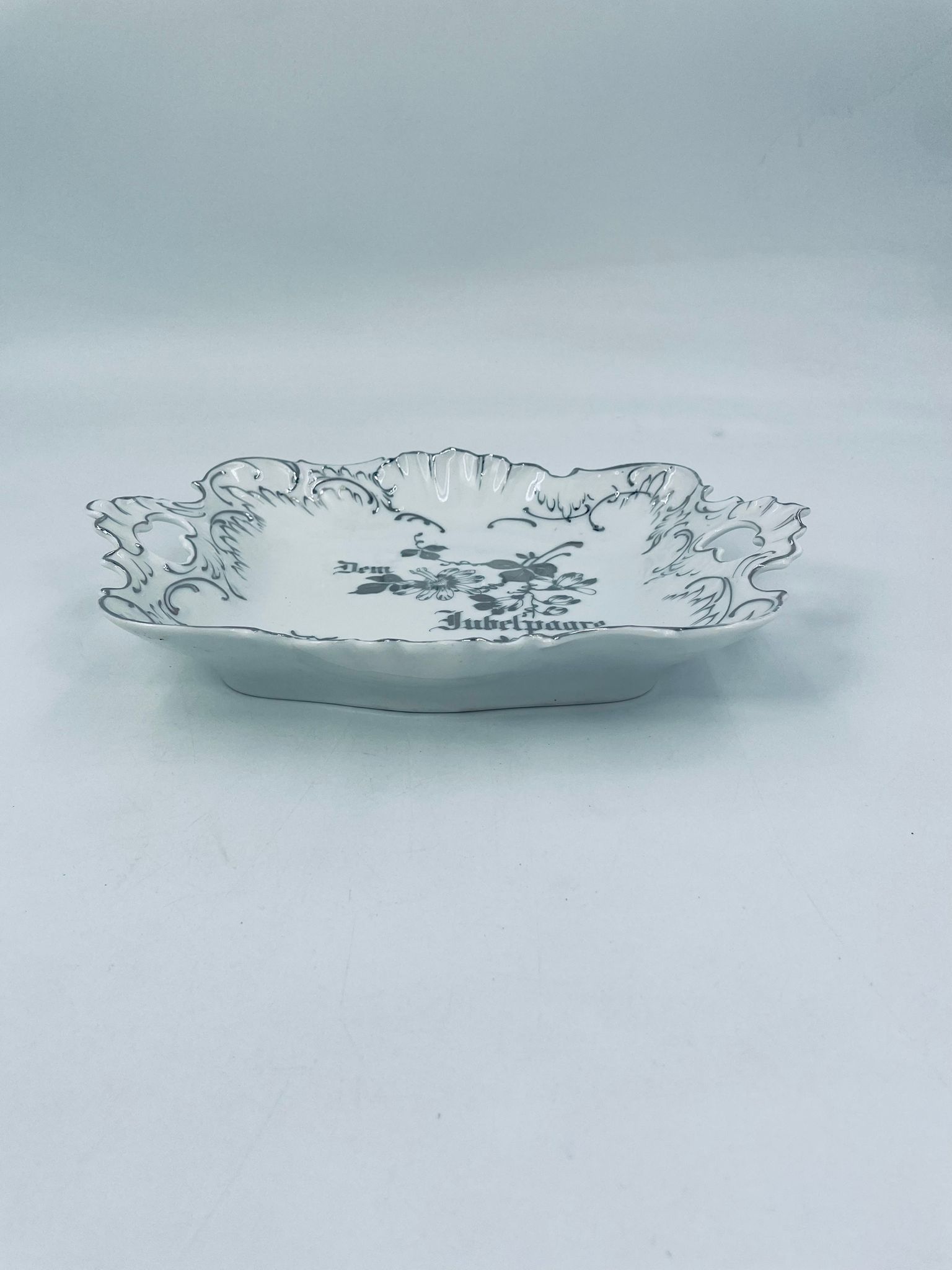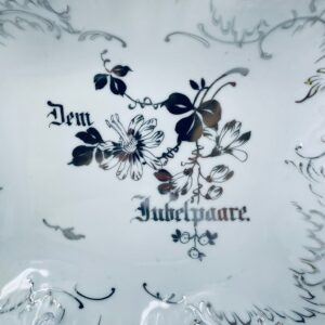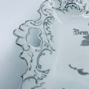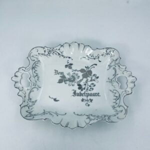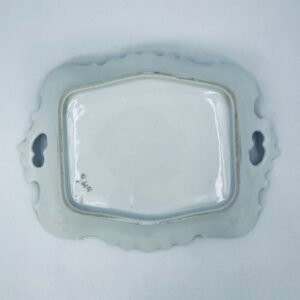 Patera porcelanowa srebrzona zdobiona motywami roślinnymi z falistym brzegiem i uchwytami. Elegancki wygląd sprawia, że nadaje się jako element dekoracyjny oraz do użytku codziennego. Półmisek popularny w Niemczech w XIX i na początku XXw.