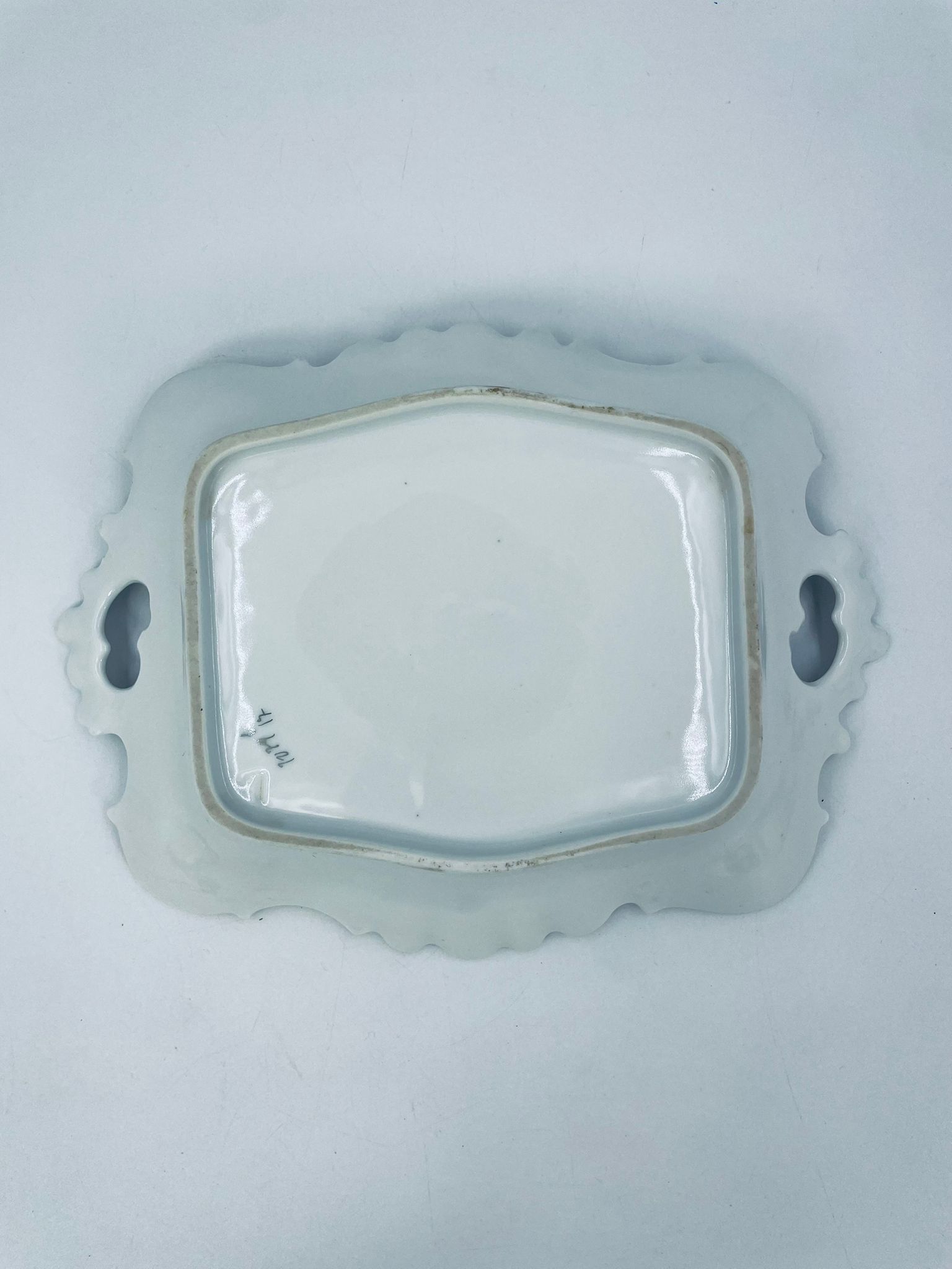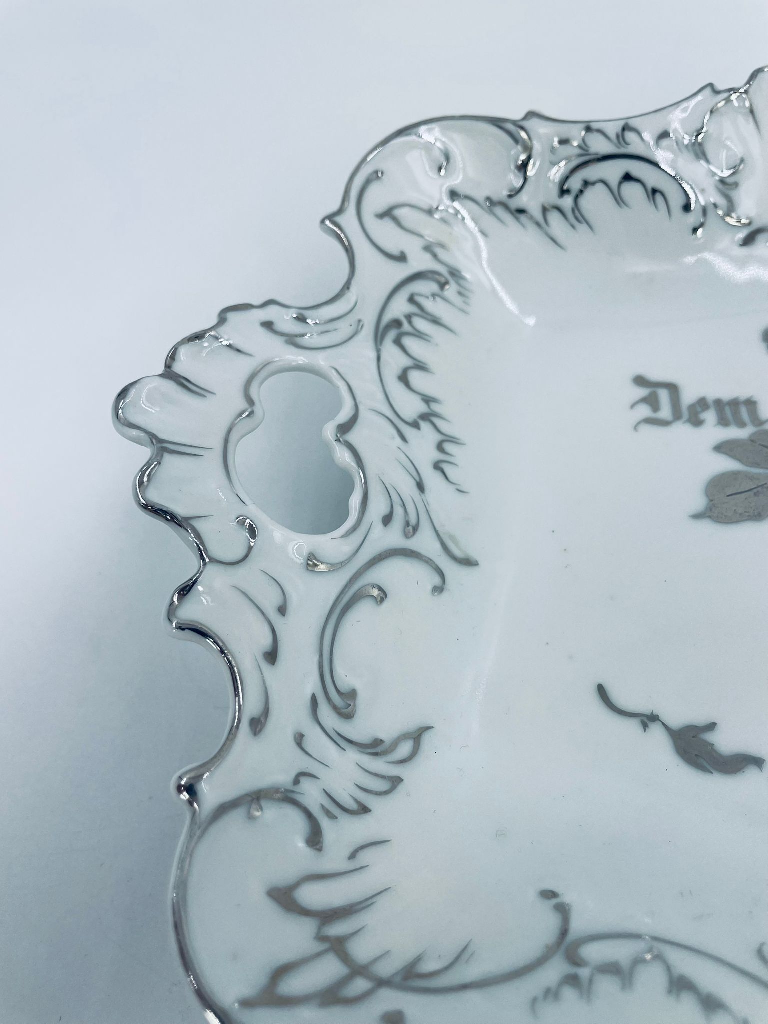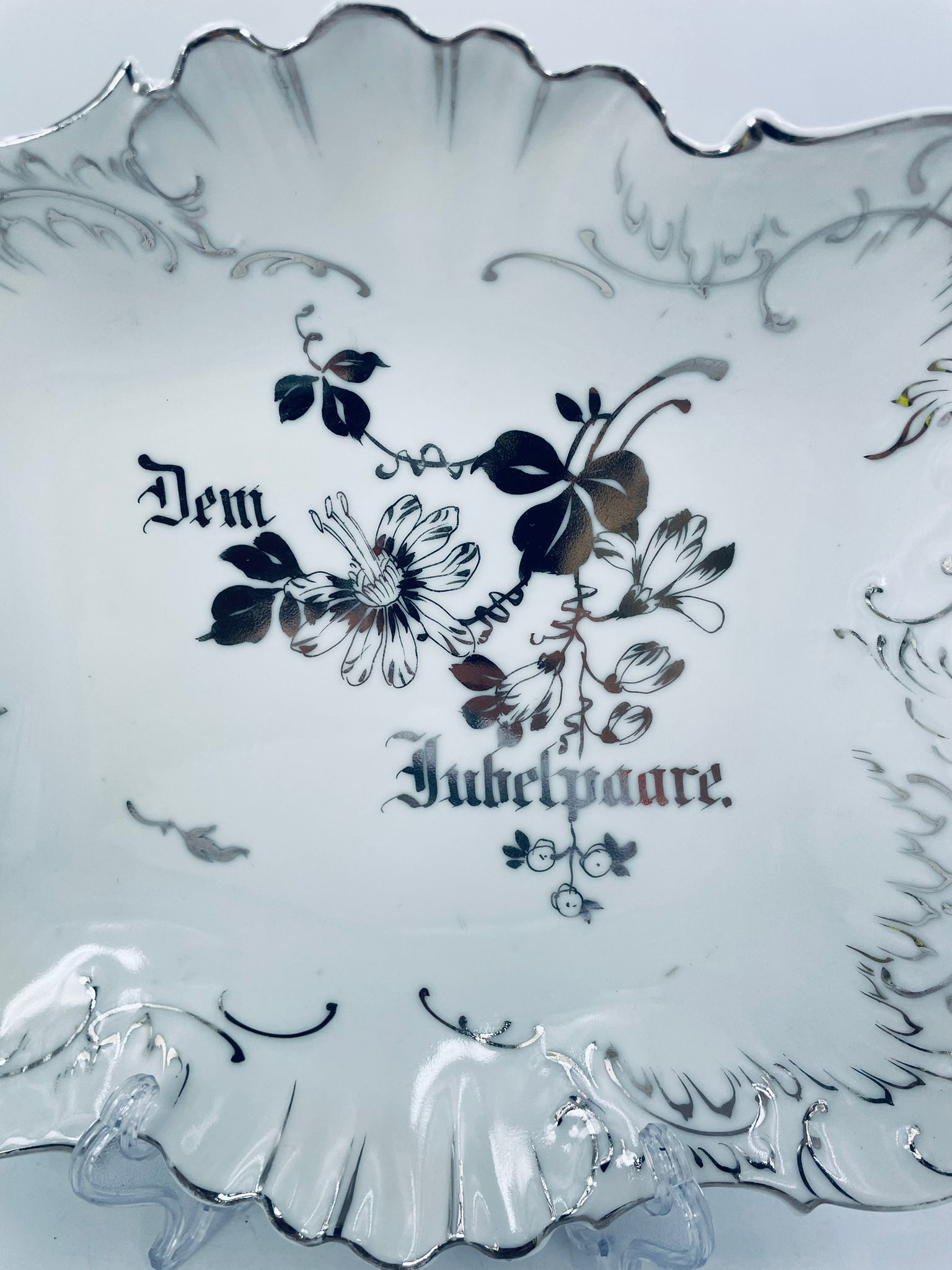 Patera porcelanowa srebrzona zdobiona motywami roślinnymi z falistym brzegiem i uchwytami. Elegancki wygląd sprawia, że nadaje się jako element dekoracyjny oraz do użytku codziennego. Półmisek popularny w Niemczech w XIX i na początku XXw.