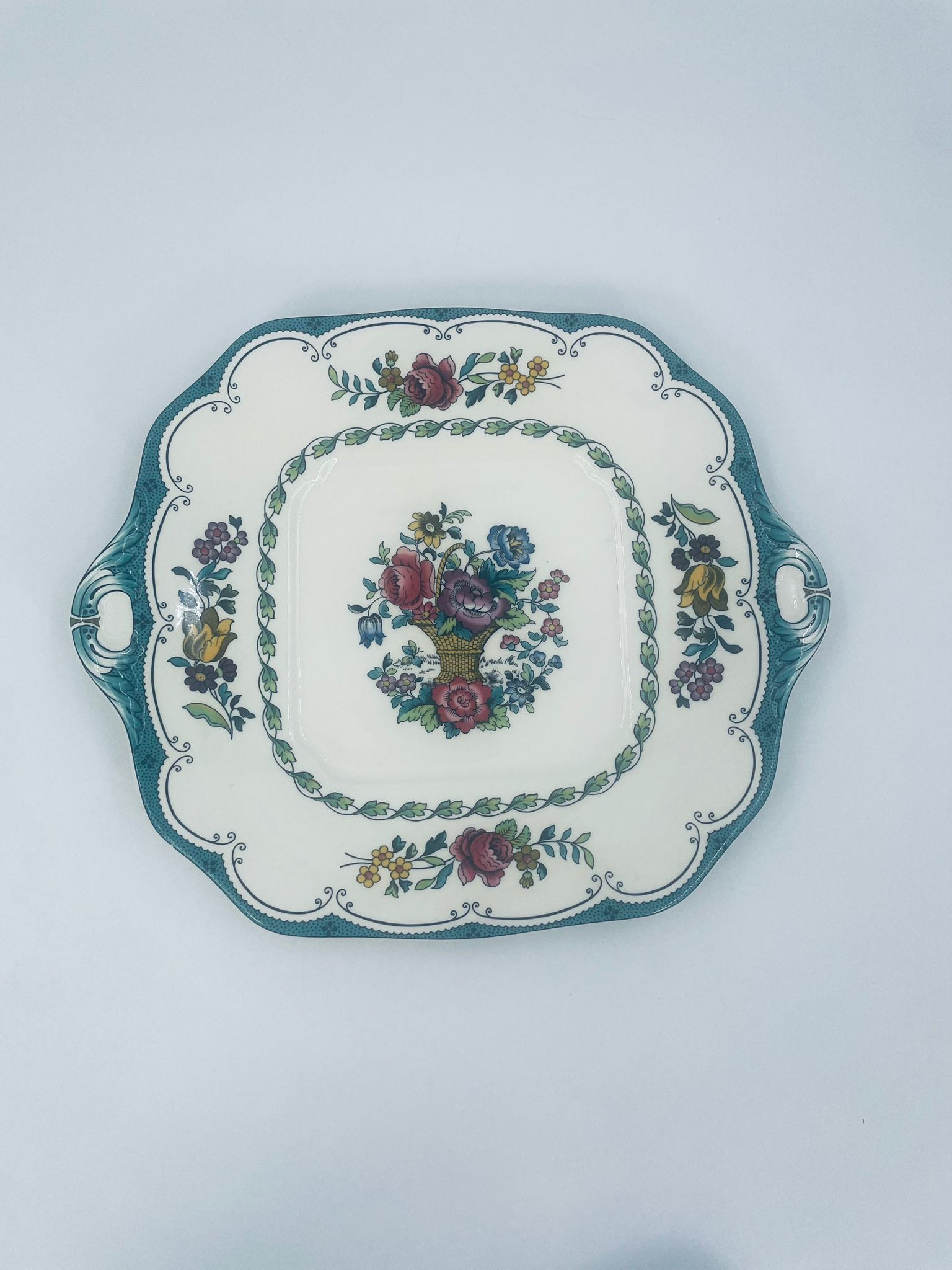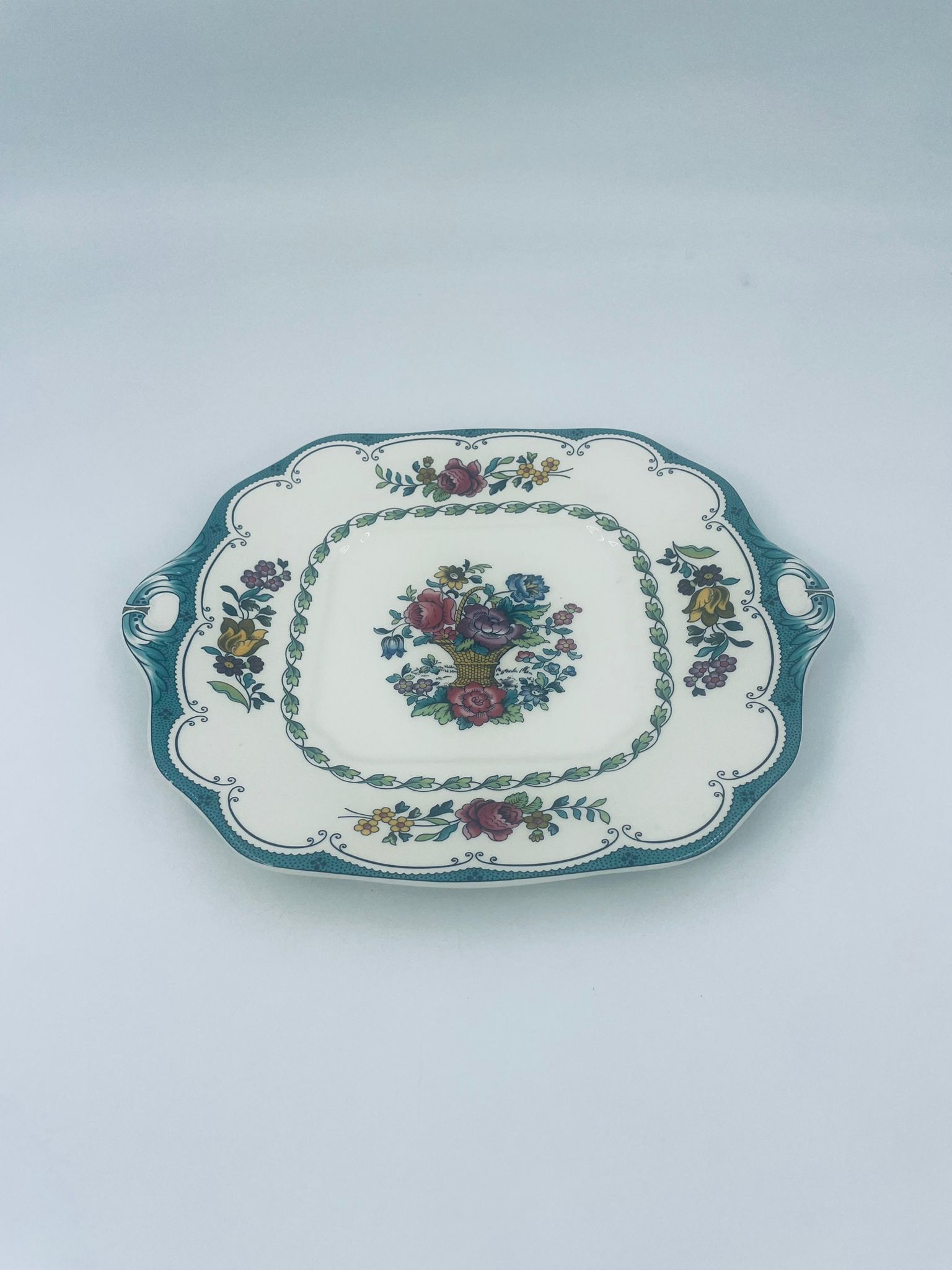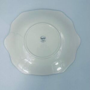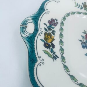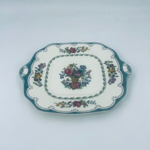 Patera wytwórni Spode England Avondale z wysokiej jakości porcelany w kolorze ecru. Charakteryzuje się kwiatowym wzorem z koszem kwiatów w centralnej części talerza, otoczonym girlandą z liści i kwiatów oraz ozdobnym brzegiem w odcieniach zieleni.