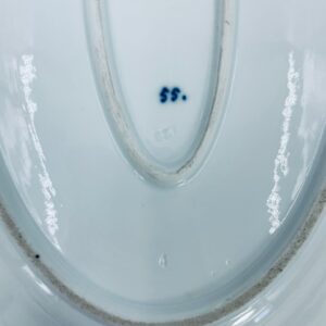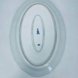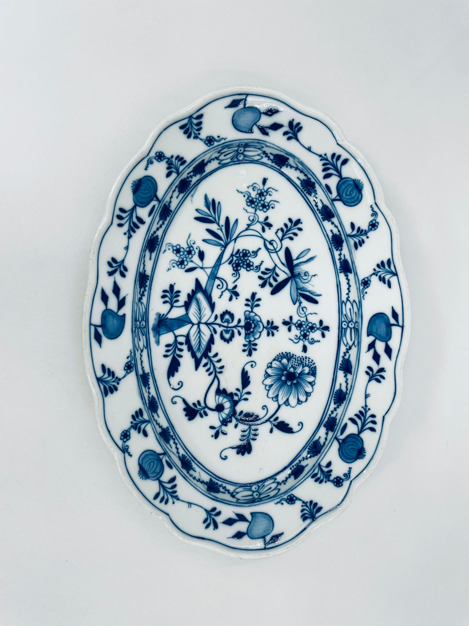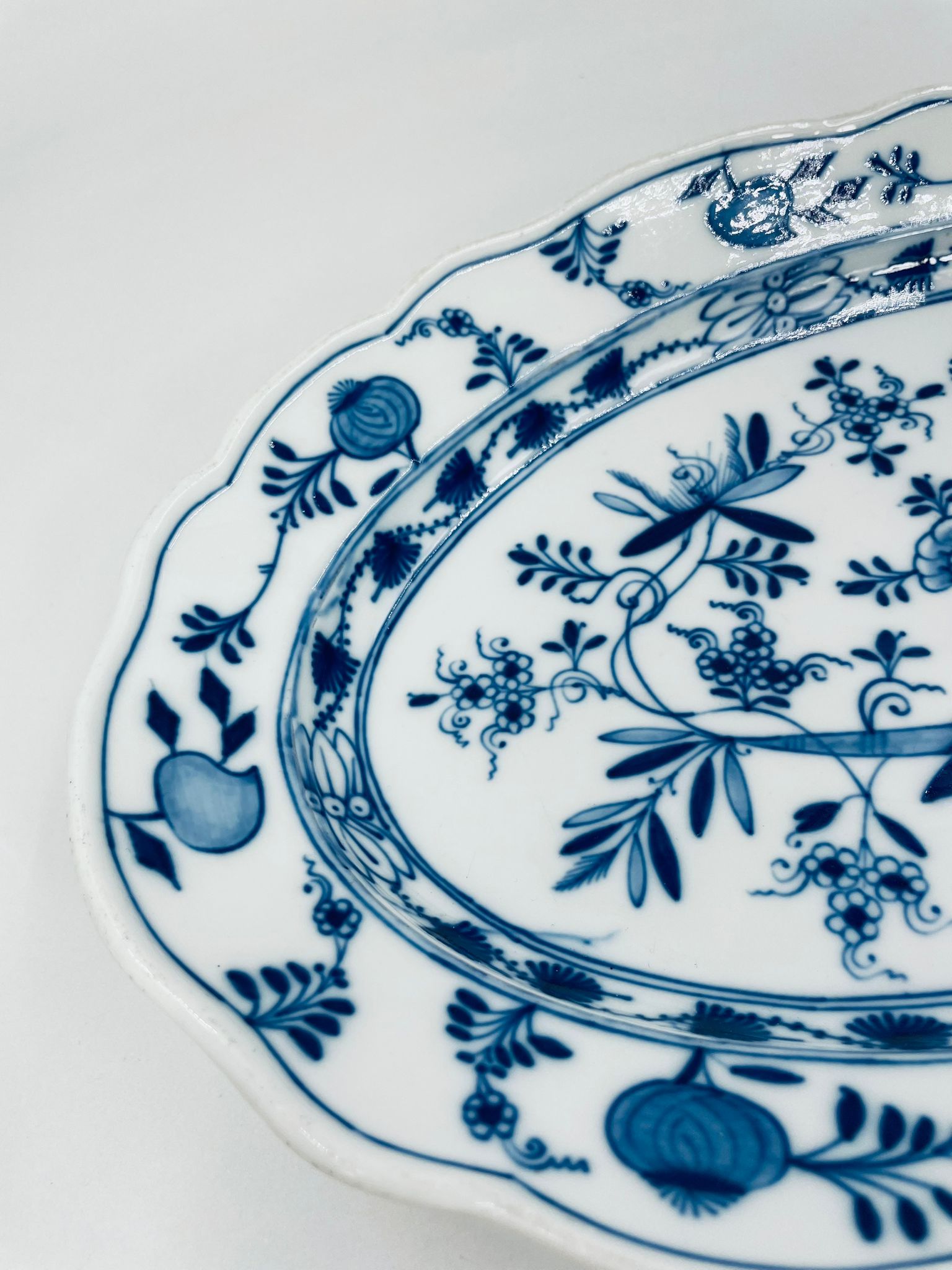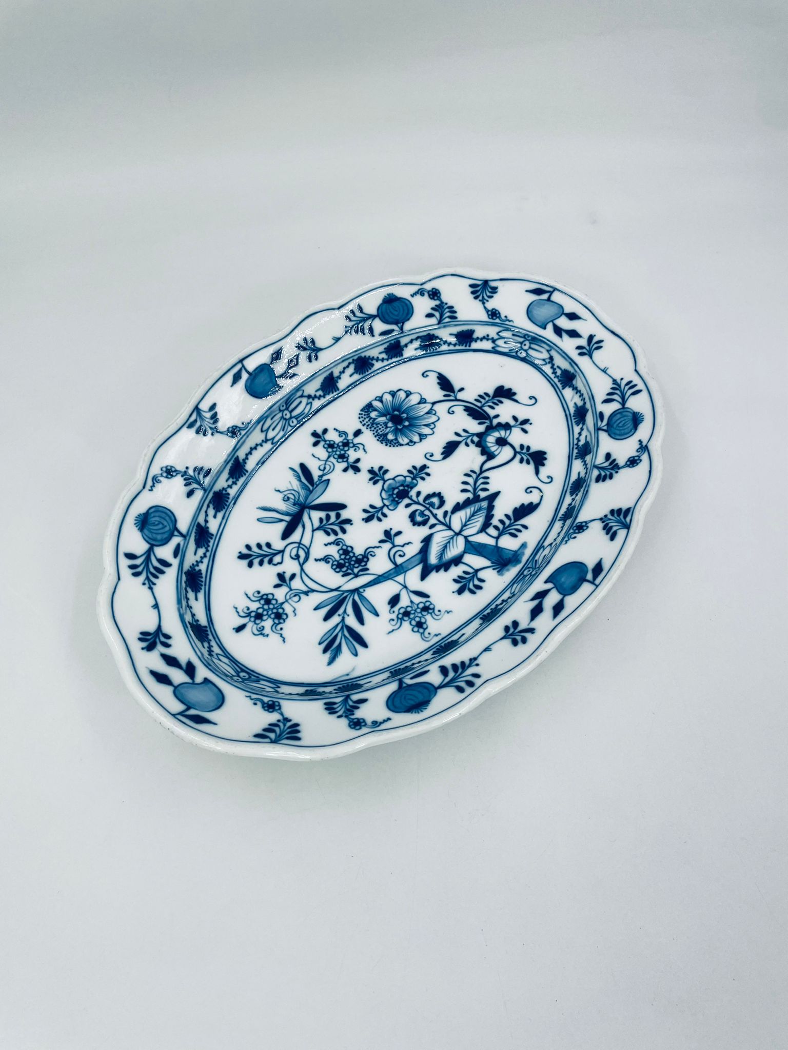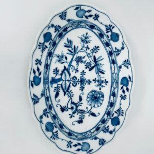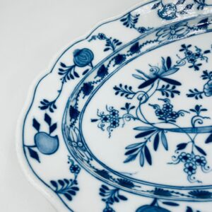 Patera z porcelany miśnieńskiej w białym kolorze z niebieskimi zdobieniami kwiatowymi we wzorze cebulowym. Patera ma owalny kształt z falistym brzegiem. Wysokiej jakości porcelana miśnieńska produkowana od 1710r.