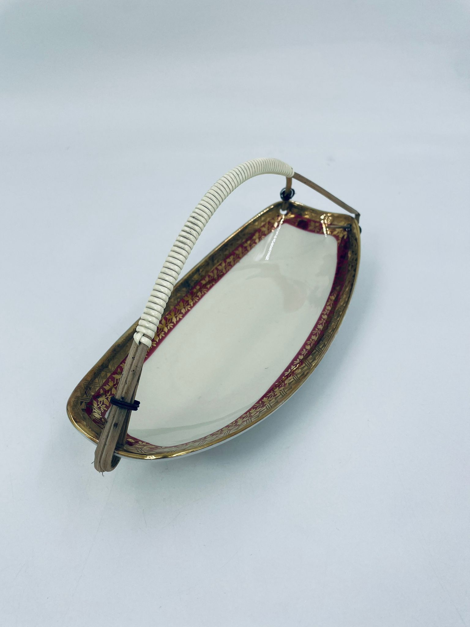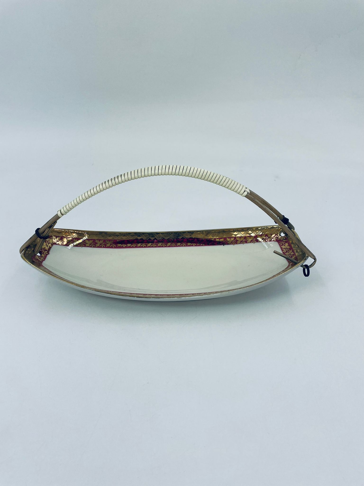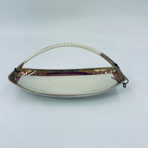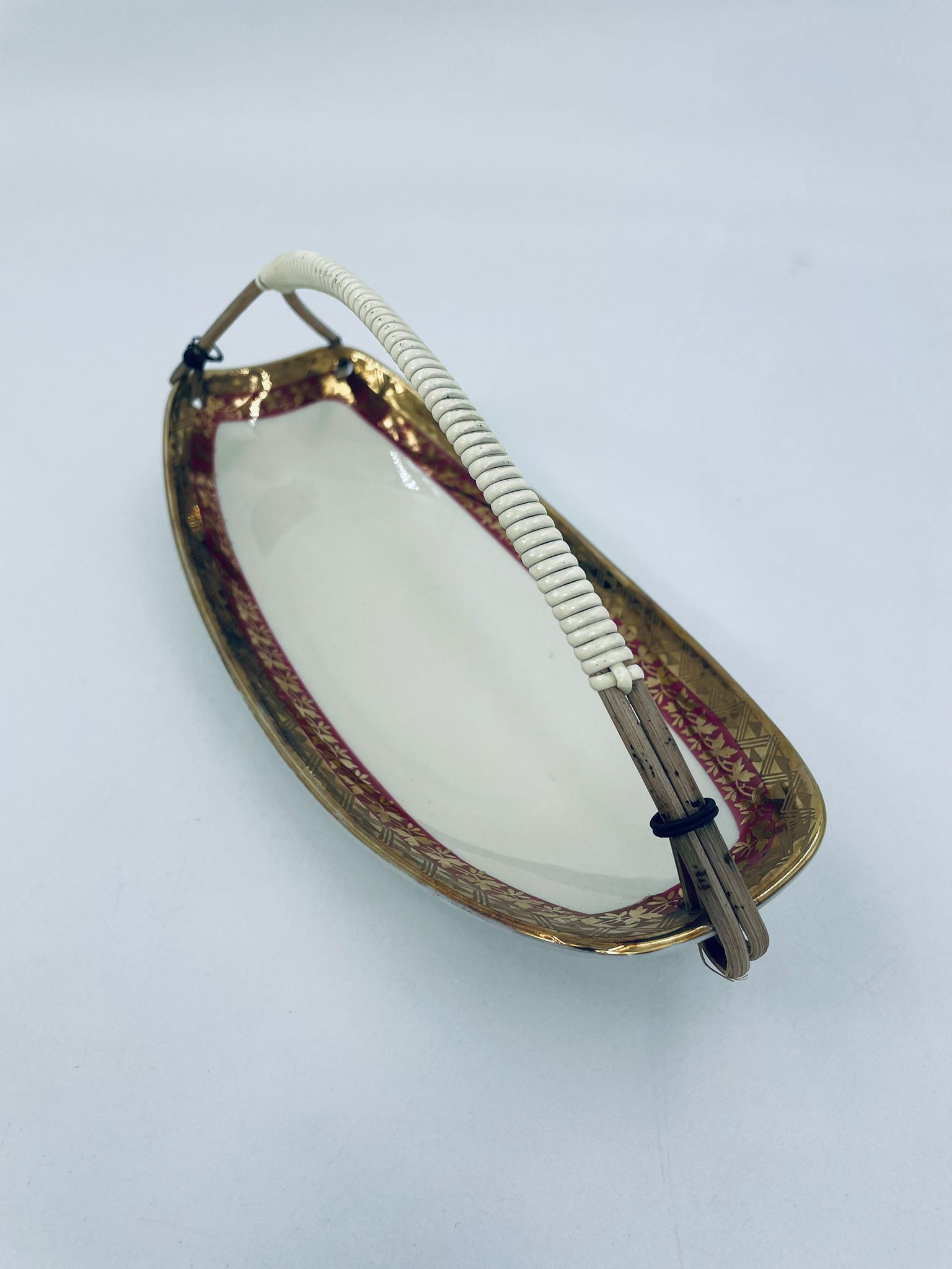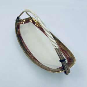 Porcelanowa patera z uchwytem wytwórni Zeh Scherzer w kolorze ecru. Patera ma owalny kształt, jest zdobiona złotym i czerwonym wzorem na krawędziach. Uchwyt wykonany jest z materiału przypominanego wiklinę. Patera może być używana do serwowania różnych potraw takich jak ciasta, przekąski oraz owoce.