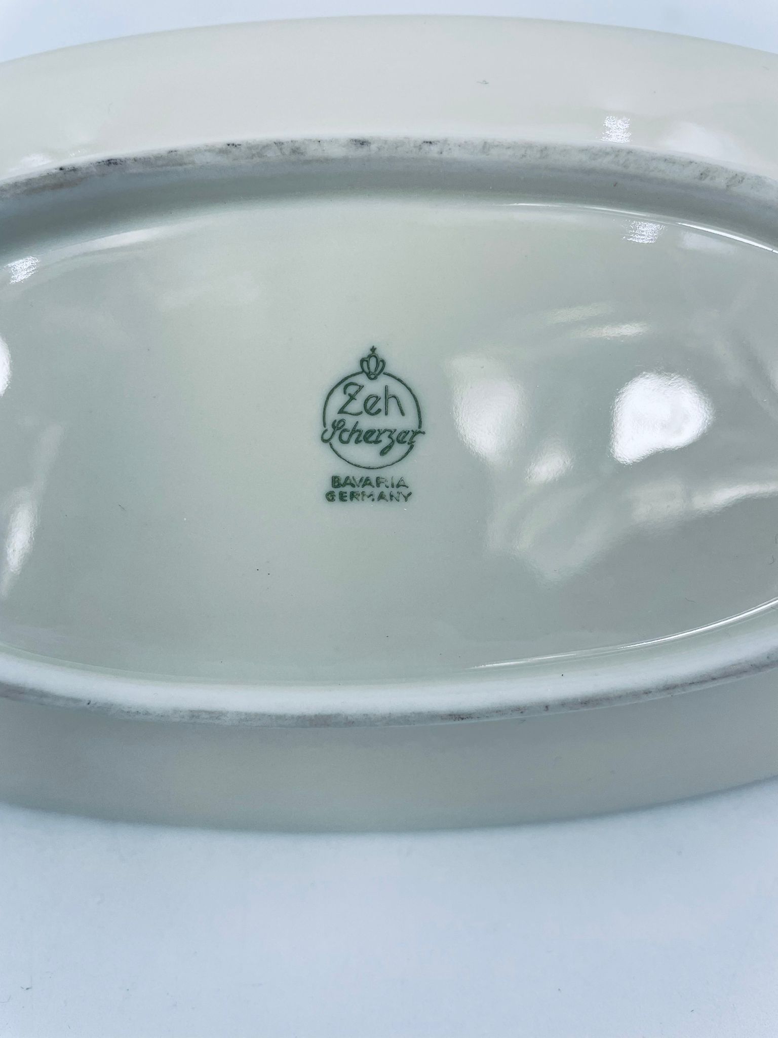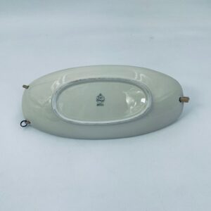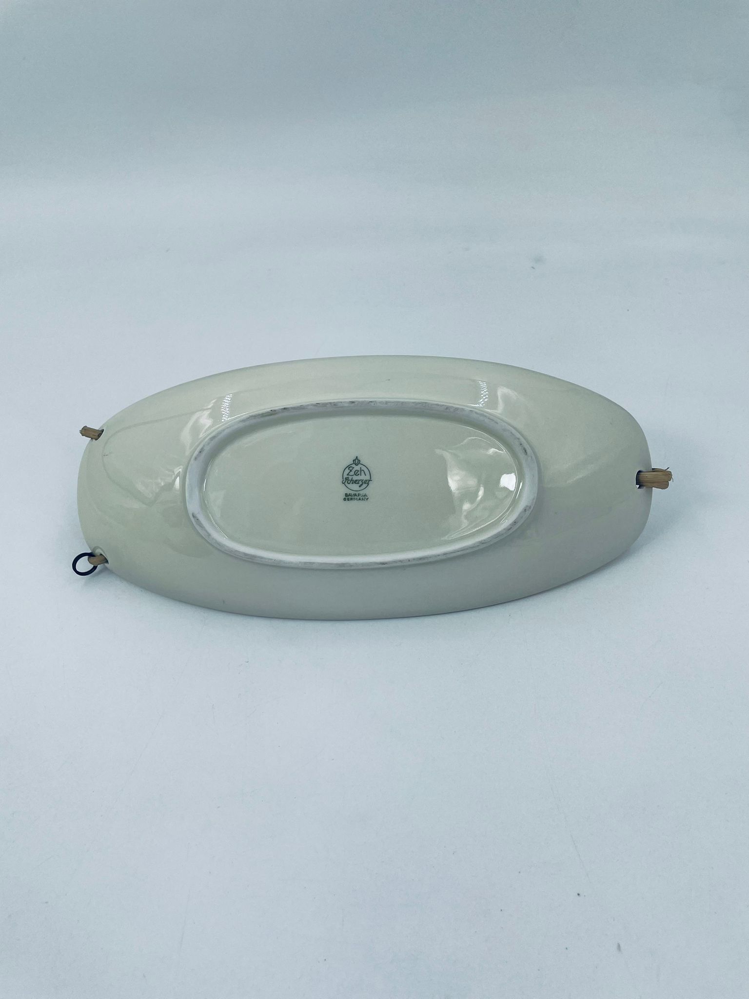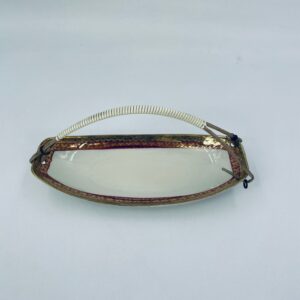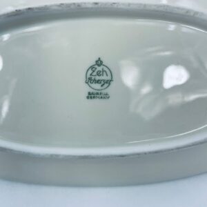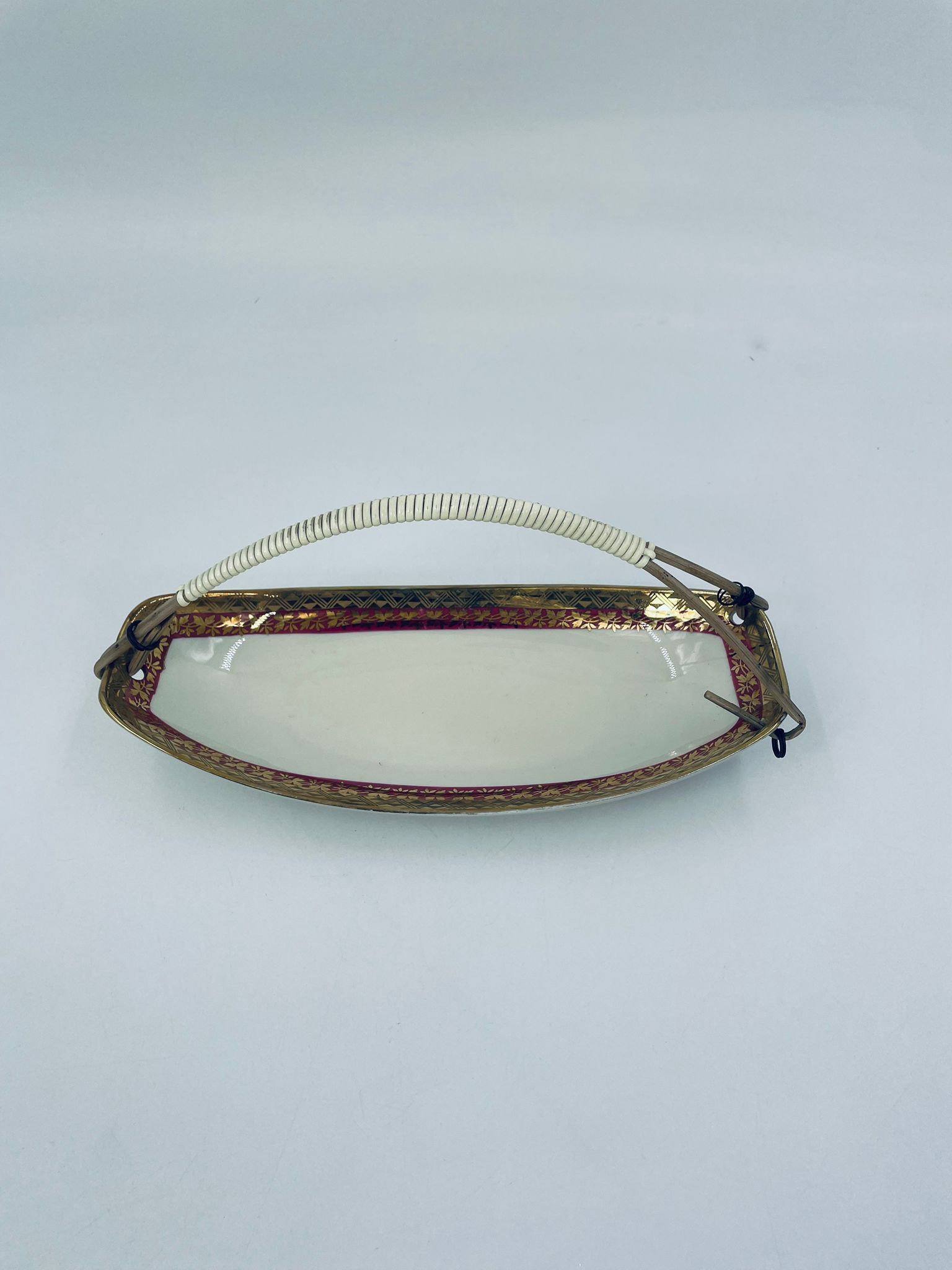 Porcelanowa patera z uchwytem wytwórni Zeh Scherzer w kolorze ecru. Patera ma owalny kształt, jest zdobiona złotym i czerwonym wzorem na krawędziach. Uchwyt wykonany jest z materiału przypominanego wiklinę. Patera może być używana do serwowania różnych potraw takich jak ciasta, przekąski oraz owoce.