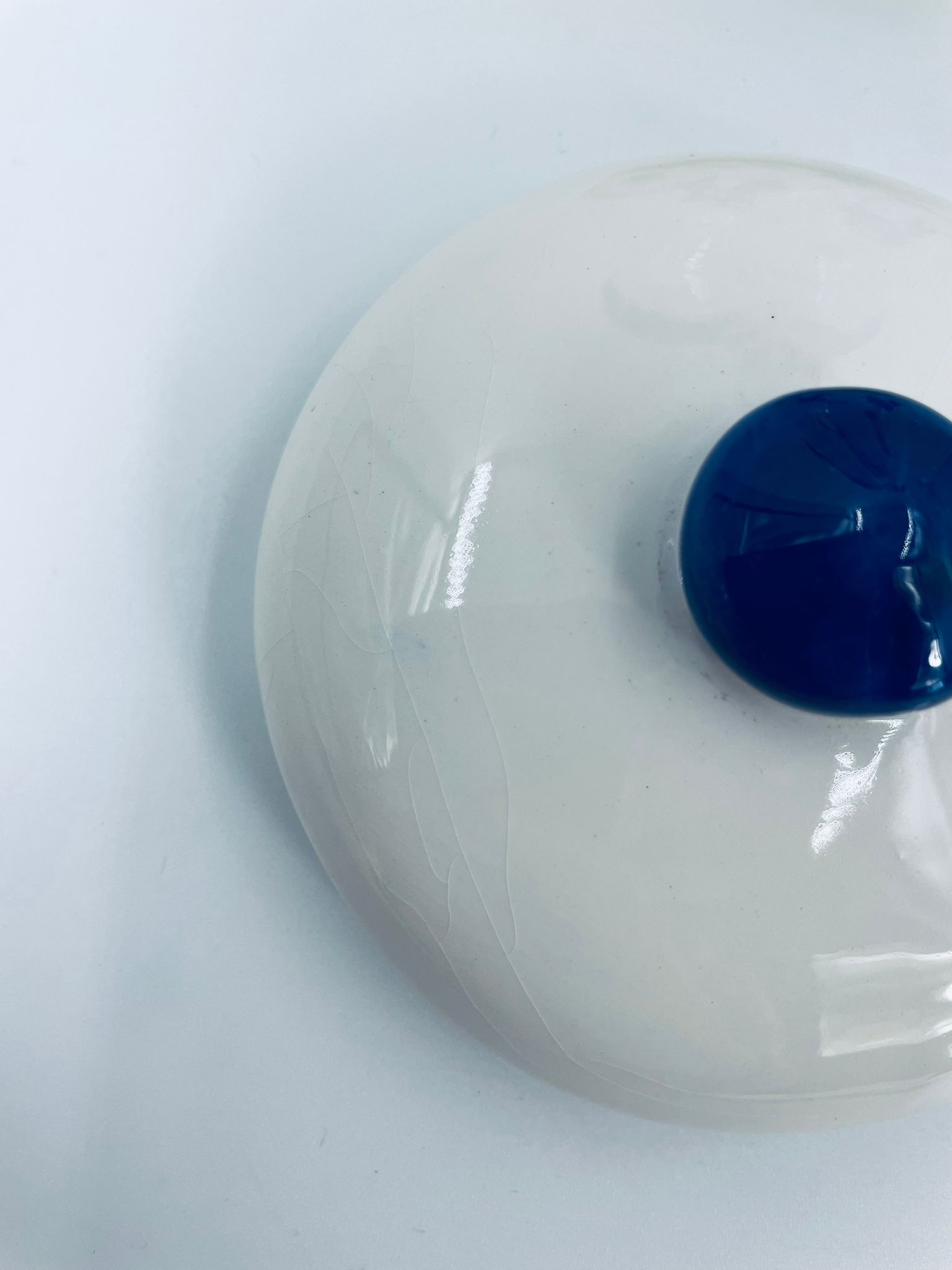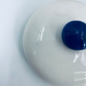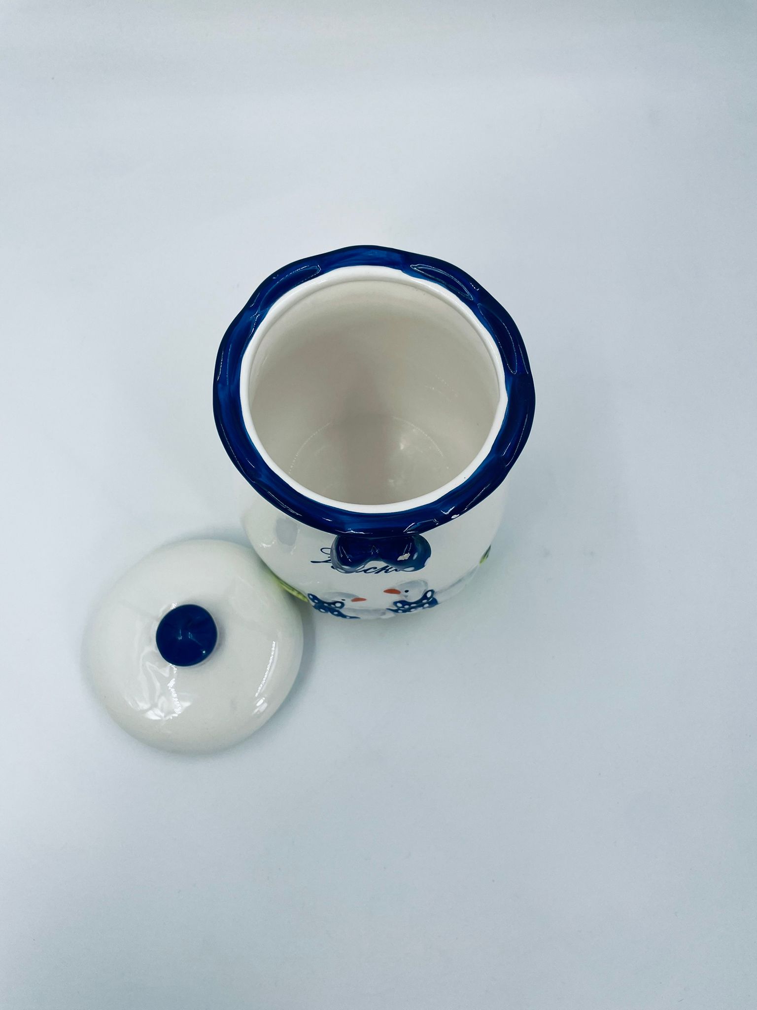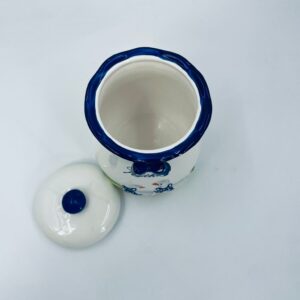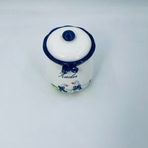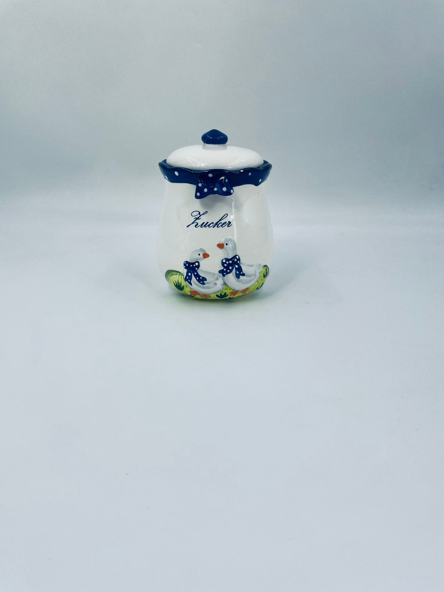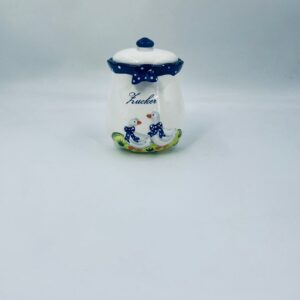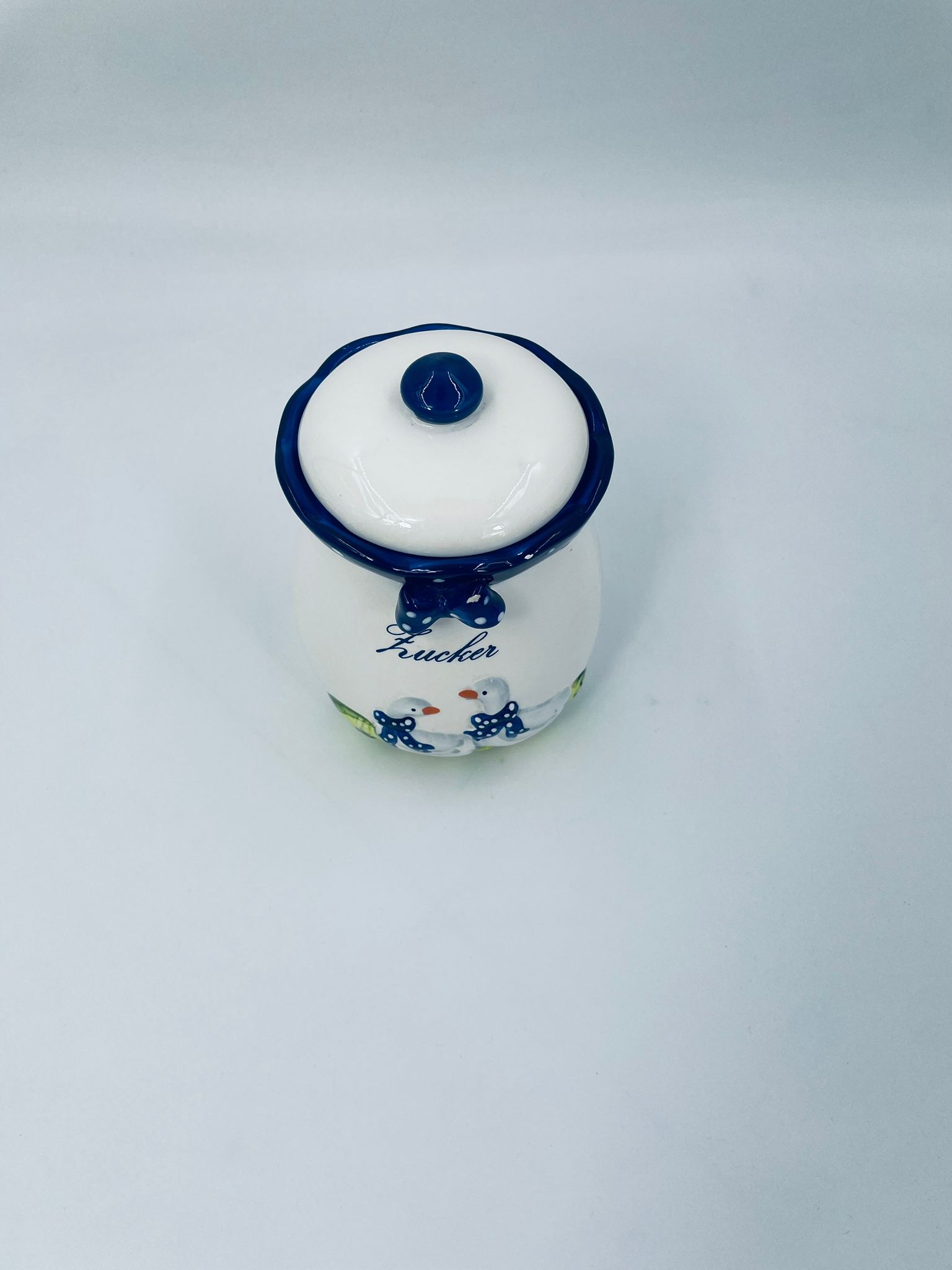 Pojemnik na cukier ceramiczny w białym kolorze z kokardą i obwódką w kolorze granatowym. Pojemnik ozdobiony dekoracją przedstawiającą dwie siedzące na trawie gąski z niebieskimi chustami w białe kropeczki. Ozdobny pojemnik służy do przechowywania cukru. Posiada pęknięcie szkliwa na przykryciu.