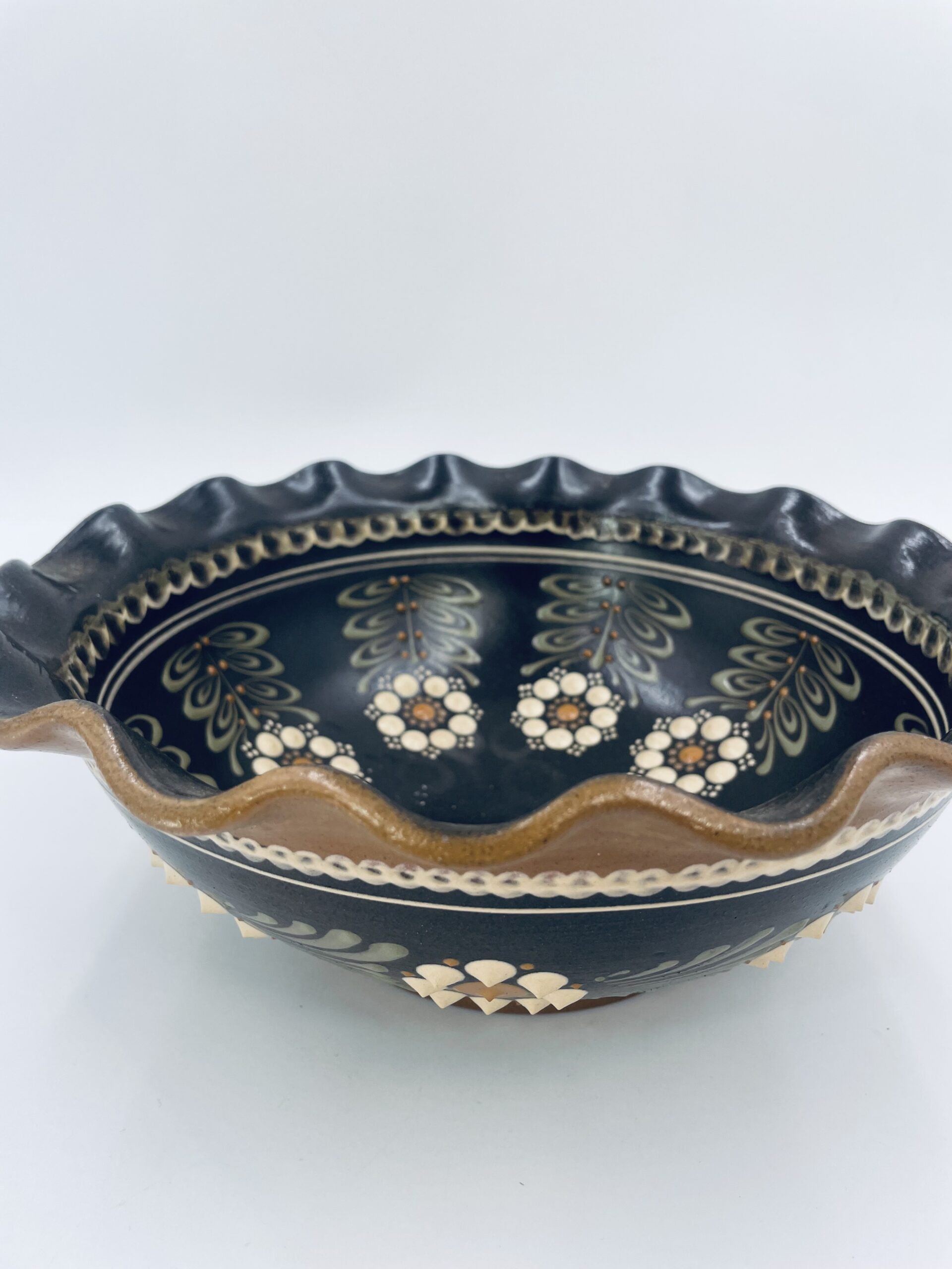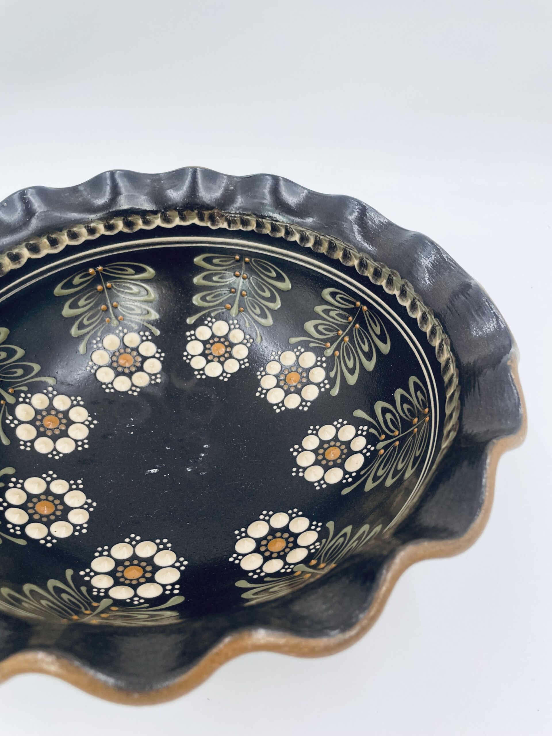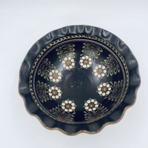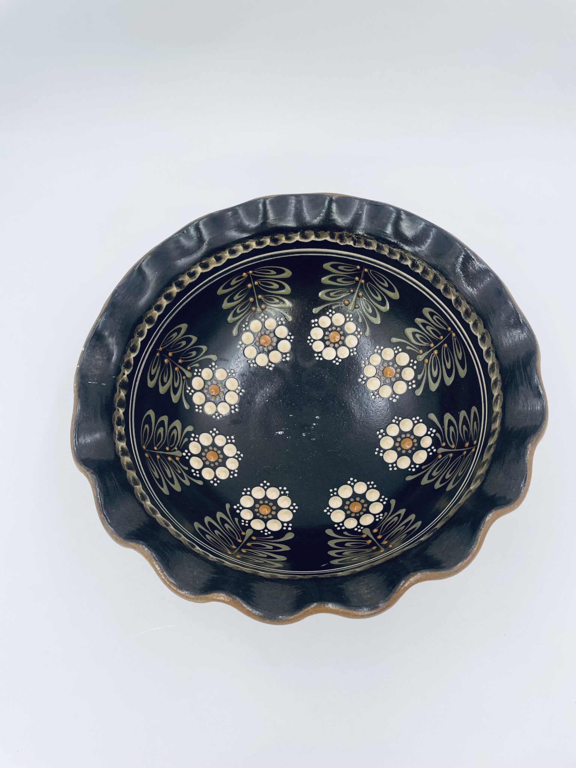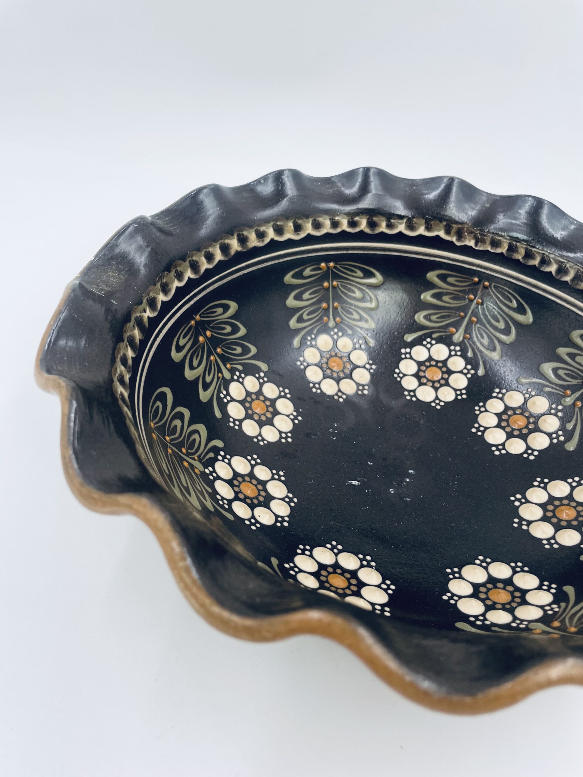Talerz ręcznie wykonany i malowany w kolorze bezowym i przedstawiająca kwiatki uniesione.
