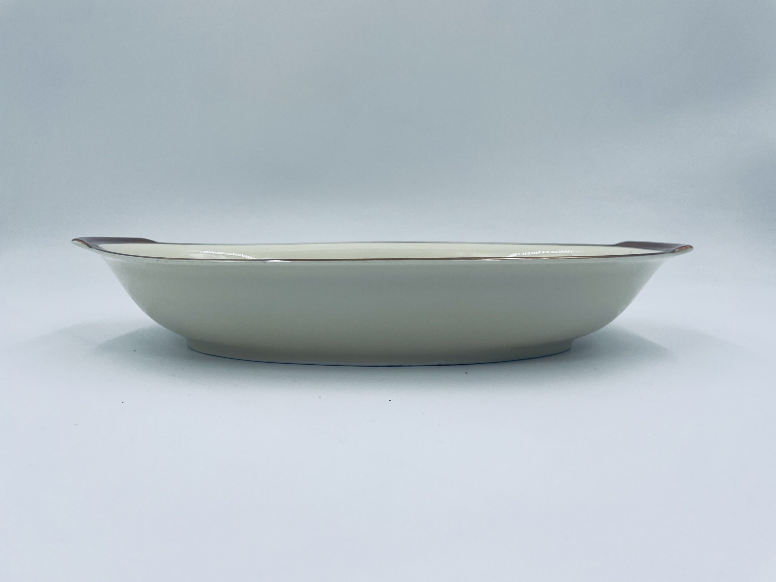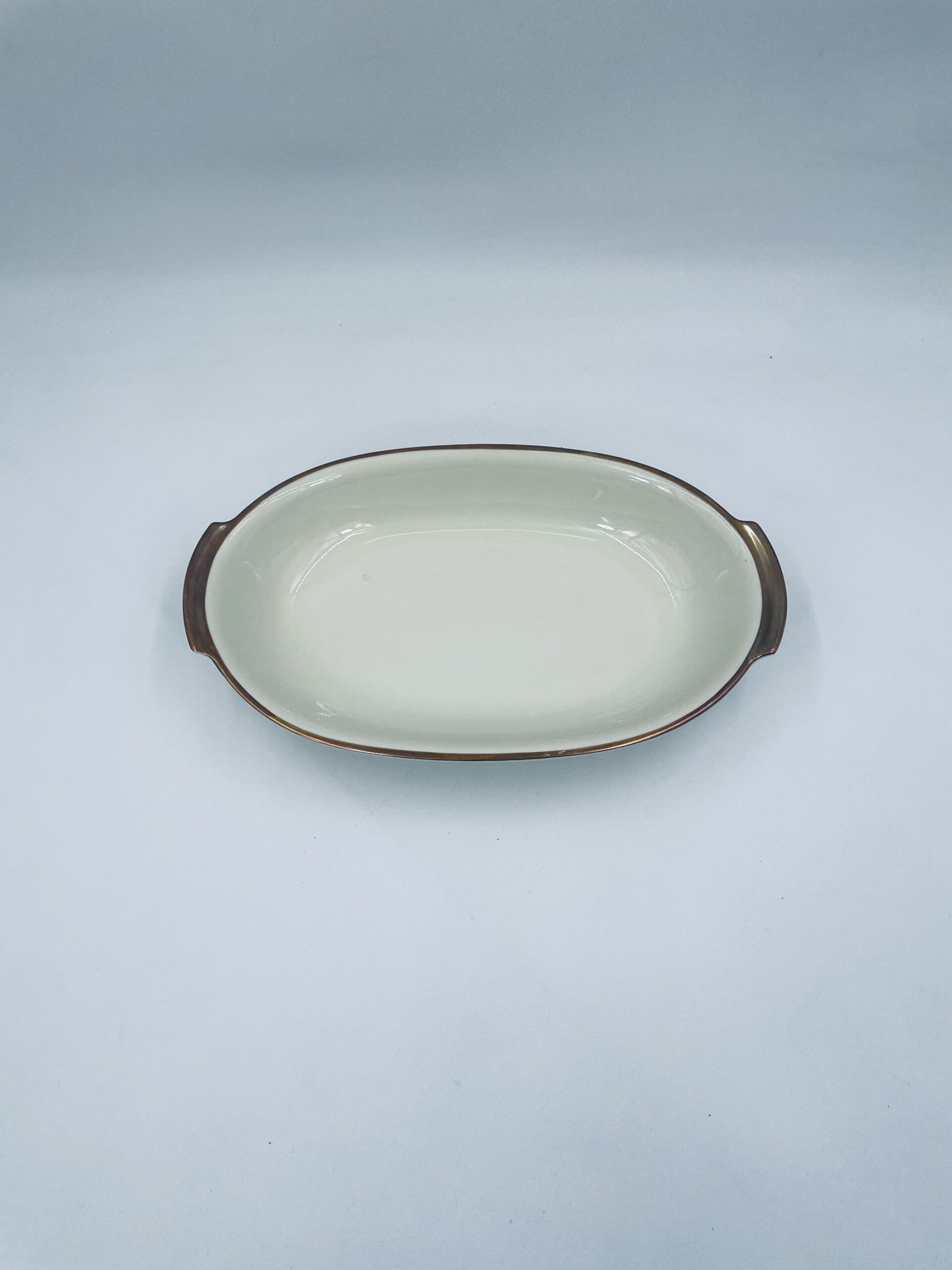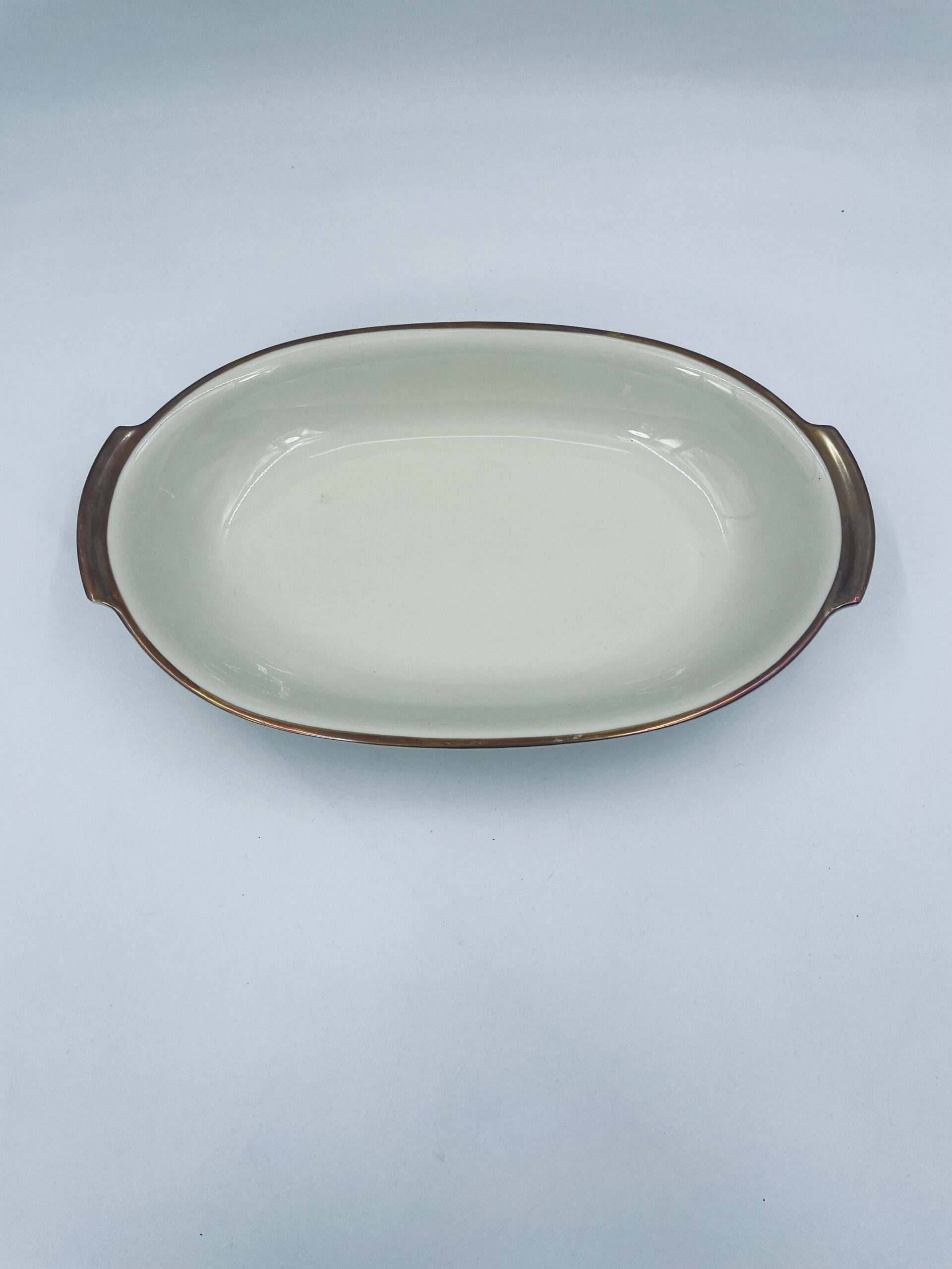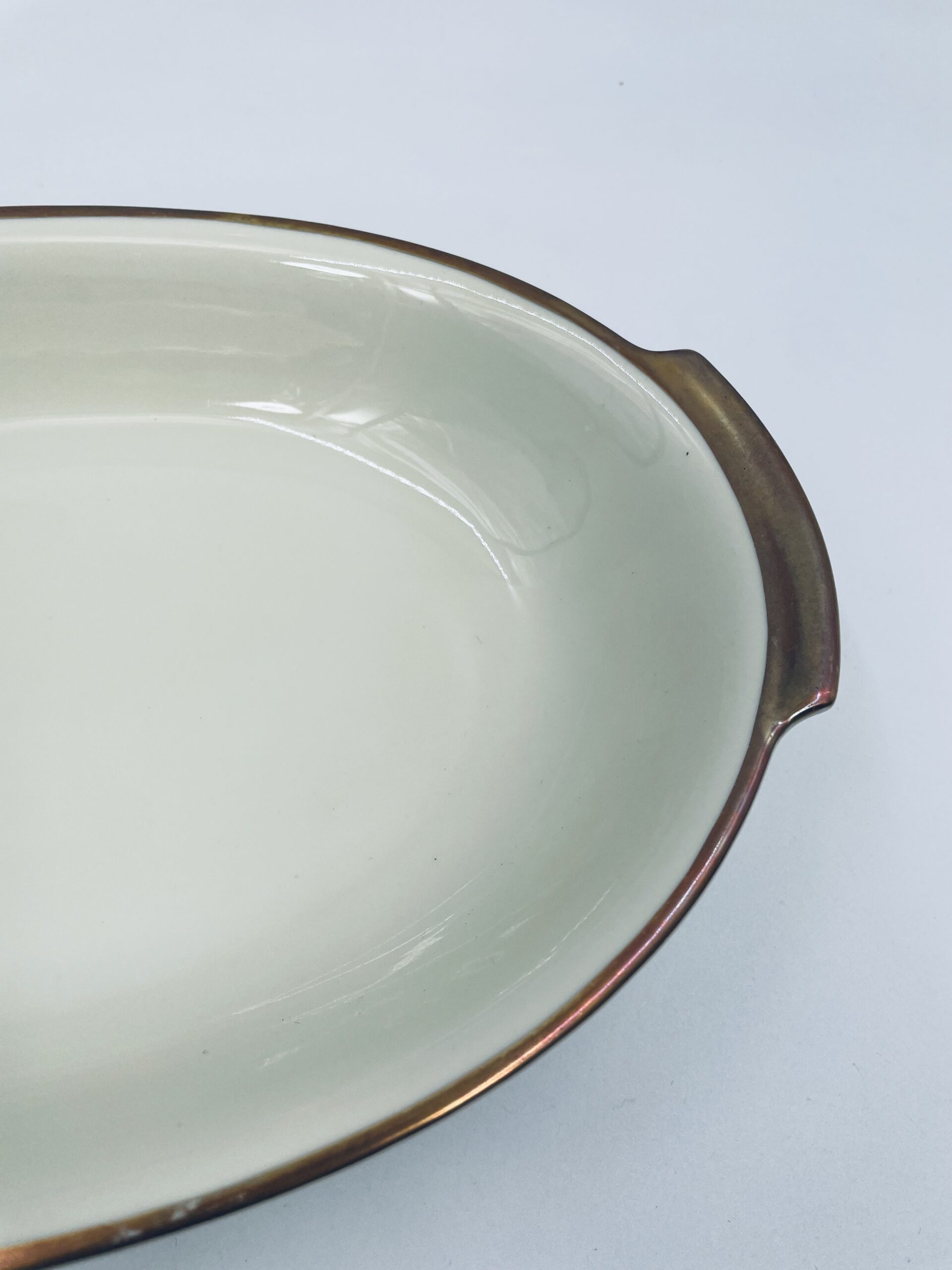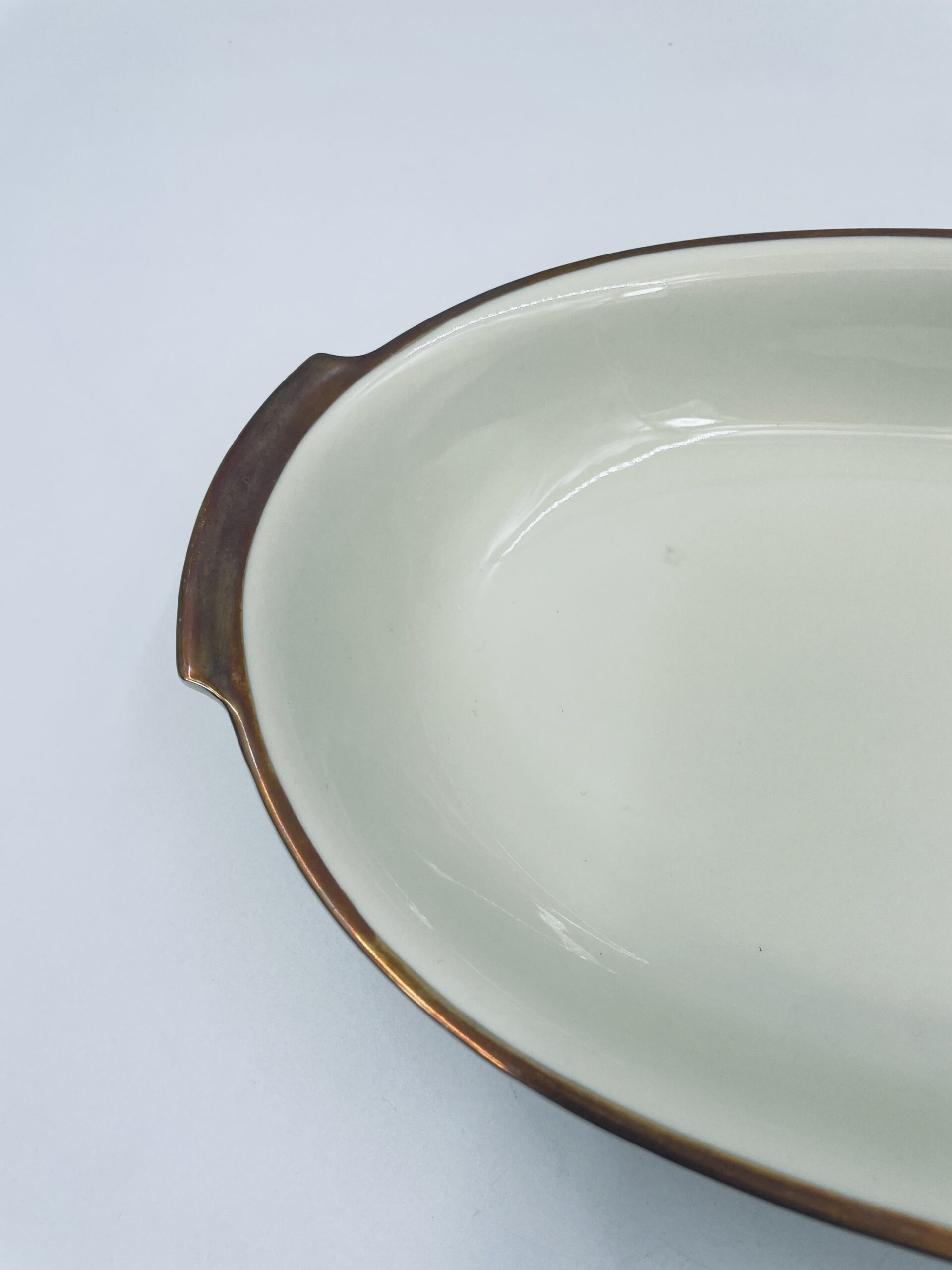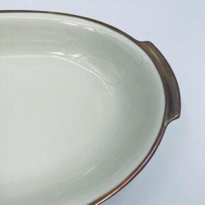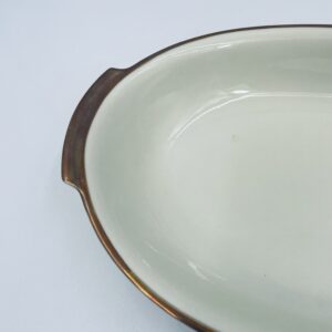 Półmisek głęboki owalny z firmy Kahla w kolorze ecru wykończony złoconymi obramowaniami.
