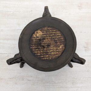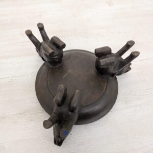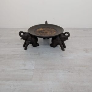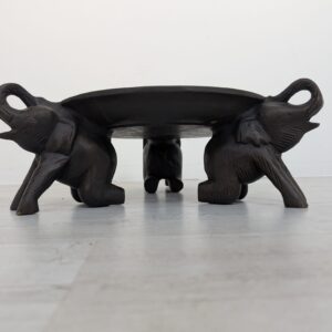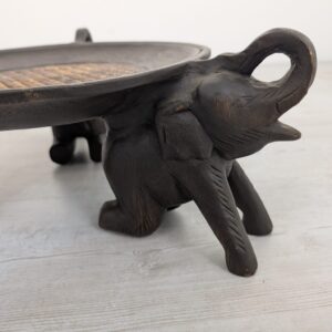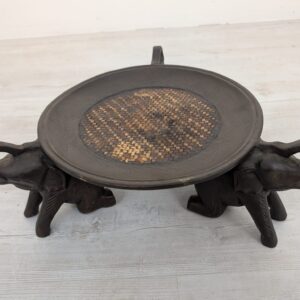 Drewniany stojak słonie trzymające tacę z ozdobnym wplecionym wzorem. Przedmiot ma charakter dekoracyjny i może służyć jako podstawka pod doniczkę lub kwietnik. Stojak jest w stanie używanym, ale dobrze zachowany.