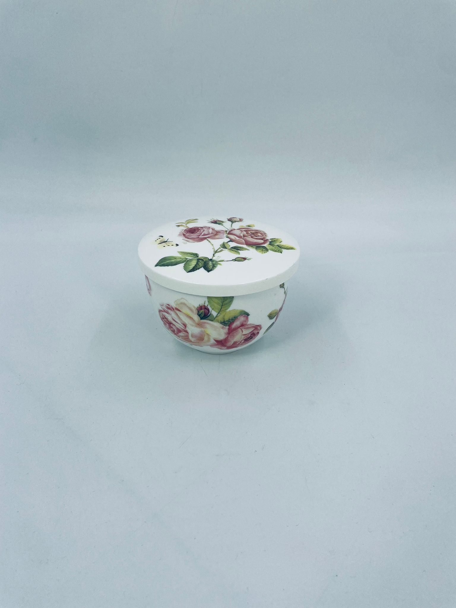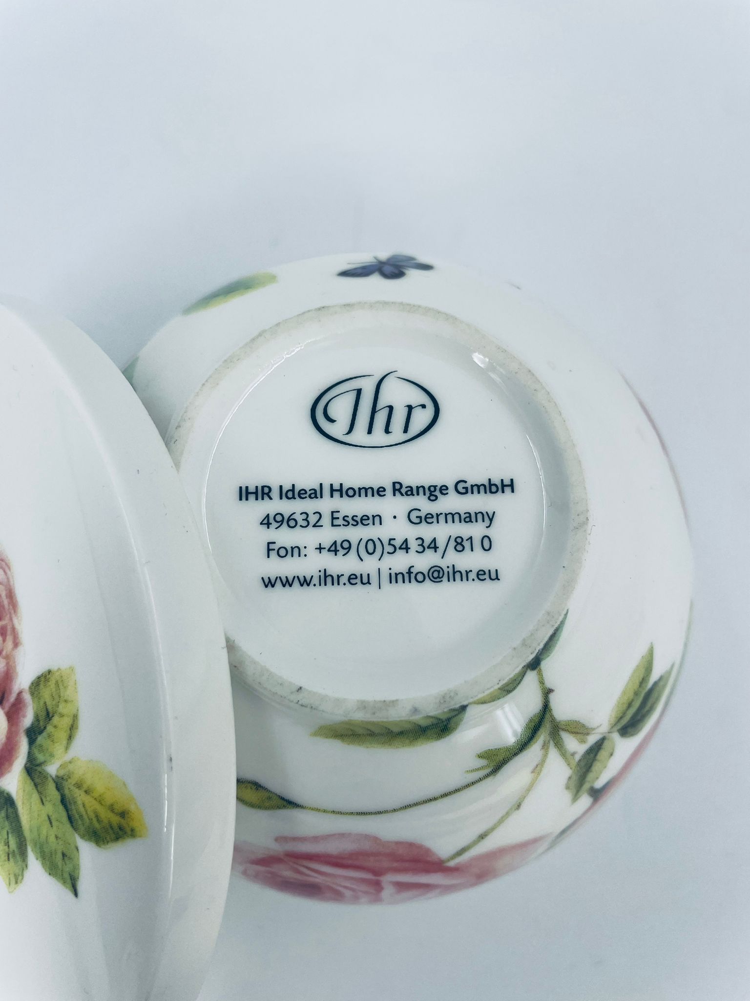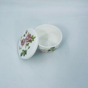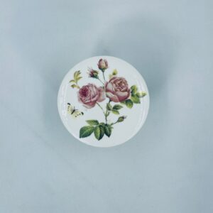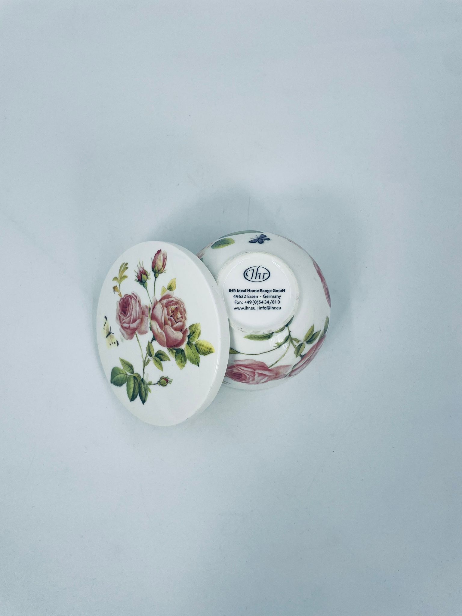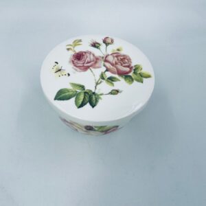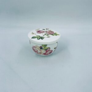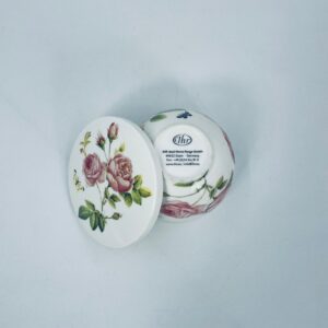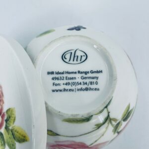 Puzderko niemieckiego producenta firmy IHR Ideal Home Range GmbH z miasta Essen, wykonane z wysokiej jakości białej porcelany. Pojemniczek z przykryciem charakteryzuje się wzorem pięknych, różowych róż z listkami oraz z motylkiem. Może służyć jako szkatułka, pojemnik na drobiazgi, cukiernica.