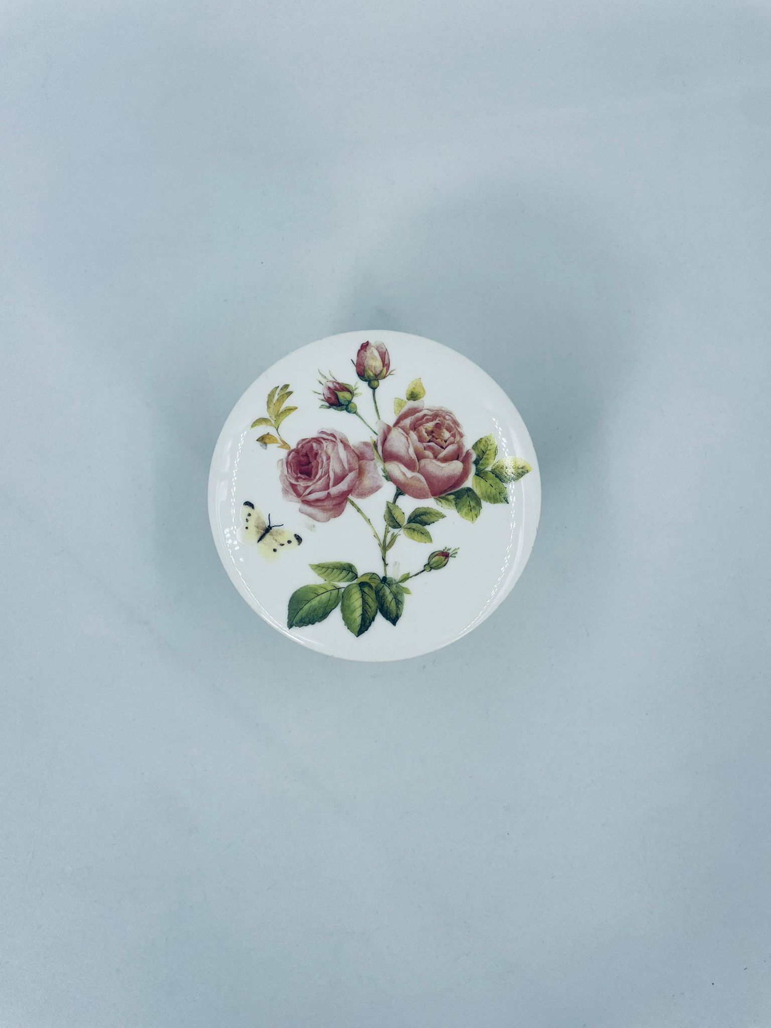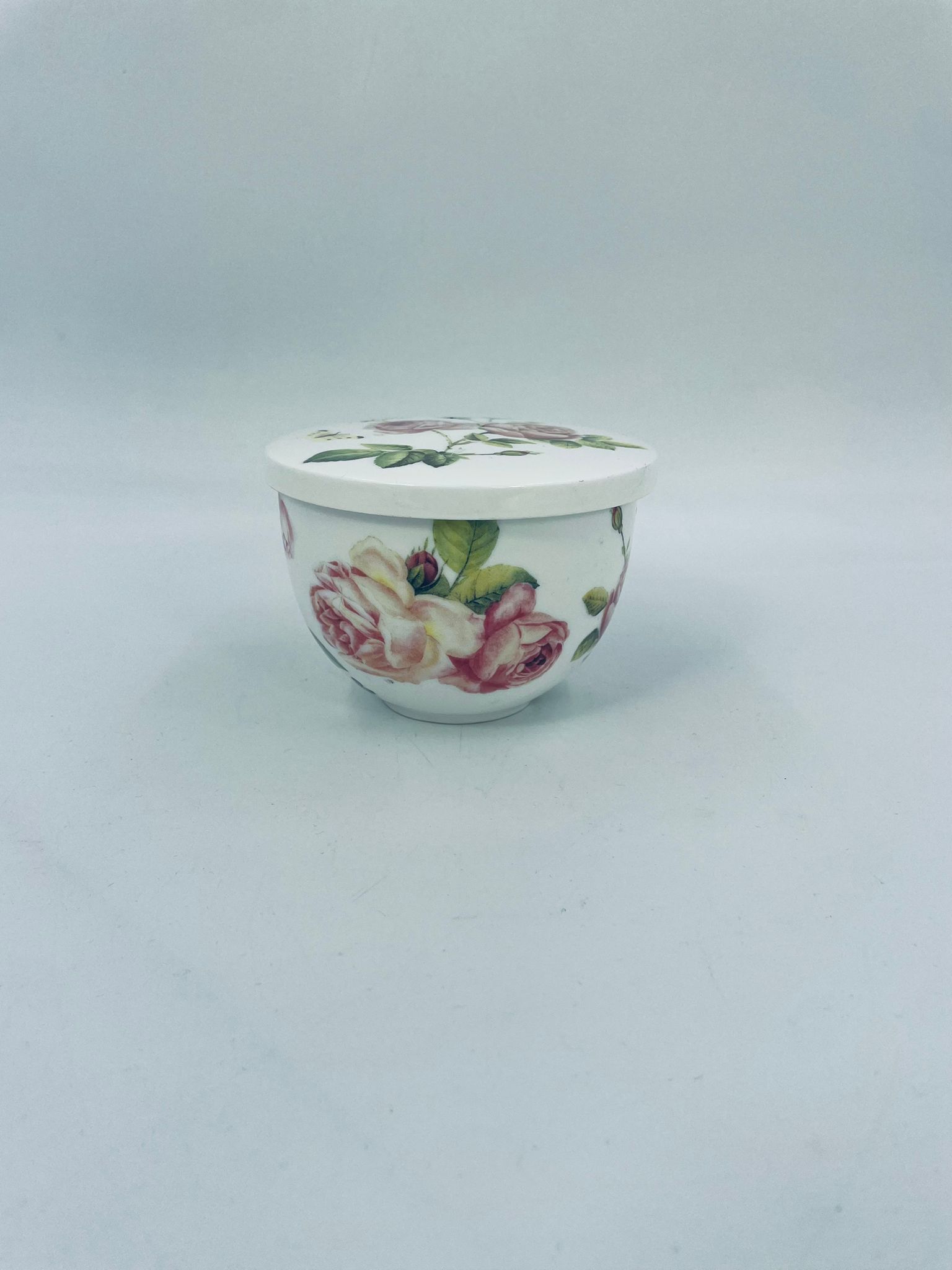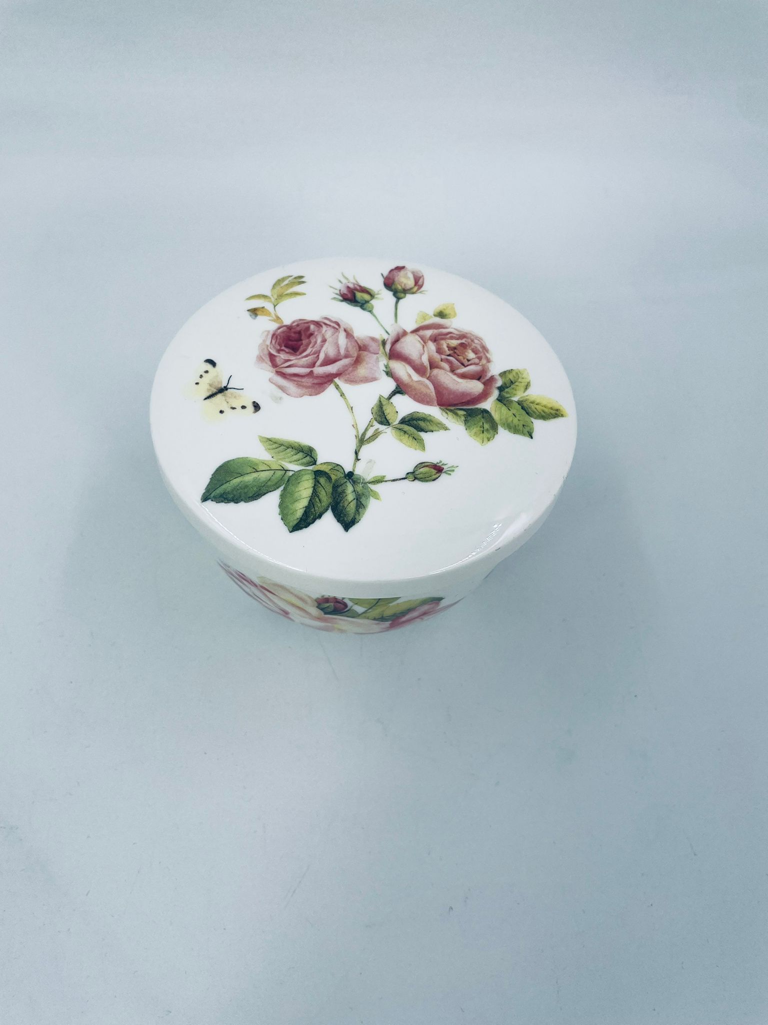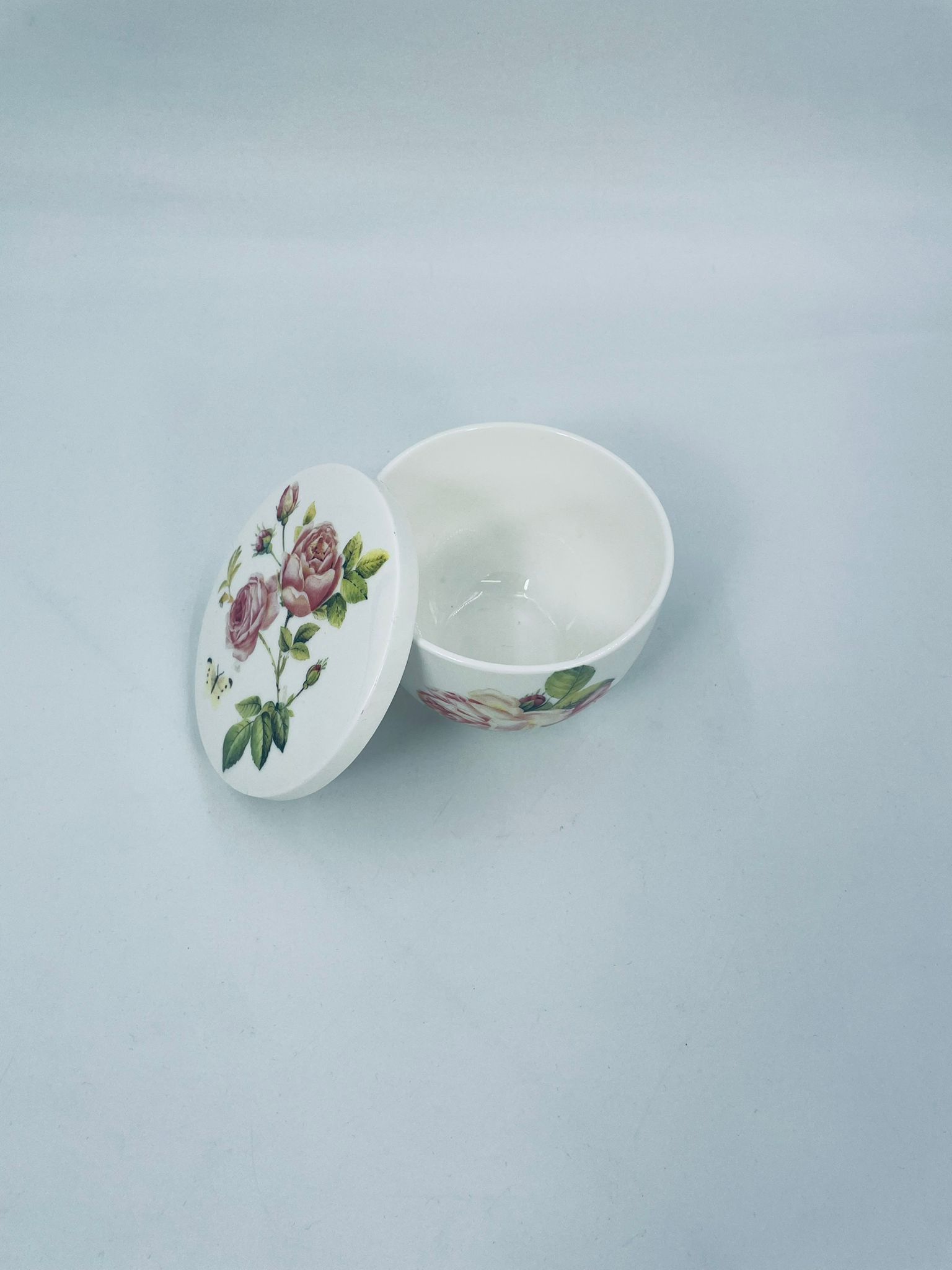 Puzderko niemieckiego producenta firmy IHR Ideal Home Range GmbH z miasta Essen, wykonane z wysokiej jakości białej porcelany. Pojemniczek z przykryciem charakteryzuje się wzorem pięknych, różowych róż z listkami oraz z motylkiem. Może służyć jako szkatułka, pojemnik na drobiazgi, cukiernica.