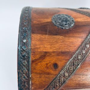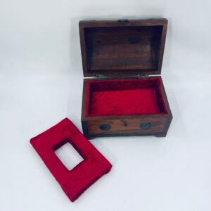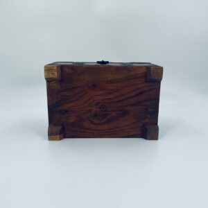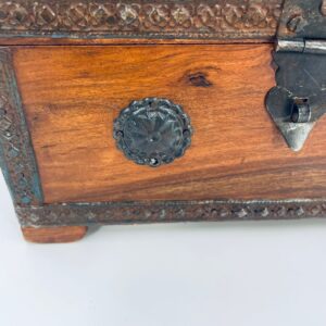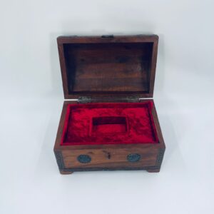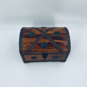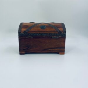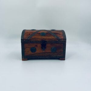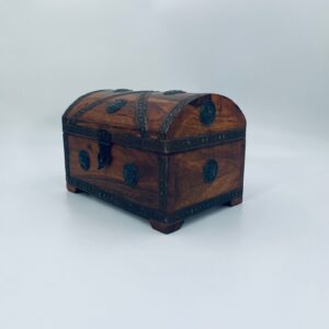 Rustykalna Szkatułka, Skrzynia piracka antyczna, wykonana z litego drewna w brązowym kolorze. Skrzynia osadzona na czterech małych, drewnianych nóżkach z zaokrąglonym wiekiem, zamykana na metalowy zatrzask. Skrzynia posiada dekoracyjne, nostalgiczne, metalowe okucia oraz nity, które nadają antycznego charakteru, środek wyłożony jest czerwonym aksamitem.