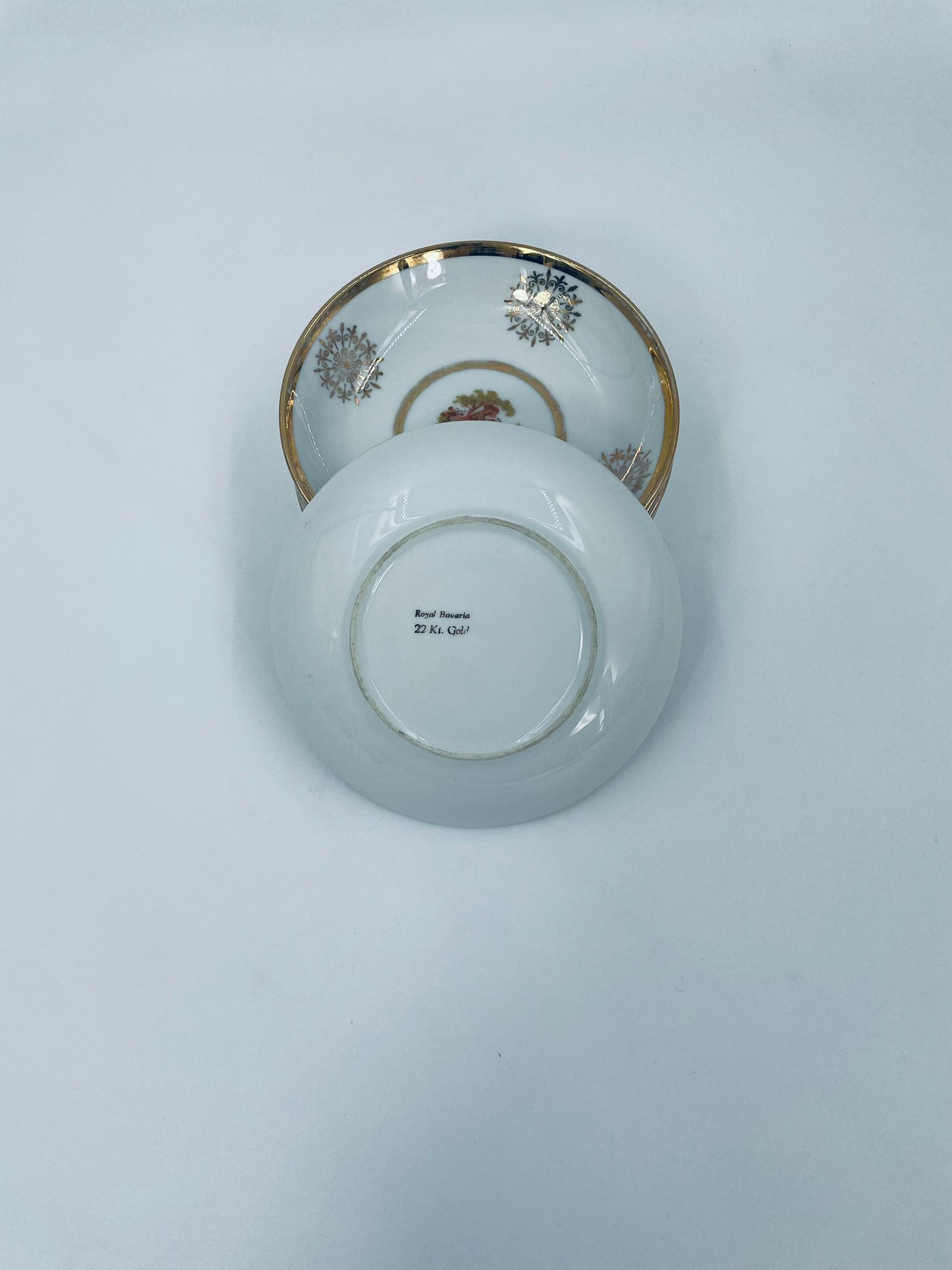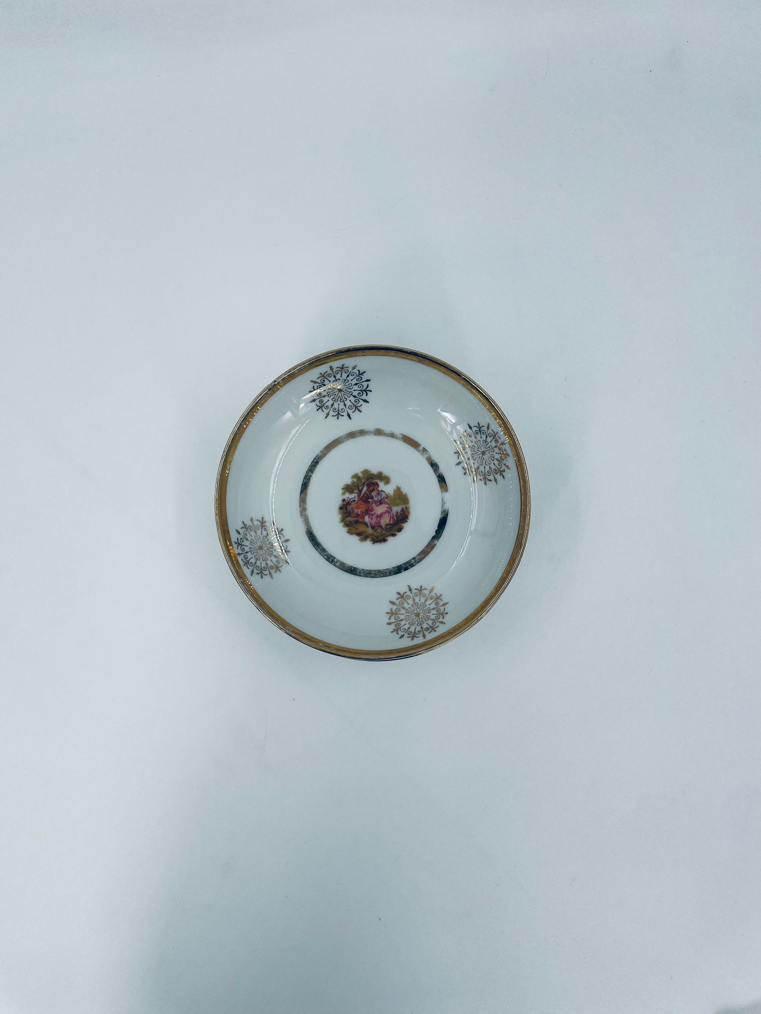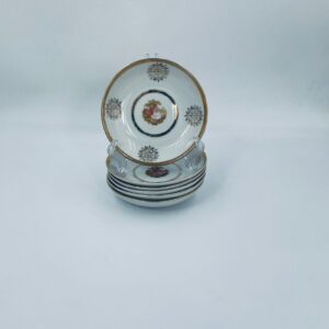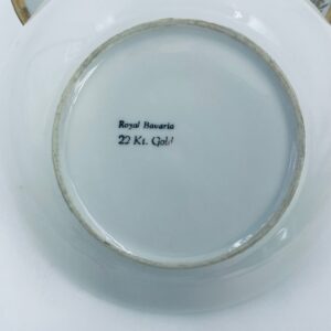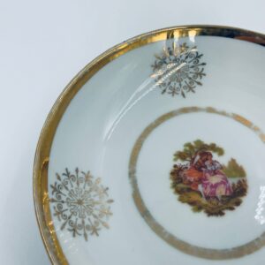 Bardzo rzadka, antyczna z czasów renesansu salaterka mała wytwórni Royal Bavaria, wykonana z wysokiej jakości białej porcelany w stylu rokoko. Zdobiona jest sceną przedstawiającą postacie w strojach epoki, otoczona złotymi ornamentami przypominającymi płatki śniegu, wykończona złoceniem na obrzeżach. Salaterka posiada przetarcia na złoceniach.