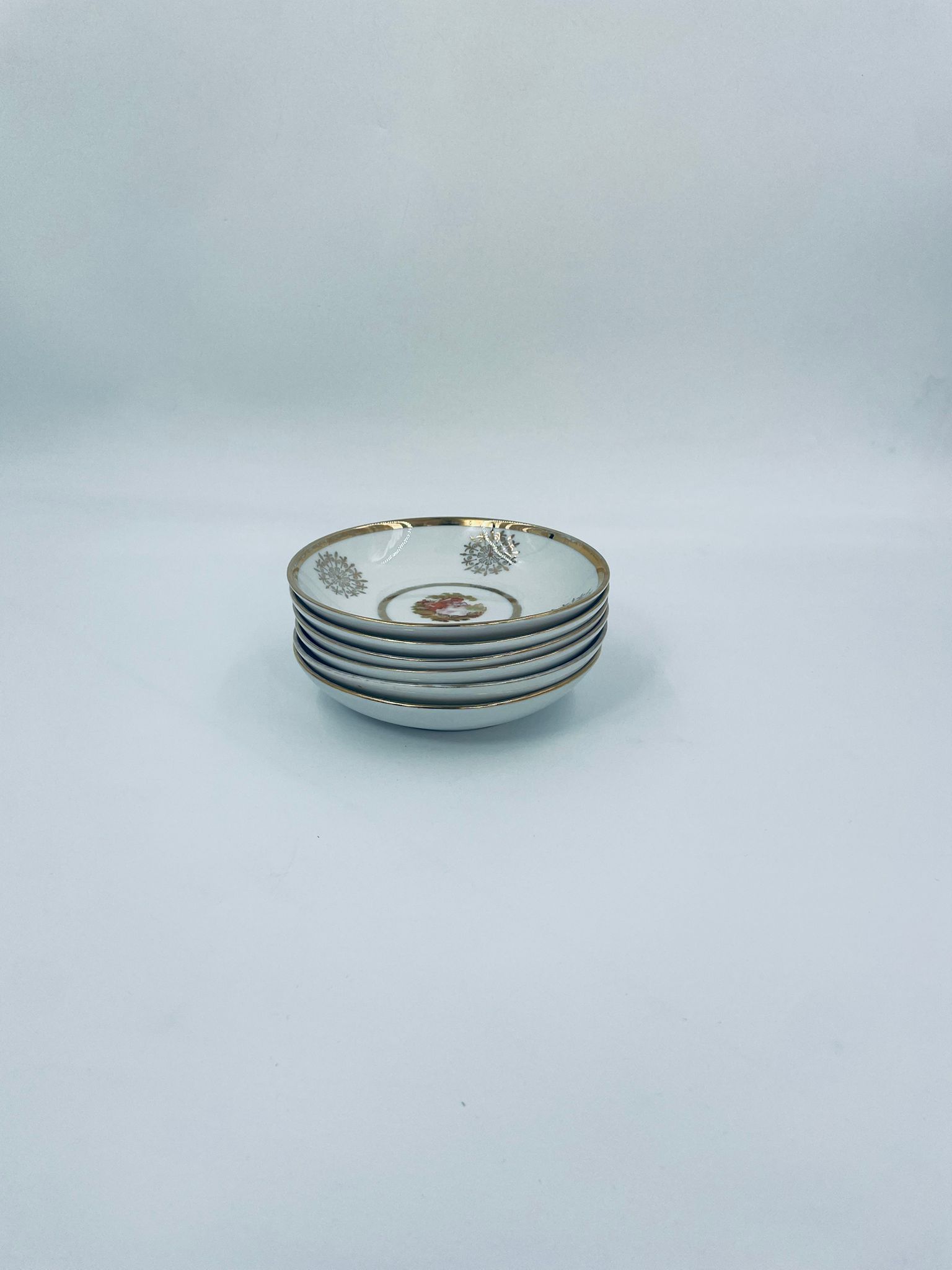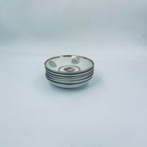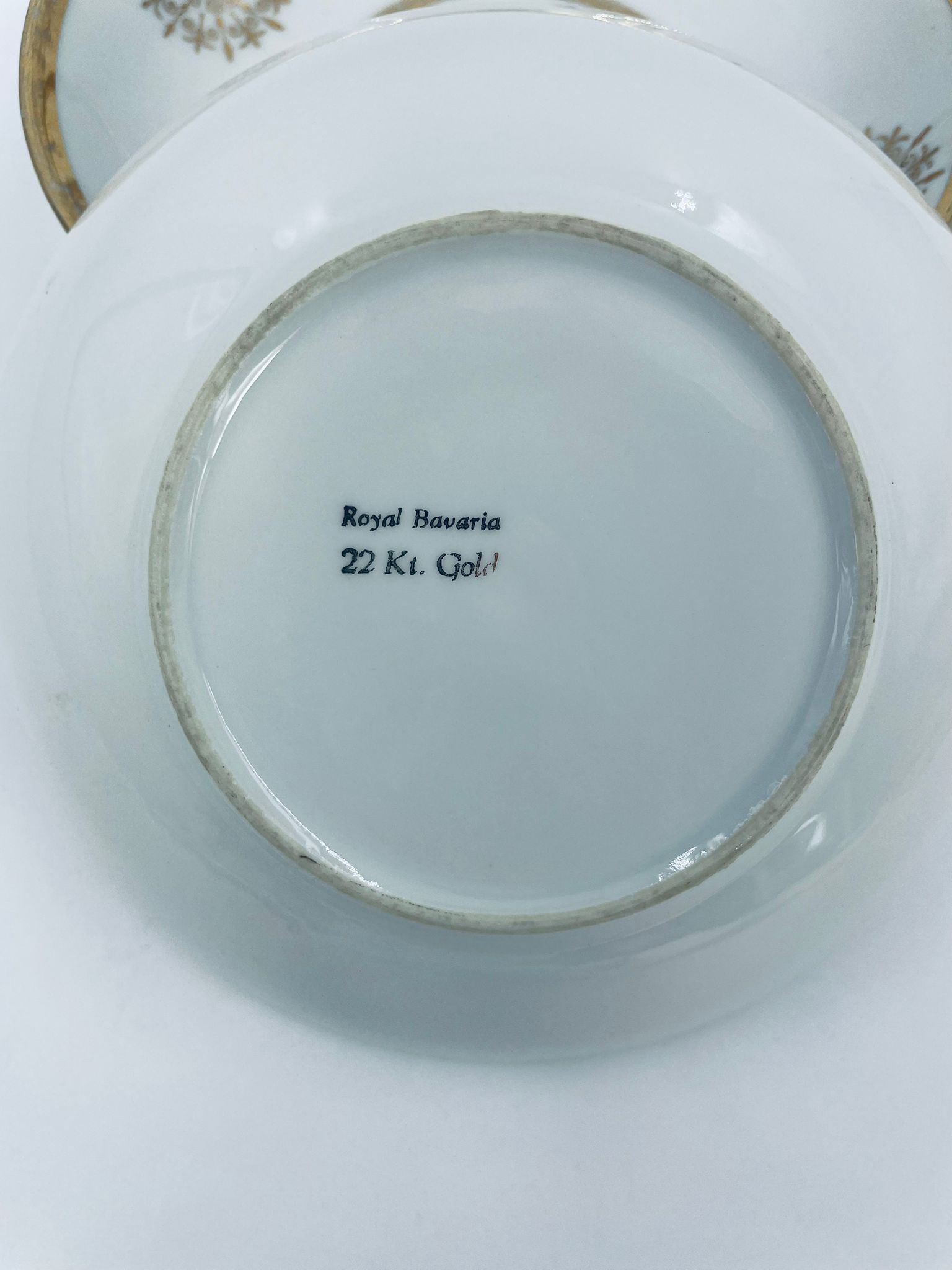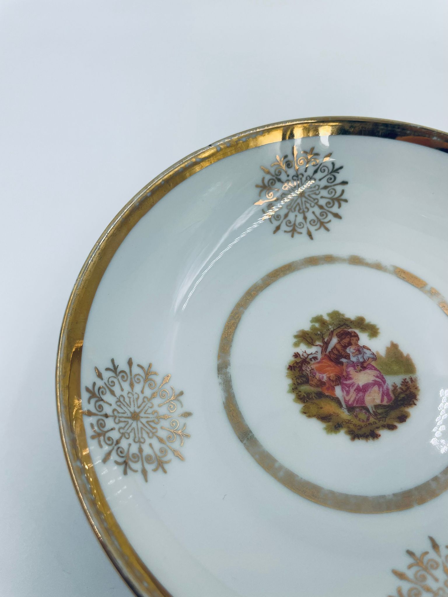Bardzo rzadka, antyczna z czasów renesansu salaterka mała wytwórni Royal Bavaria, wykonana z wysokiej jakości białej porcelany w stylu rokoko. Zdobiona jest sceną przedstawiającą postacie w strojach epoki, otoczona złotymi ornamentami przypominającymi płatki śniegu, wykończona złoceniem na obrzeżach. Salaterka posiada przetarcia na złoceniach.