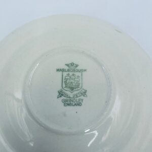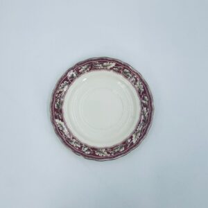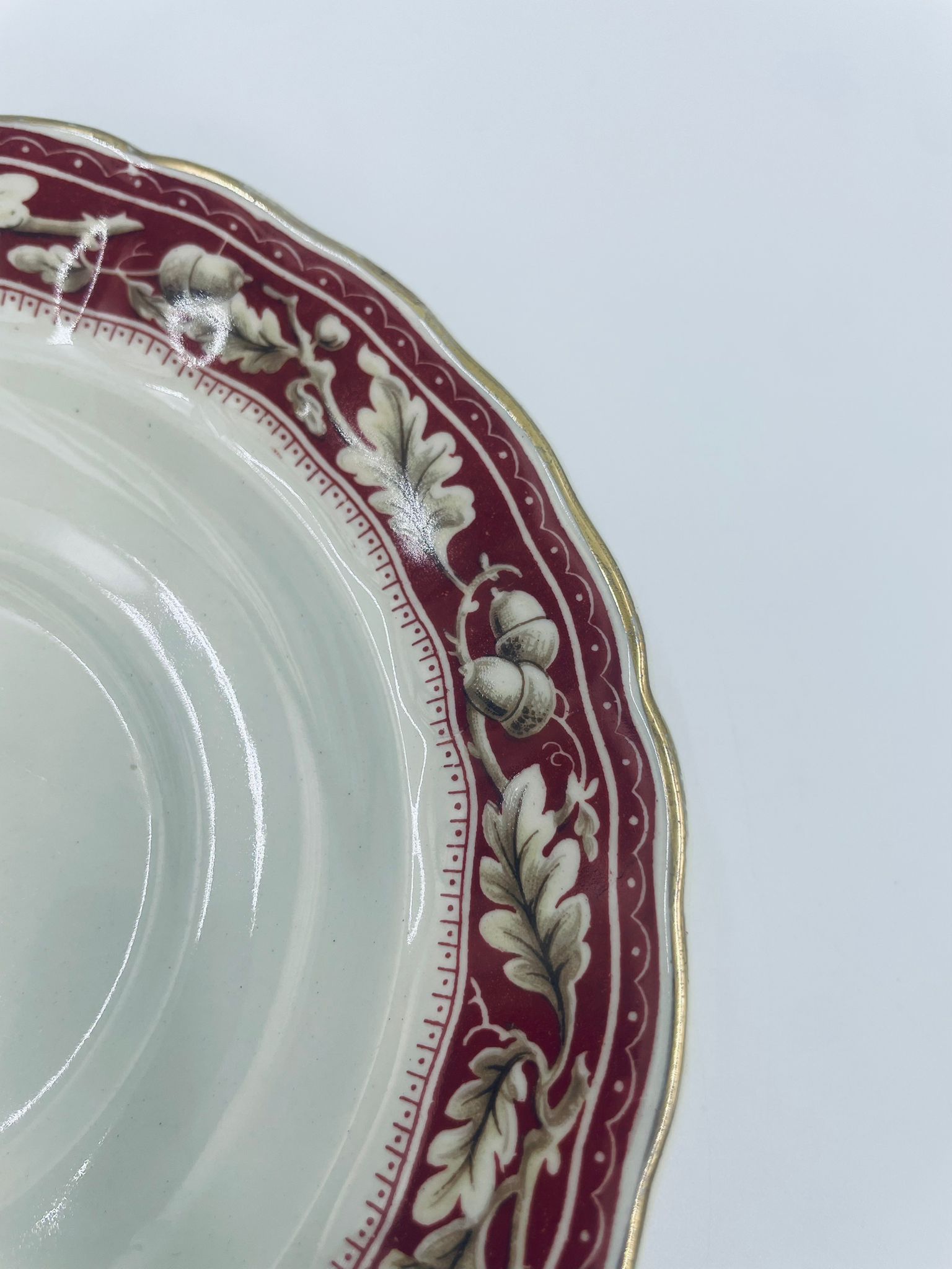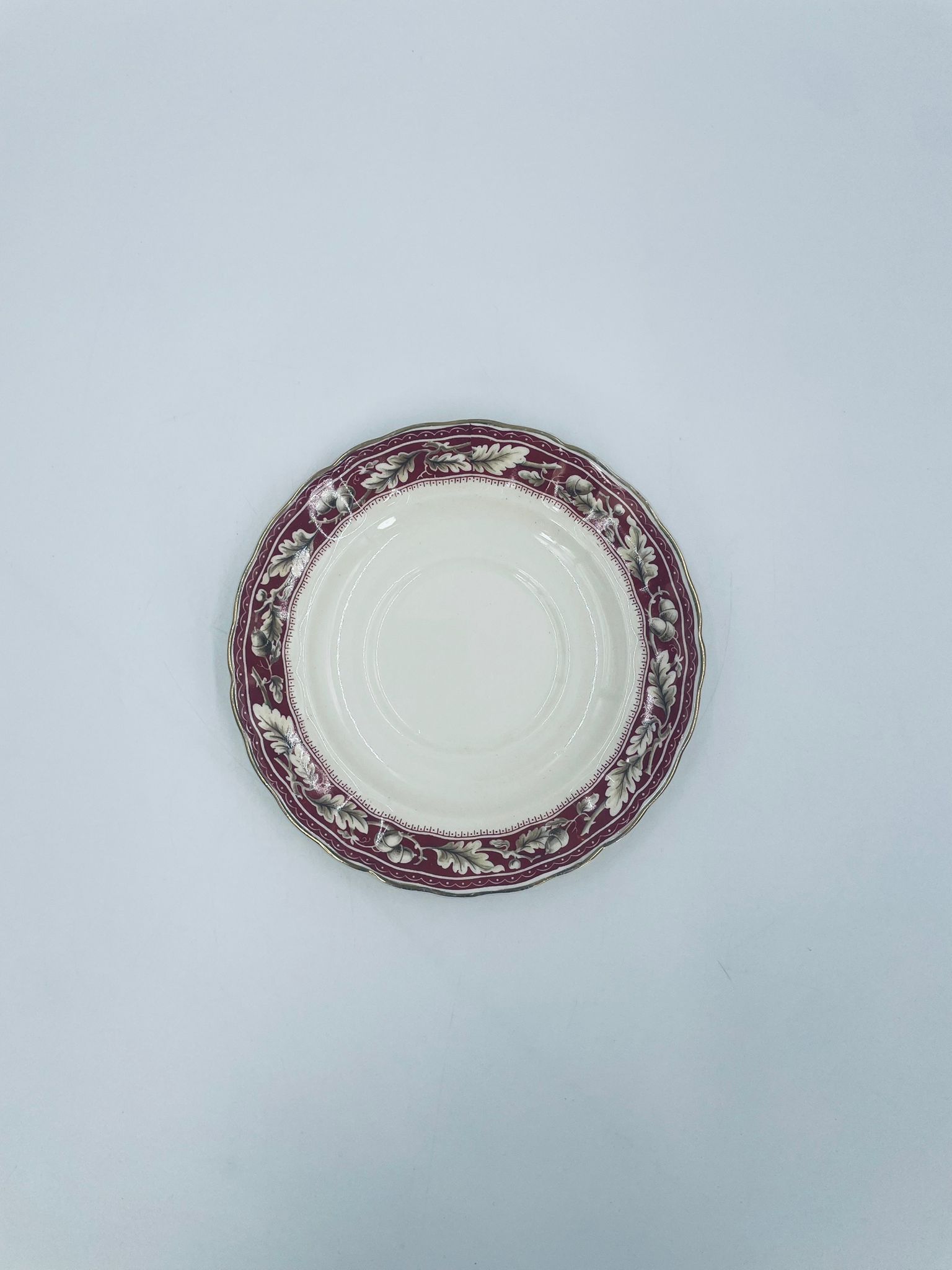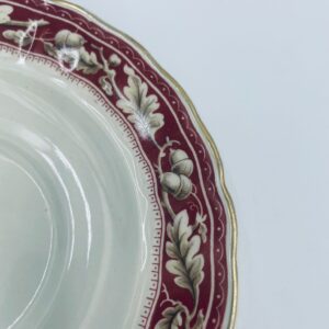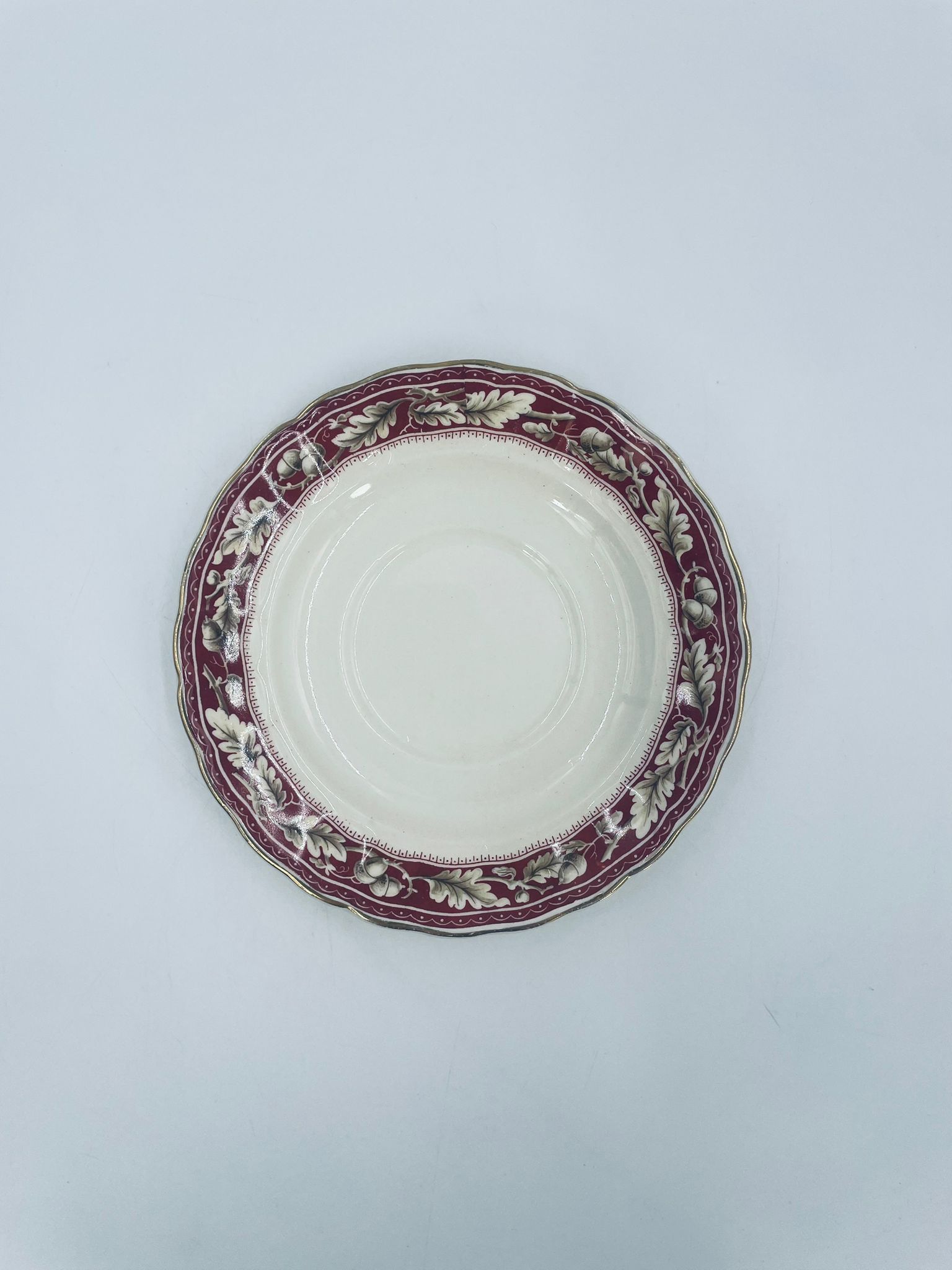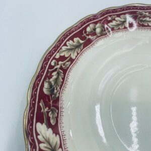 Spodek pod filiżankę Angielskiej wytwórni Grindley z serii Marlborough Royal Petal, z sygnaturą używaną w latach 1936-1954, wykonany z wysokiej jakości porcelany. Talerzyk o falistym, złoconym rancie z bogatym bordowym tłem, z misternymi wzorami liści i żołędzi. Posiada przetarcie złocenia.