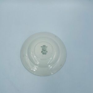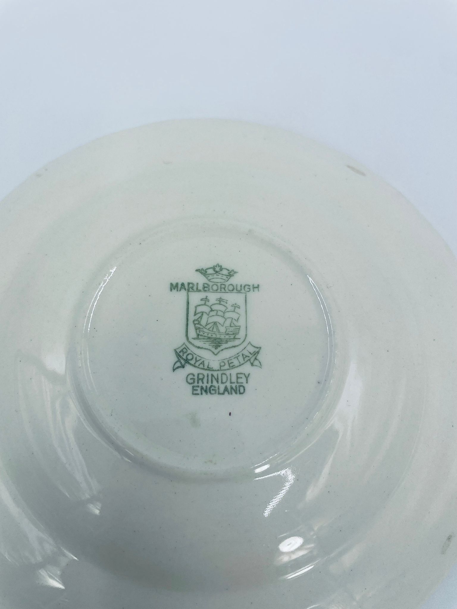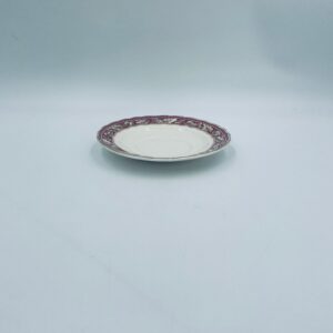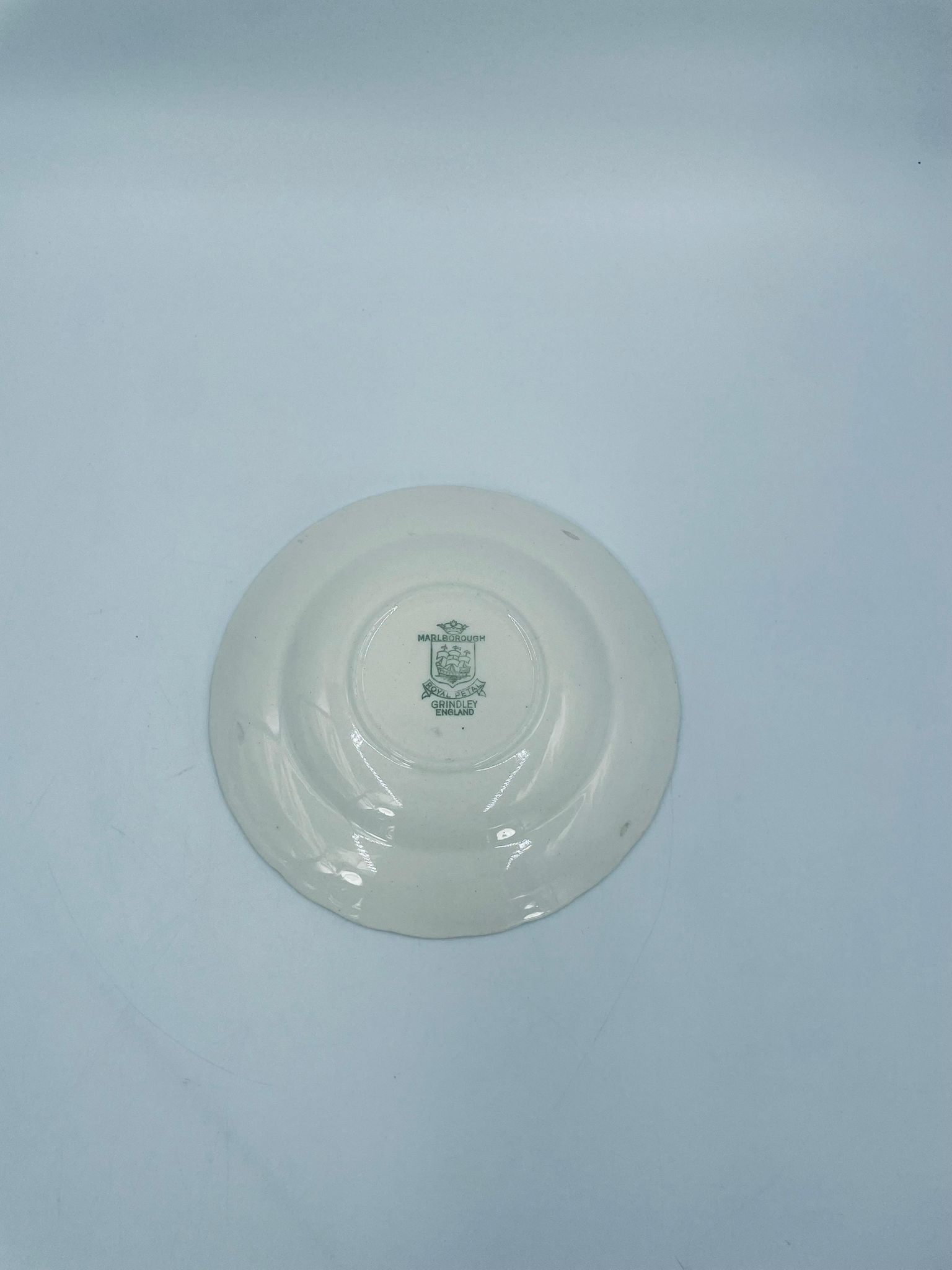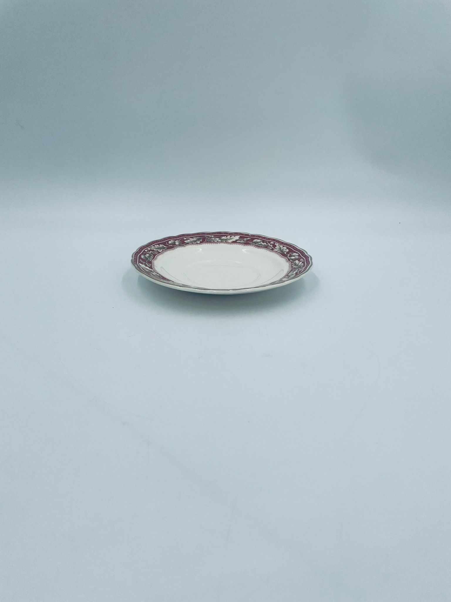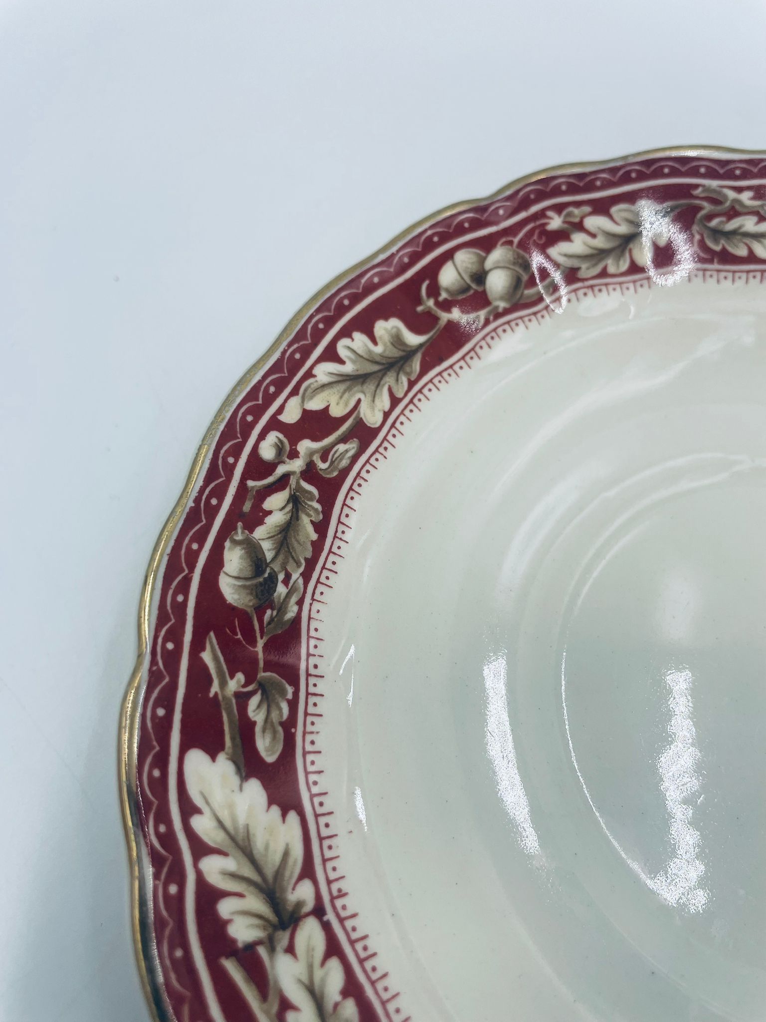 Spodek pod filiżankę Angielskiej wytwórni Grindley z serii Marlborough Royal Petal, z sygnaturą używaną w latach 1936-1954, wykonany z wysokiej jakości porcelany. Talerzyk o falistym, złoconym rancie z bogatym bordowym tłem, z misternymi wzorami liści i żołędzi. Posiada przetarcie złocenia.